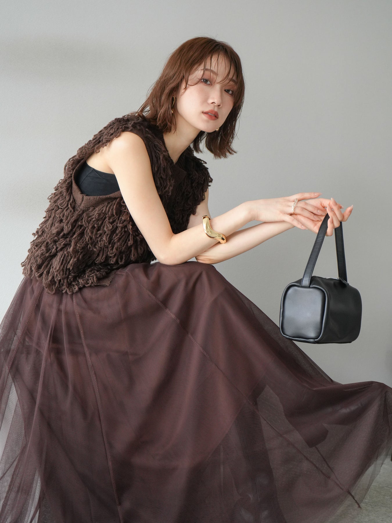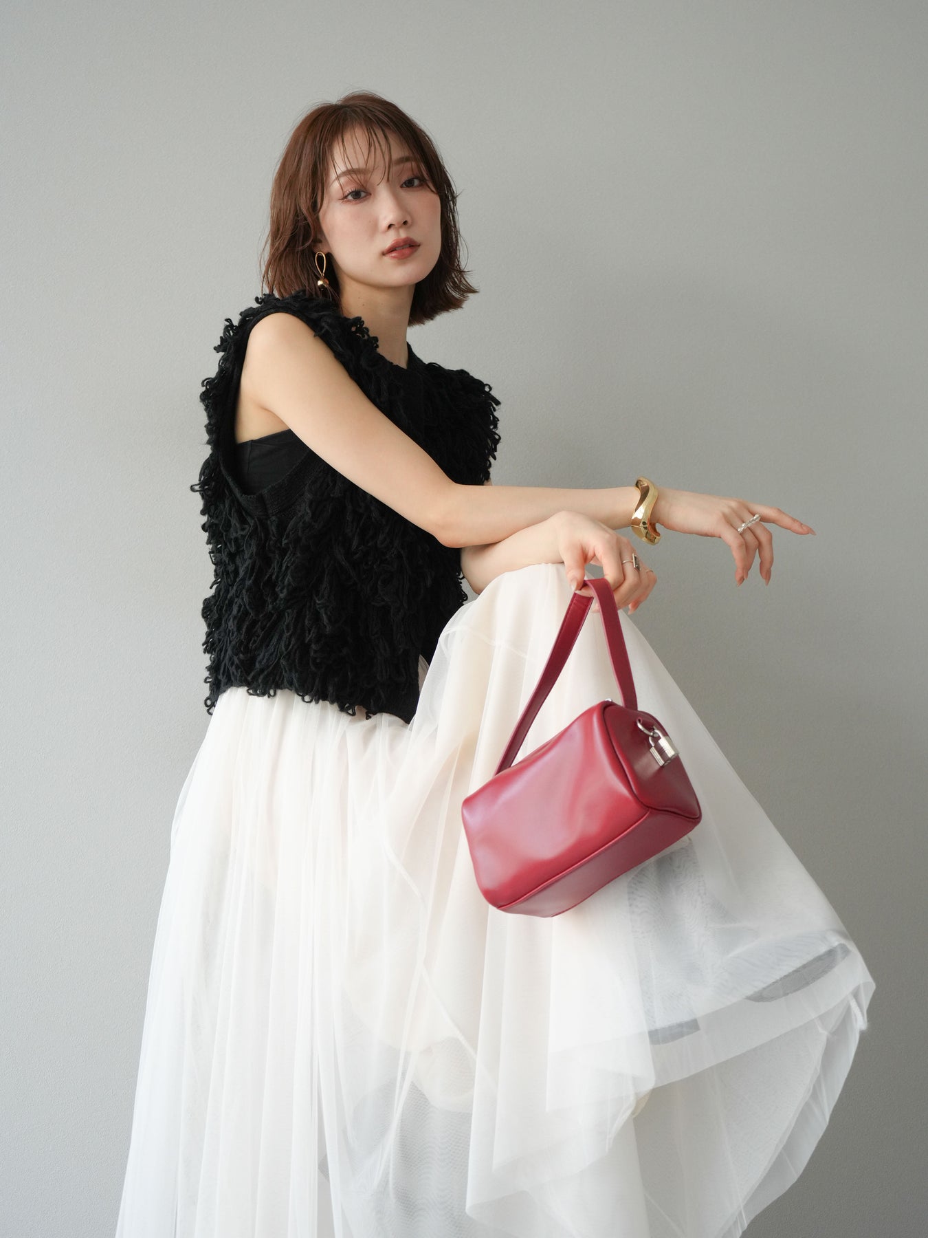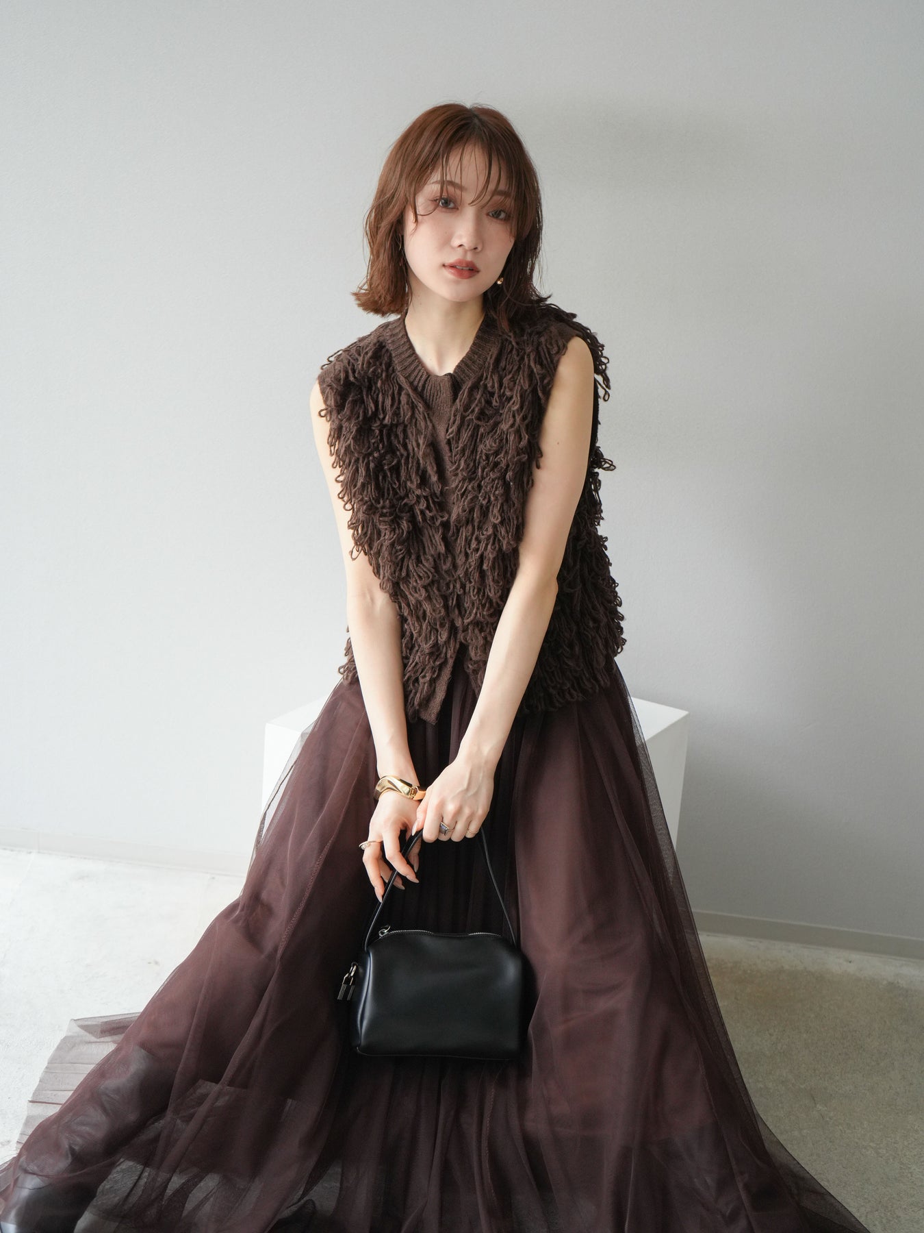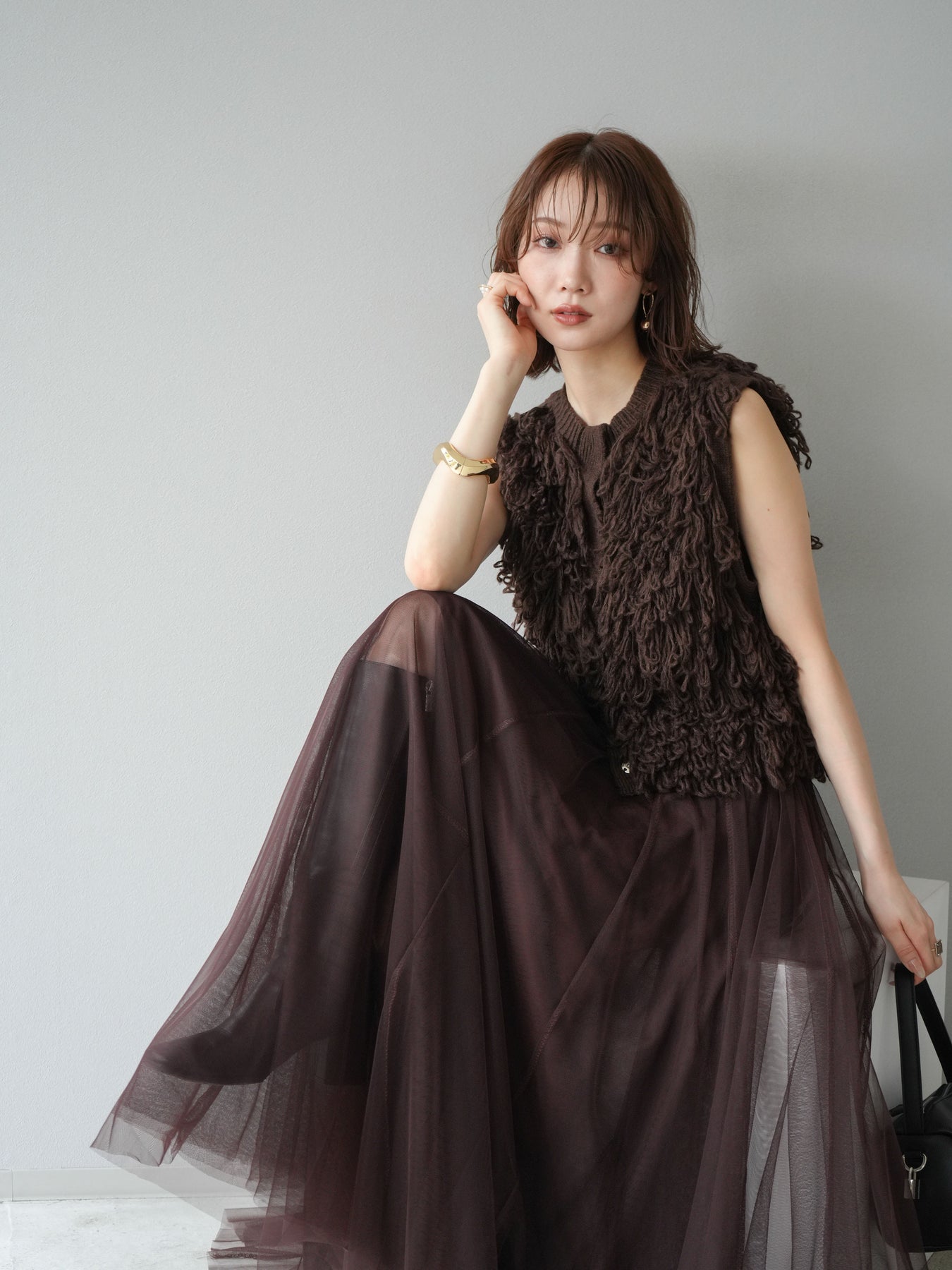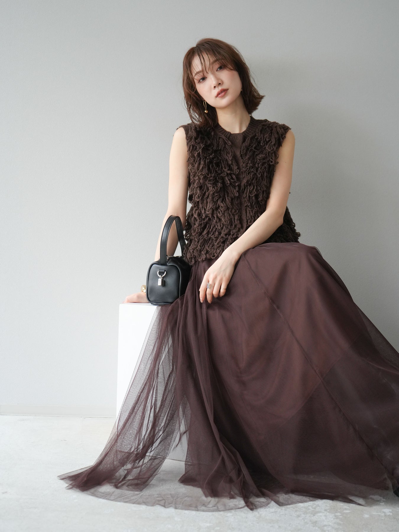 這款背心正面採用立體環狀針織。寬鬆的針織設計格外醒目,內搭簡潔的內搭也能為整體造型增添一抹優雅。正面配有連結,方便穿脫;敞開穿著時可展現休閒感,閉合穿著時則可展現俐落幹練的氣質。長度適中,可輕鬆搭配從褲裝到裙裝的各種下裝。換季時可作為輕薄的外搭,秋冬時可作為層疊造型的點綴,是一款四季皆宜的百搭單品。 *除下裝及吊帶背心(內搭)外,其他商品皆不包含內搭。