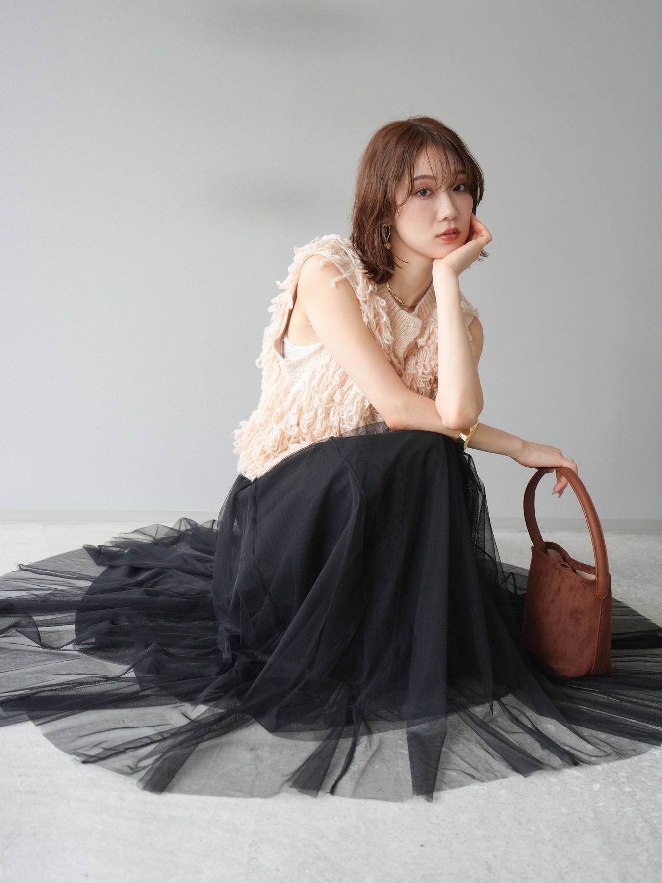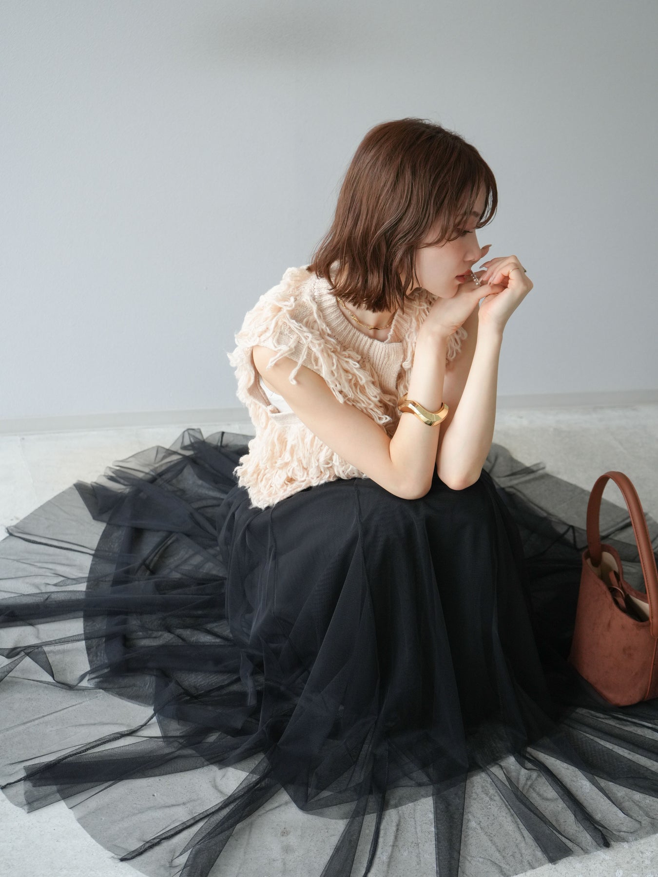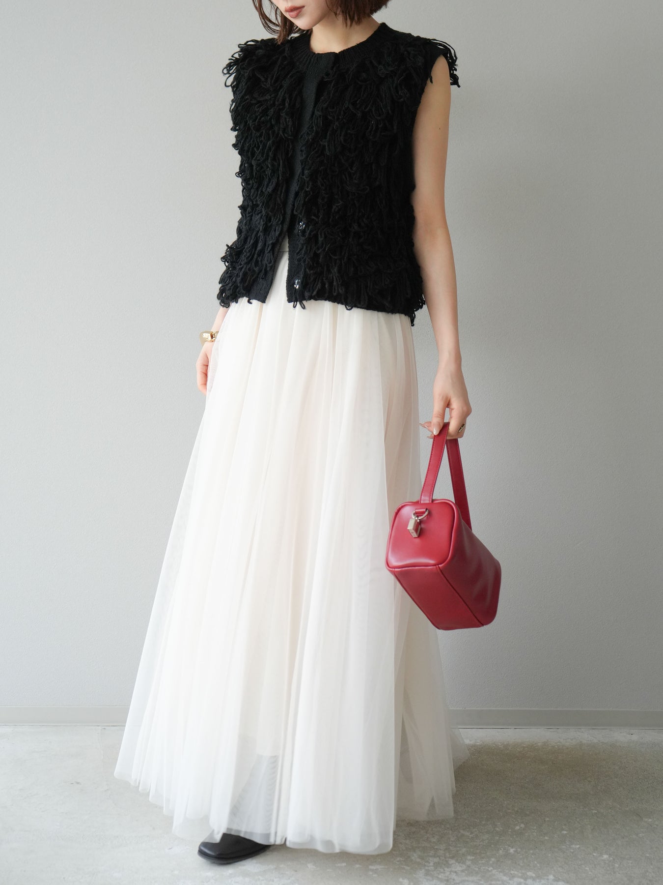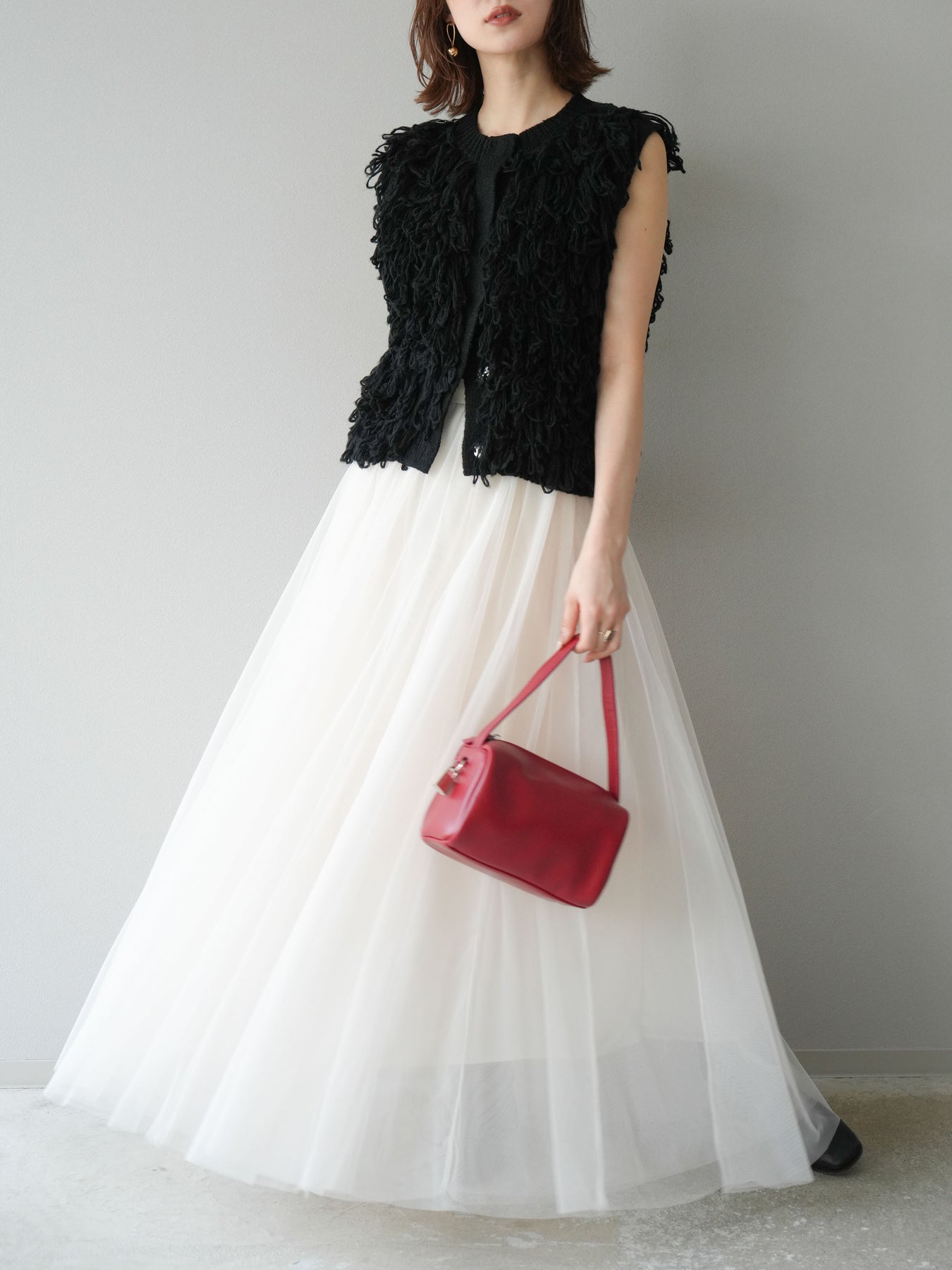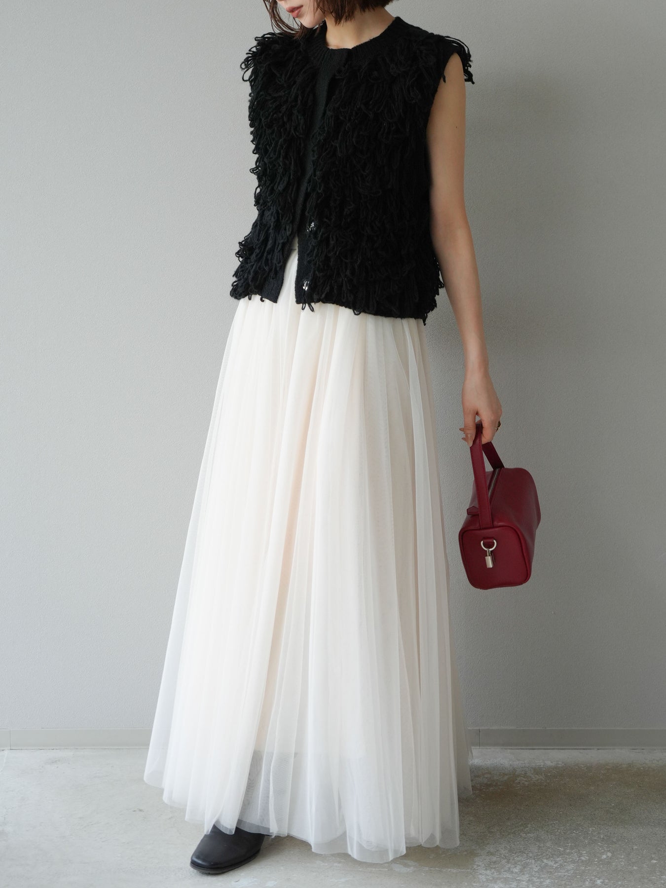 [SET] 前開衩針織背心 + 薄紗蓬鬆裙 (2 件套)