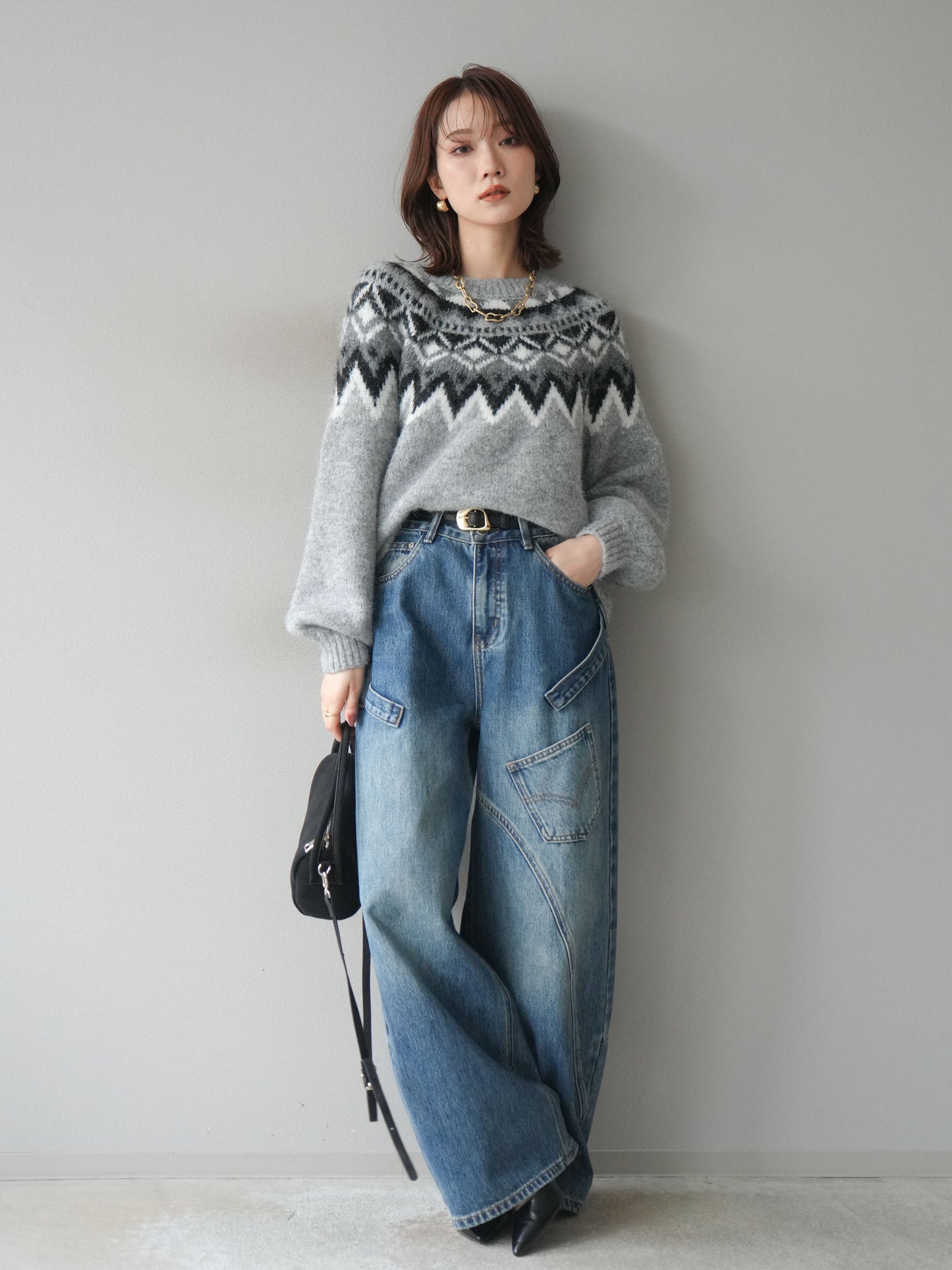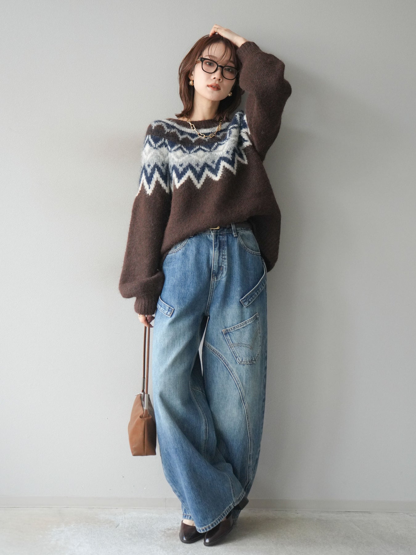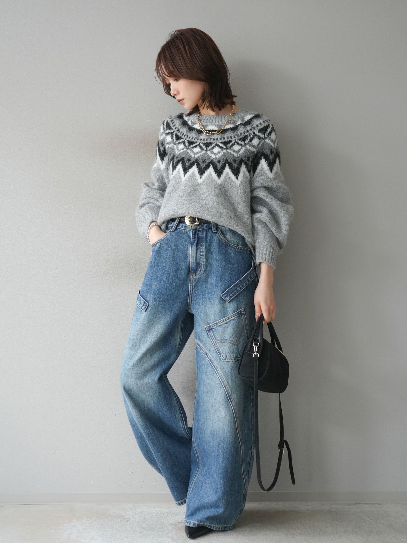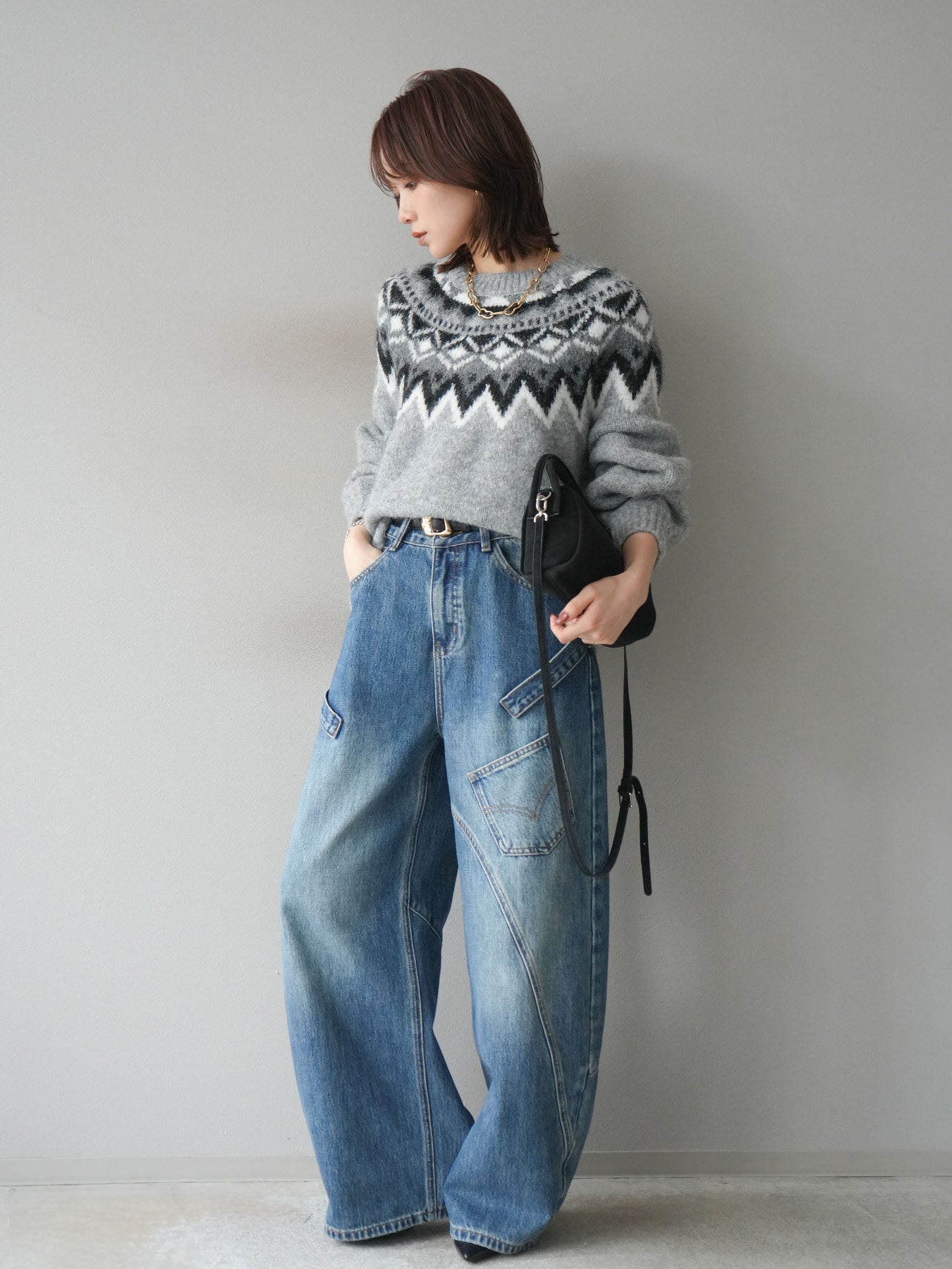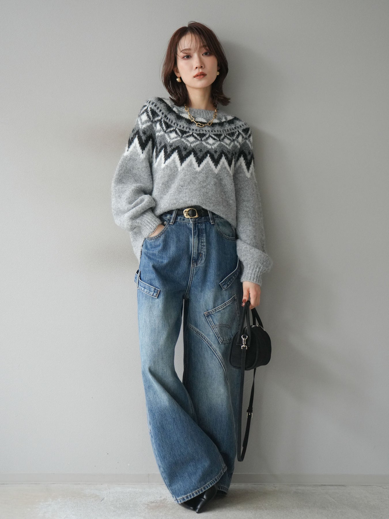 [SET]求心柄オーバーニットプルオーバー+ペインターカーブデニムパンツ(2set)