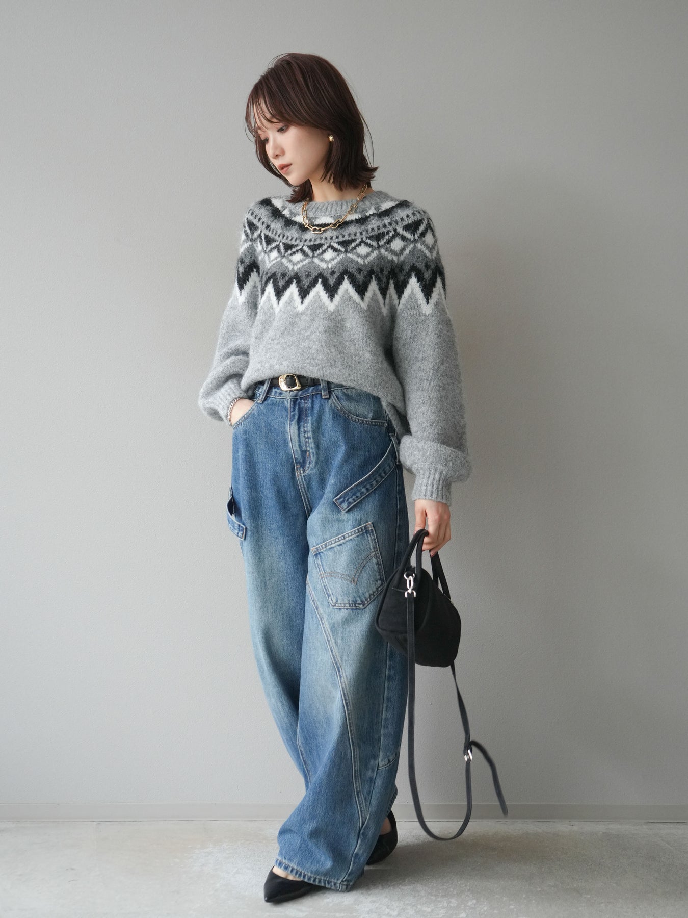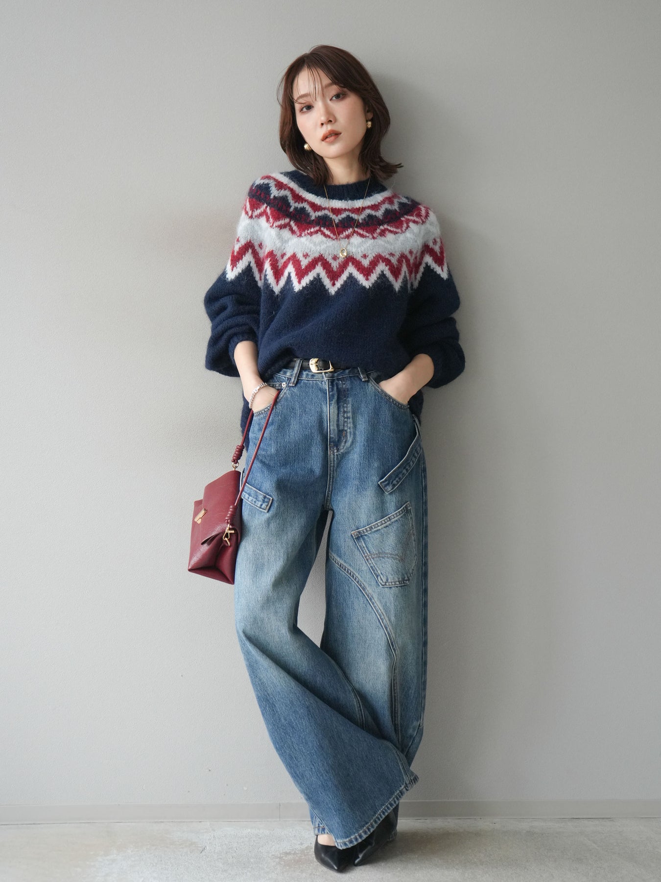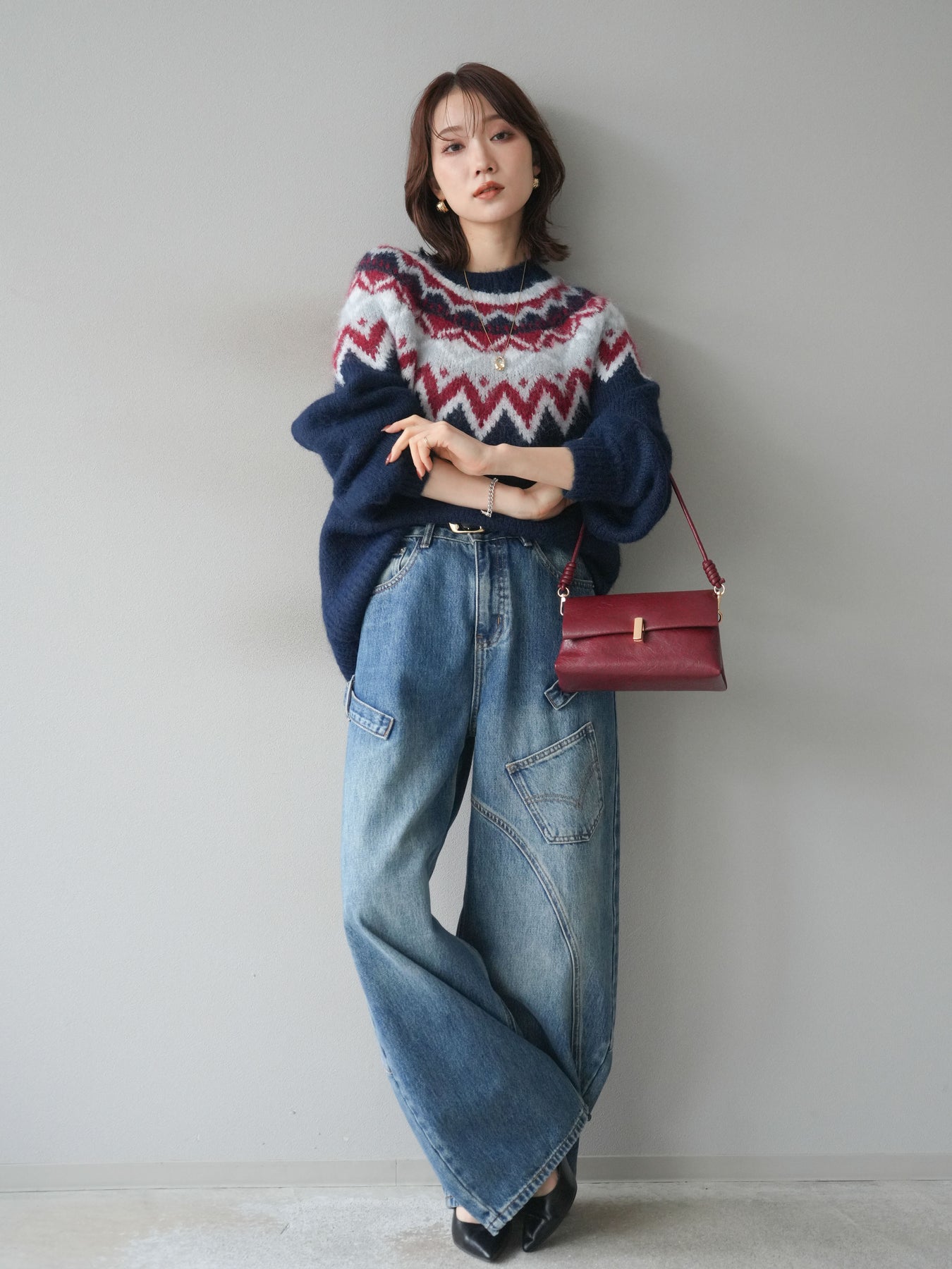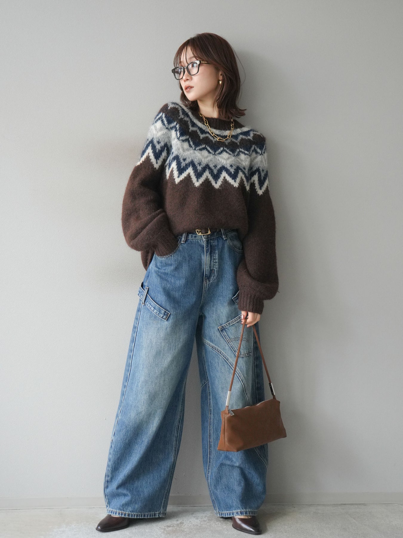 [SET]求心柄オーバーニットプルオーバー+ペインターカーブデニムパンツ(2set)