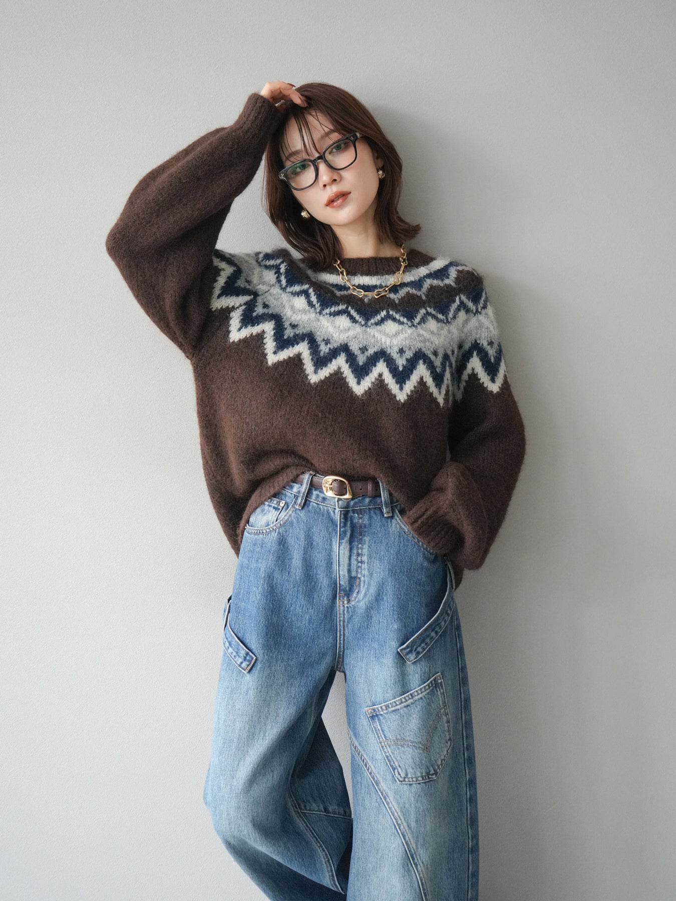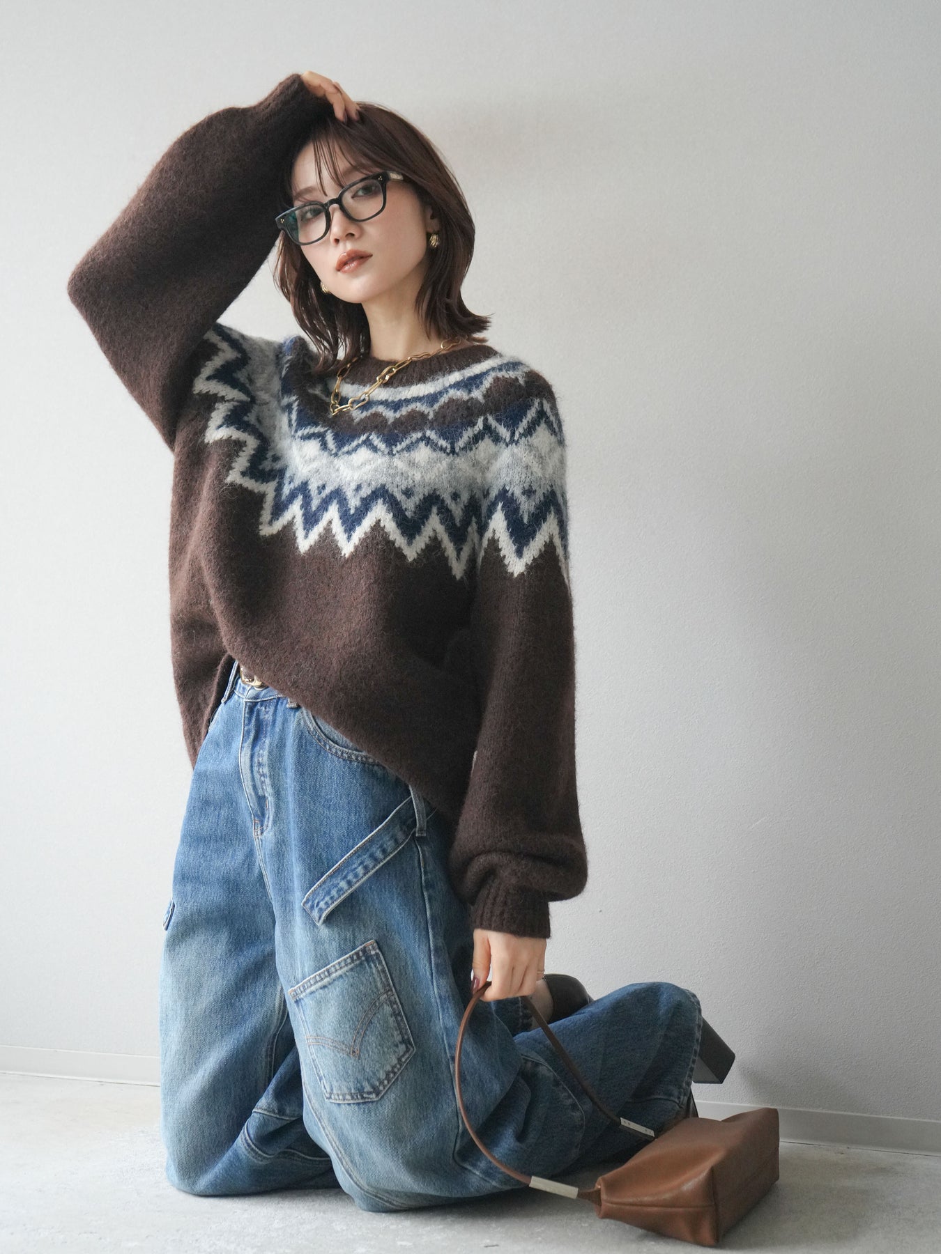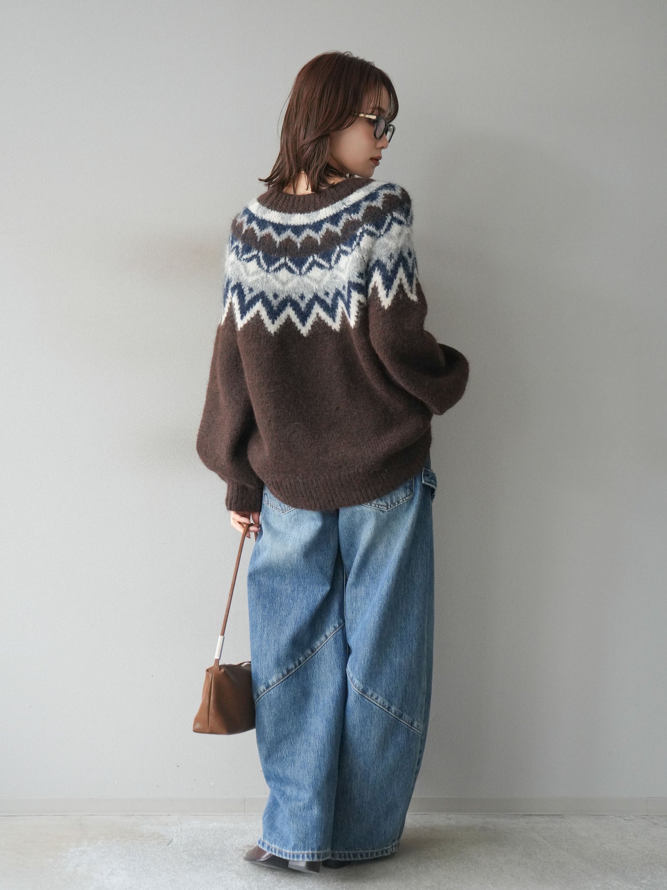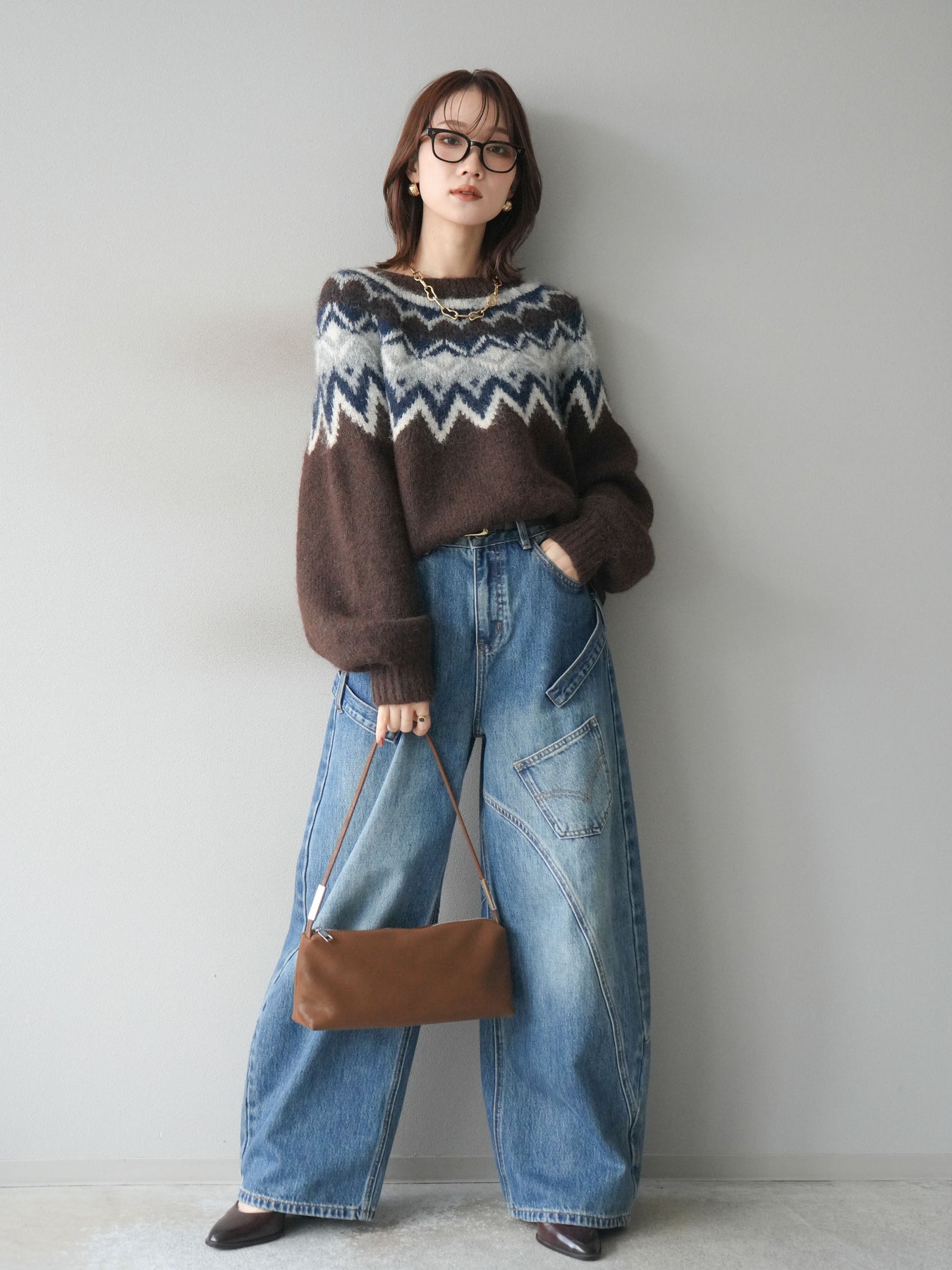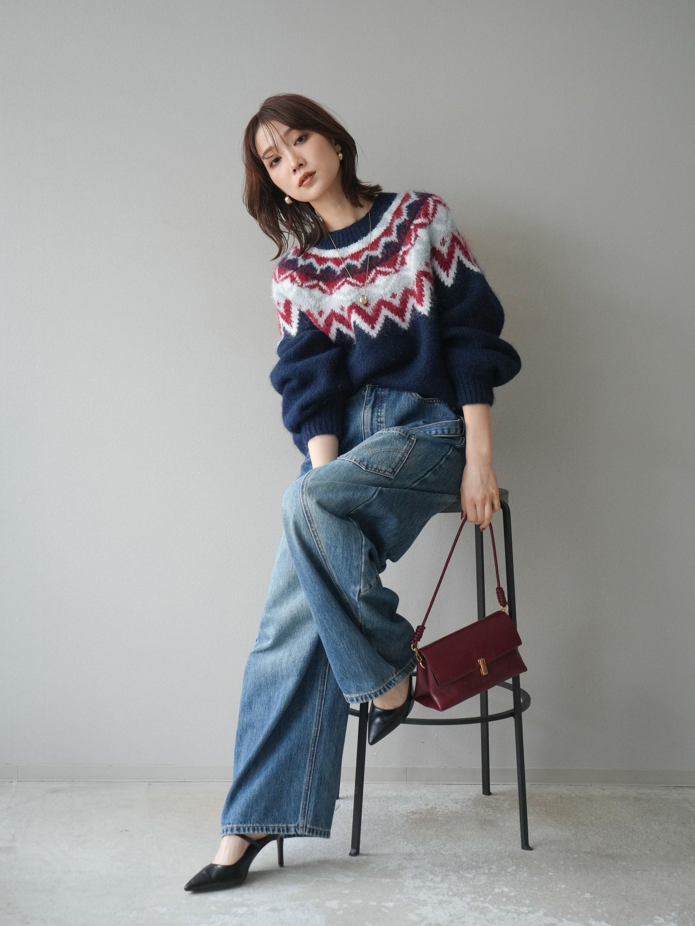 [SET]求心柄オーバーニットプルオーバー+ペインターカーブデニムパンツ(2set)