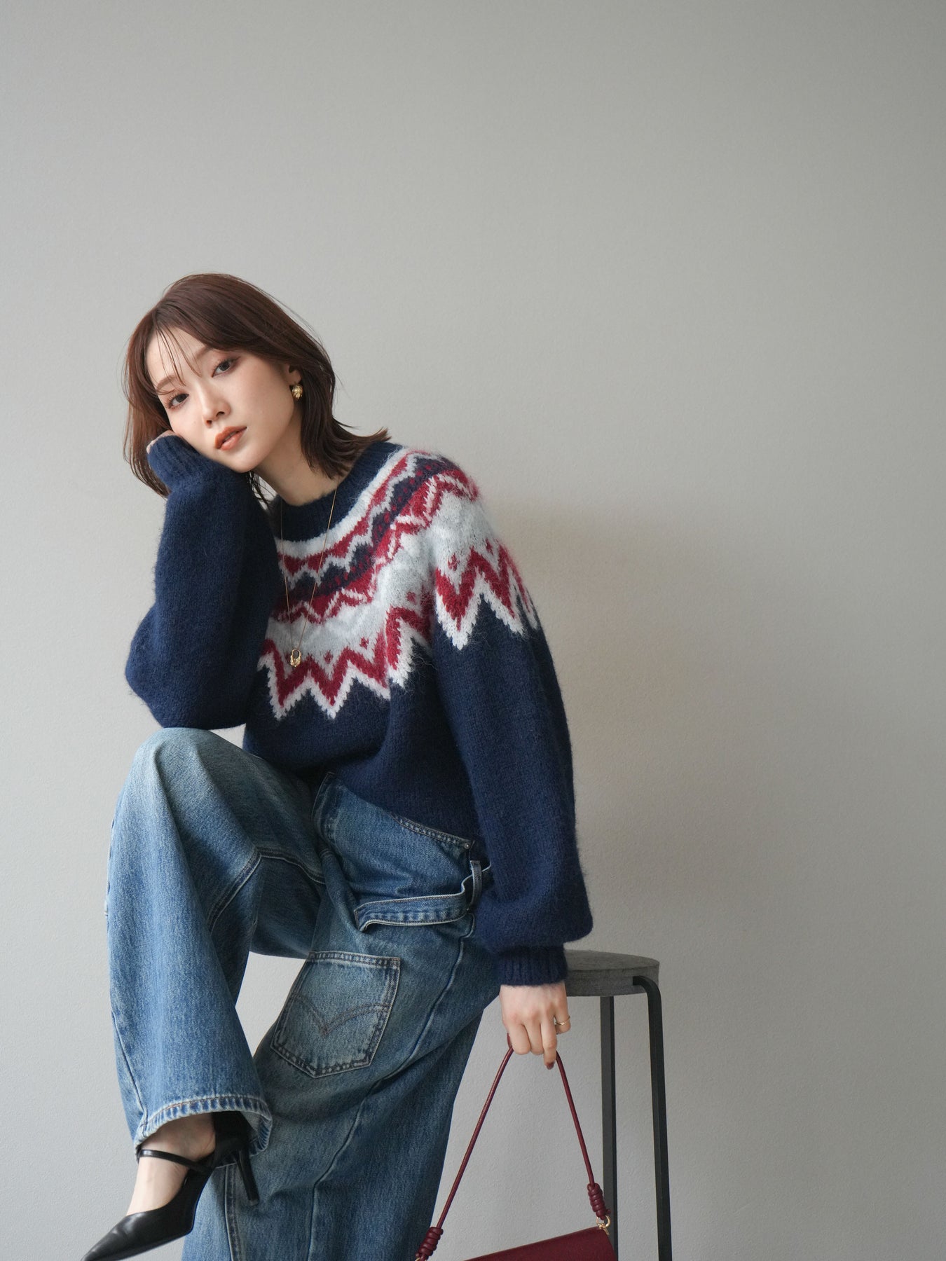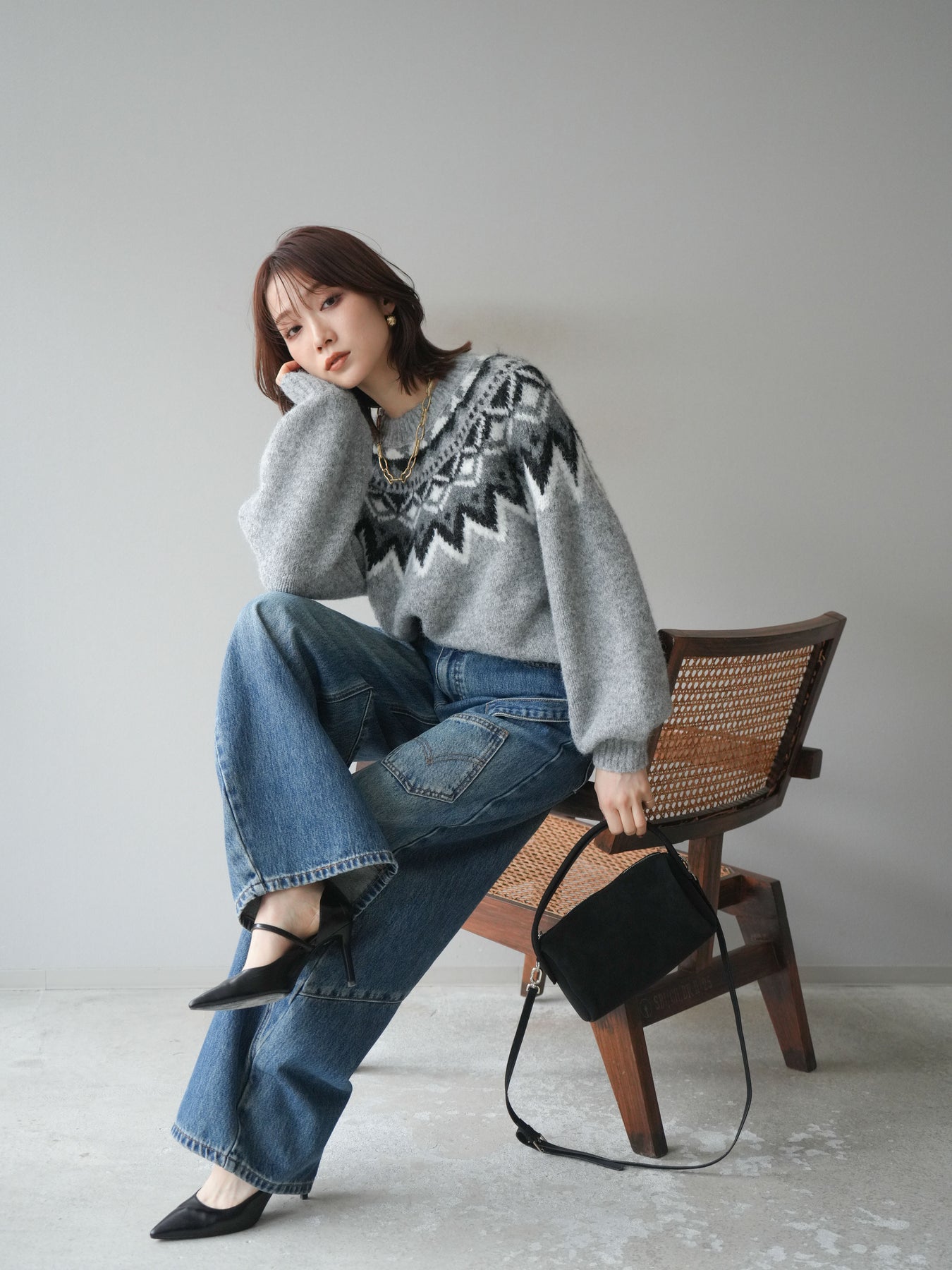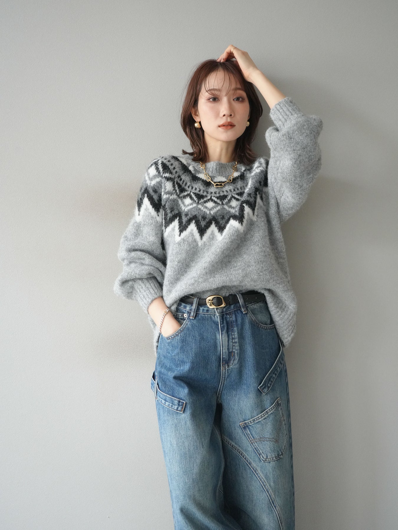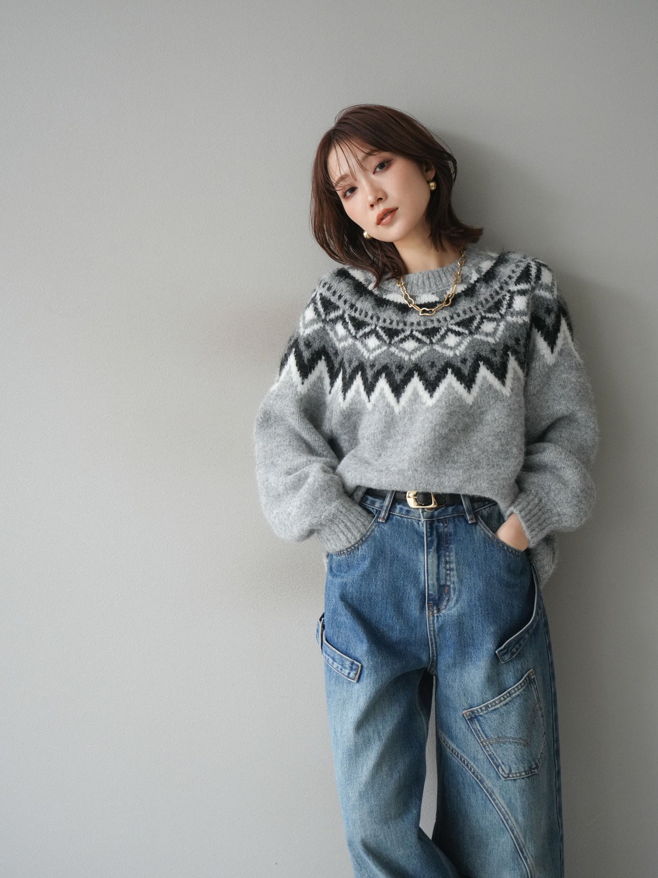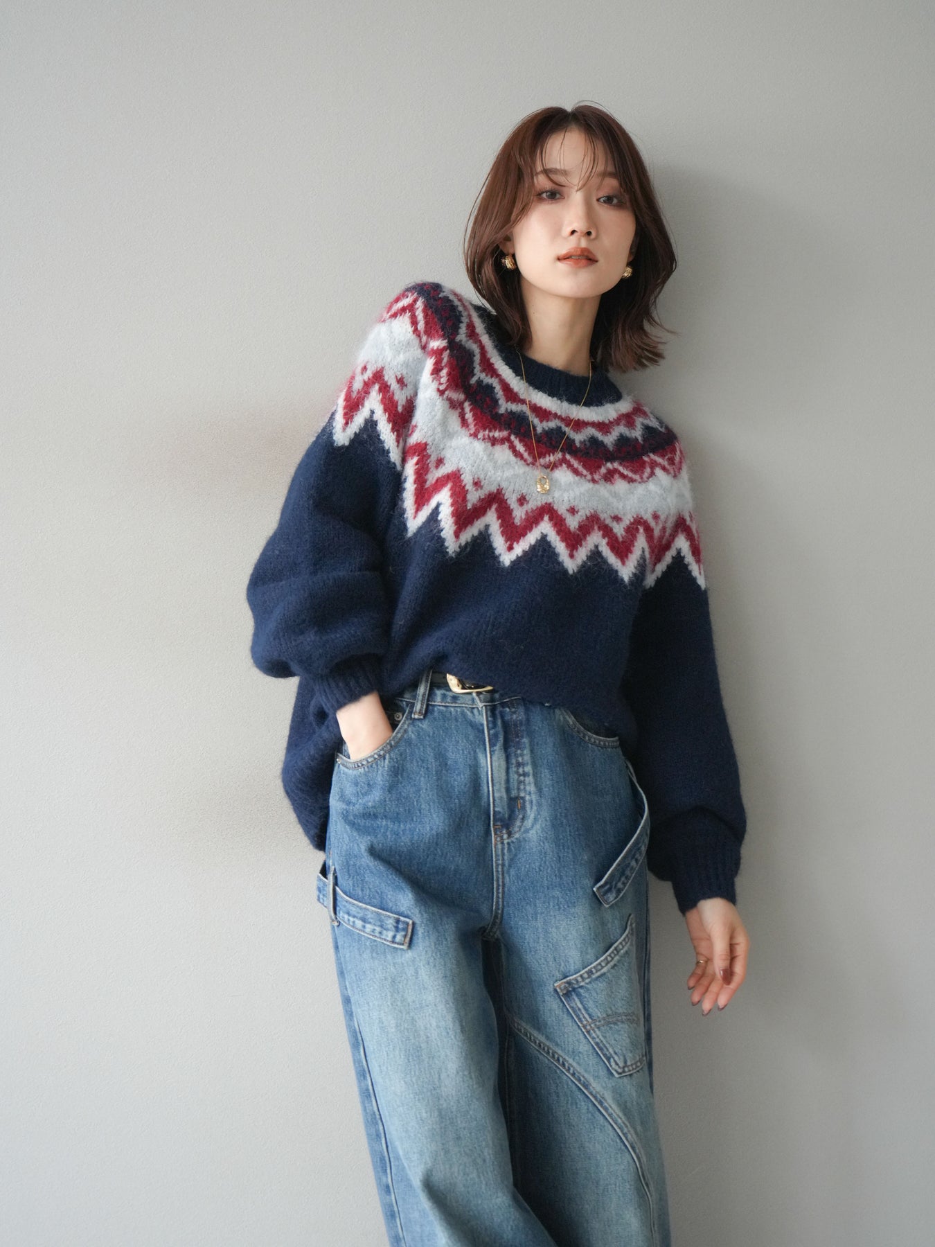 シーズンムードを高める求心柄デザインが目を惹くニットプルオーバー。 程よく肉厚で柔らかな風合いのニット素材を使用し、暖かさと着心地の良さを兼ね備えています。 首元をすっきりと見せるクルーネックと、ゆったりとしたオーバーシルエットが抜け感を演出。 1枚で存在感がありながらも、アウターのインにも映えるバランスの取れたデザインです。 デニムやスカートを合わせて、カジュアルにもフェミニンにも着こなせる万能アイテムです。 ※ボトムス、キャミソール(インナー)以外の商品は一律でインナーは付属していません。