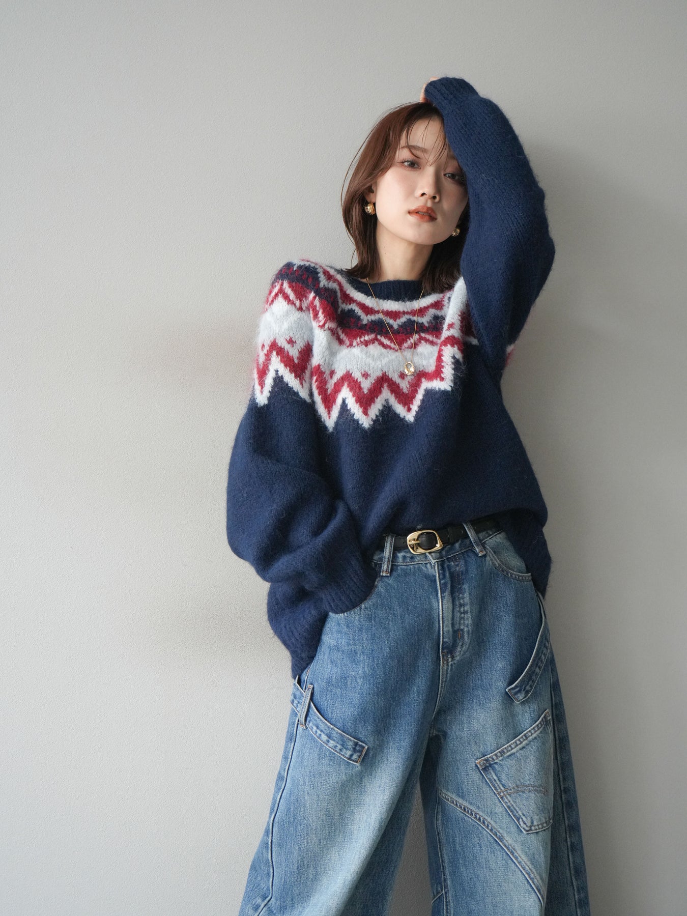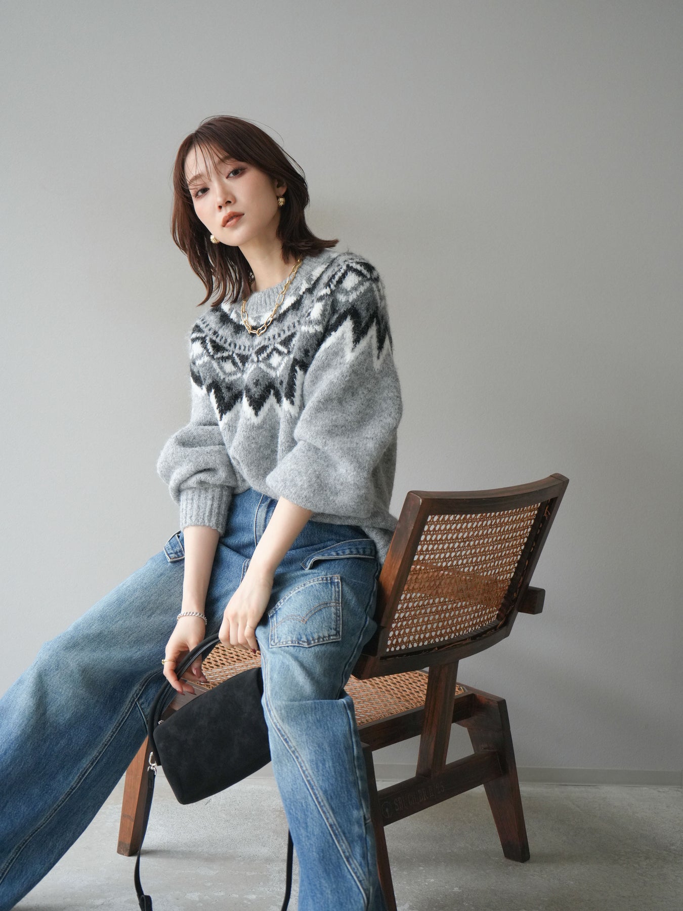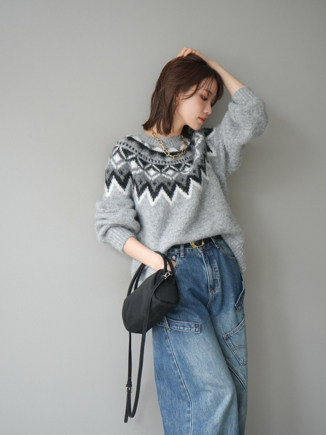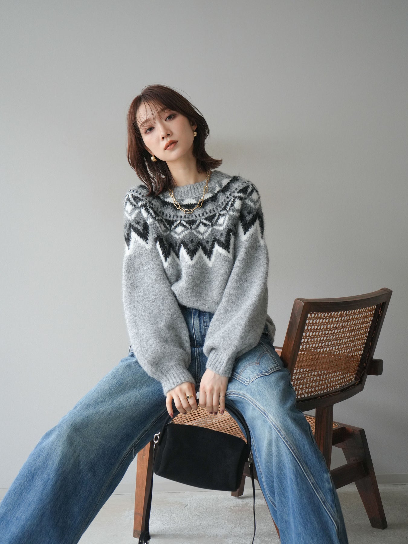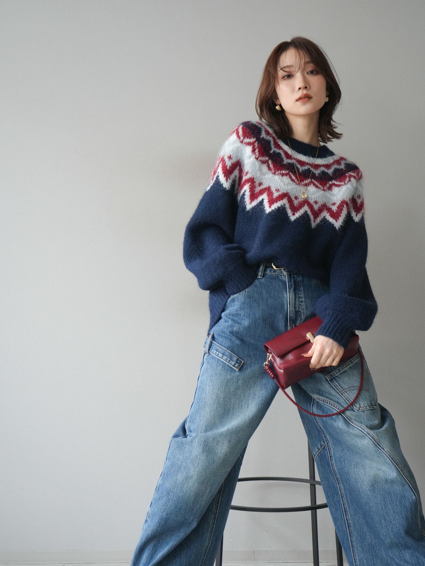 シーズンムードを高める求心柄デザインが目を惹くニットプルオーバー。 程よく肉厚で柔らかな風合いのニット素材を使用し、暖かさと着心地の良さを兼ね備えています。 首元をすっきりと見せるクルーネックと、ゆったりとしたオーバーシルエットが抜け感を演出。 1枚で存在感がありながらも、アウターのインにも映えるバランスの取れたデザインです。 デニムやスカートを合わせて、カジュアルにもフェミニンにも着こなせる万能アイテムです。 ※ボトムス、キャミソール(インナー)以外の商品は一律でインナーは付属していません。