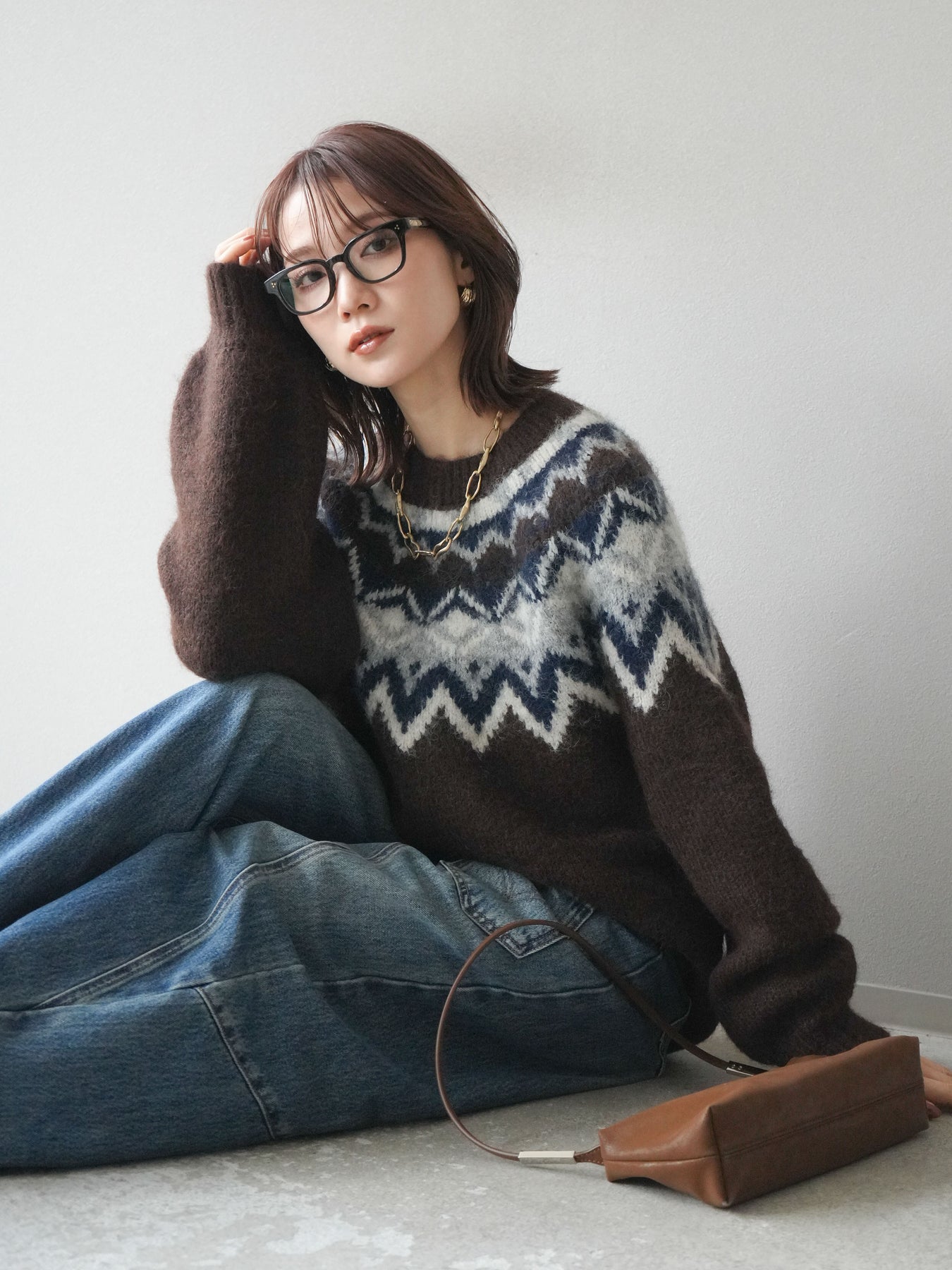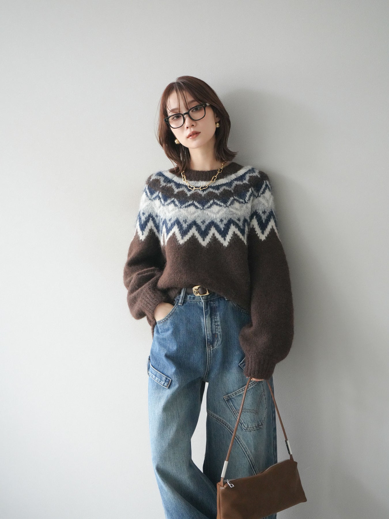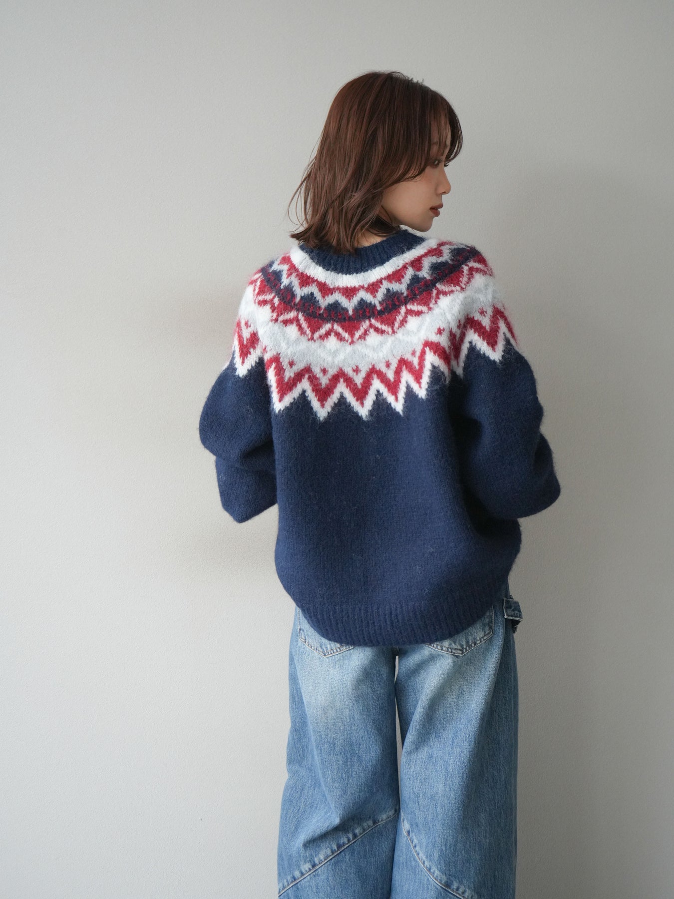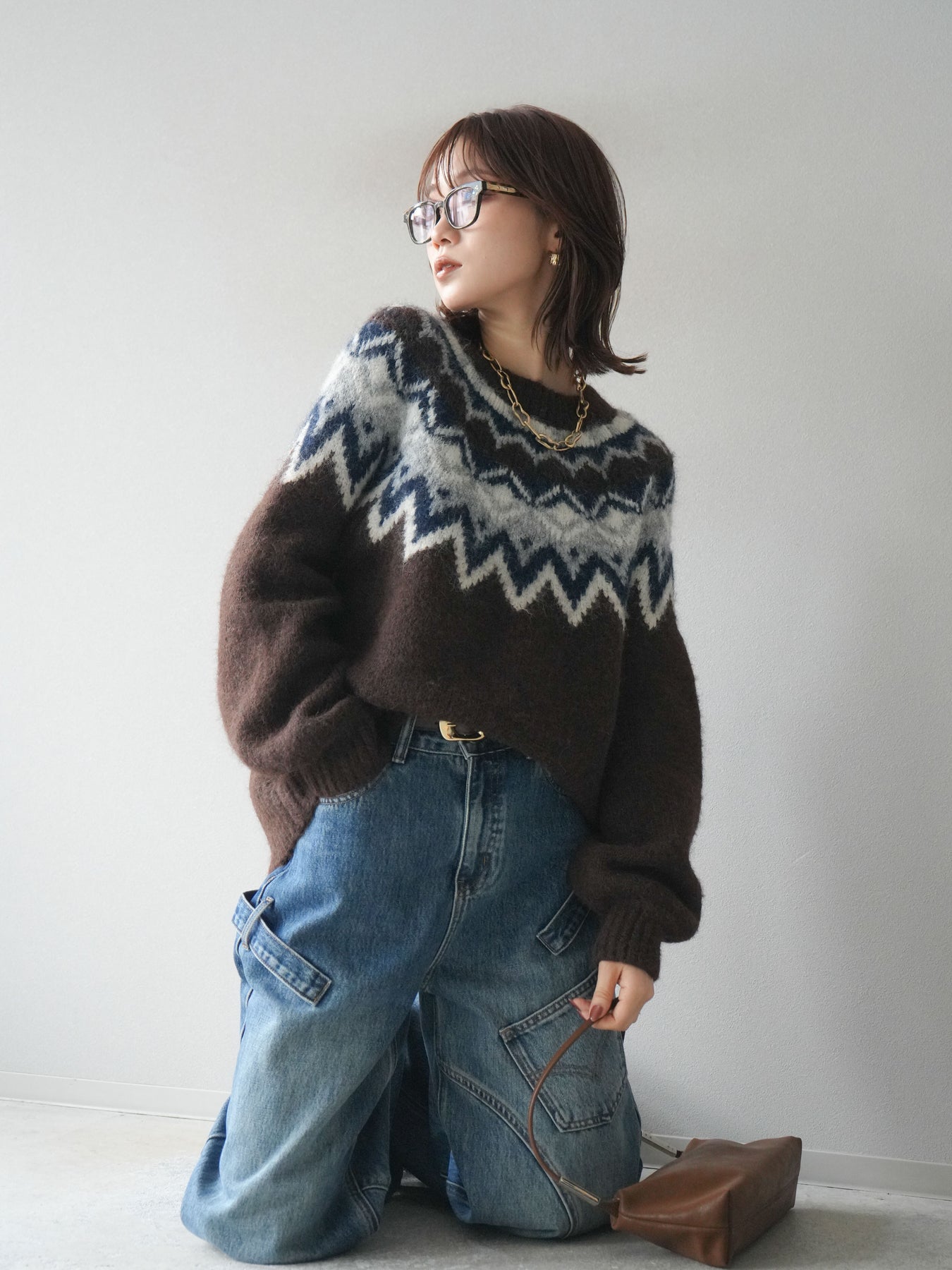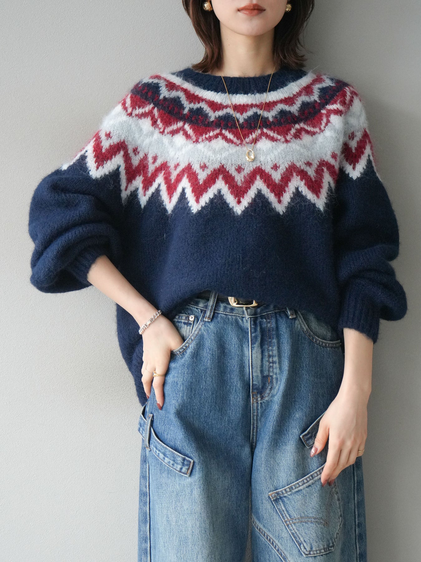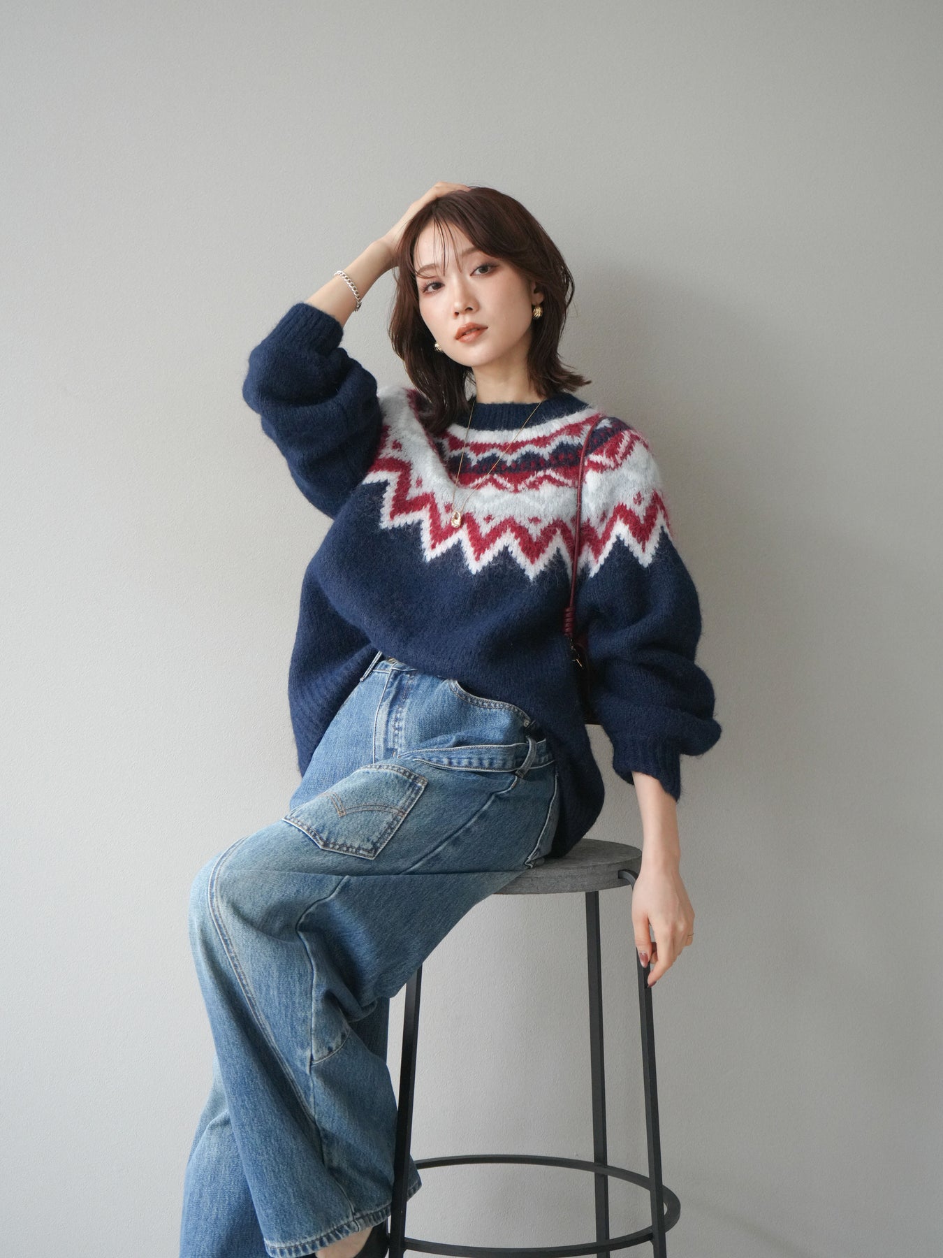 シーズンムードを高める求心柄デザインが目を惹くニットプルオーバー。 程よく肉厚で柔らかな風合いのニット素材を使用し、暖かさと着心地の良さを兼ね備えています。 首元をすっきりと見せるクルーネックと、ゆったりとしたオーバーシルエットが抜け感を演出。 1枚で存在感がありながらも、アウターのインにも映えるバランスの取れたデザインです。 デニムやスカートを合わせて、カジュアルにもフェミニンにも着こなせる万能アイテムです。 ※ボトムス、キャミソール(インナー)以外の商品は一律でインナーは付属していません。
