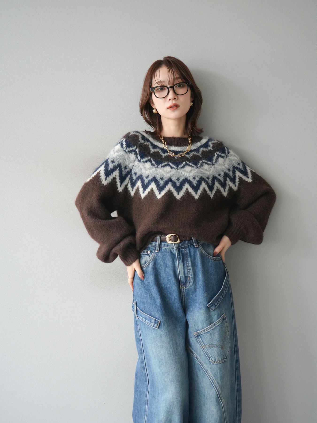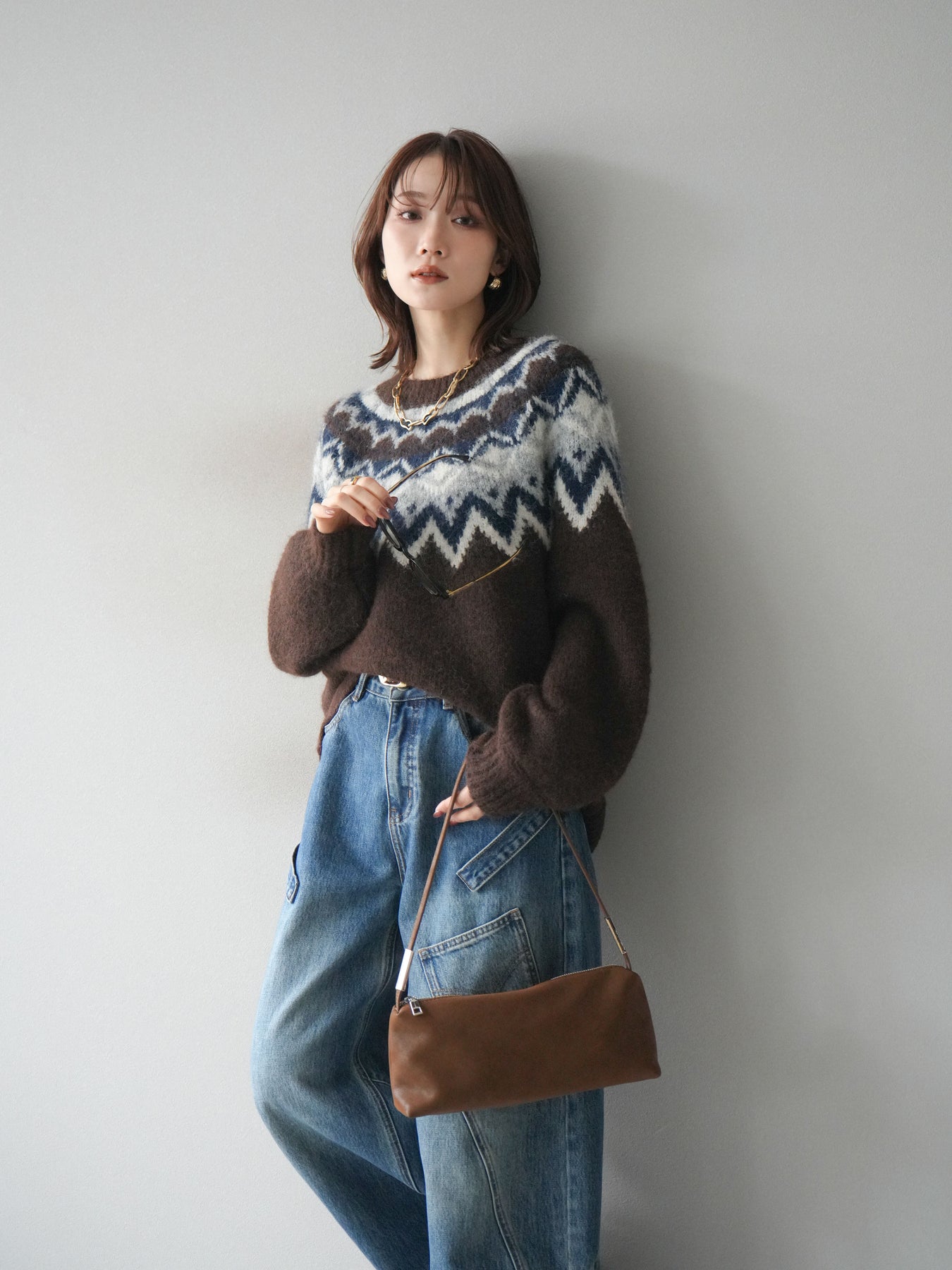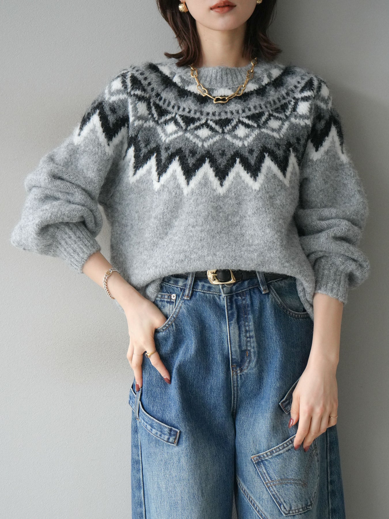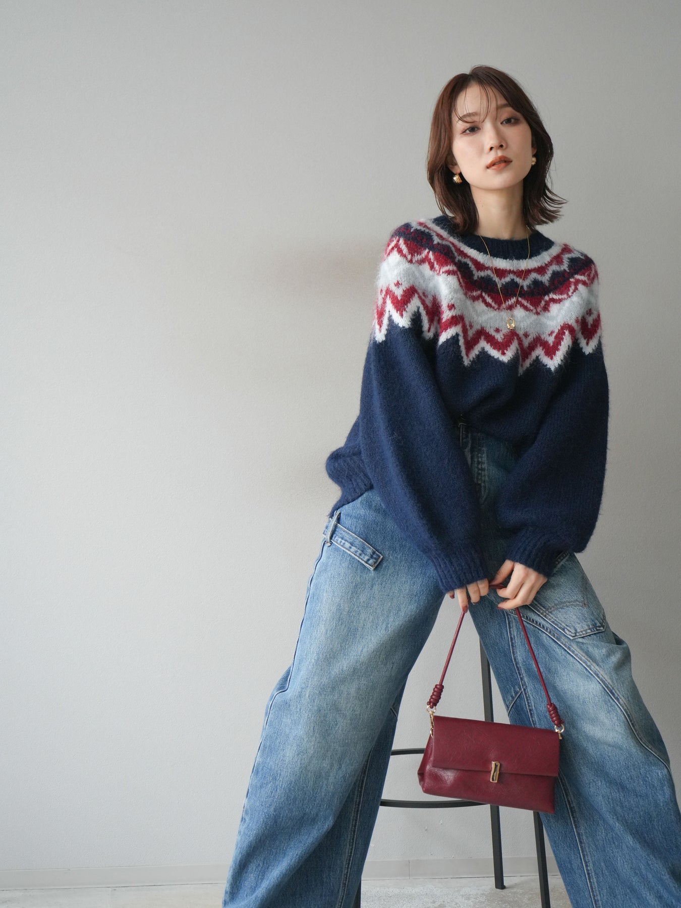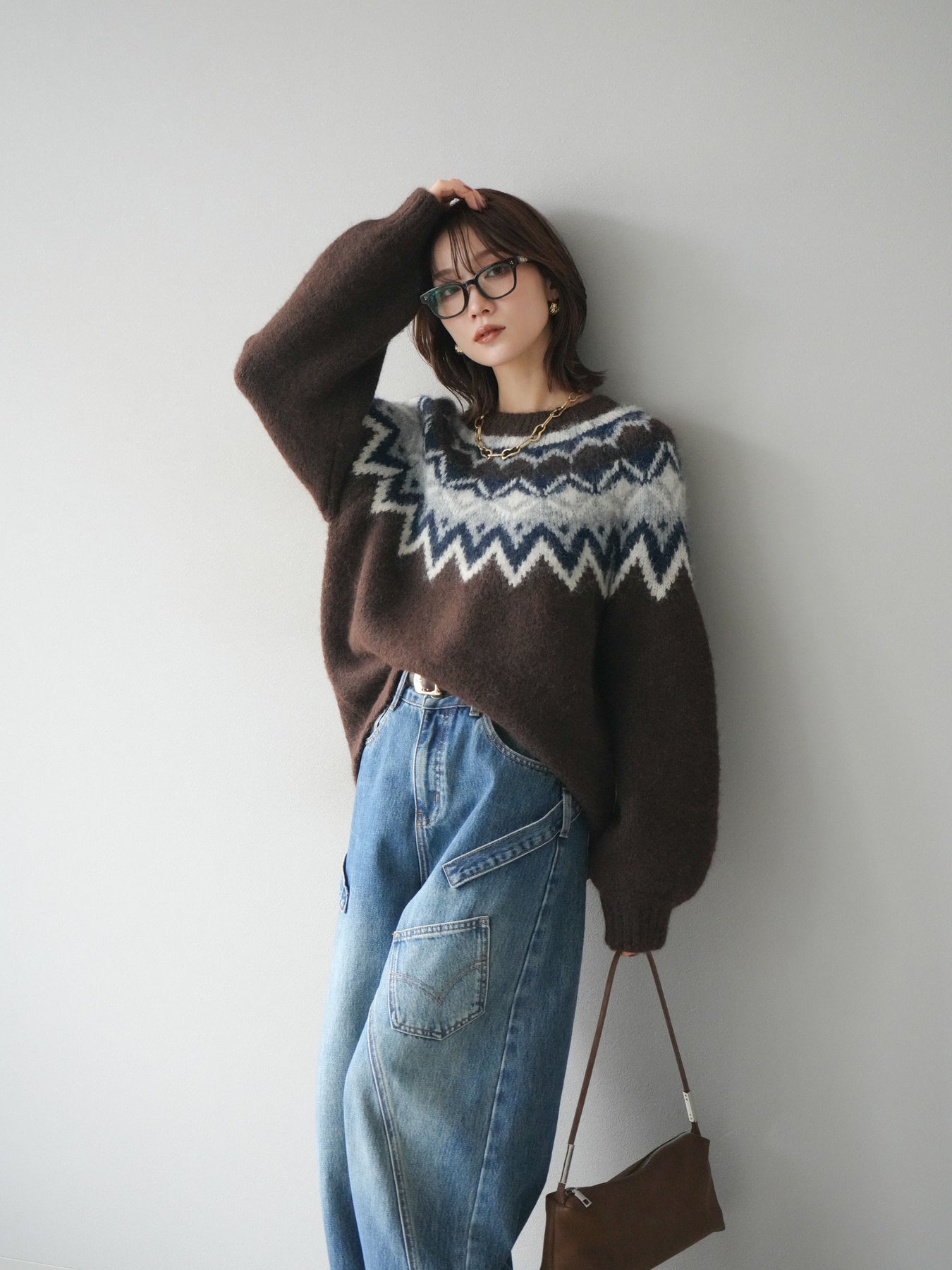 シーズンムードを高める求心柄デザインが目を惹くニットプルオーバー。 程よく肉厚で柔らかな風合いのニット素材を使用し、暖かさと着心地の良さを兼ね備えています。 首元をすっきりと見せるクルーネックと、ゆったりとしたオーバーシルエットが抜け感を演出。 1枚で存在感がありながらも、アウターのインにも映えるバランスの取れたデザインです。 デニムやスカートを合わせて、カジュアルにもフェミニンにも着こなせる万能アイテムです。 ※ボトムス、キャミソール(インナー)以外の商品は一律でインナーは付属していません。