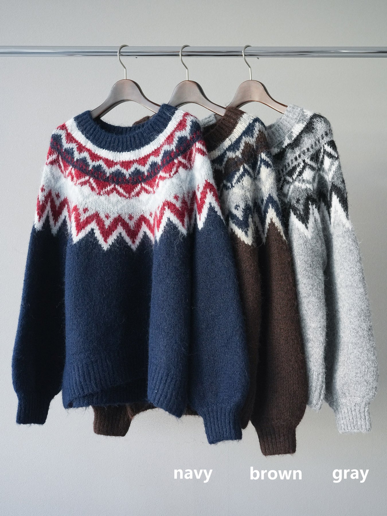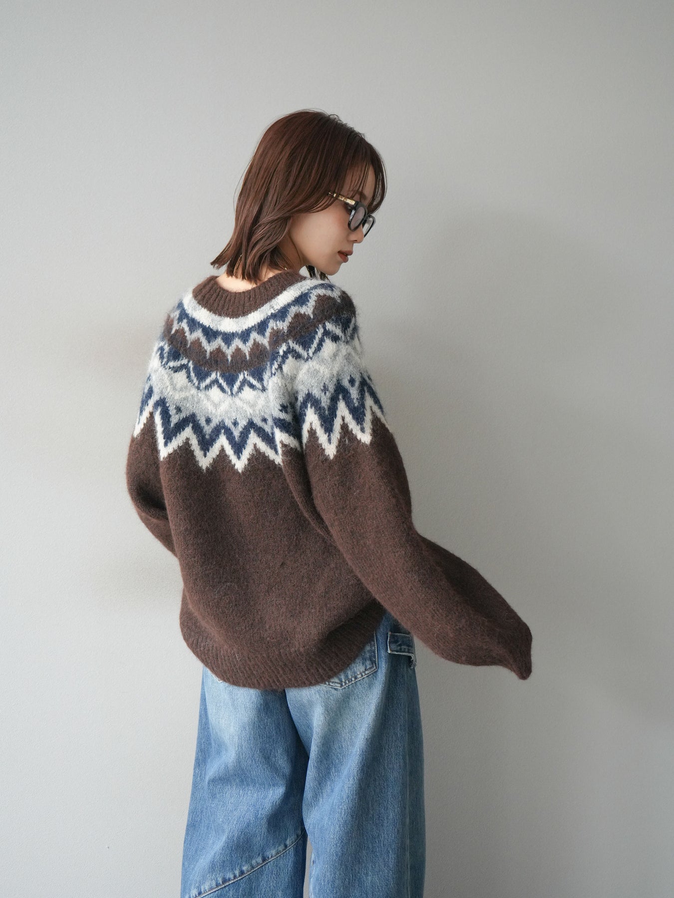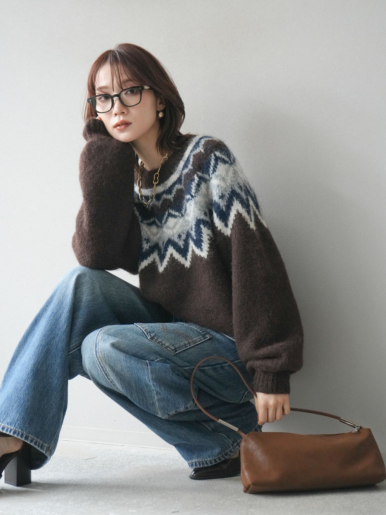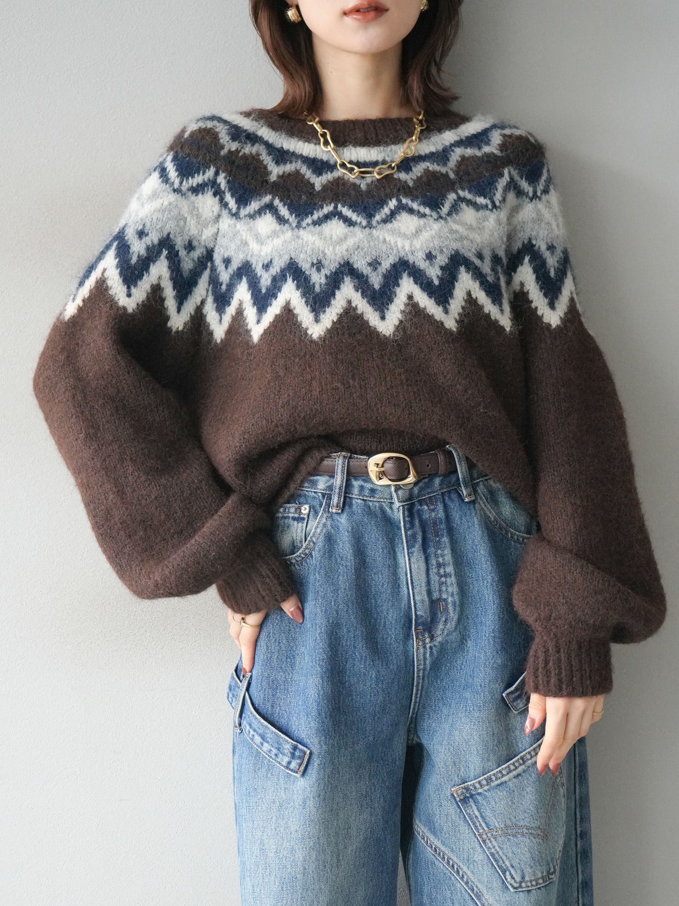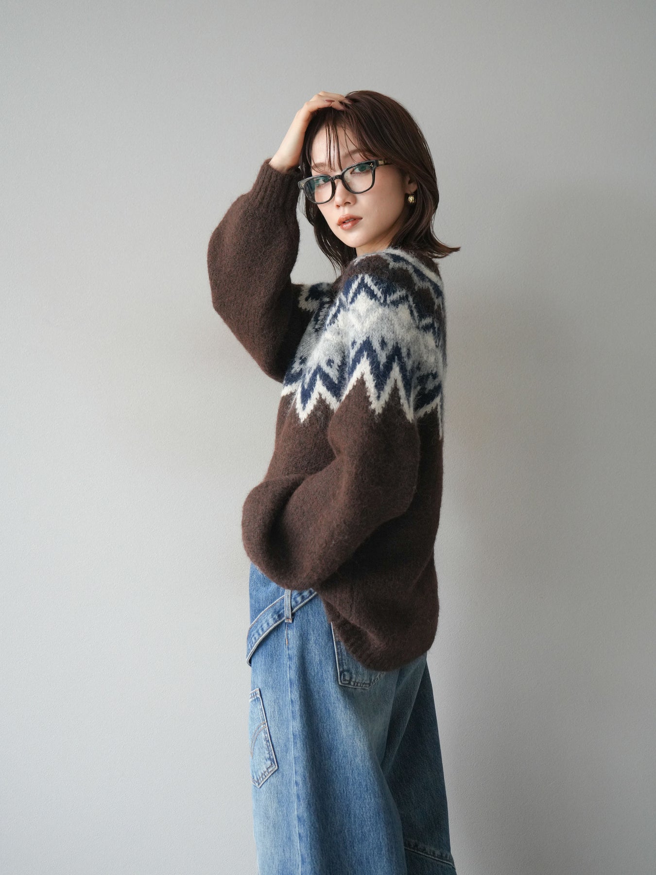 シーズンムードを高める求心柄デザインが目を惹くニットプルオーバー。 程よく肉厚で柔らかな風合いのニット素材を使用し、暖かさと着心地の良さを兼ね備えています。 首元をすっきりと見せるクルーネックと、ゆったりとしたオーバーシルエットが抜け感を演出。 1枚で存在感がありながらも、アウターのインにも映えるバランスの取れたデザインです。 デニムやスカートを合わせて、カジュアルにもフェミニンにも着こなせる万能アイテムです。 ※ボトムス、キャミソール(インナー)以外の商品は一律でインナーは付属していません。