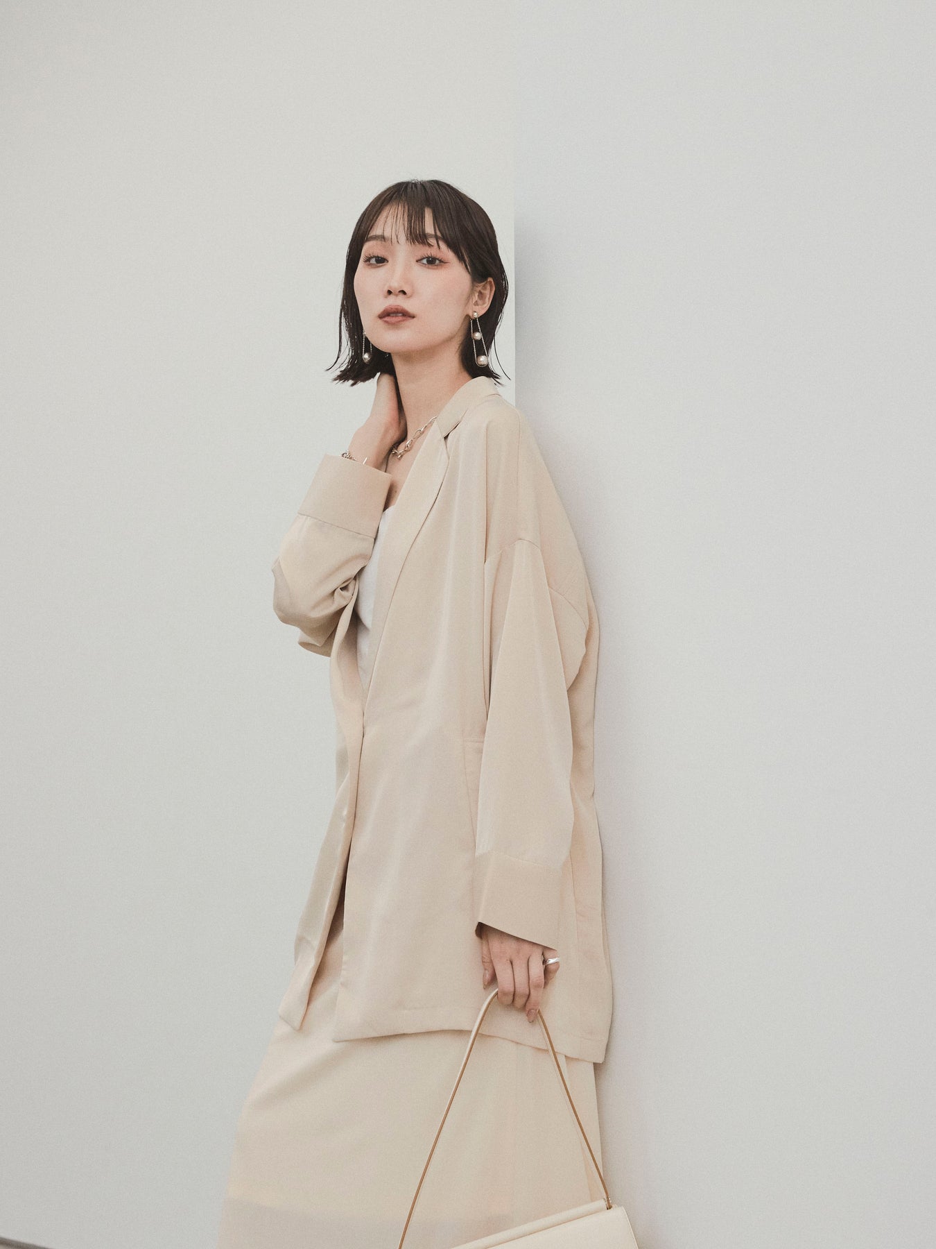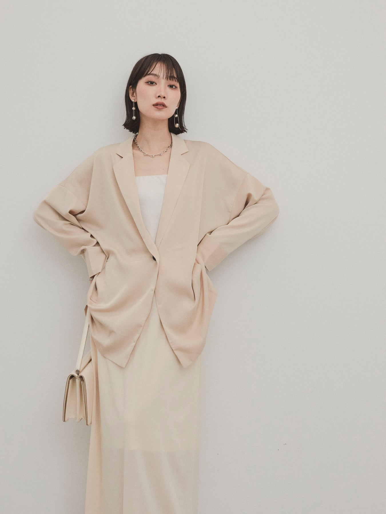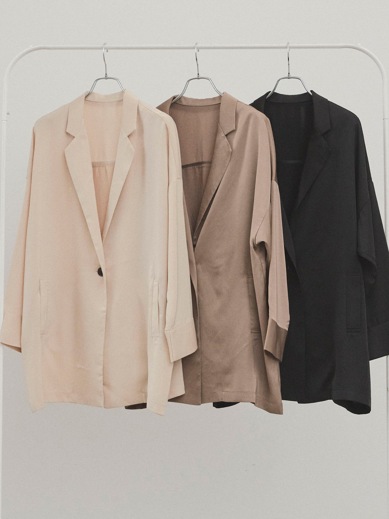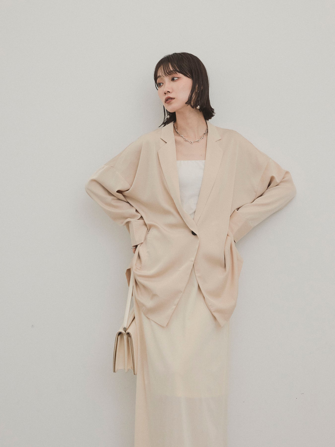 這款輕便外套採用霧面緞面材質製成,光澤度適中,營造出優雅而輕鬆的外觀。 光滑的垂墜自然貼合身體,只需穿上即可展現精緻的外觀。 它具有寬鬆的超大輪廓,並由輕質材料製成,易於穿戴。 捲起的袖子和自然的垂墜感賦予設計一種精緻的感覺。 只需搭配 T 卹或背心即可展現輕鬆休閒風格,或搭配洋裝和休閒褲即可展現更優雅的外觀。 這是一件適合四季穿著的服裝,它將成為您衣櫃中的必備品。