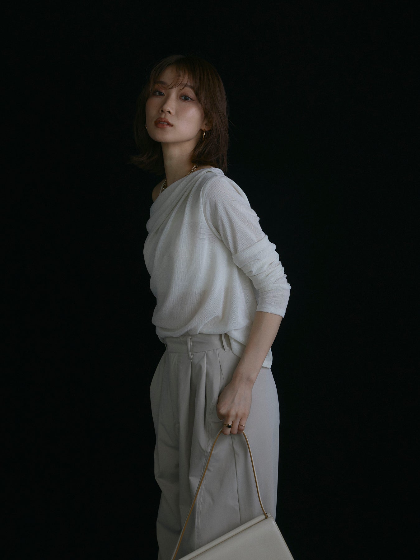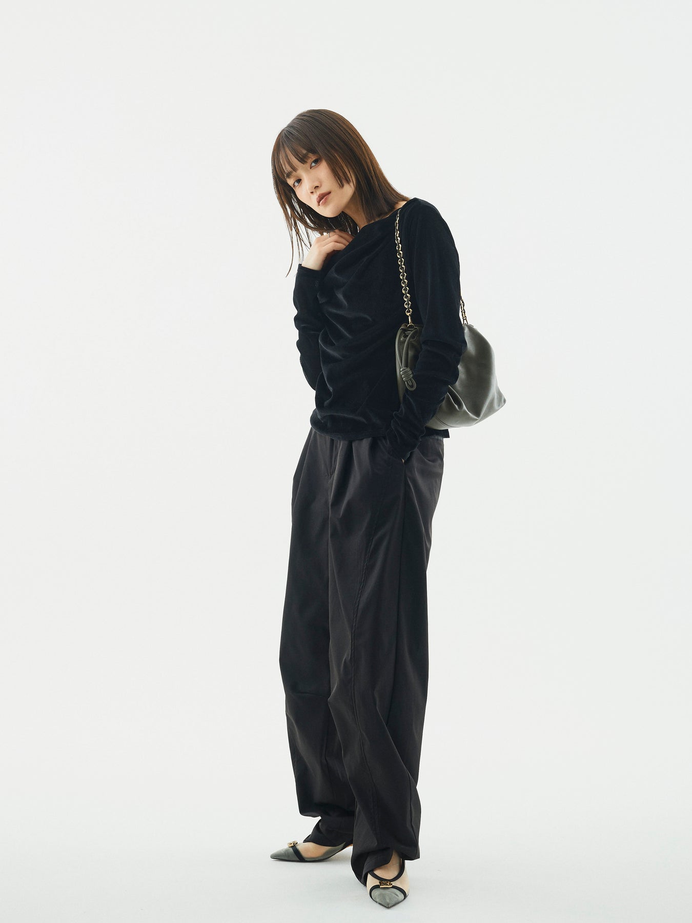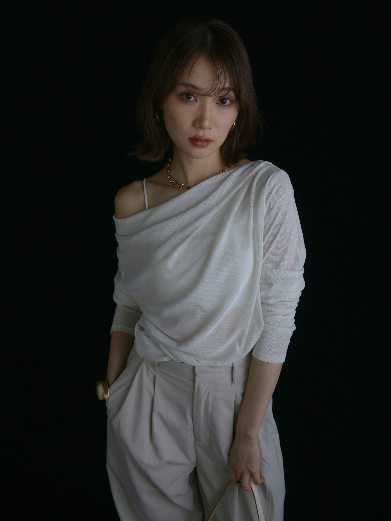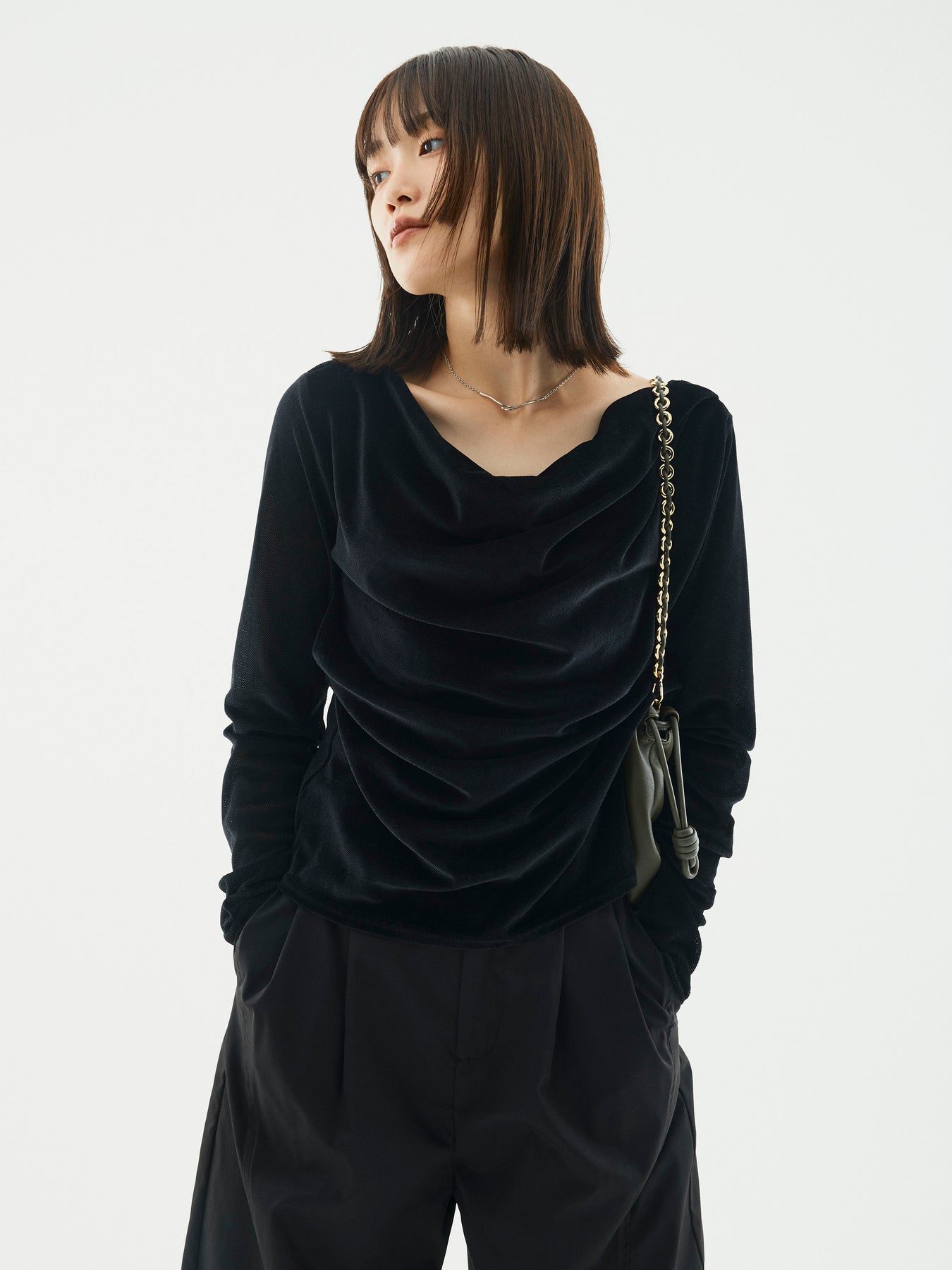 光沢のあるベロア素材にシアー感を重ねたドレープトップス。デコルテを美しく見せるタック入りのネックラインと、落ち感のあるシルエットが上品さと抜け感を両立。華奢なアクセやきれいめボトムスと好相性で、秋冬の主役トップスとして活躍。