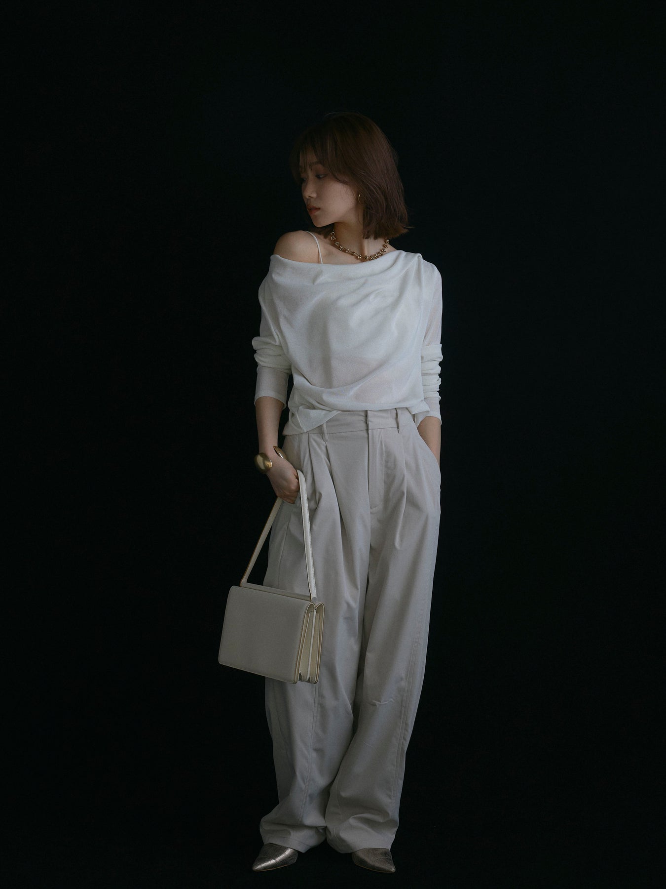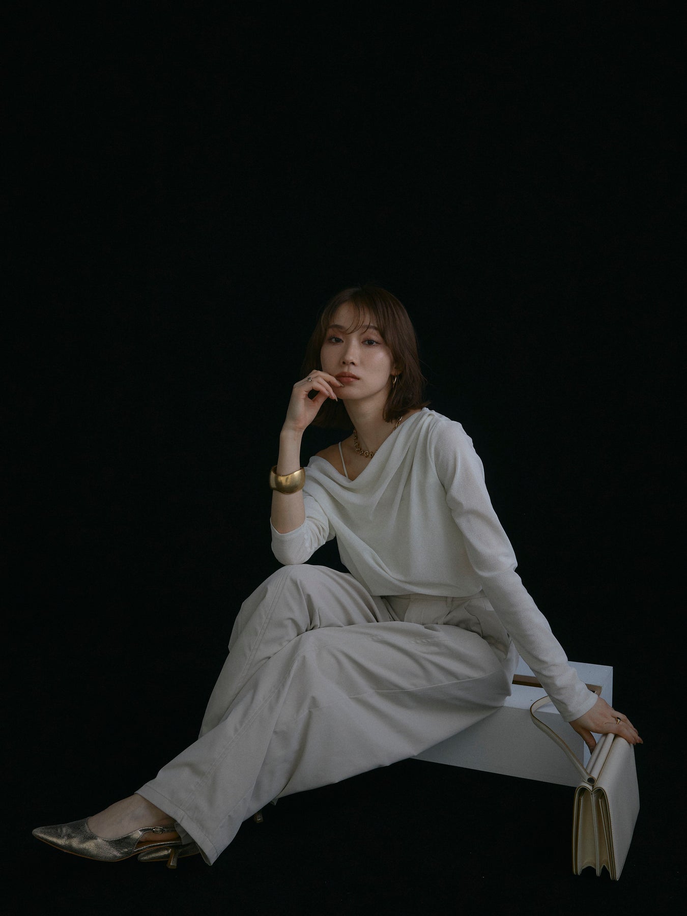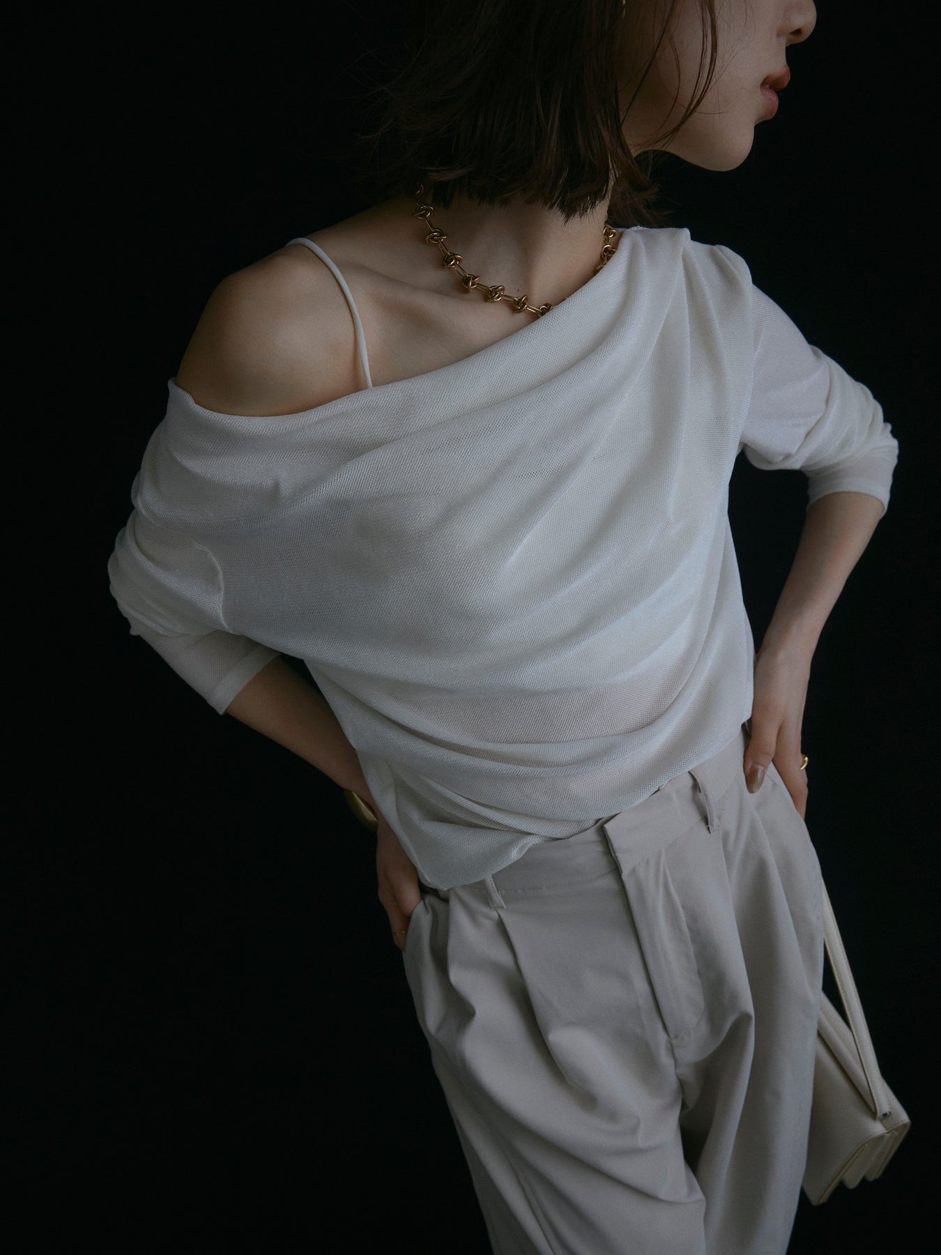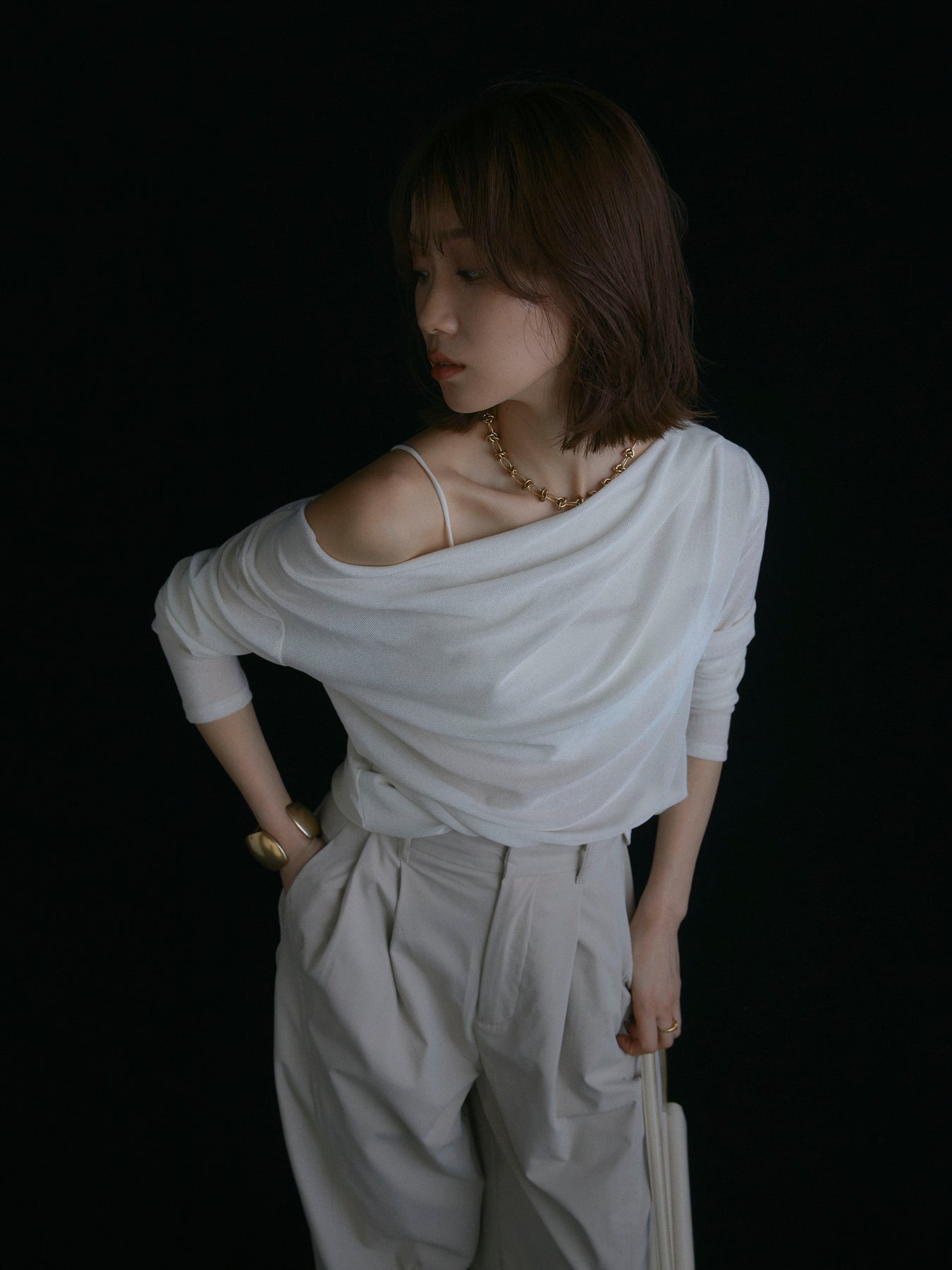 光沢のあるベロア素材にシアー感を重ねたドレープトップス。デコルテを美しく見せるタック入りのネックラインと、落ち感のあるシルエットが上品さと抜け感を両立。華奢なアクセやきれいめボトムスと好相性で、秋冬の主役トップスとして活躍。