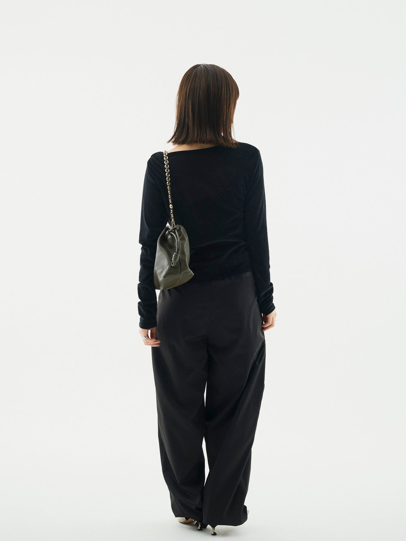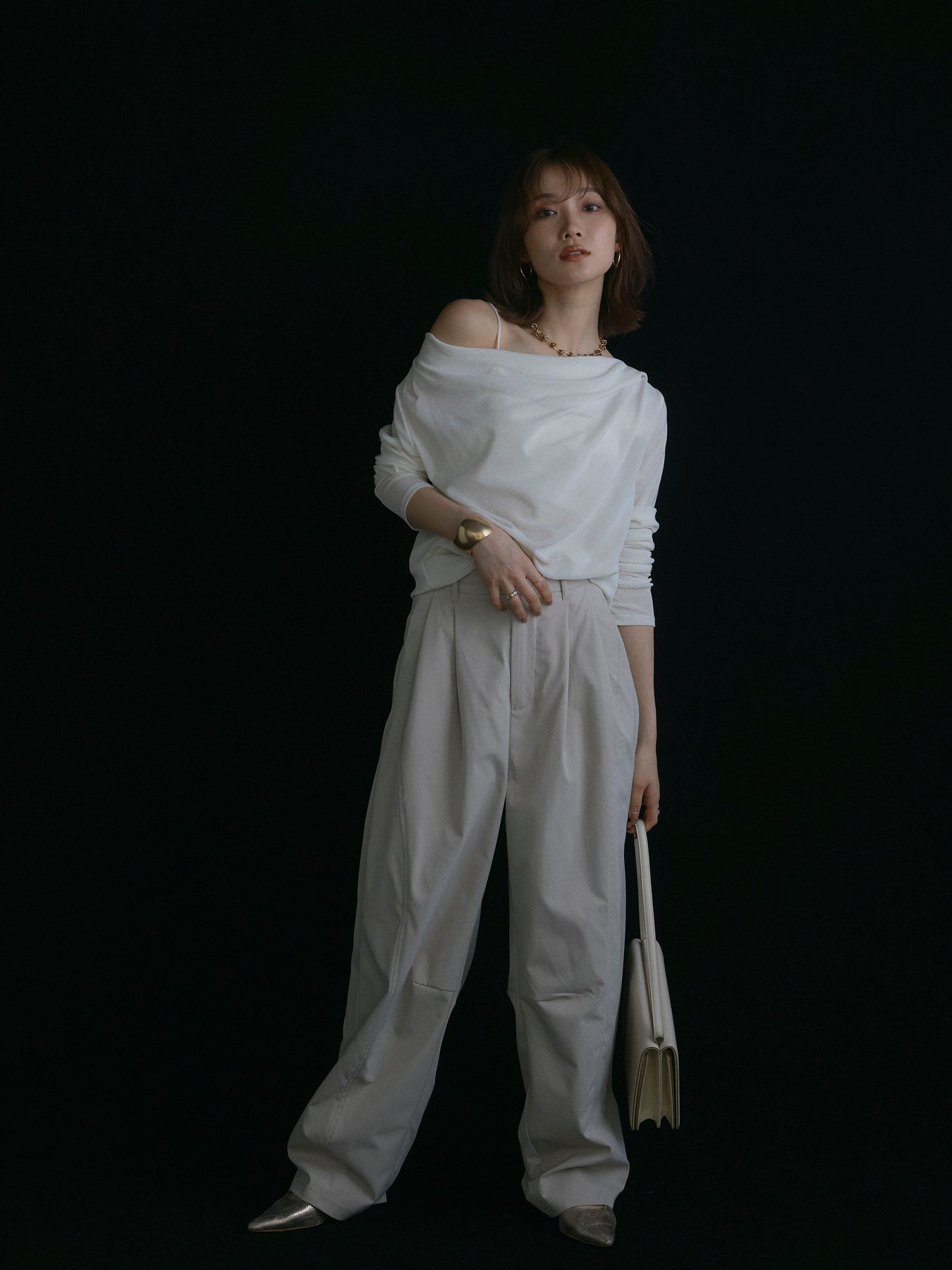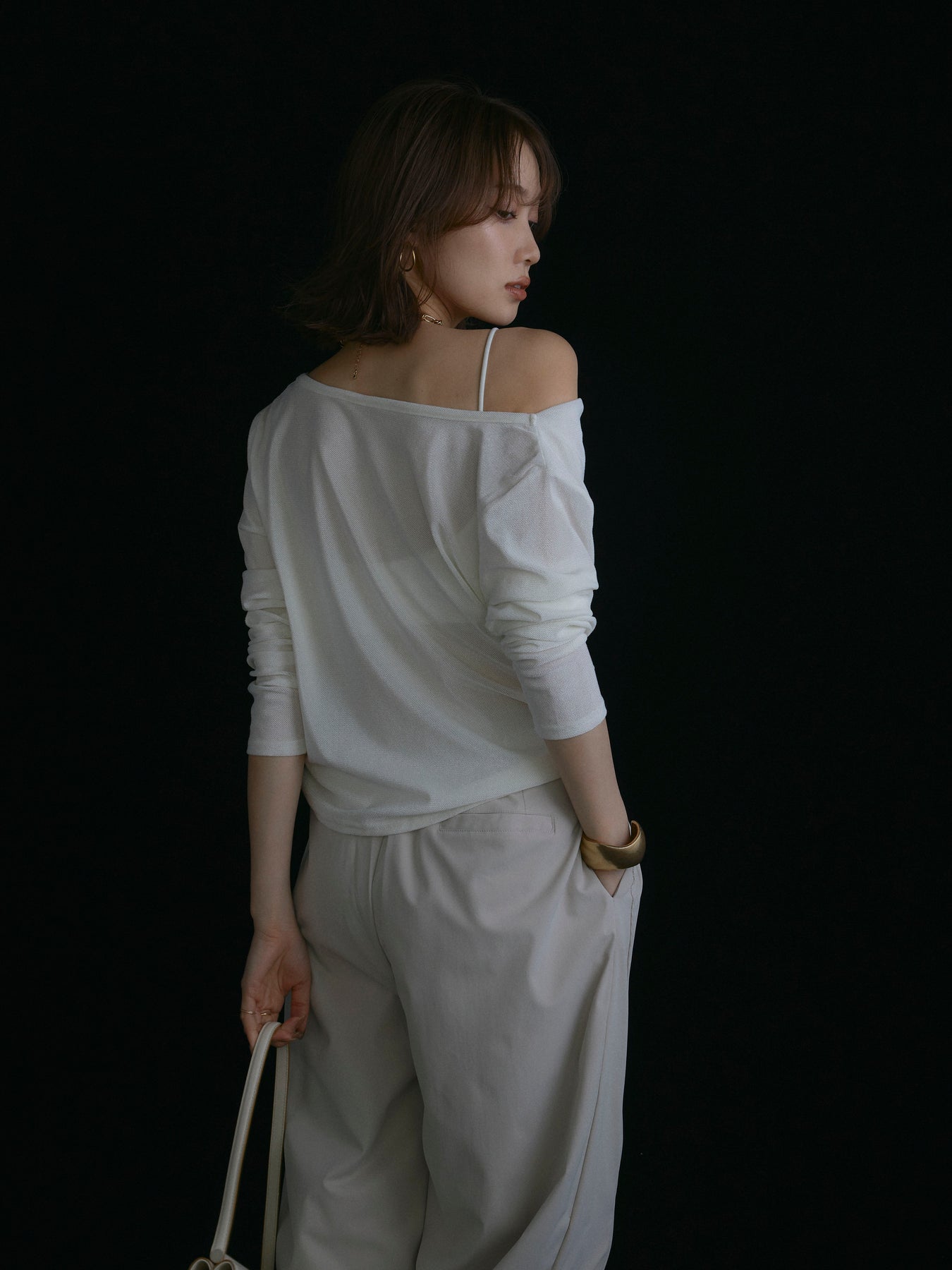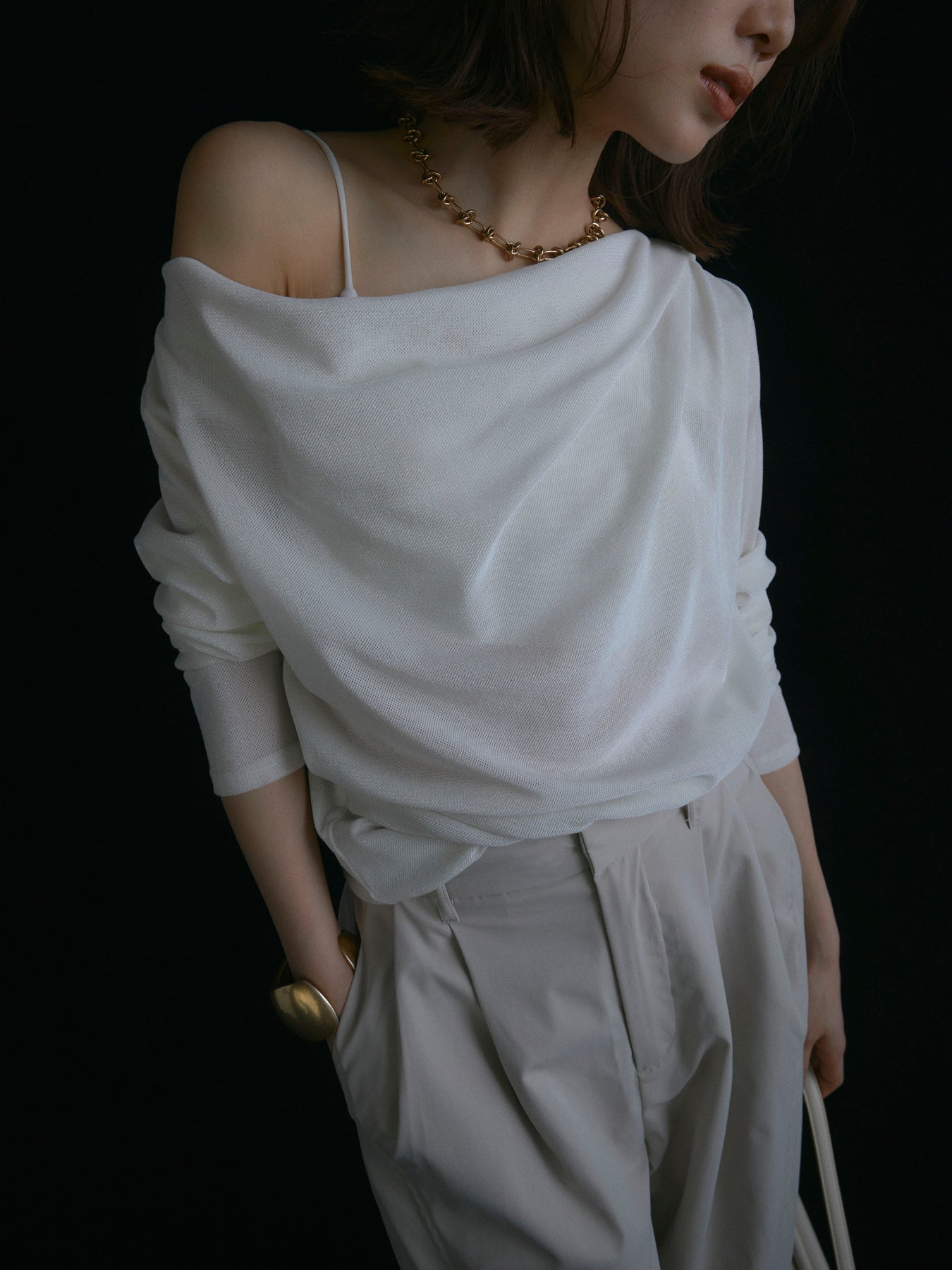 光沢のあるベロア素材にシアー感を重ねたドレープトップス。デコルテを美しく見せるタック入りのネックラインと、落ち感のあるシルエットが上品さと抜け感を両立。華奢なアクセやきれいめボトムスと好相性で、秋冬の主役トップスとして活躍。