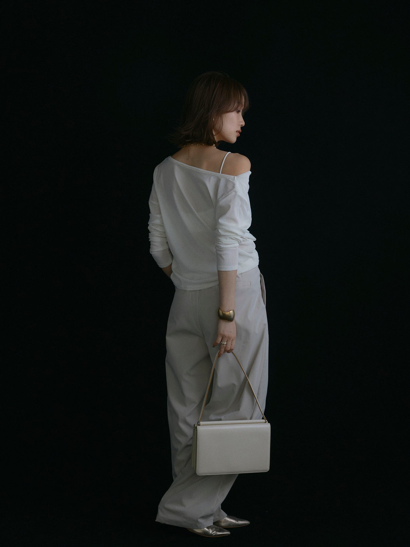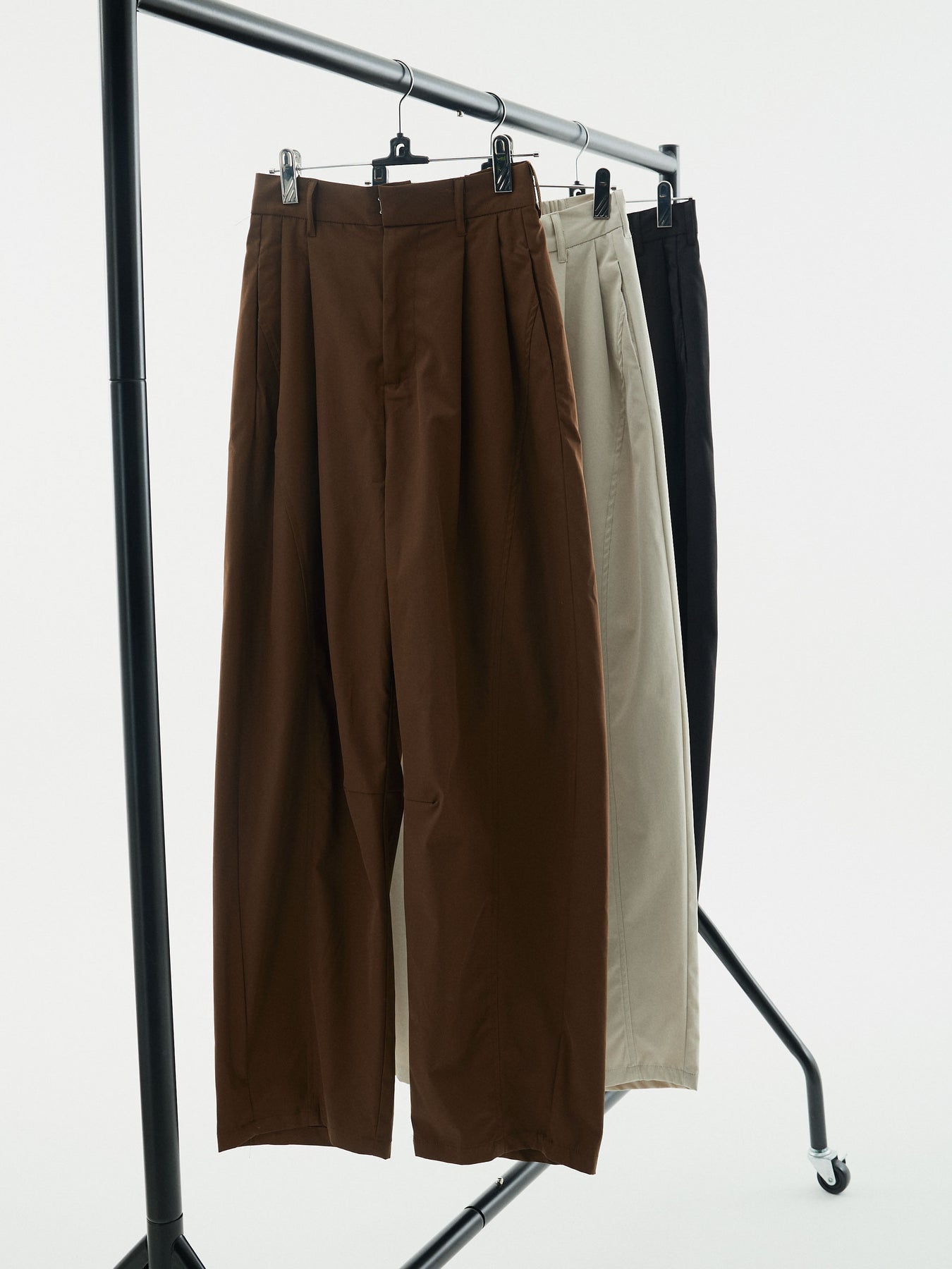 しなやかさと程よいハリ感を併せ持つタフタ素材で仕立てた、ボリューム感たっぷりのカーブワイドパンツ。 フロントに深めのタックを入れることで、立体的で洗練されたシルエットを実現。丸みのあるカーブラインが、動くたびに美しいドレープを生み出し、コーディネートにモードなニュアンスをプラスします。 ウエストはすっきりとしたハイウエスト仕様でスタイルアップ効果も抜群。タフタ特有の軽さと適度な光沢感が、大人のきれいめカジュアルにぴったりです。 シンプルなトップスを合わせるだけで、コーディネートが一気に映える主役級アイテム。