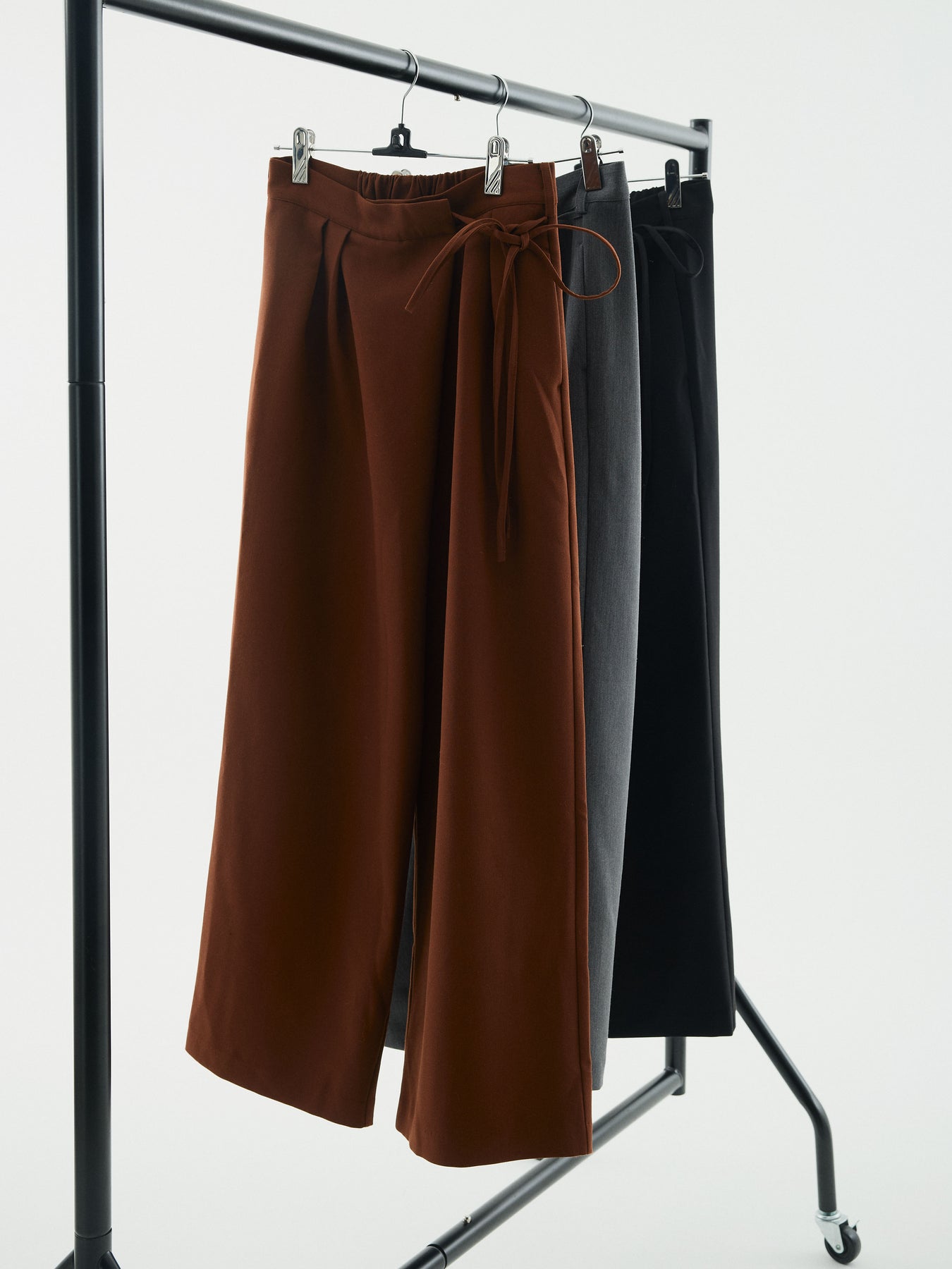 フロントにラップ風ディテールを効かせた、モード感漂うタックワイドパンツ。 ウエスト部分にあしらわれたラップデザインが、奥行きと立体感を生み出し、着こなしにさりげないアクセントをプラス。タック入りのワイドシルエットは体のラインを拾わず、スタイルアップ効果も抜群です。 さらりとした落ち感のある素材で、カジュアルからキレイめまで幅広く対応。トップスをインすることで、ウエストデザインが際立ち、コーディネートにメリハリが生まれます。 オンオフ問わず活躍する、頼れる1本です。