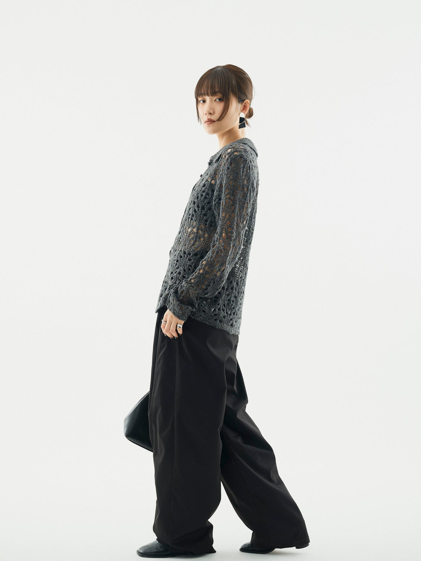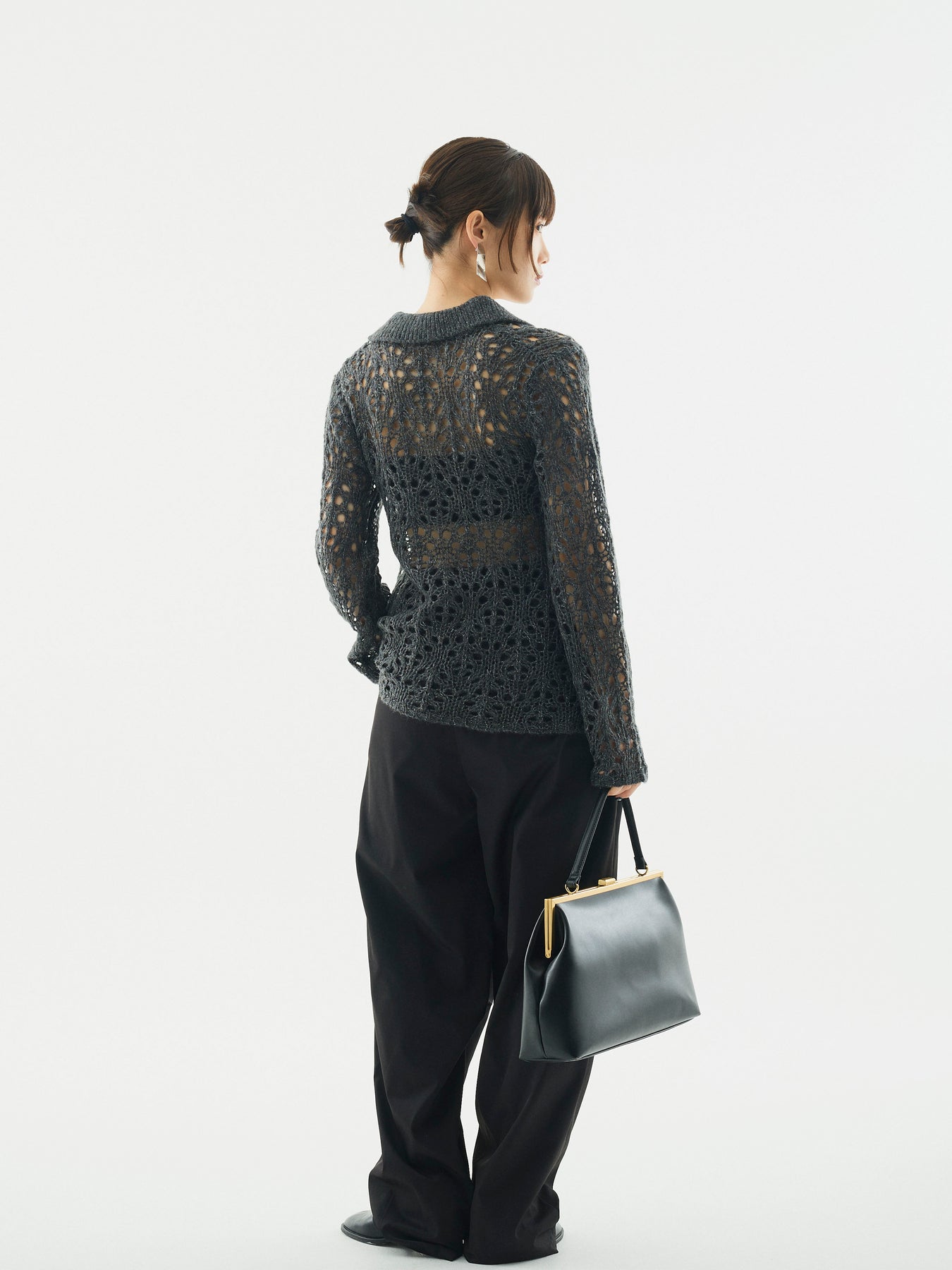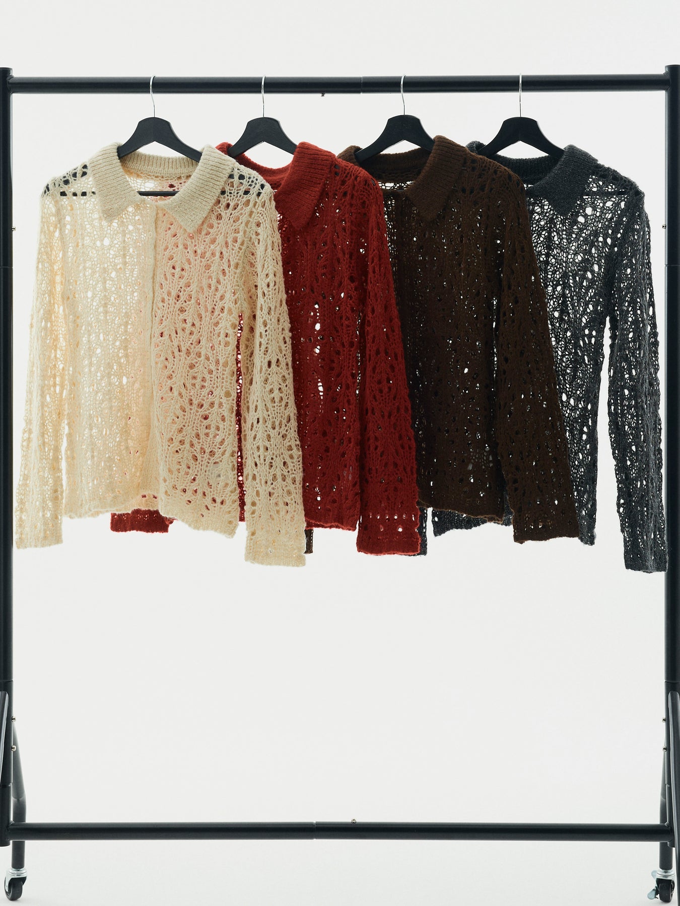 ざっくりとしたローゲージの透かし編みで抜け感を演出するニットポロ。ゆったりとしたサイズ感と柔らかな風合いで軽やかに羽織れ、ボタンを閉めれば一枚着としても活躍。ニットの表情が主役になる、存在感のある一枚です。