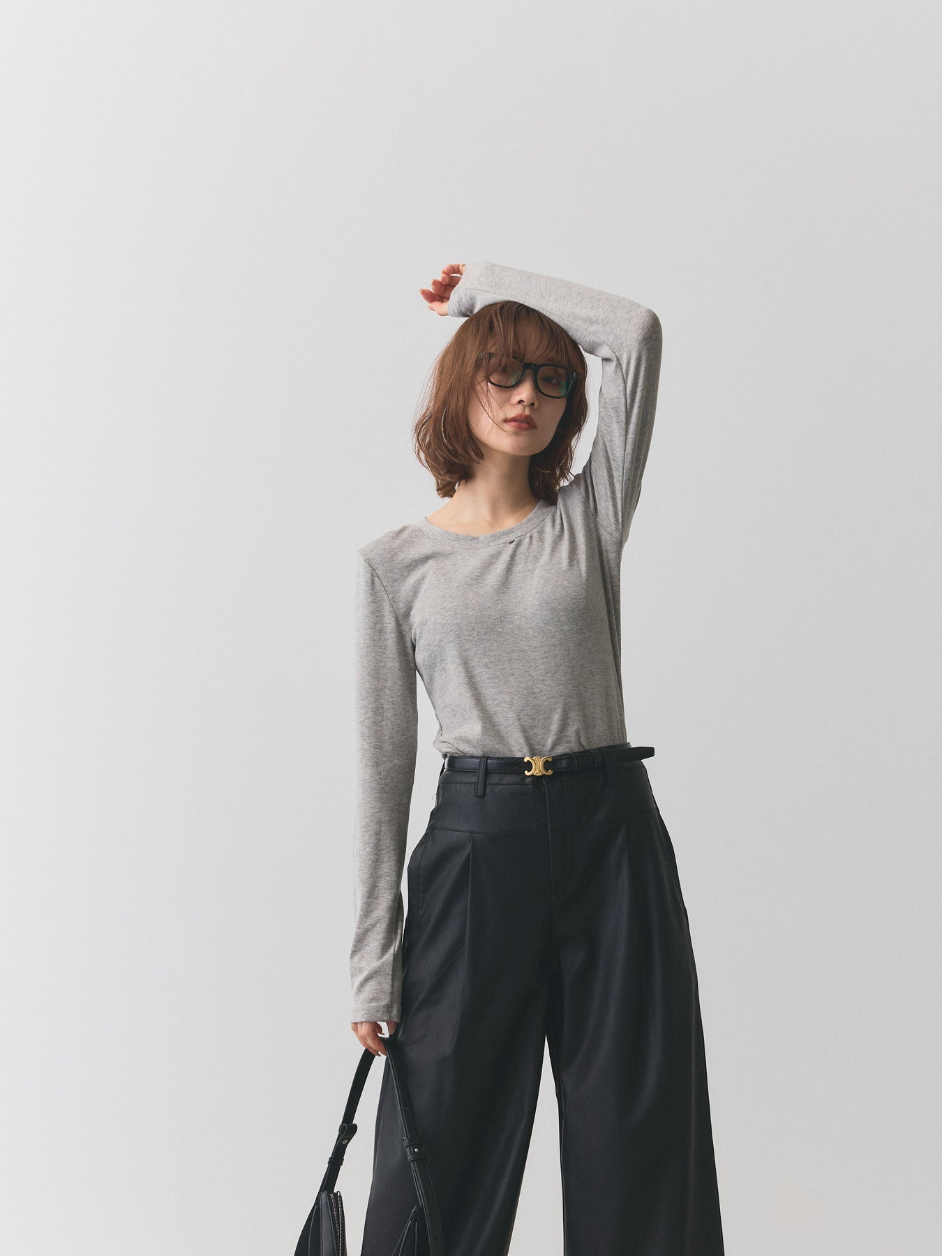 レザー調素材で仕立てたセミワイドパンツ。フロントに入ったタックが立体感を生み出し、すっきりとしたシルエットを演出します。程よいワイド感で脚のラインを拾わず、スタイルアップ効果も期待できる一本。レザー特有の艶感がコーディネートにモードな雰囲気をプラスし、シンプルなトップスと合わせるだけで洗練されたスタイリングに仕上がります。デイリーから特別なシーンまで幅広く活躍するアイテムです。