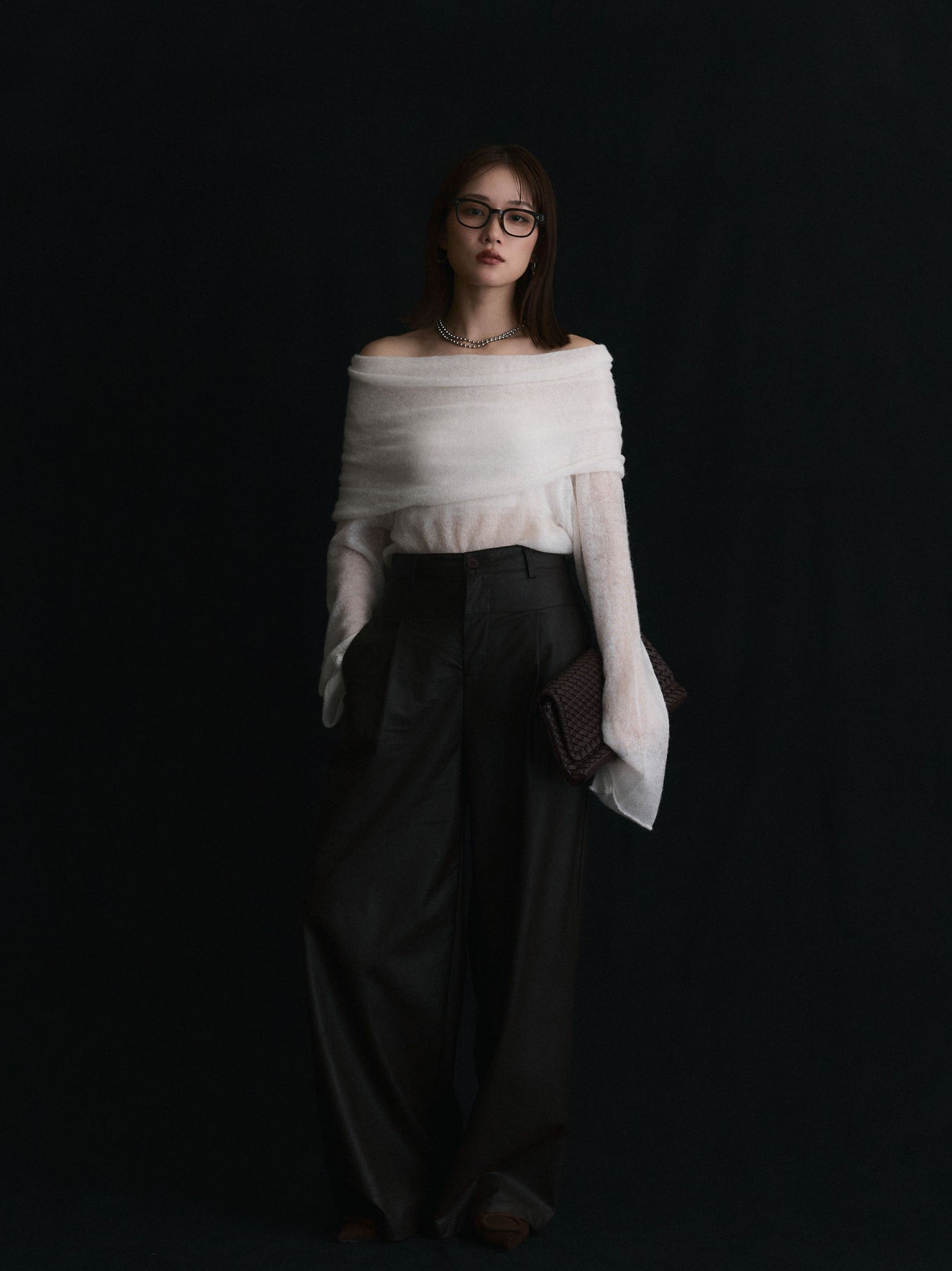 【Allure】[SET]オフショルシアーニットプルオーバー+レザータックセミワイドパンツ(2set)