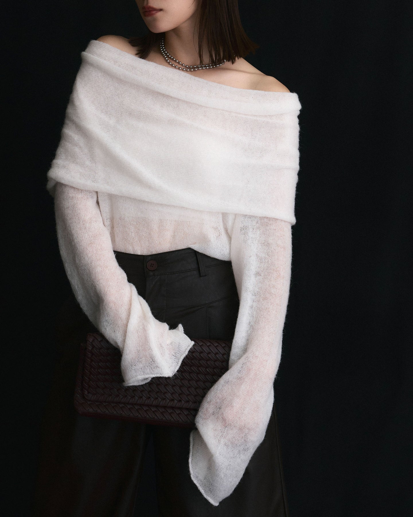 透け感のある軽やかな素材で仕立てたオフショルダーデザインのニットプルオーバー。肩のラインを美しく見せる抜け感のあるシルエットで、女性らしさを引き立てます。柔らかなニット素材は肌当たりも良く、インナーとのレイヤードで表情を変えながら着こなしを楽しめる一枚。デイリーにはもちろん、特別なお出かけにも映えるアイテムです。 ※ボトムス、キャミソール(インナー)以外の商品は一律でインナーは付属していません。