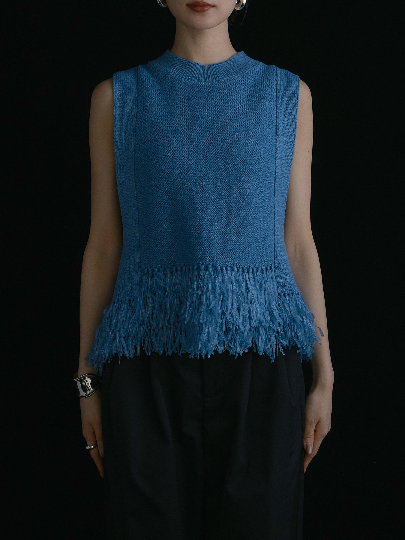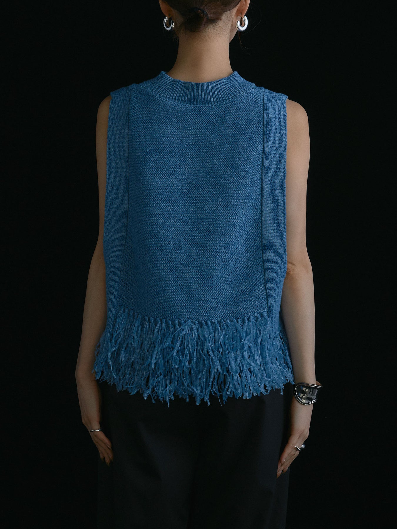 柔らかな毛足のフェザーヤーンを裾にあしらったニットベスト。表情豊かな編地と立体感のあるシルエットがスタイリングに奥行きを与え、シンプルながらも主役になる1着。Tシャツやシアートップスに重ねるだけで感度の高い着こなしに仕上がります。