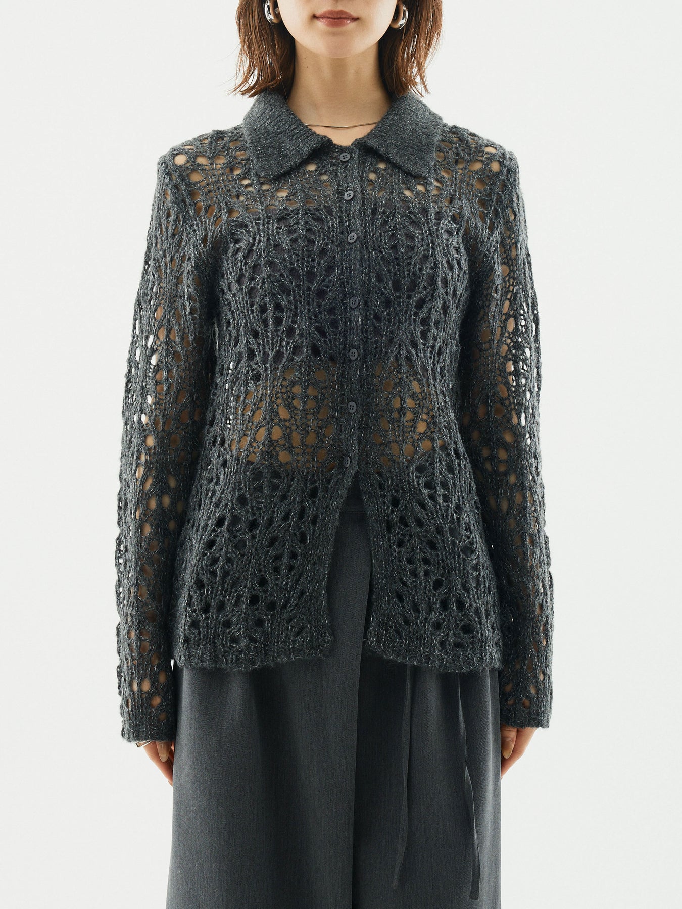 [予約]ローゲージ透かし編みポロニッカーディガン/チャコール