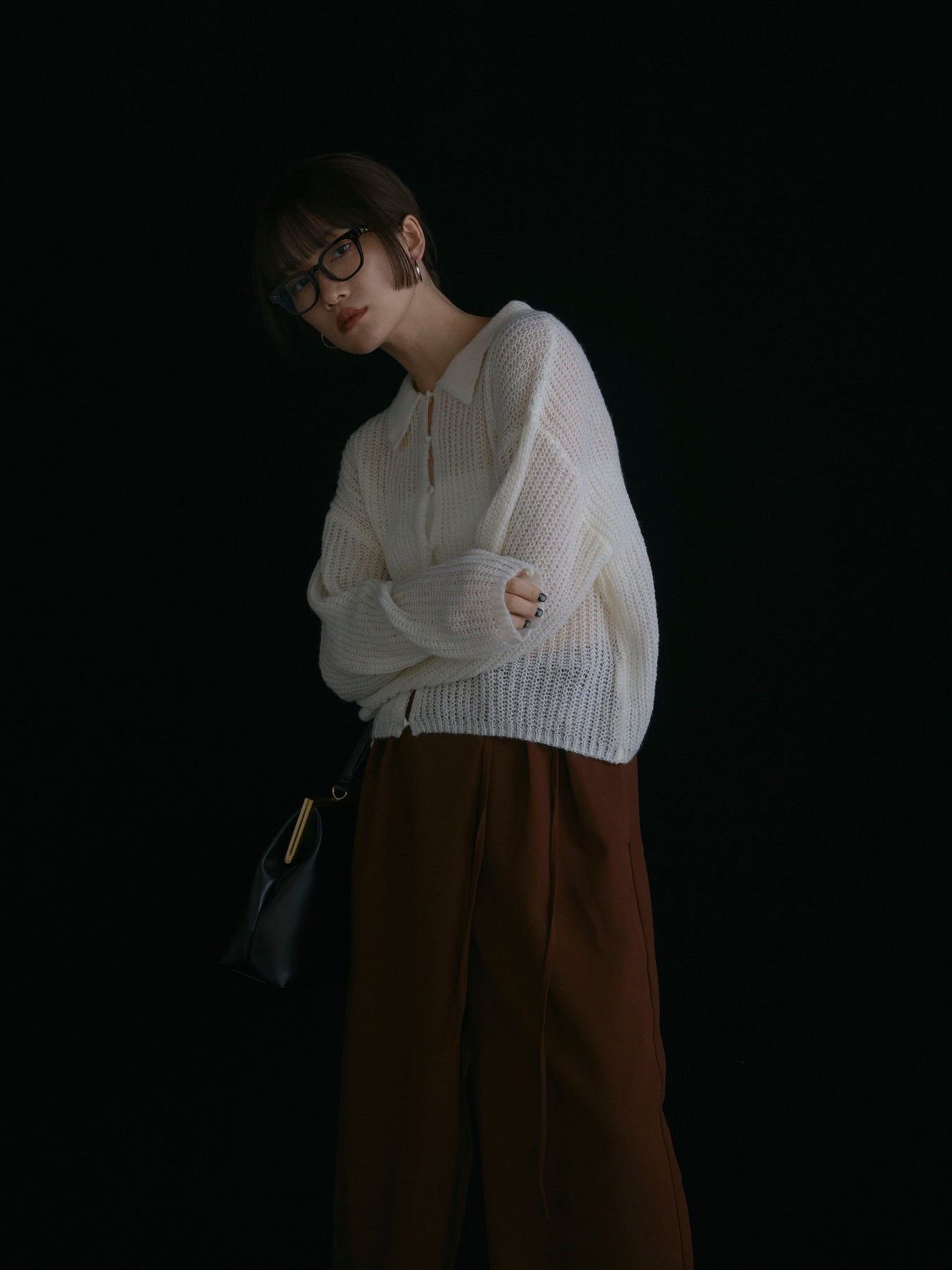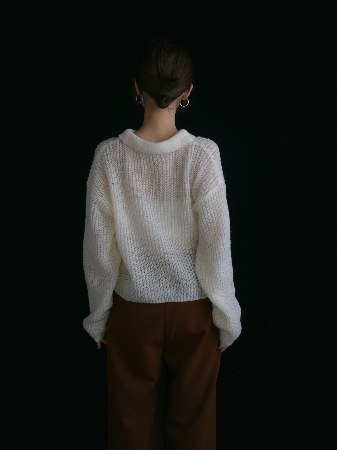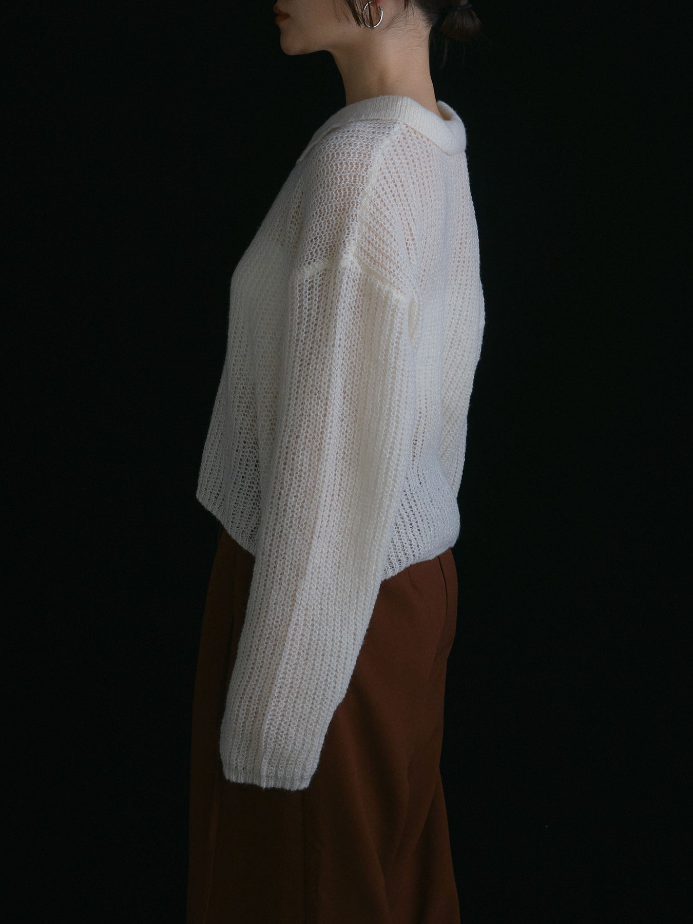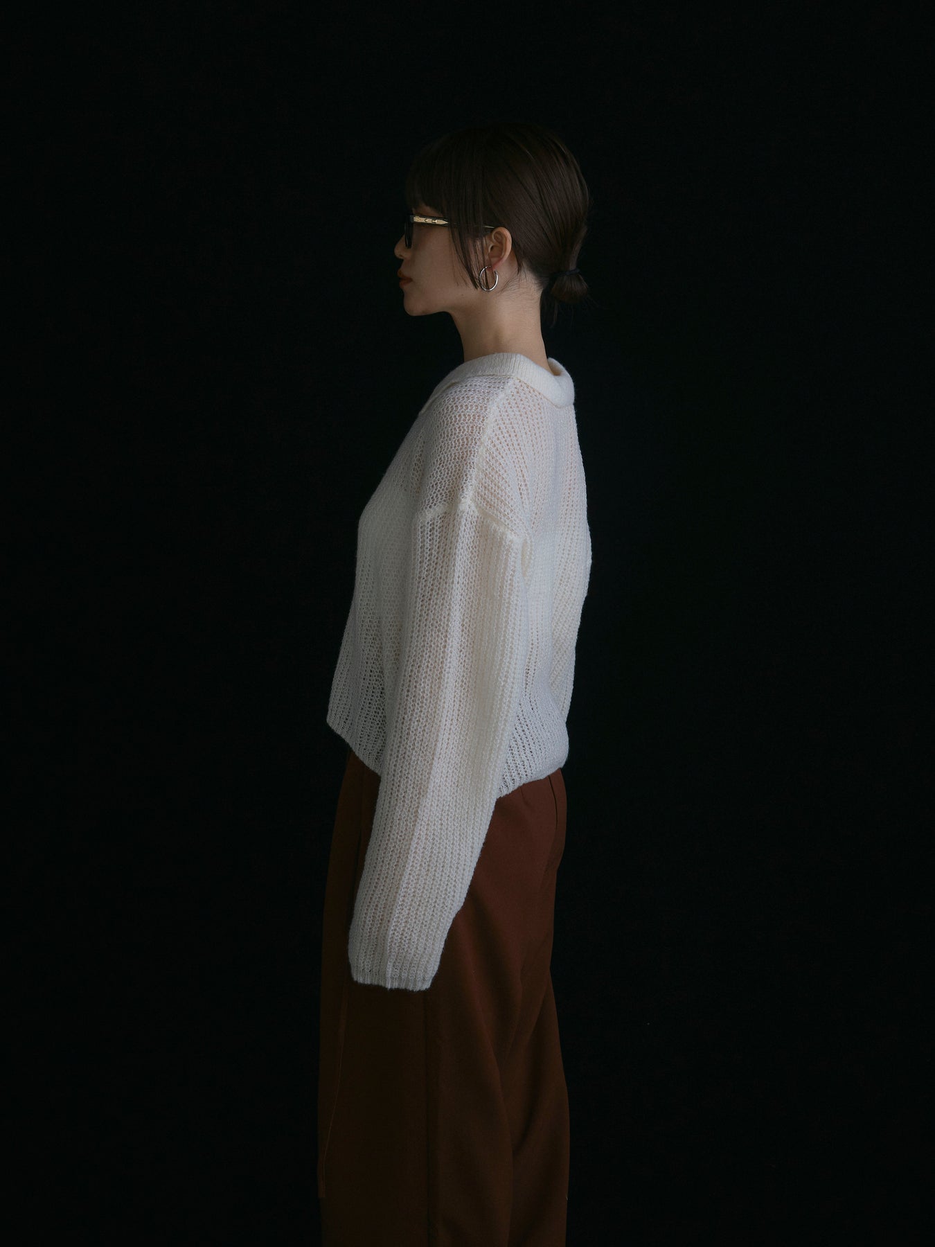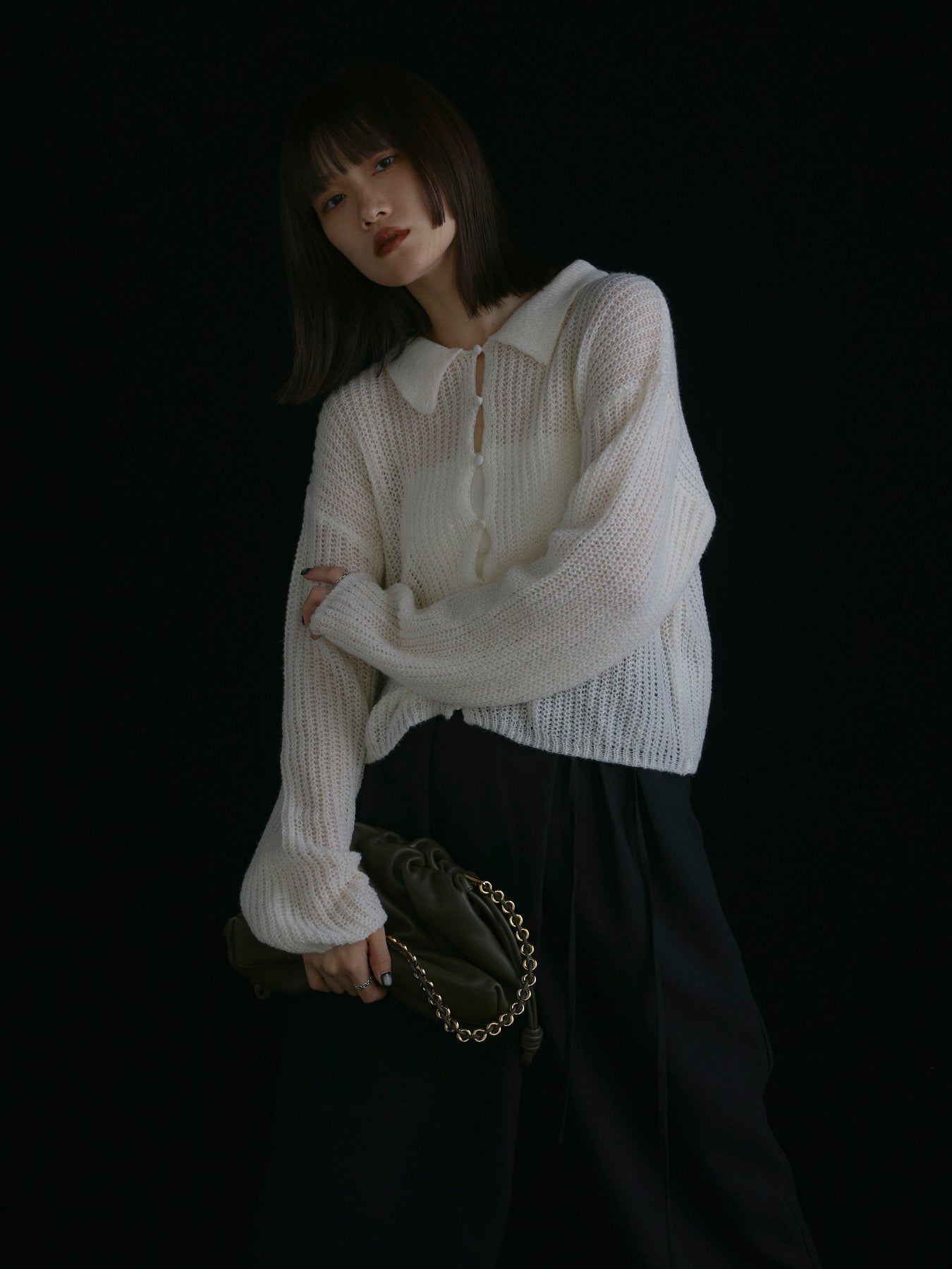 ふんわりとした起毛感と、透け感のある片畦編みが絶妙にマッチした、抜け感たっぷりのポロニット。 軽やかな編地と柔らかな素材感が、季節の変わり目にぴったり。クラシカルなポロカラーデザインに、前立てのループボタンがアクセントを添え、さりげなくこなれた印象に仕上げてくれます。 ゆったりとしたシルエットで、ラフに羽織っても、一枚でトップスとして着てもサマになる1着。キャミやタンクとのレイヤードで透け感を楽しむスタイリングがおすすめです。 大人のカジュアルスタイルに、ほどよい甘さとトレンド感をプラスする主役ニット。
