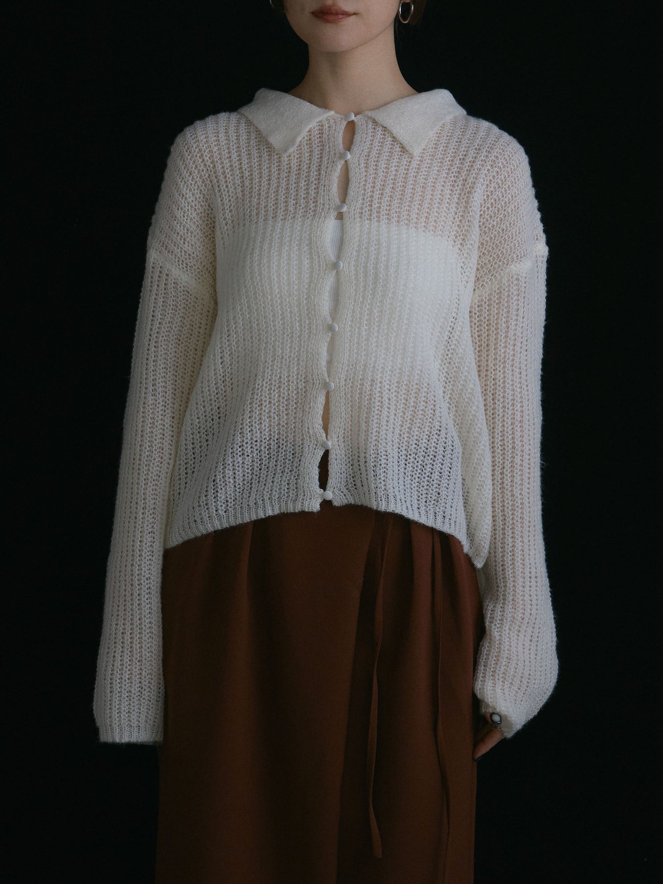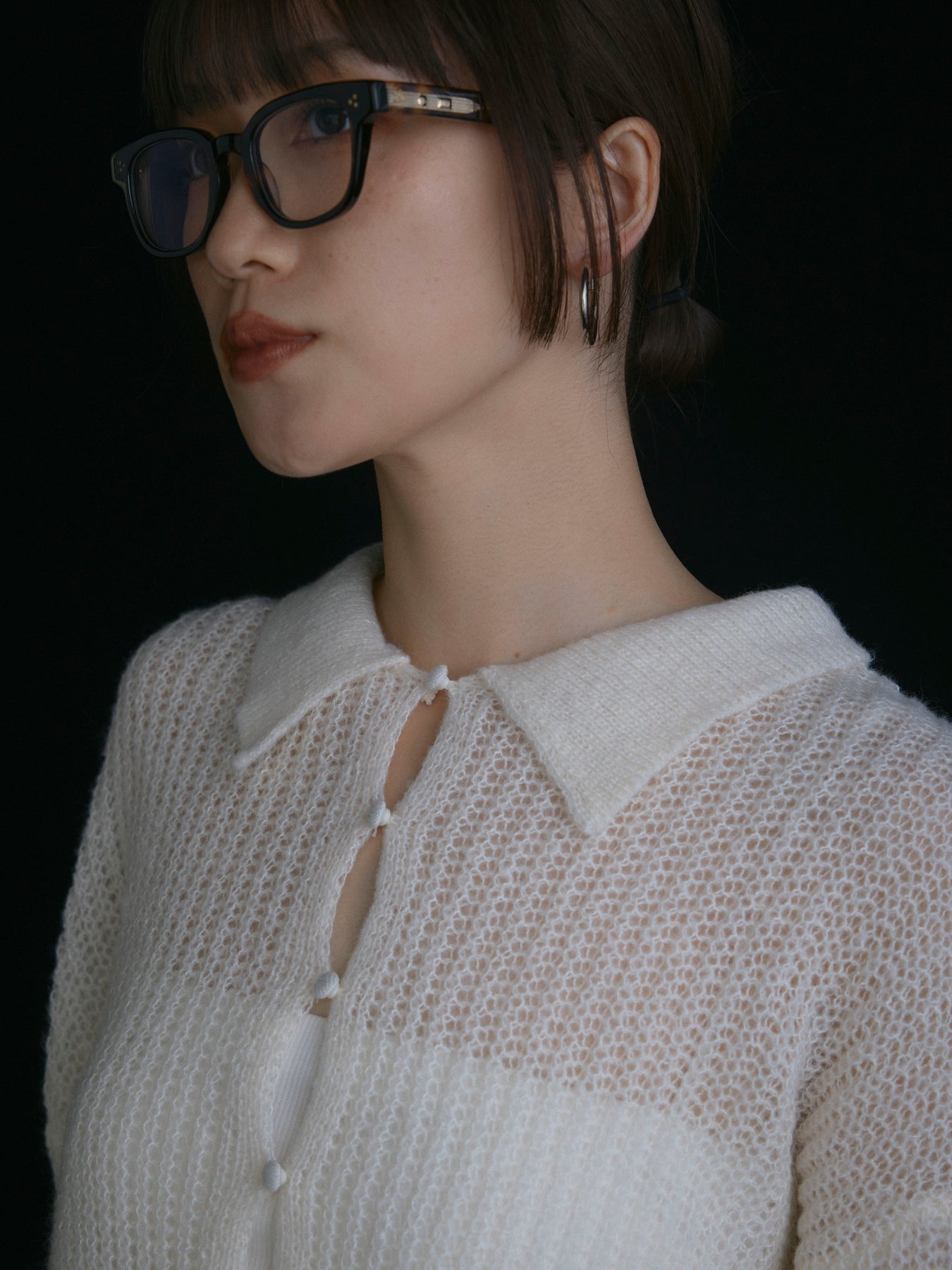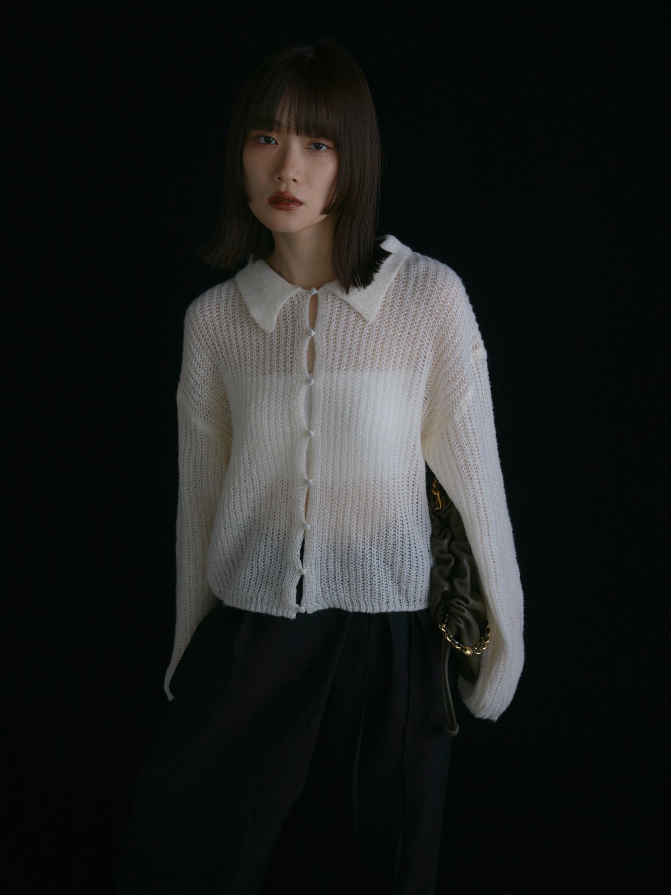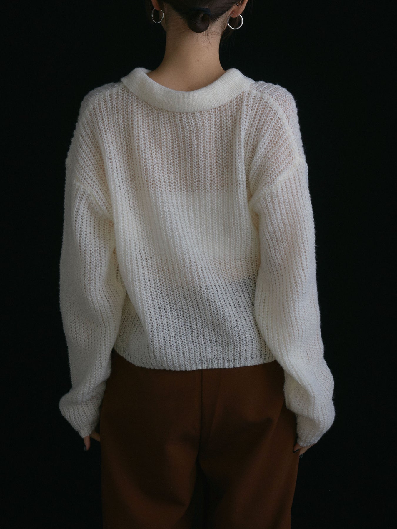ふんわりとした起毛感と、透け感のある片畦編みが絶妙にマッチした、抜け感たっぷりのポロニット。 軽やかな編地と柔らかな素材感が、季節の変わり目にぴったり。クラシカルなポロカラーデザインに、前立てのループボタンがアクセントを添え、さりげなくこなれた印象に仕上げてくれます。 ゆったりとしたシルエットで、ラフに羽織っても、一枚でトップスとして着てもサマになる1着。キャミやタンクとのレイヤードで透け感を楽しむスタイリングがおすすめです。 大人のカジュアルスタイルに、ほどよい甘さとトレンド感をプラスする主役ニット。