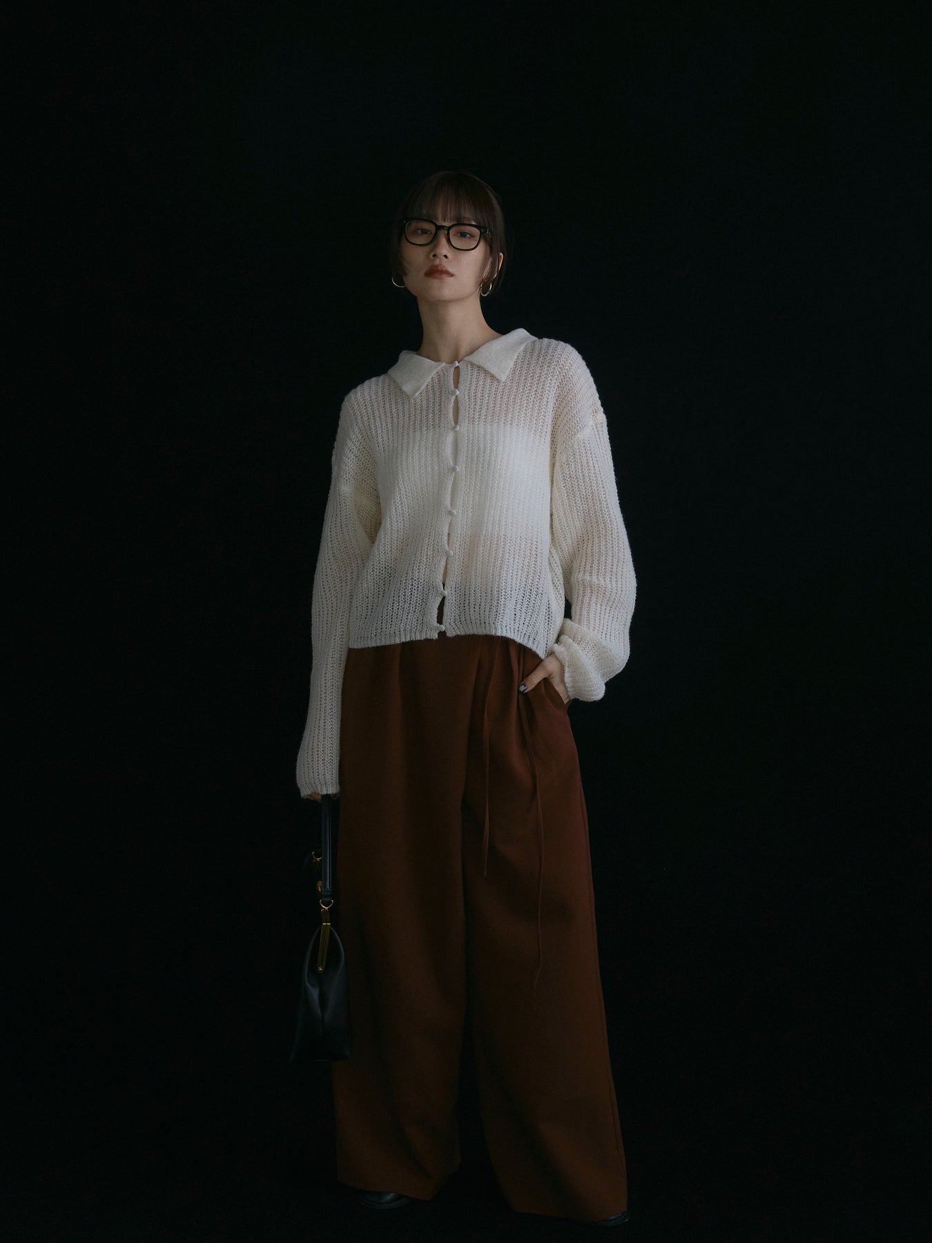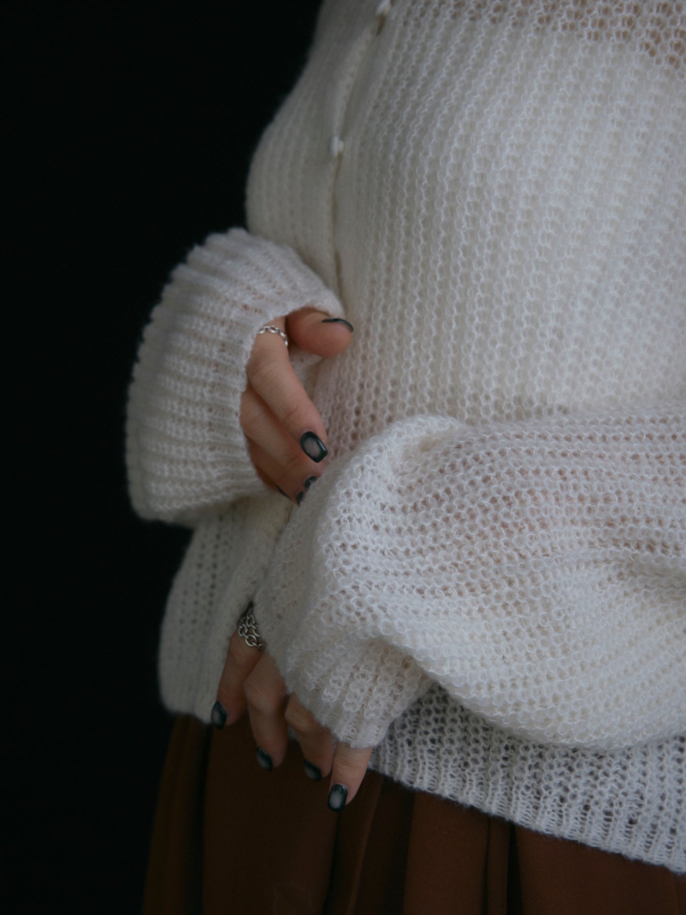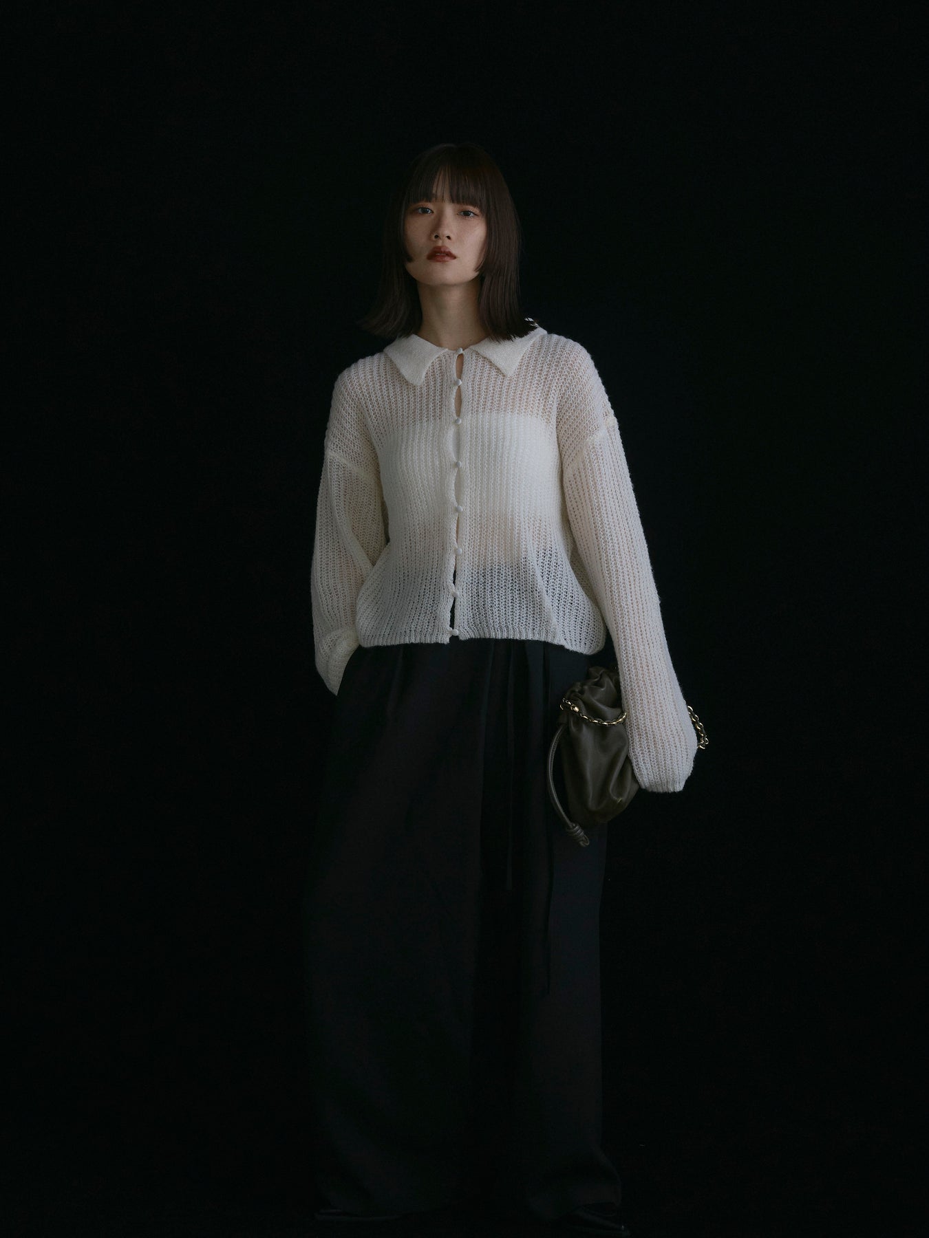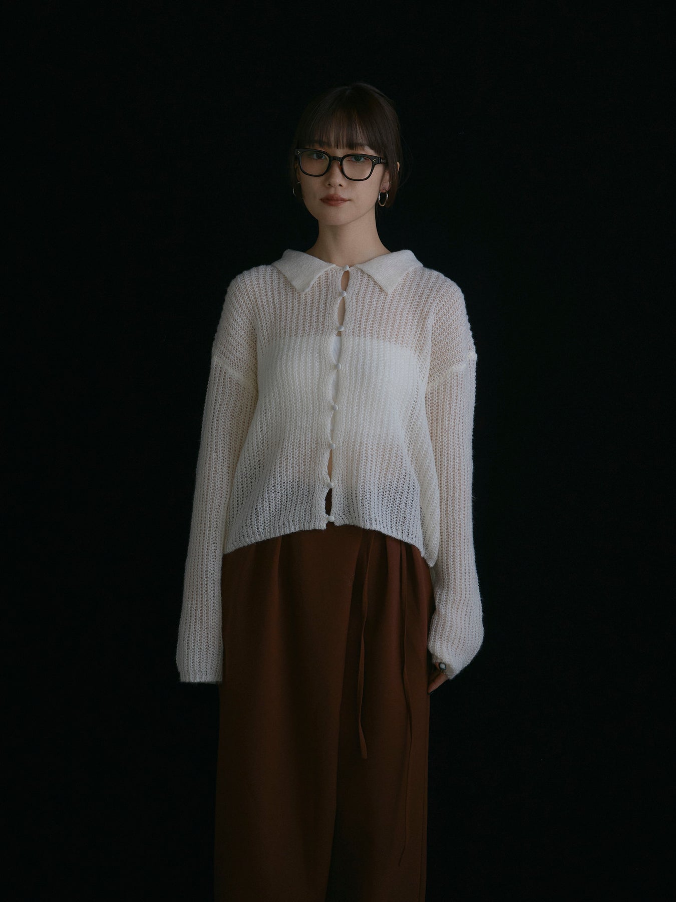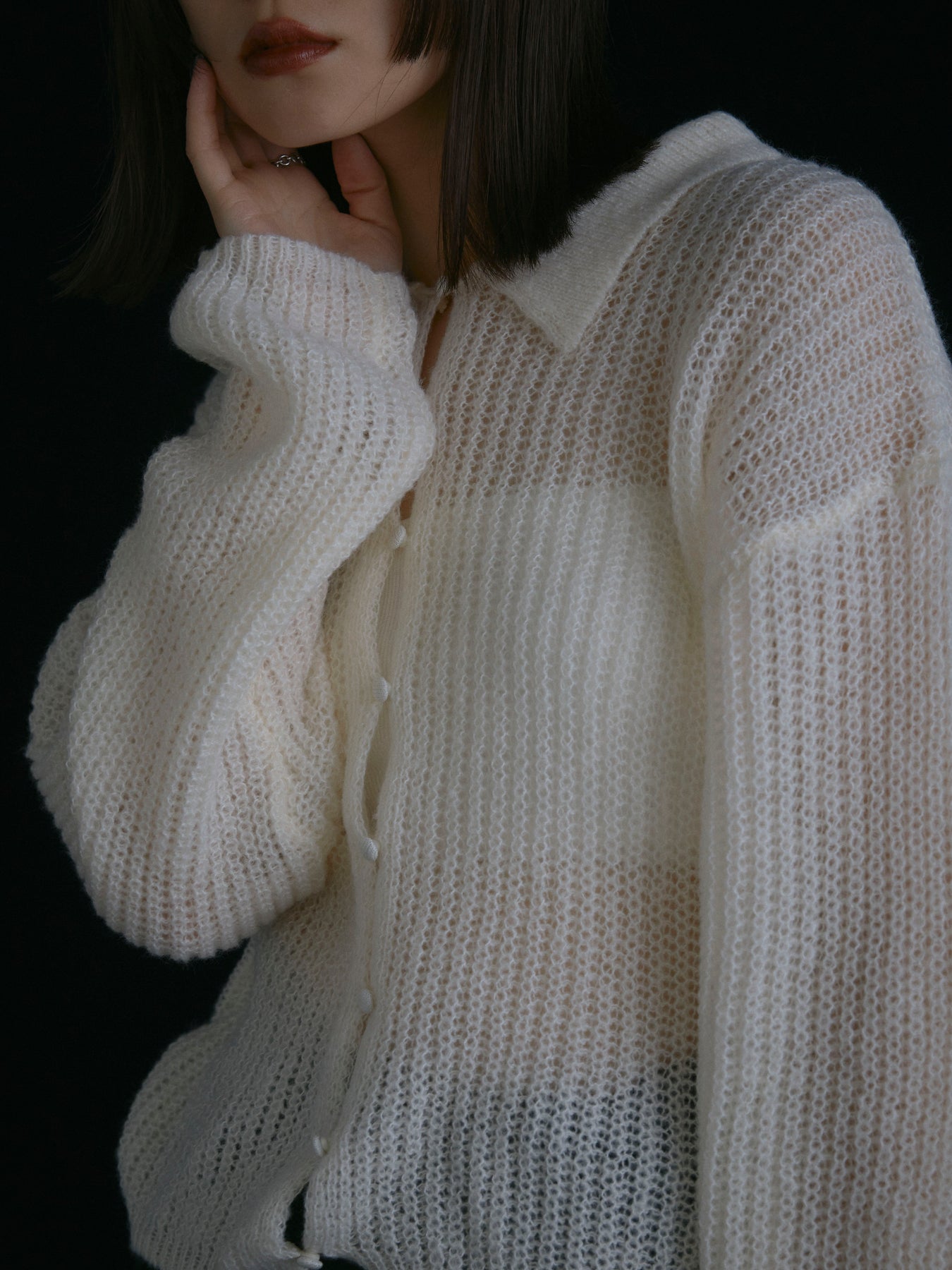 ふんわりとした起毛感と、透け感のある片畦編みが絶妙にマッチした、抜け感たっぷりのポロニット。 軽やかな編地と柔らかな素材感が、季節の変わり目にぴったり。クラシカルなポロカラーデザインに、前立てのループボタンがアクセントを添え、さりげなくこなれた印象に仕上げてくれます。 ゆったりとしたシルエットで、ラフに羽織っても、一枚でトップスとして着てもサマになる1着。キャミやタンクとのレイヤードで透け感を楽しむスタイリングがおすすめです。 大人のカジュアルスタイルに、ほどよい甘さとトレンド感をプラスする主役ニット。