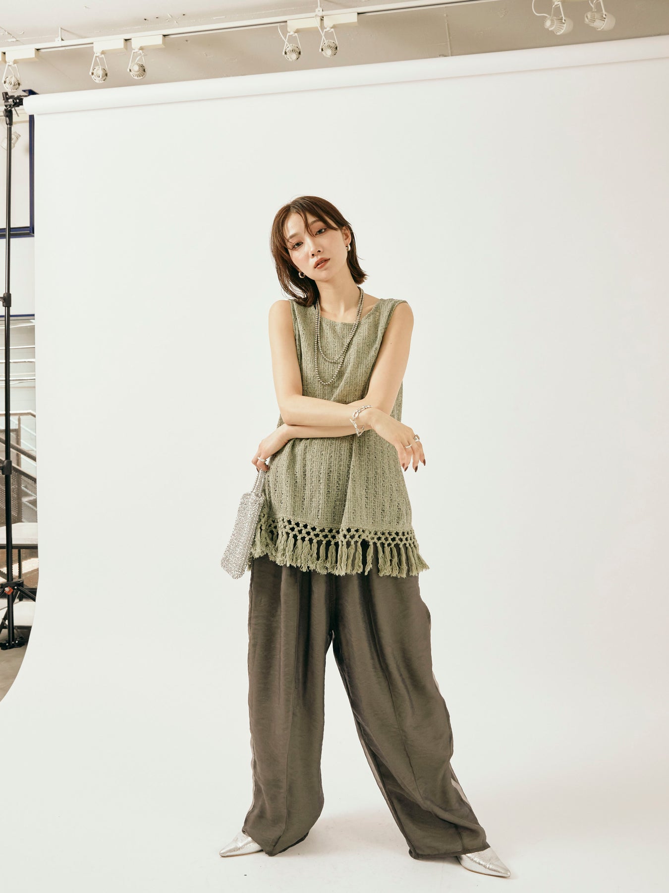 軽やかなオーガンジー素材をレイヤードした、モード感あふれるサイドラインパンツ。 動くたびに揺れるシアーな質感が、抜け感と華やかさをプラス。 ウエストはゴム仕様で、ストレスフリーな穿き心地。 存在感のあるデザインながらも、同色系でまとめることでコーデに取り入れやすく、 トップス次第でカジュアルにもエレガントにも着回せる万能アイテムです。