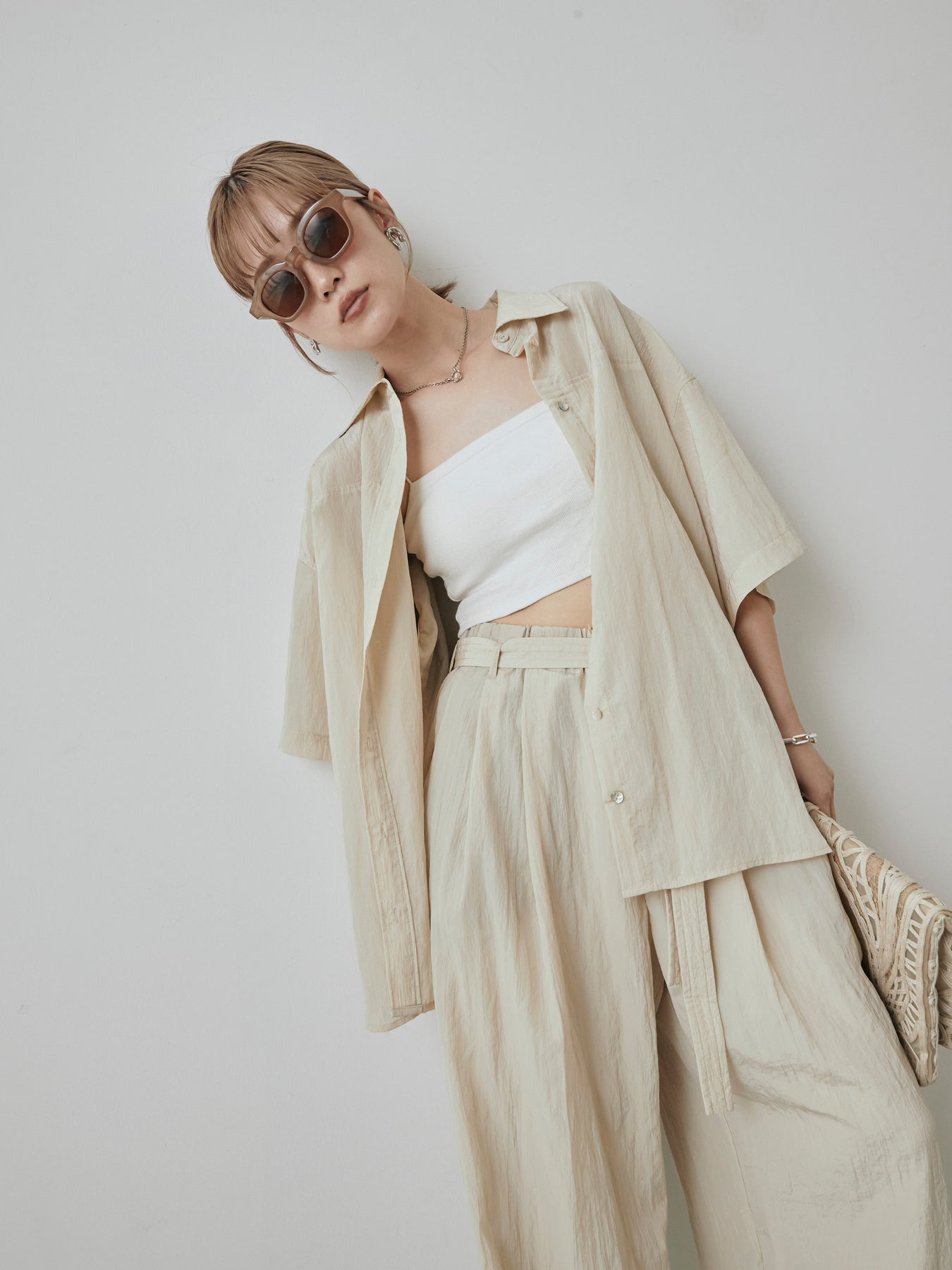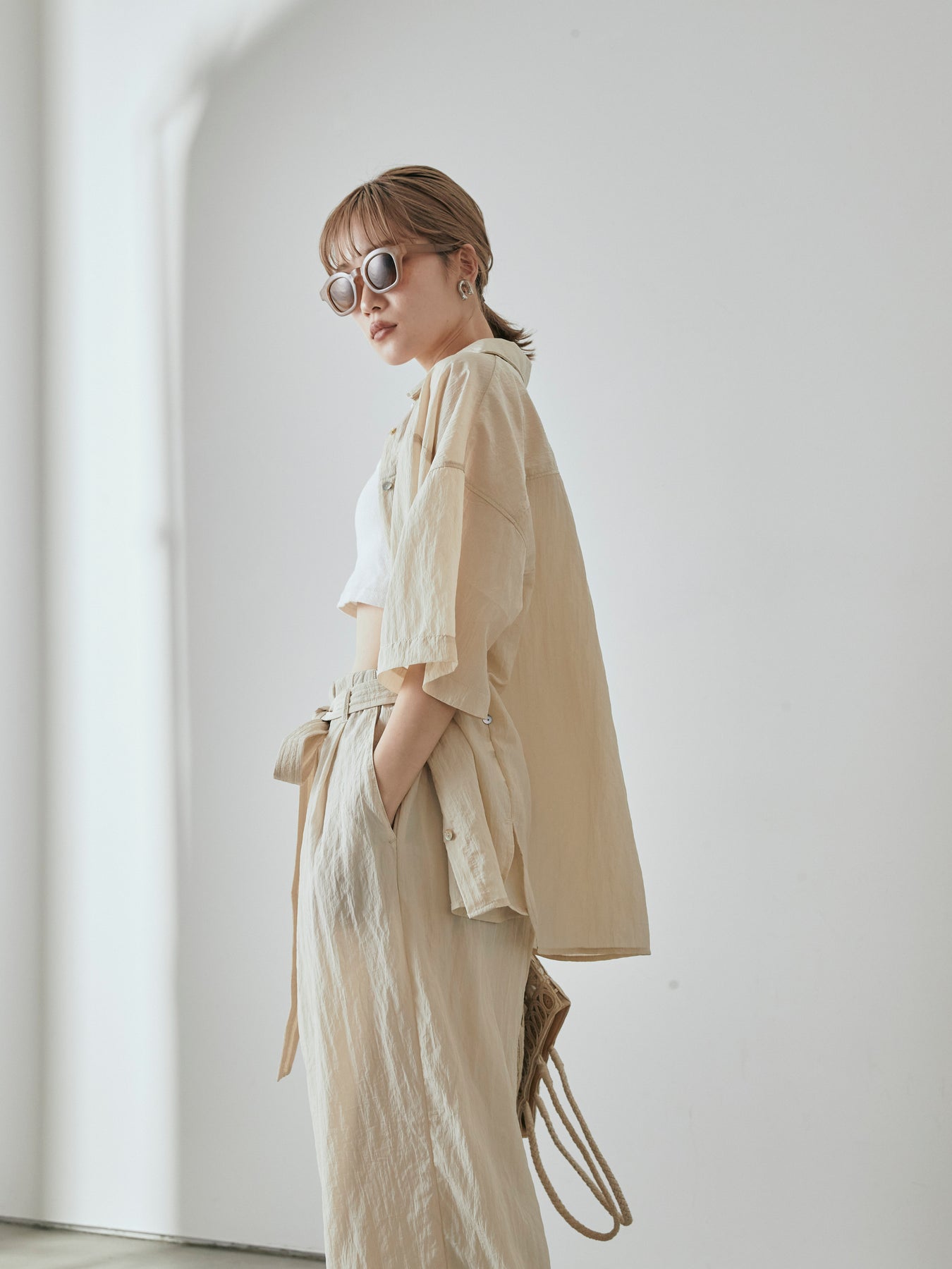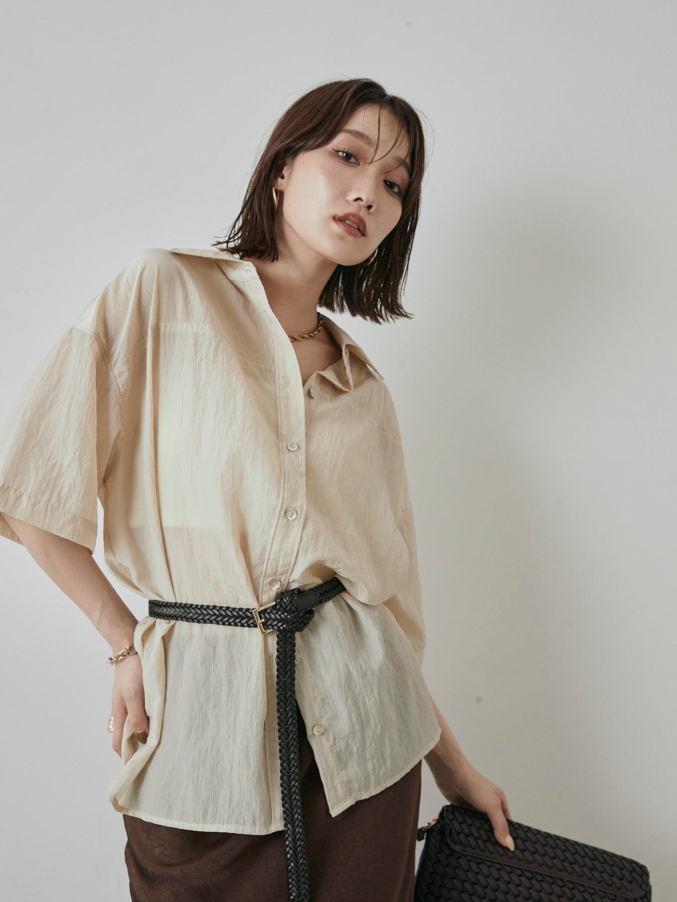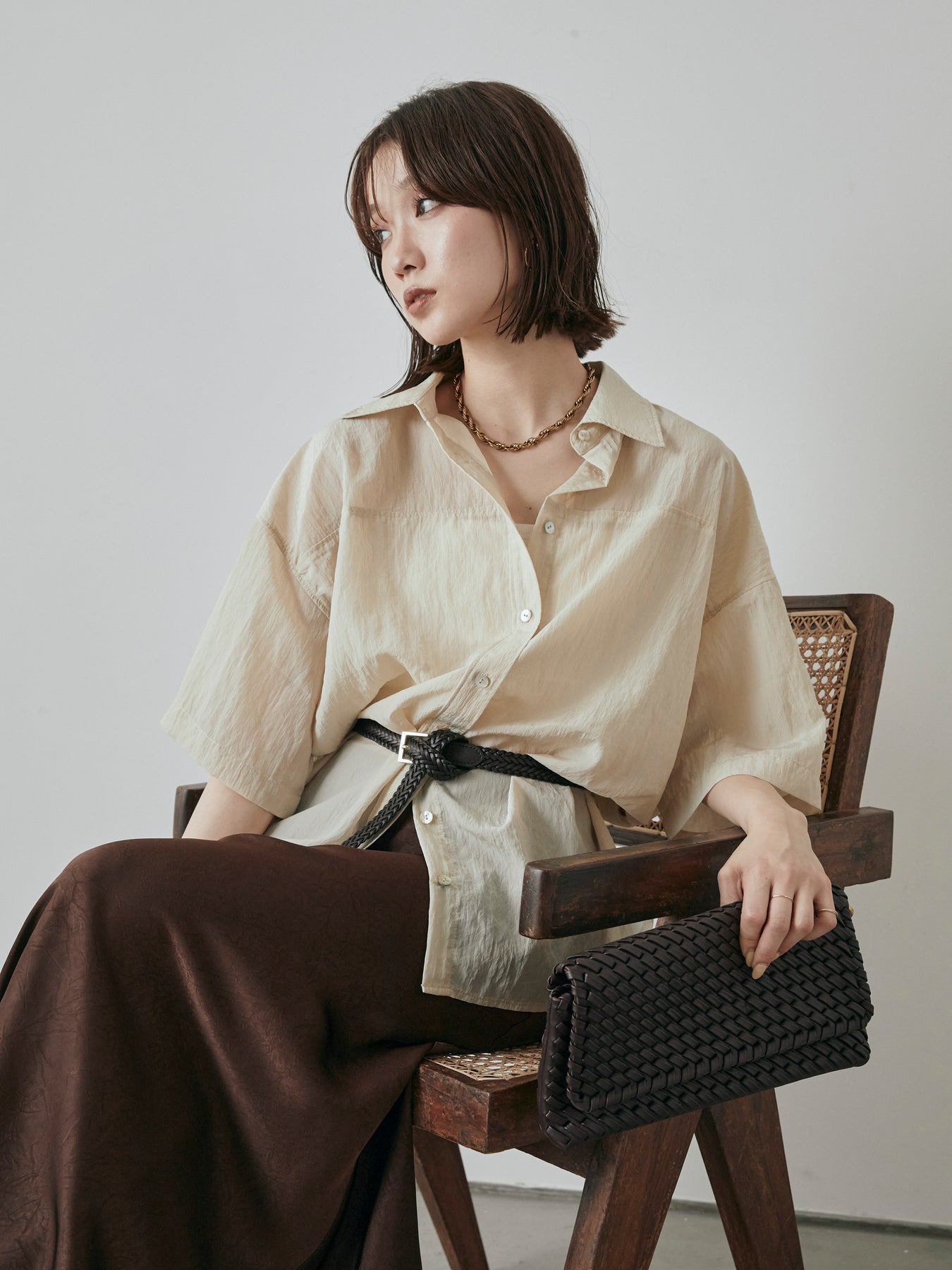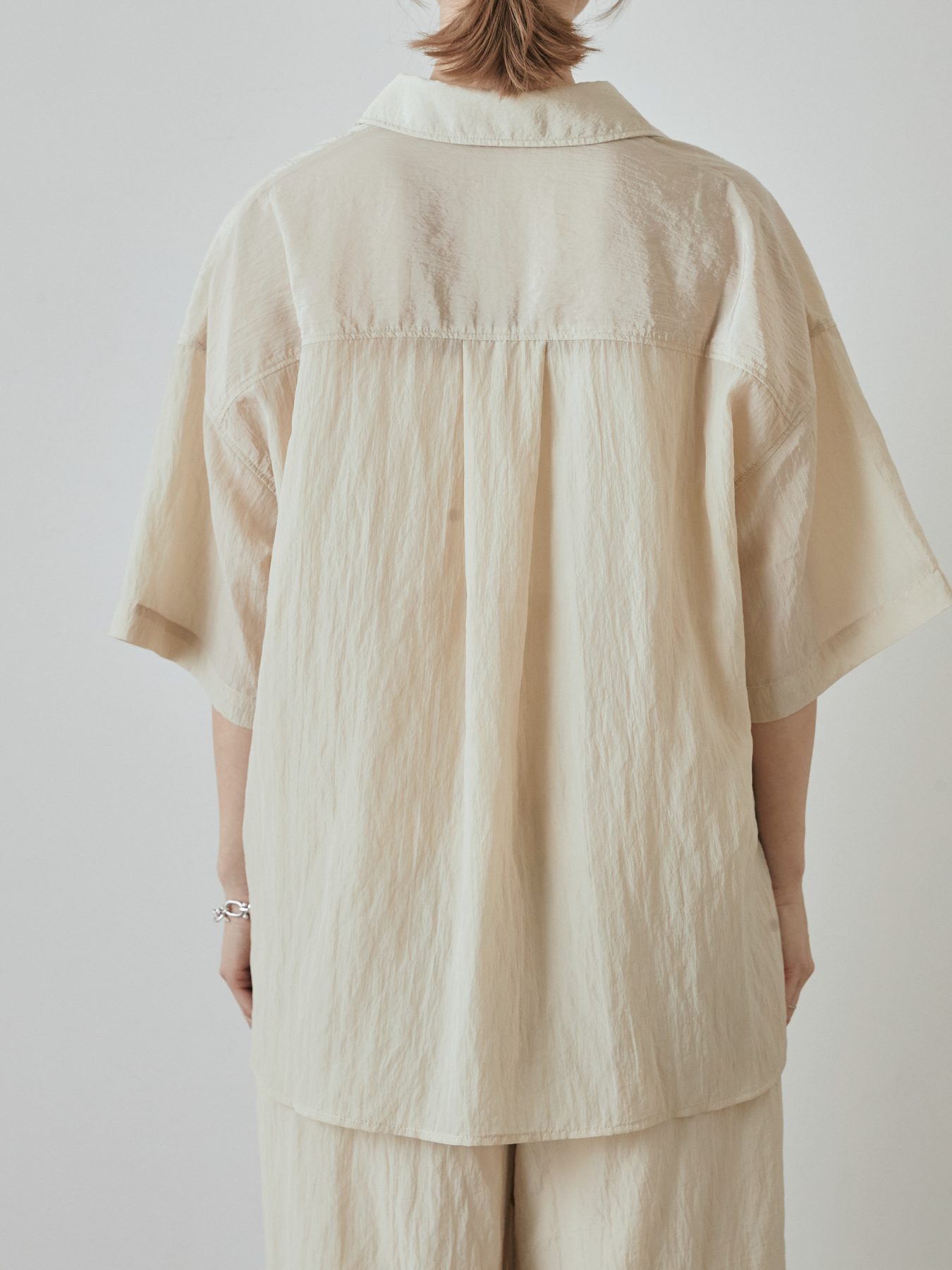這款半袖襯衫採用輕盈尼龍材質製成,並經過水洗處理,外觀精緻。 這是一種用途極為廣泛的物品,既可以隨意穿著,也可以單件穿著。 褶皺的材質營造出休閒的感覺,光滑的質地即使在夏天也感覺很舒適。 適度寬鬆的輪廓營造出休閒與成熟的精緻平衡。 搭配相同材質的褲子穿著,時尚休閒。 將它穿在背心或吊帶背心外面,形成一種層次感,增強季節氣氛。