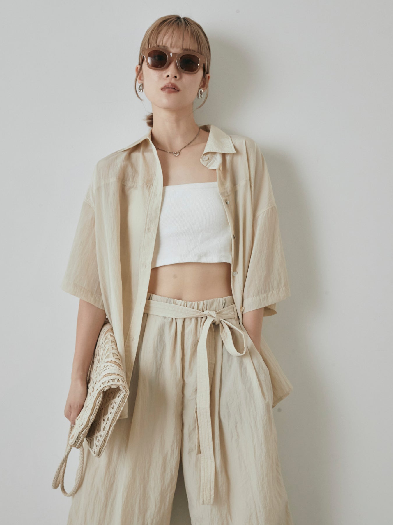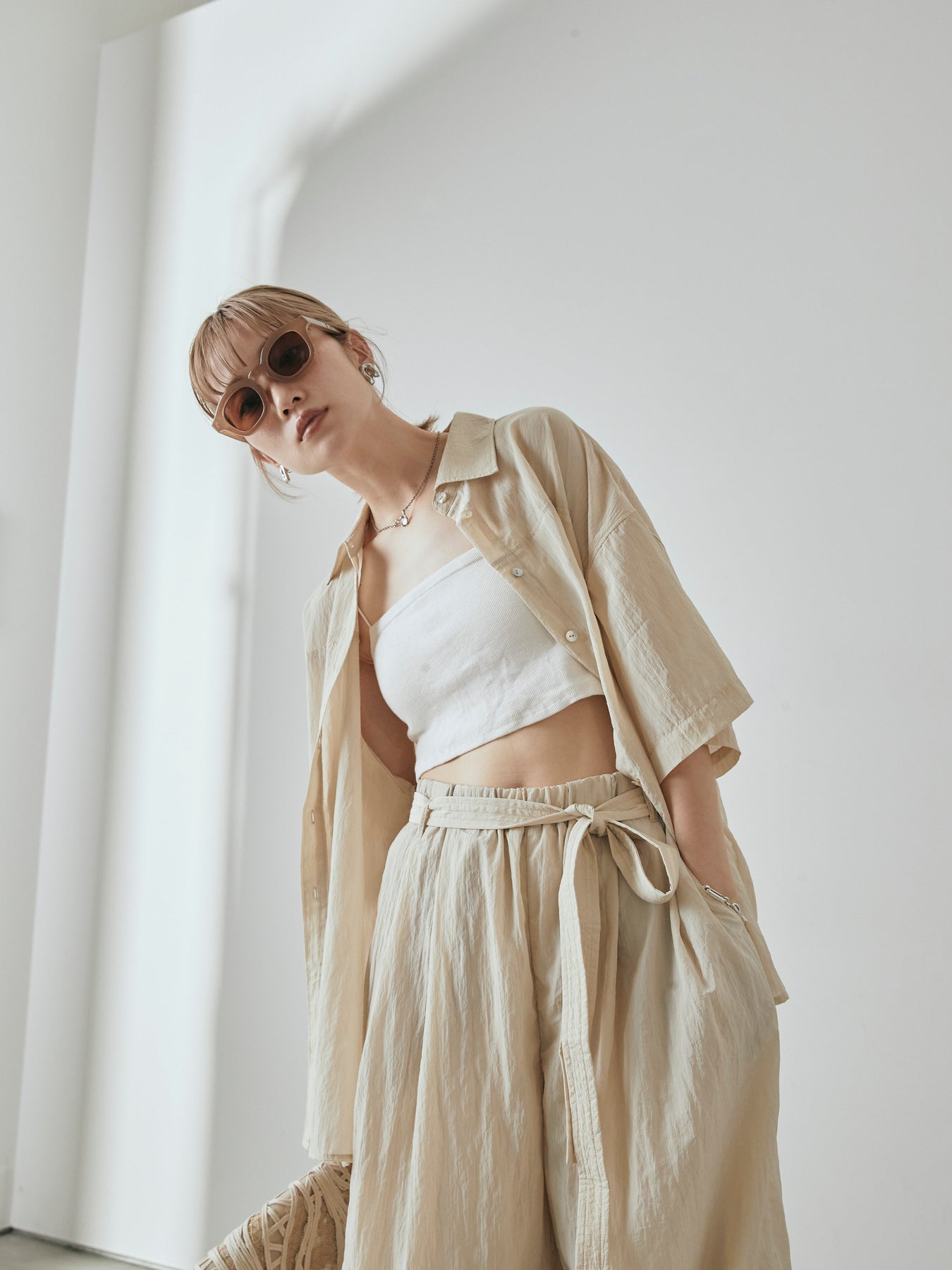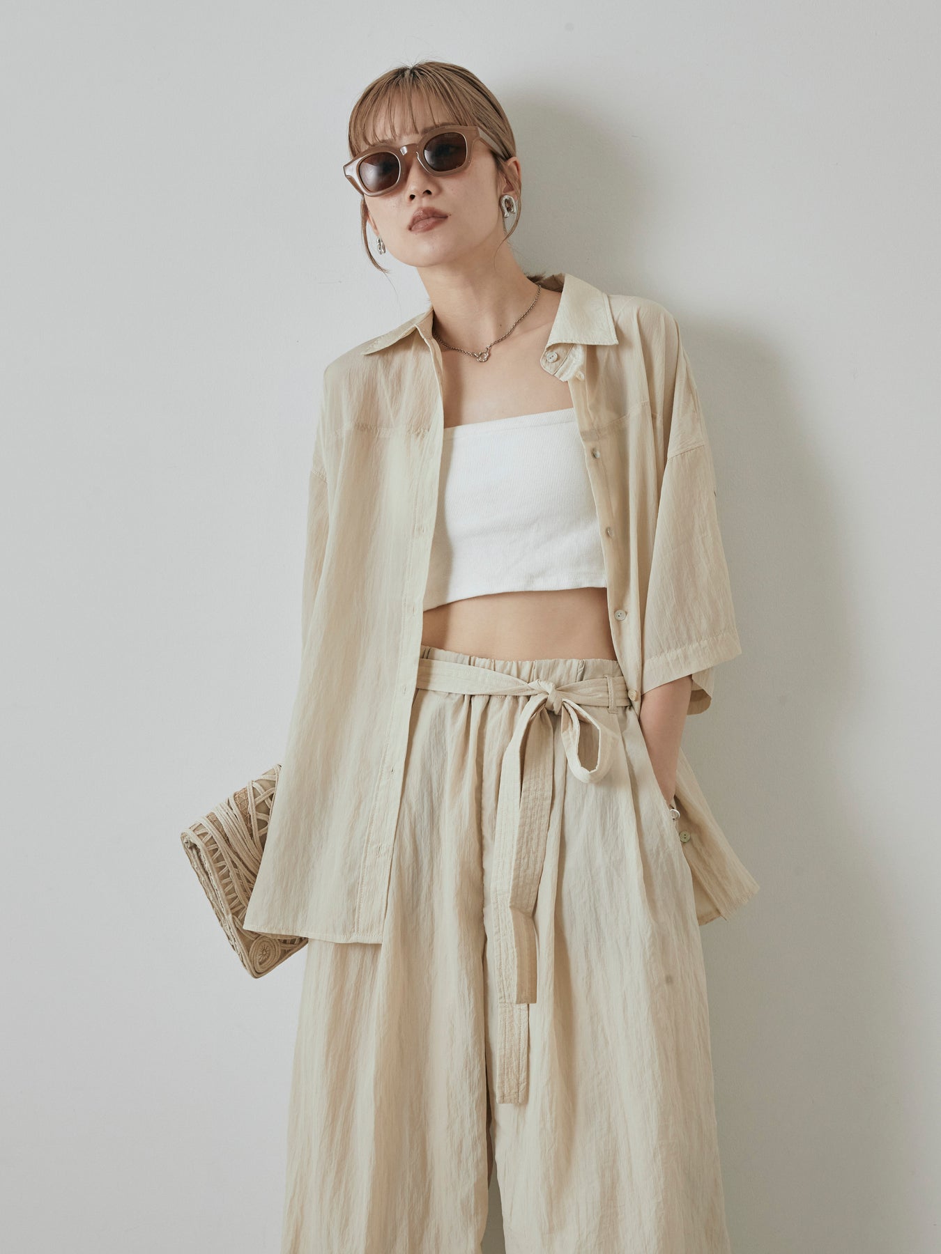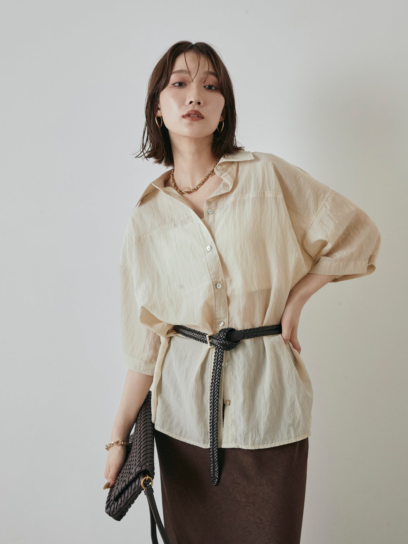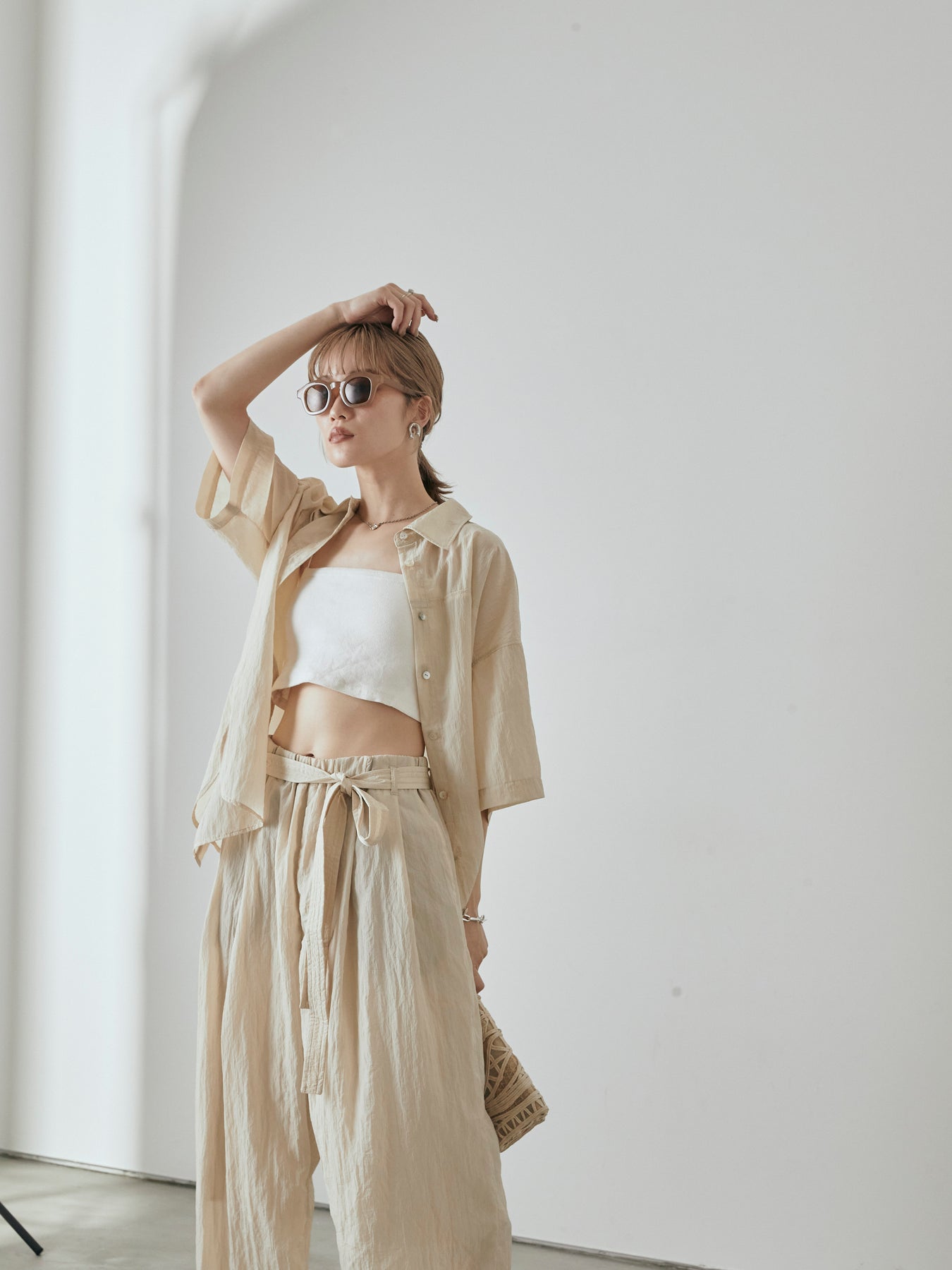這款半袖襯衫採用輕盈尼龍材質製成,並經過水洗處理,外觀精緻。 這是一種用途極為廣泛的物品,既可以隨意穿著,也可以單件穿著。 褶皺的材質營造出休閒的感覺,光滑的質地即使在夏天也感覺很舒適。 適度寬鬆的輪廓營造出休閒與成熟的精緻平衡。 搭配相同材質的褲子穿著,時尚休閒。 將它穿在背心或吊帶背心外面,形成一種層次感,增強季節氣氛。