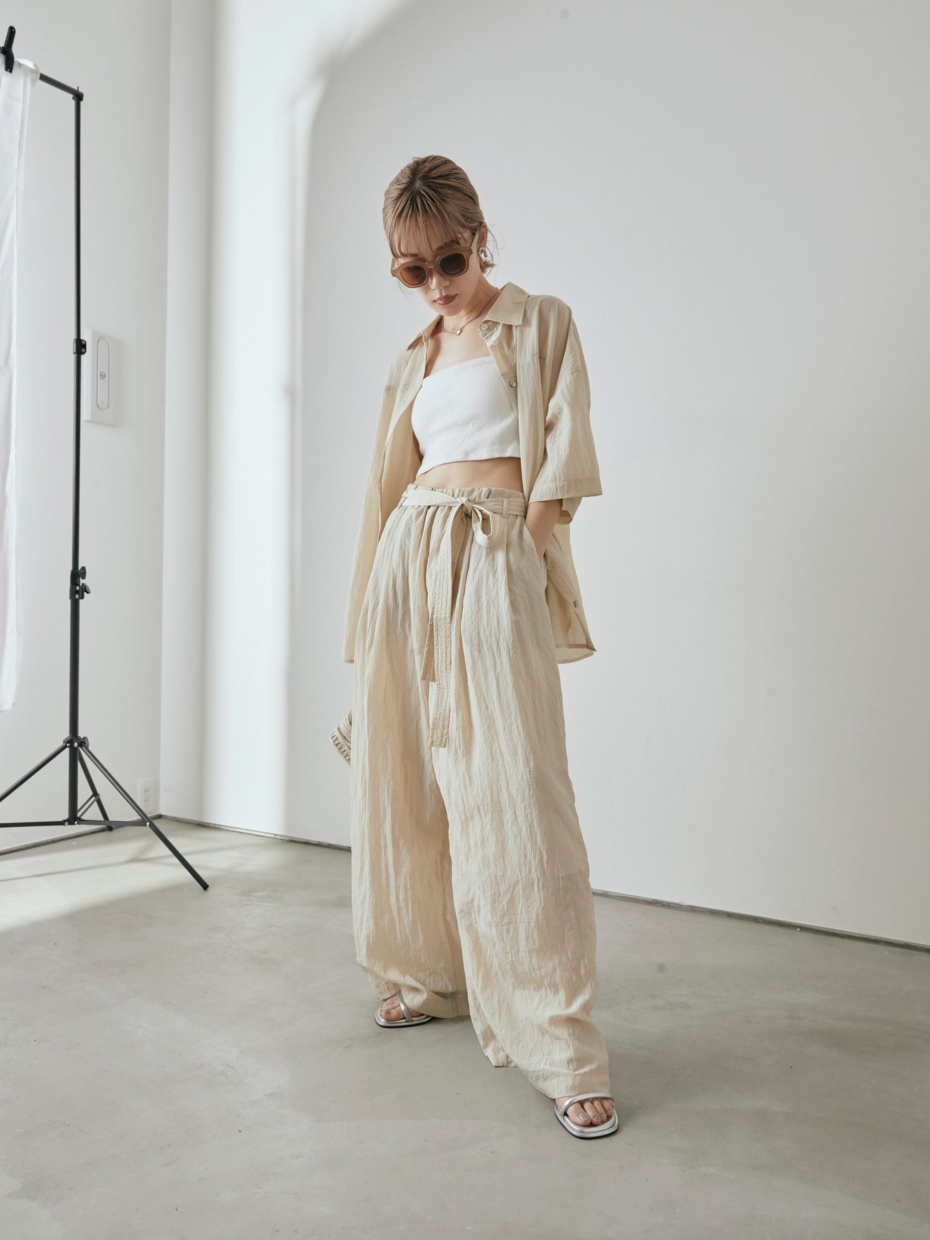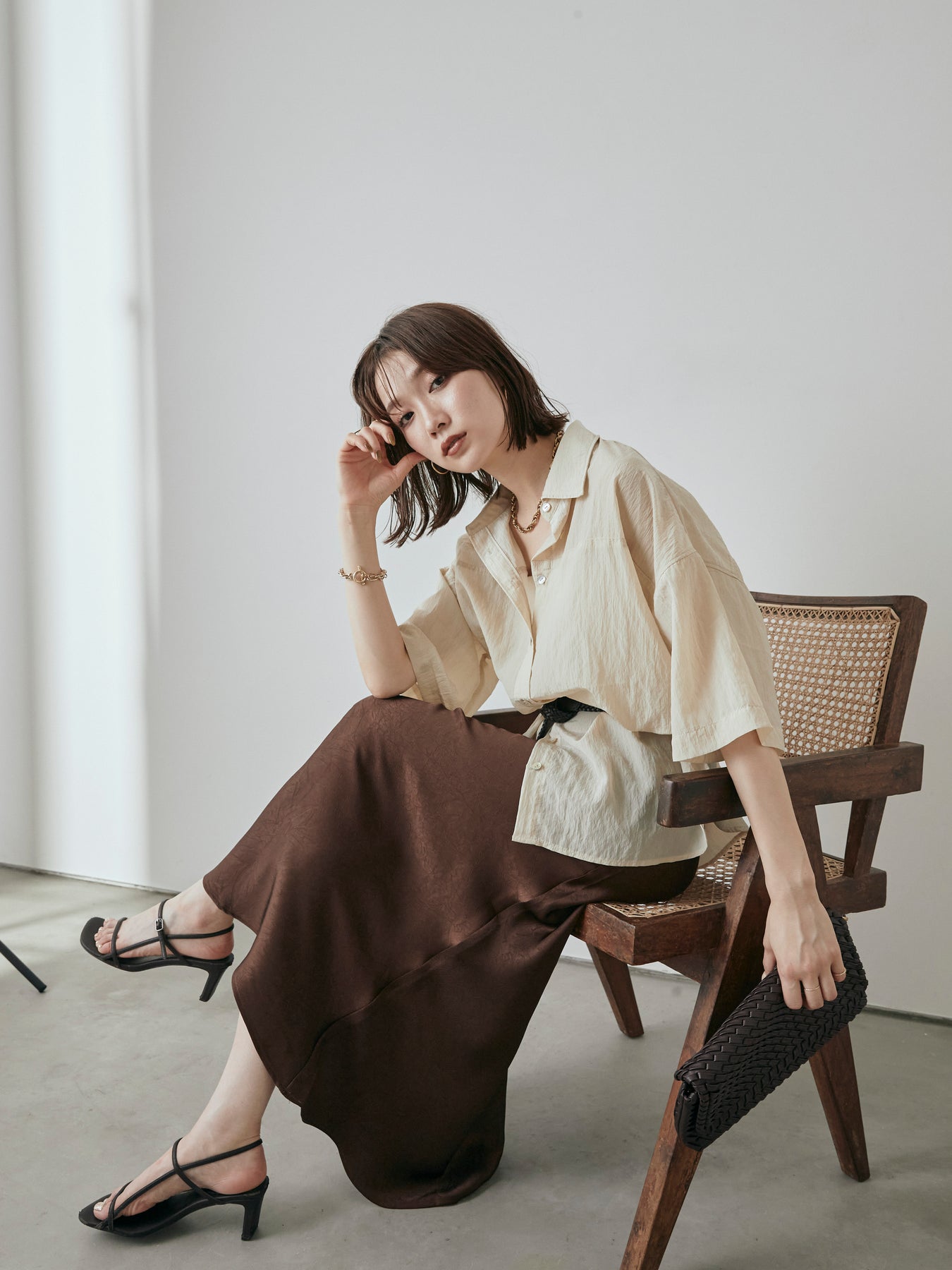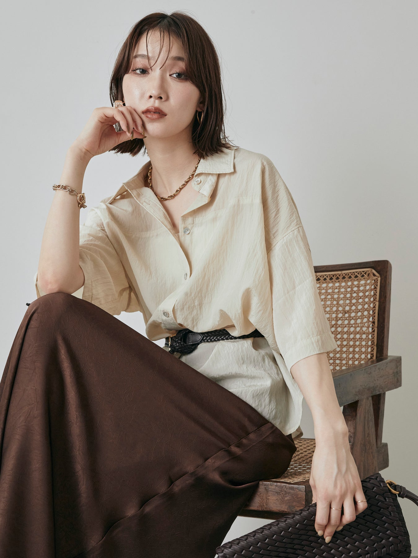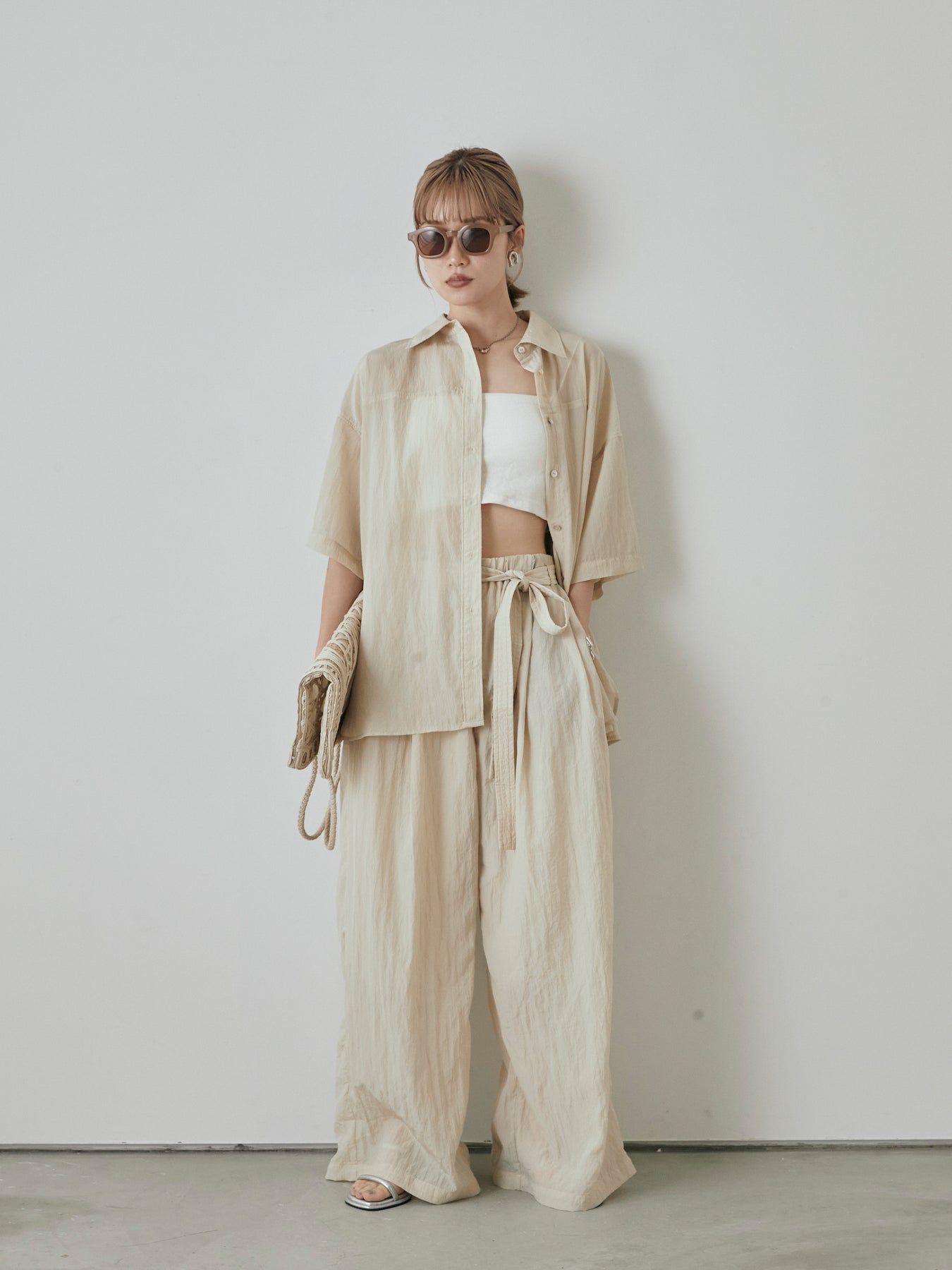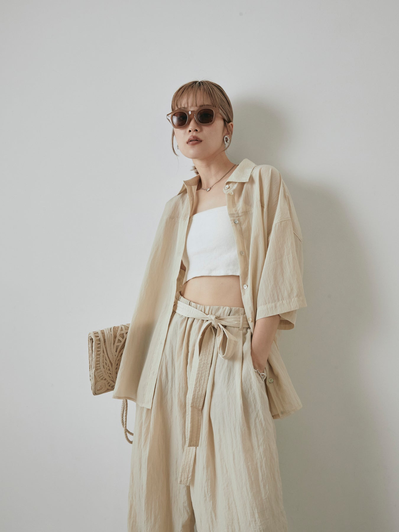 這款半袖襯衫採用輕盈尼龍材質製成,並經過水洗處理,外觀精緻。 這是一種用途極為廣泛的物品,既可以隨意穿著,也可以單件穿著。 褶皺的材質營造出休閒的感覺,光滑的質地即使在夏天也感覺很舒適。 適度寬鬆的輪廓營造出休閒與成熟的精緻平衡。 搭配相同材質的褲子穿著,時尚休閒。 將它穿在背心或吊帶背心外面,形成一種層次感,增強季節氣氛。