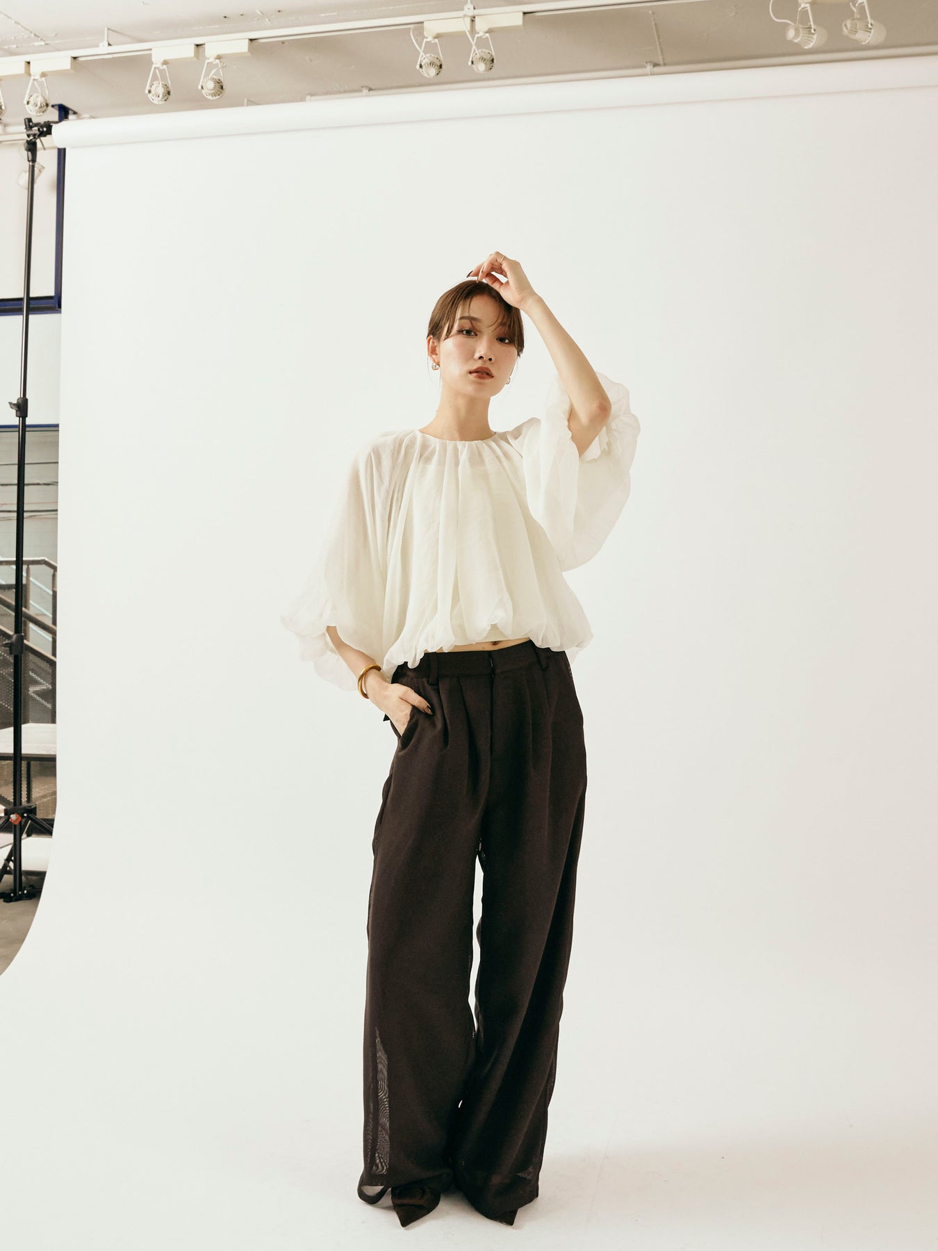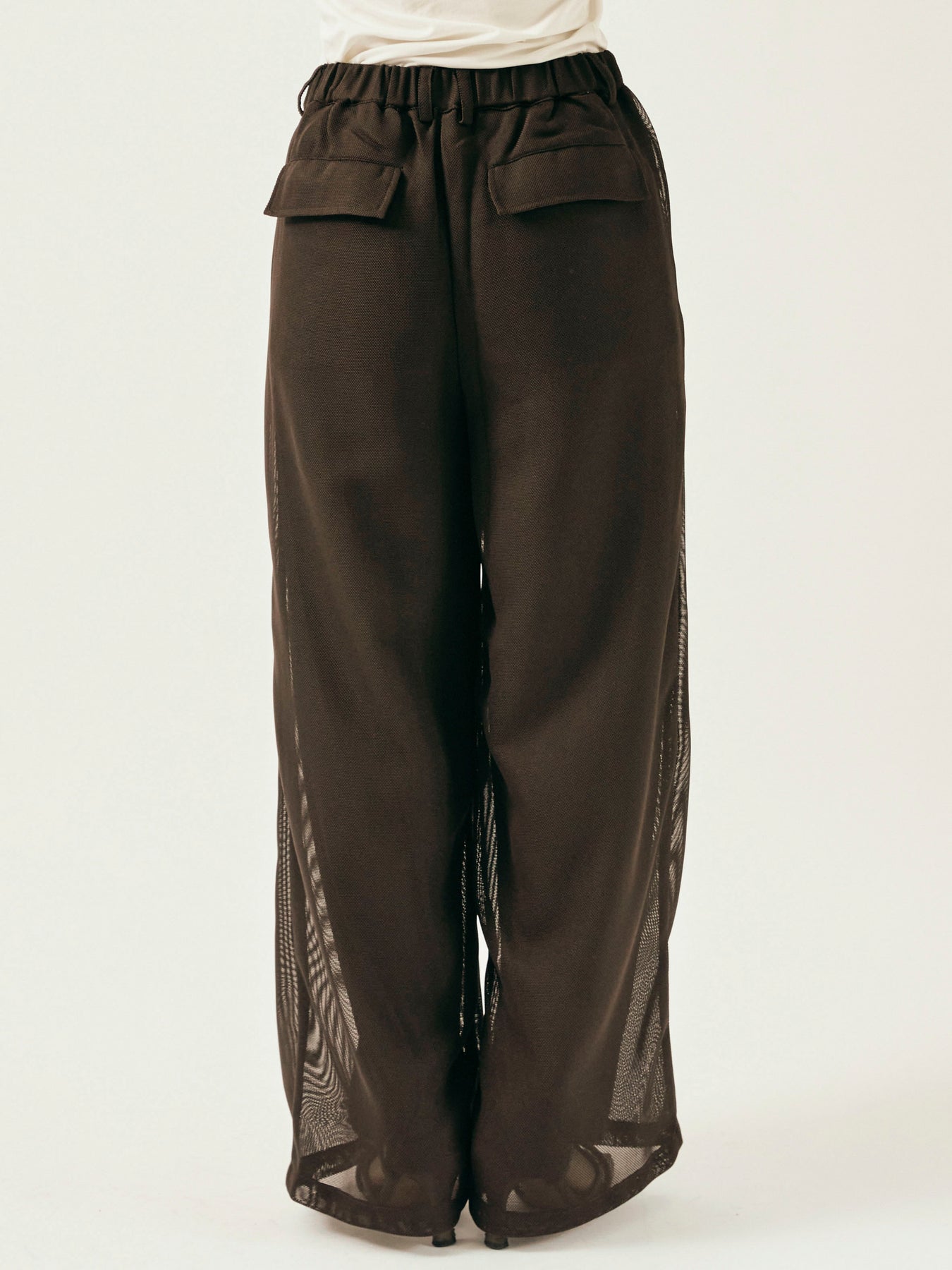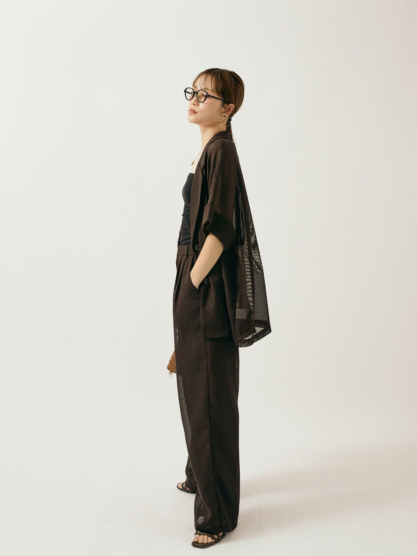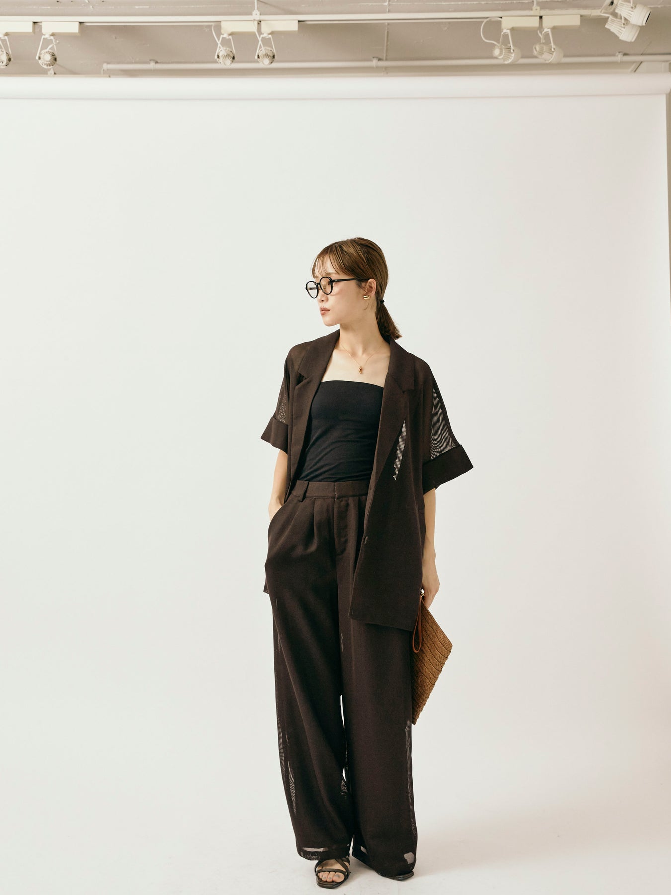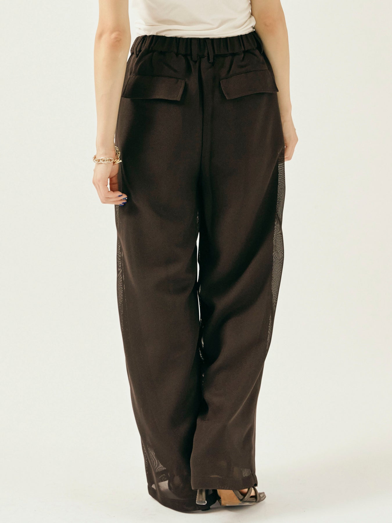 シアー感が軽やかな、トレンド感漂うメッシュワイドパンツ。 ほんのり透ける裾のメッシュデザインが、さりげなく抜け感を演出してくれます。 フロントに入ったタックが立体的なシルエットをつくり、ラフになりすぎず上品な印象に。 ウエストはバックゴム仕様で、見た目以上のラクな着心地も魅力。 Tシャツ合わせでカジュアルに、ブラウスやジャケットでモードにと、着回し力も抜群の1本です。