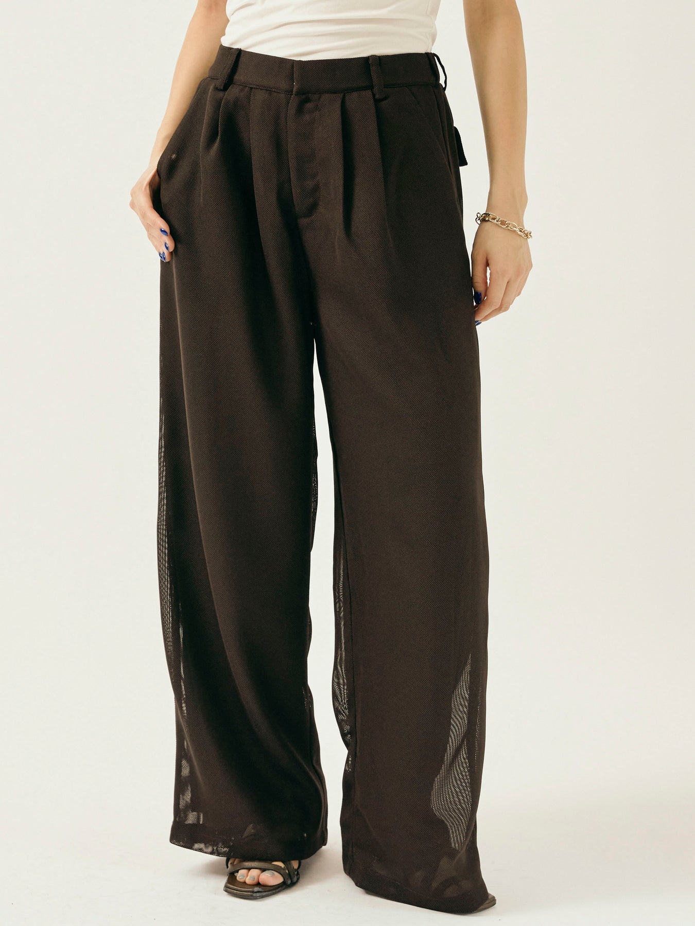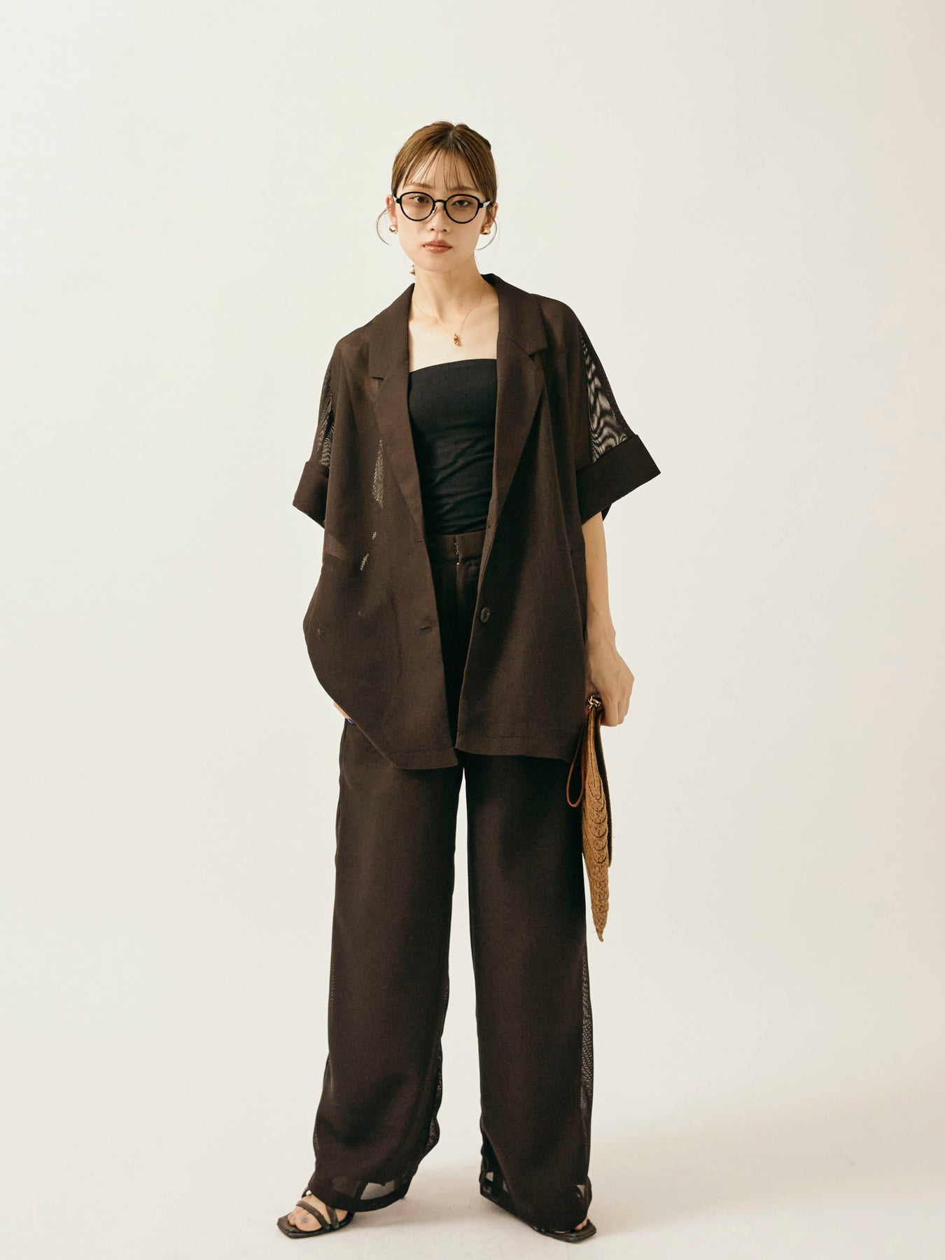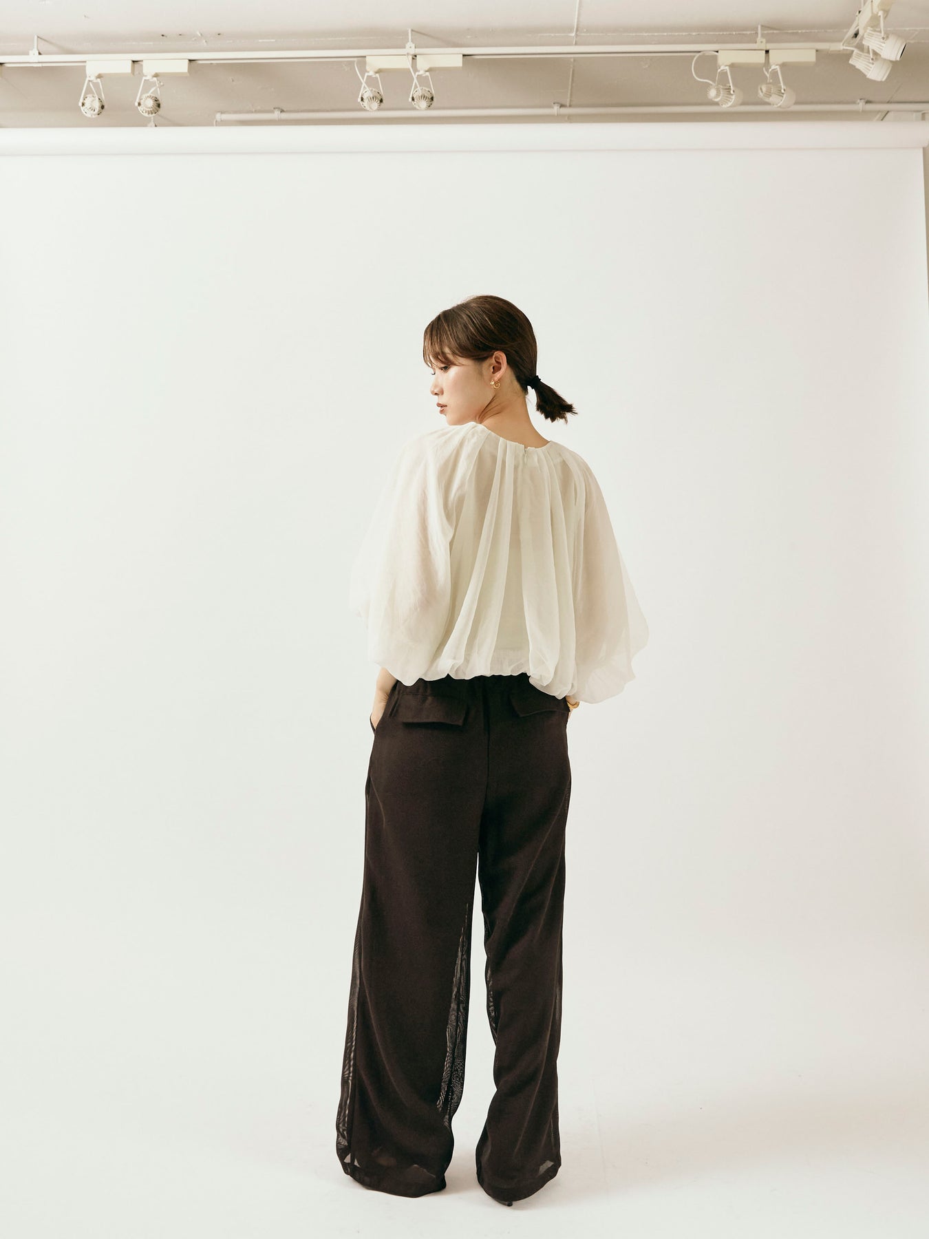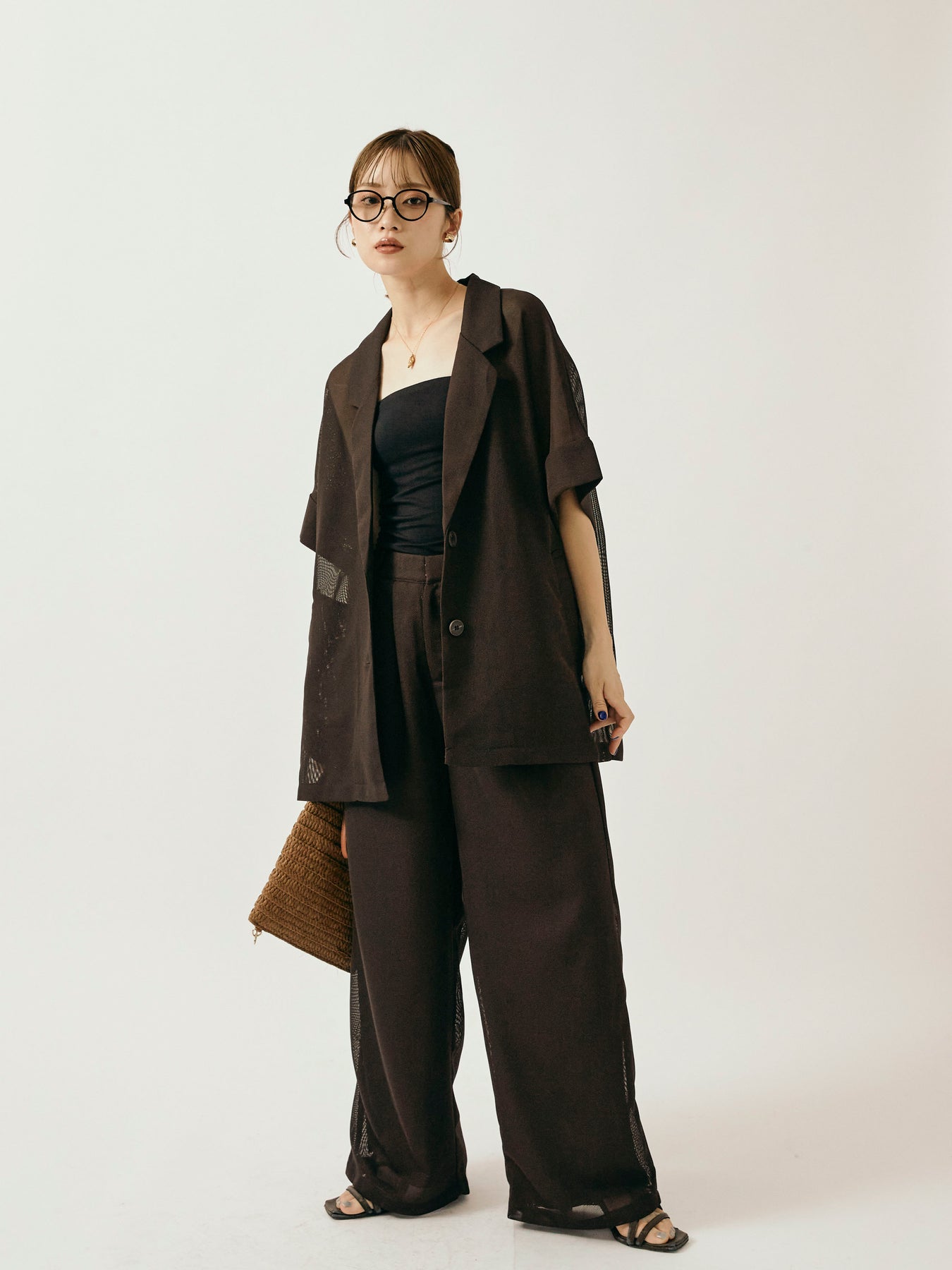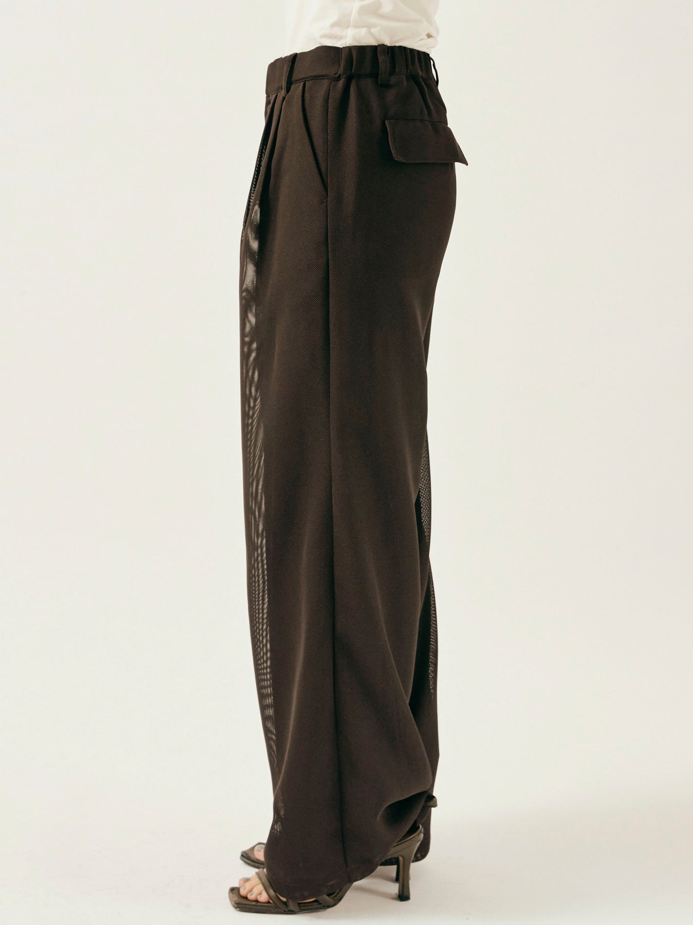 シアー感が軽やかな、トレンド感漂うメッシュワイドパンツ。 ほんのり透ける裾のメッシュデザインが、さりげなく抜け感を演出してくれます。 フロントに入ったタックが立体的なシルエットをつくり、ラフになりすぎず上品な印象に。 ウエストはバックゴム仕様で、見た目以上のラクな着心地も魅力。 Tシャツ合わせでカジュアルに、ブラウスやジャケットでモードにと、着回し力も抜群の1本です。