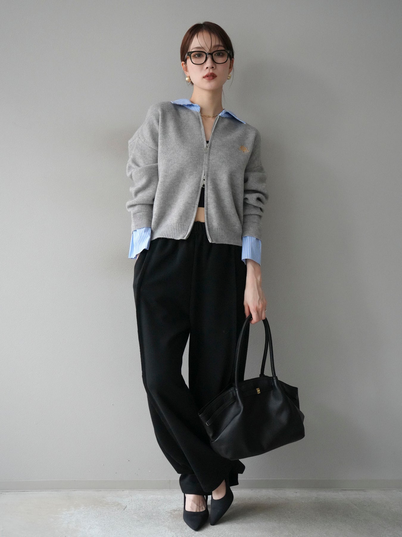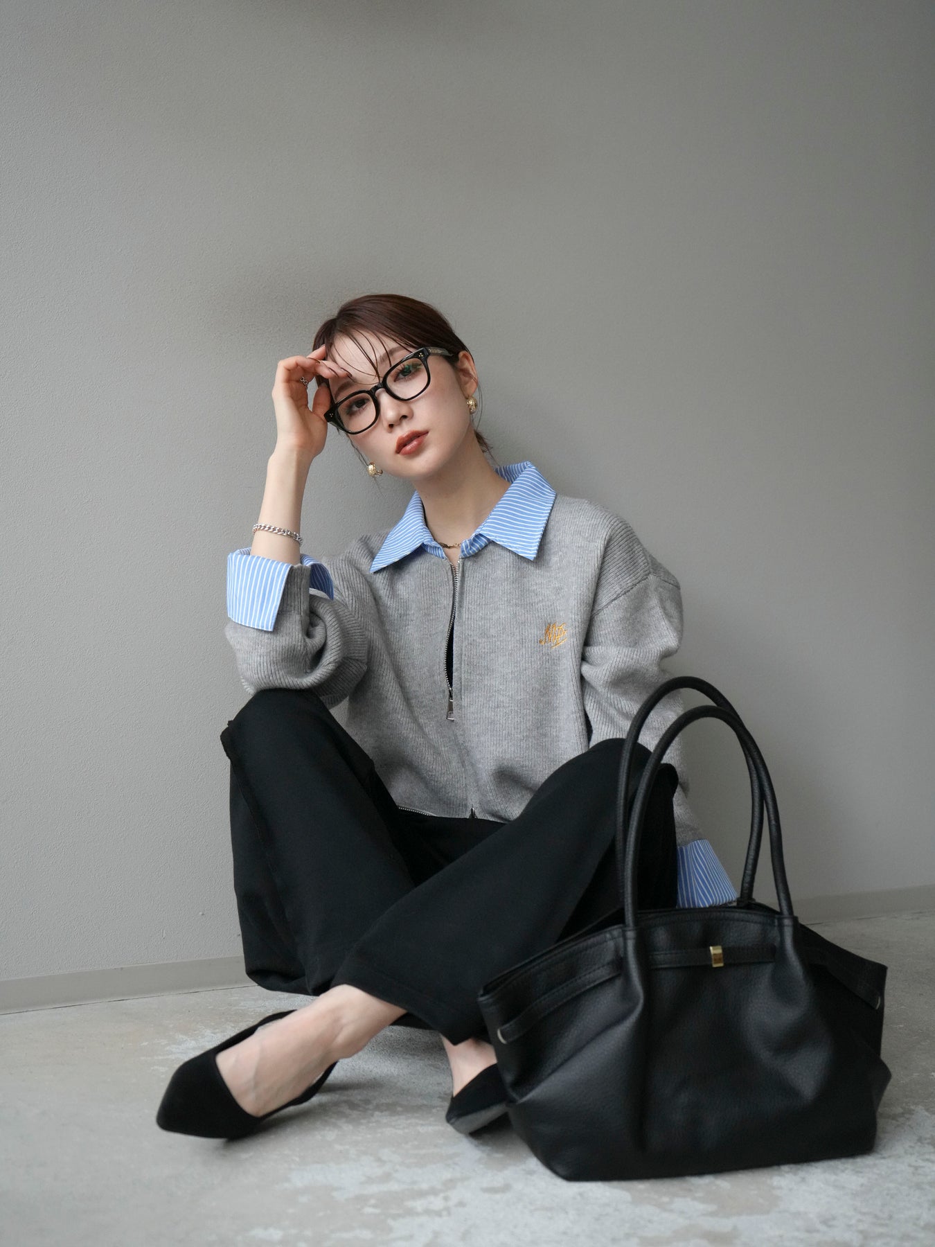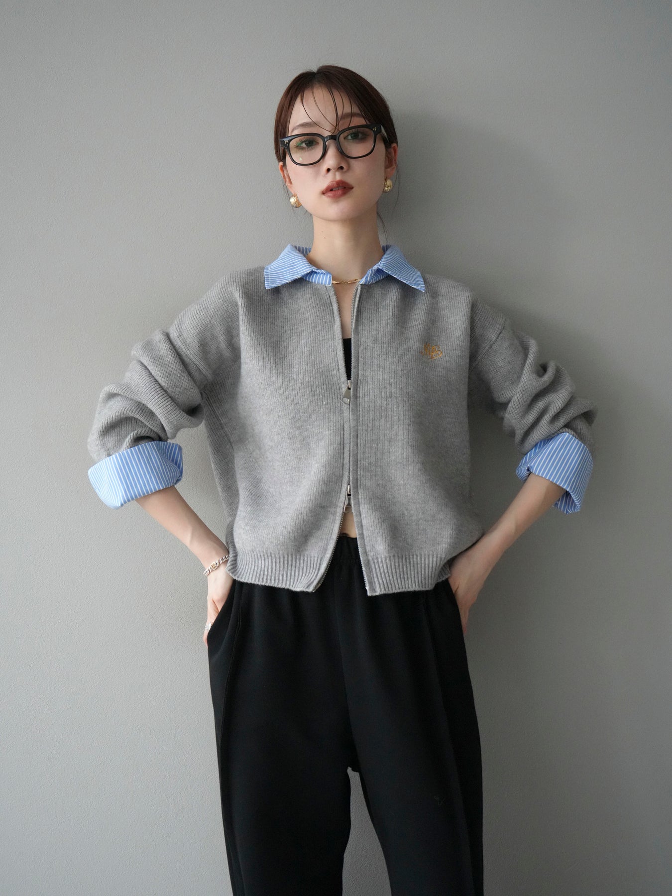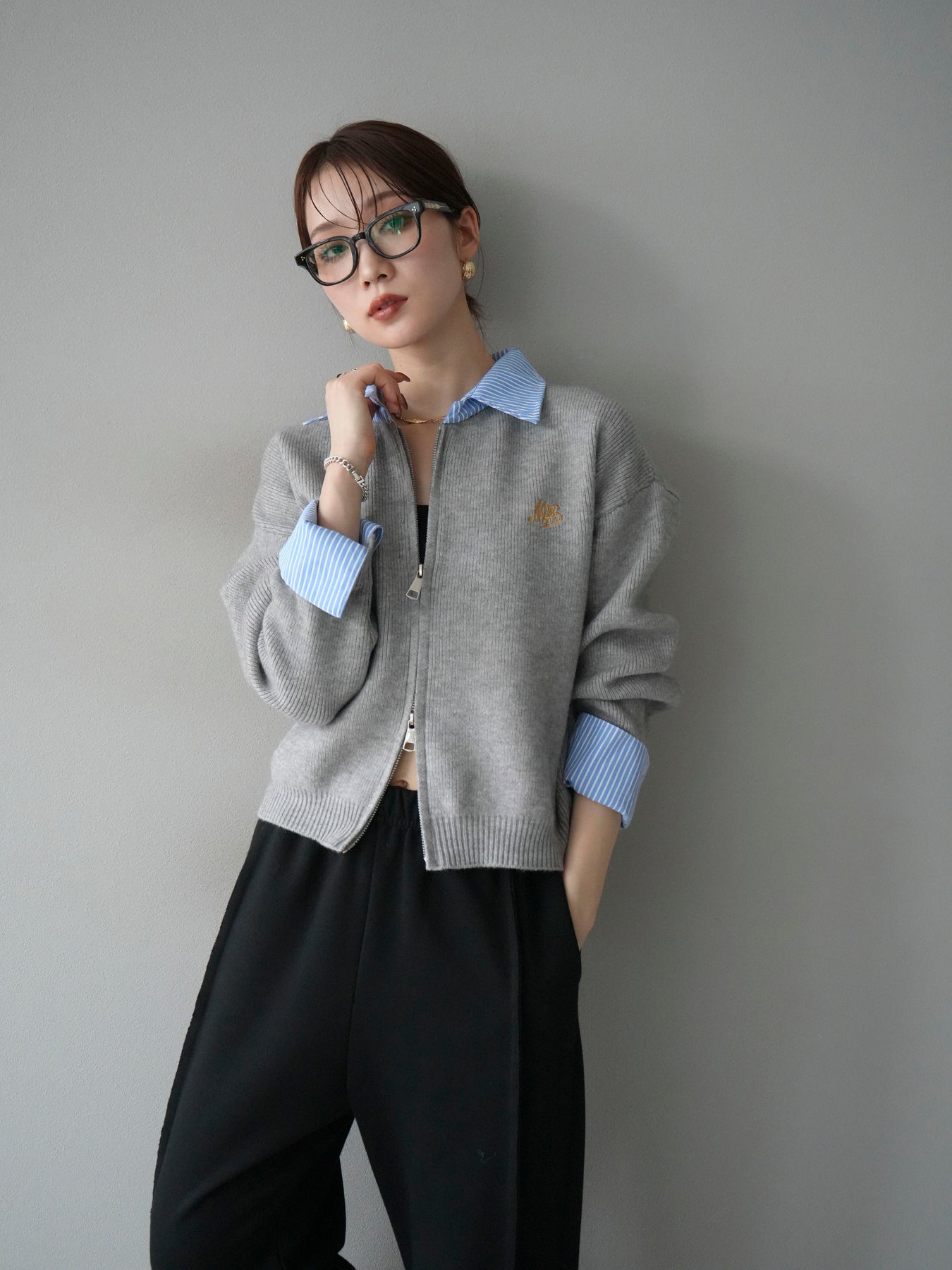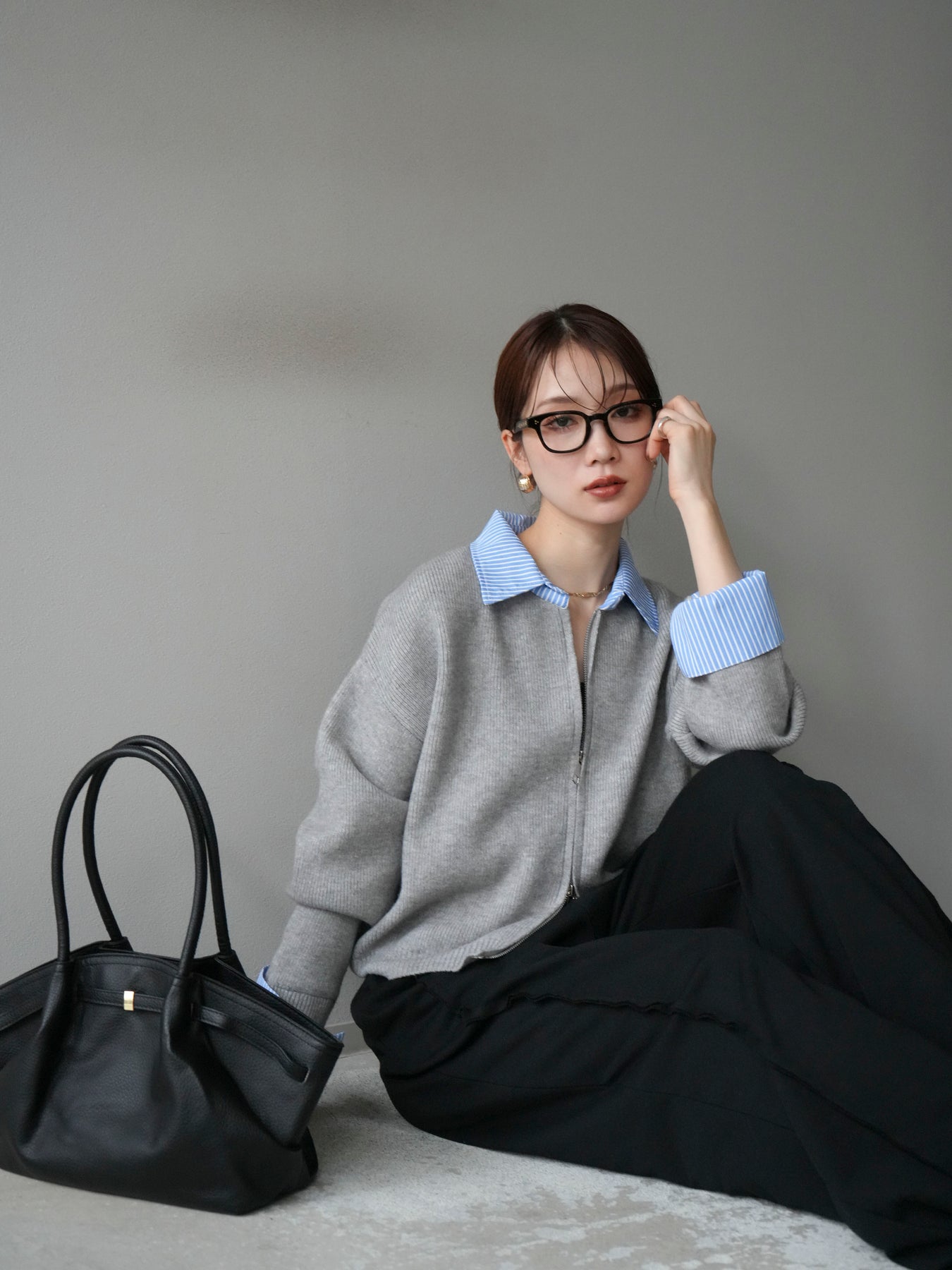 【預購】條紋襯衫疊層拉鍊針織開襟衫/灰色