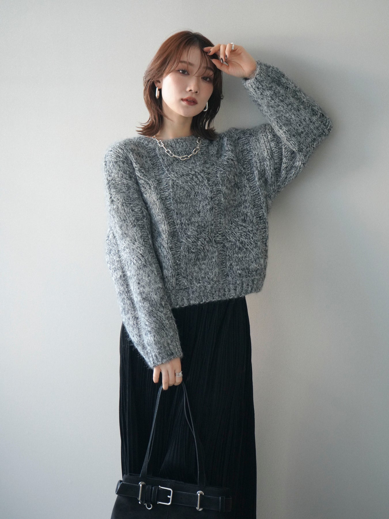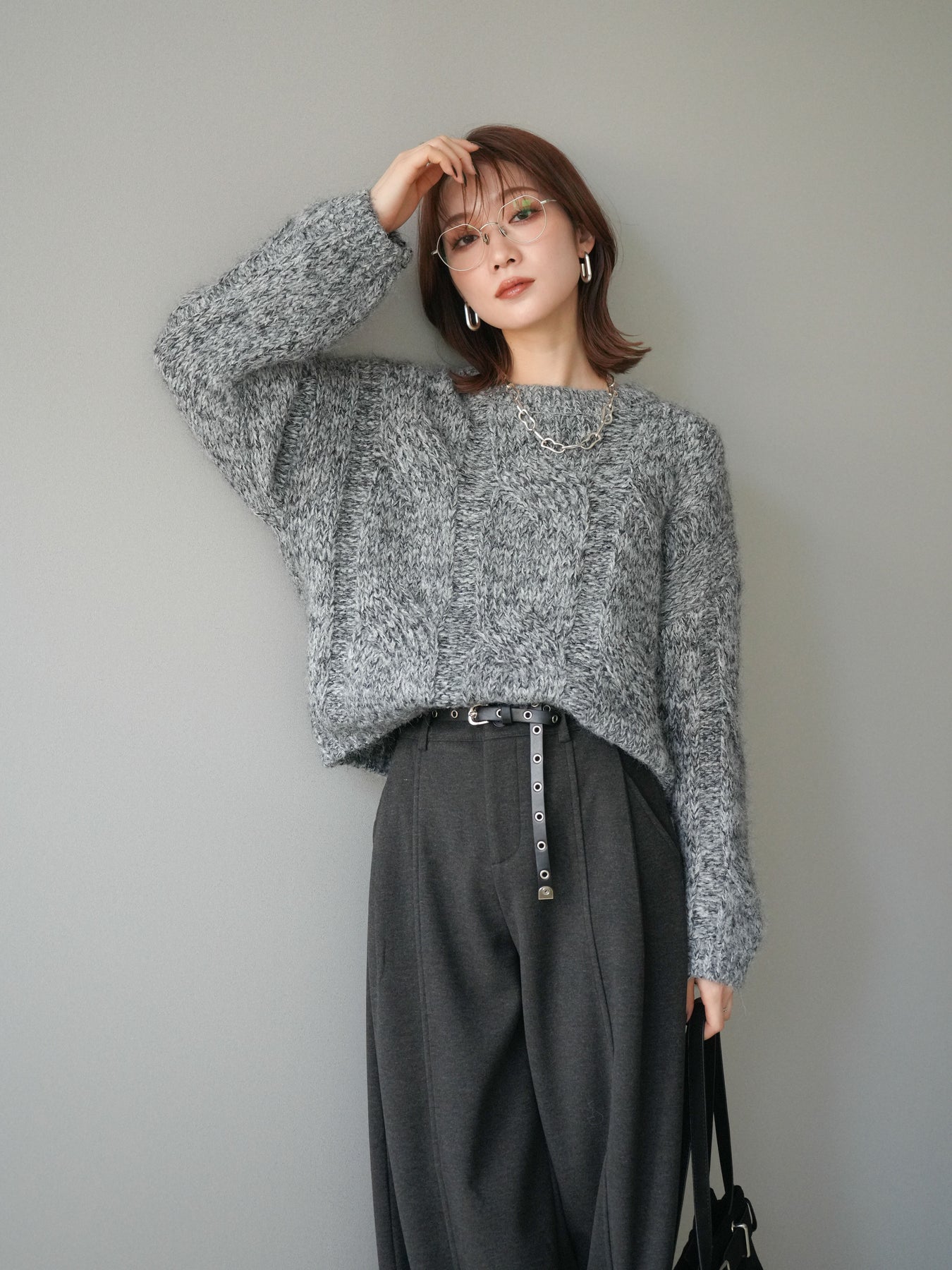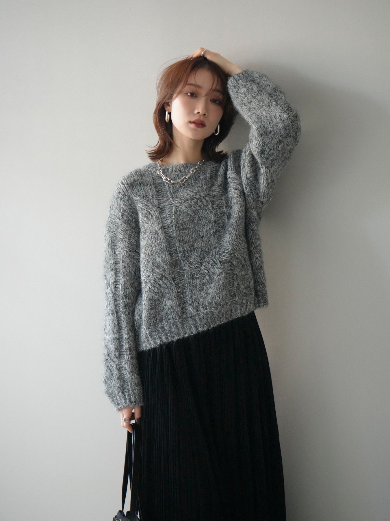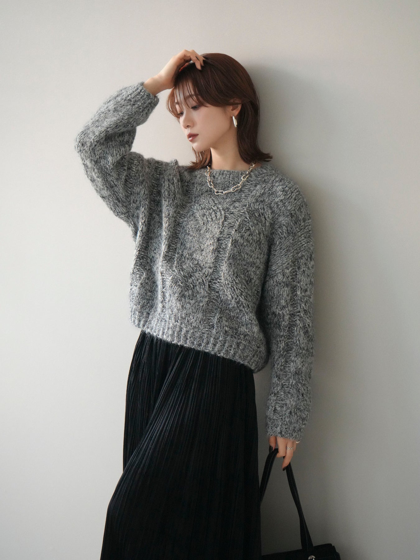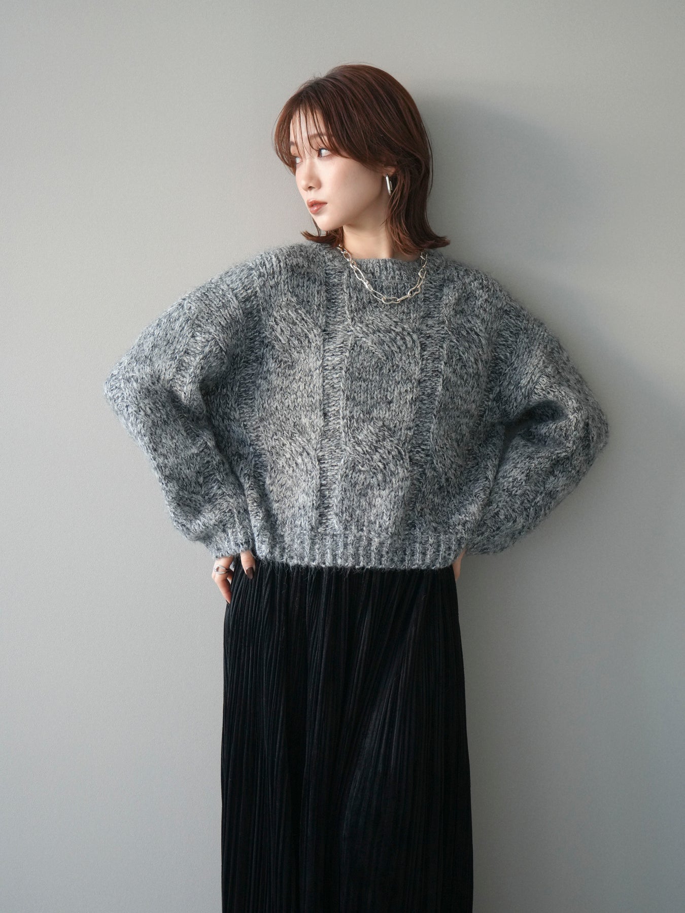 太めのケーブル編みとミックスヤーンが織りなす立体感が魅力のニットプルオーバー。ざっくりとした編地ながら重たく見えず、柔らかな風合いが季節らしい温もりを感じさせます。ワイドシルエットでゆったりと着られ、抜け感がありながらもルーズすぎない絶妙なバランスに。デニムやスカートなど幅広いボトムスと合わせやすく、1枚で主役になる存在感のあるアイテムです。 ※ボトムス、キャミソール(インナー)以外の商品は一律でインナーは付属していません。