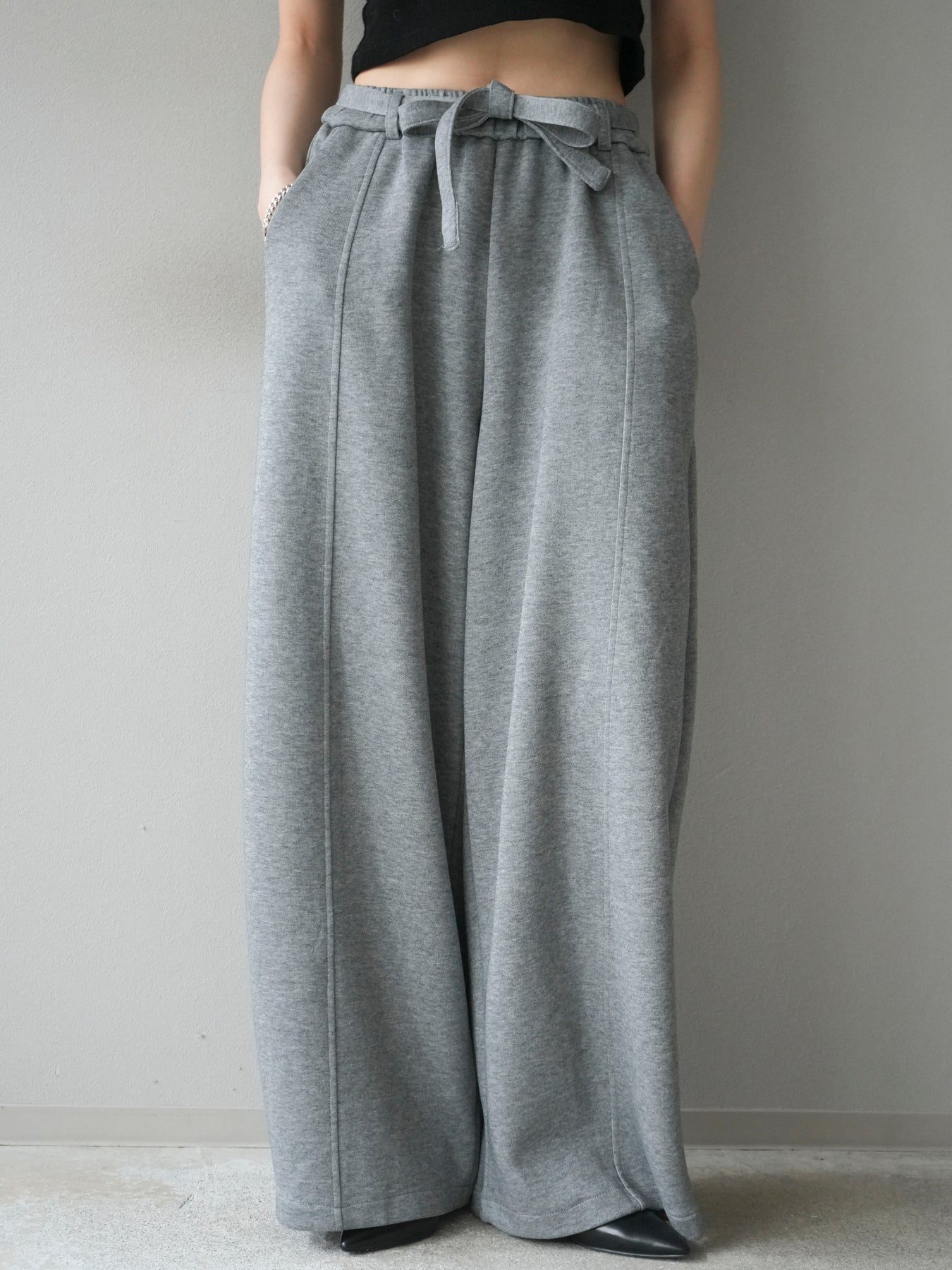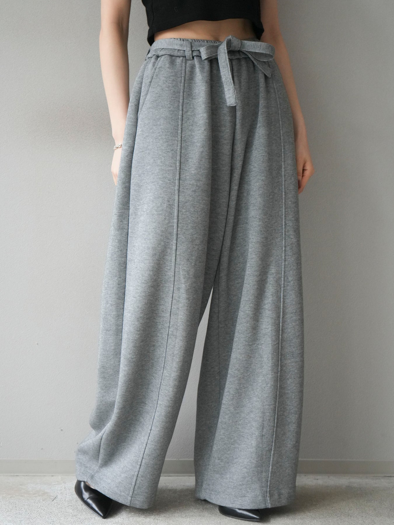 リラクシーな穿き心地と上品なシルエットを兼ね備えたスウェットワイドパンツ。 柔らかく厚みのある素材感で、カジュアルながらも大人っぽく着こなせます。 ウエストの共布ベルトがアクセントとなり、シルエットにメリハリをプラス。 フロントのセンターシームが脚のラインをすっきりと見せ、スタイルアップ効果も◎。 スニーカーやブーツなど、合わせるシューズ次第で幅広いスタイリングを楽しめる万能な1本です。