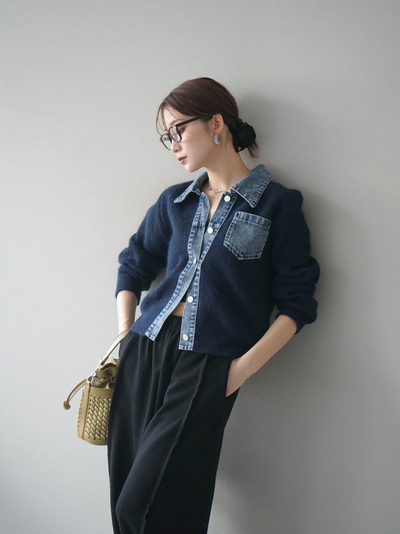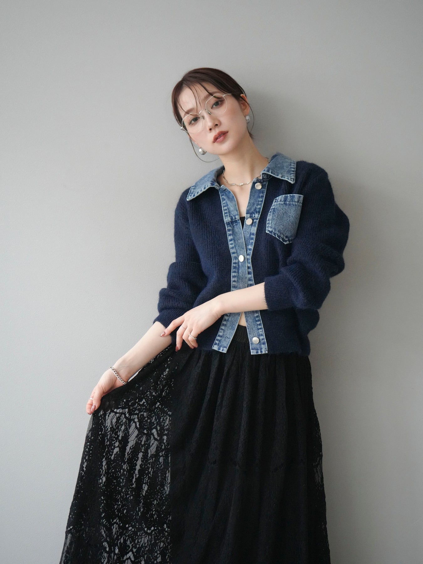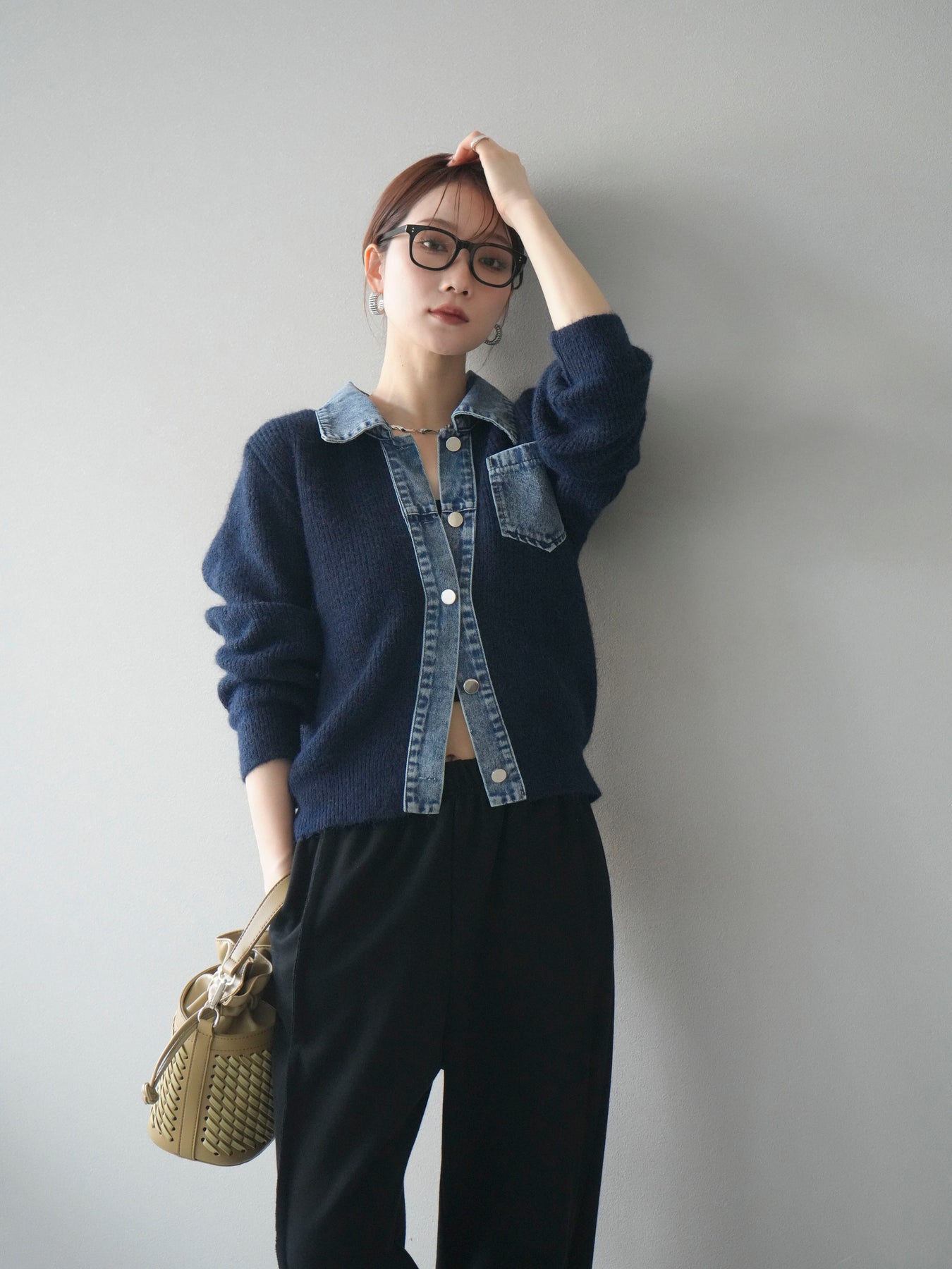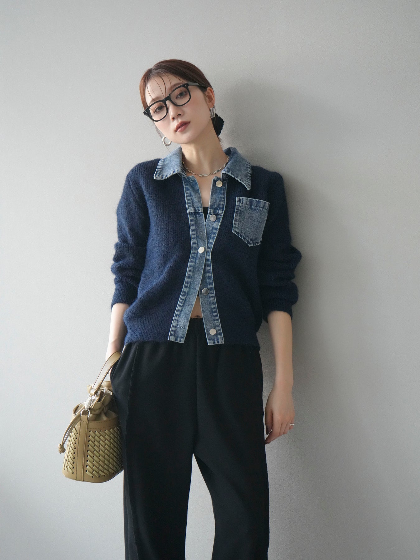 ふんわりとしたニットの優しい風合いに、デニム素材を組み合わせた異素材デザインカーディガン。 襟・前立て・ポケット部分に施されたデニムが、柔らかさの中に程よいカジュアルさをプラスします。 ゆとりのあるシルエットと長めの袖が抜け感を演出し、羽織るだけでスタイリングを今っぽく仕上げてくれる一枚。 シンプルなインナーやスカート・パンツなど、さまざまなボトムとも相性抜群で、デイリー使いにもおすすめです。 軽やかな着心地で、季節の変わり目にも活躍してくれる万能アイテムです。 ※ボトムス、キャミソール(インナー)以外の商品は一律でインナーは付属していません。