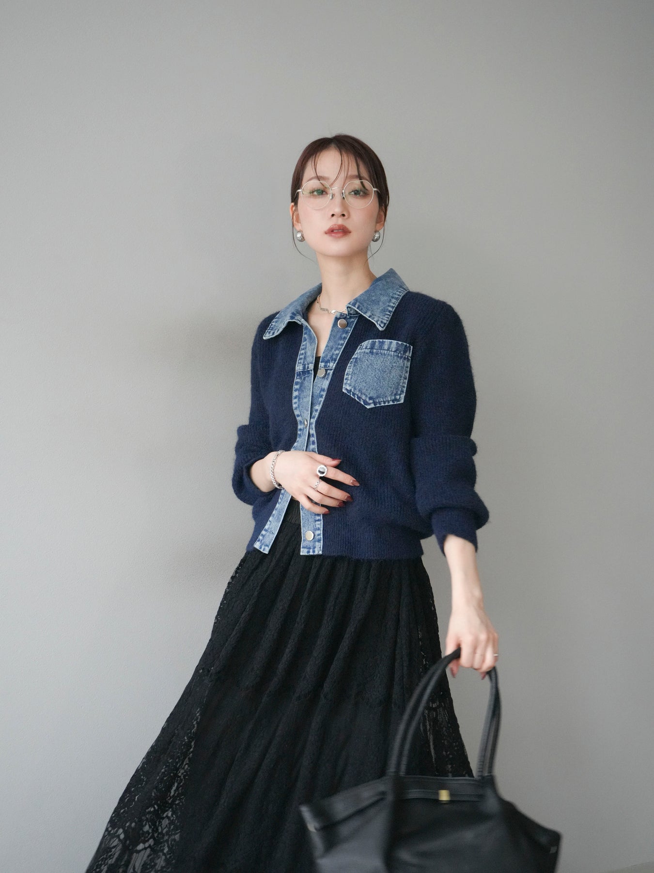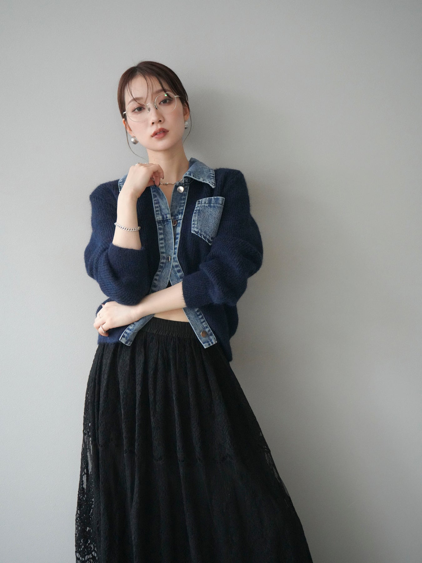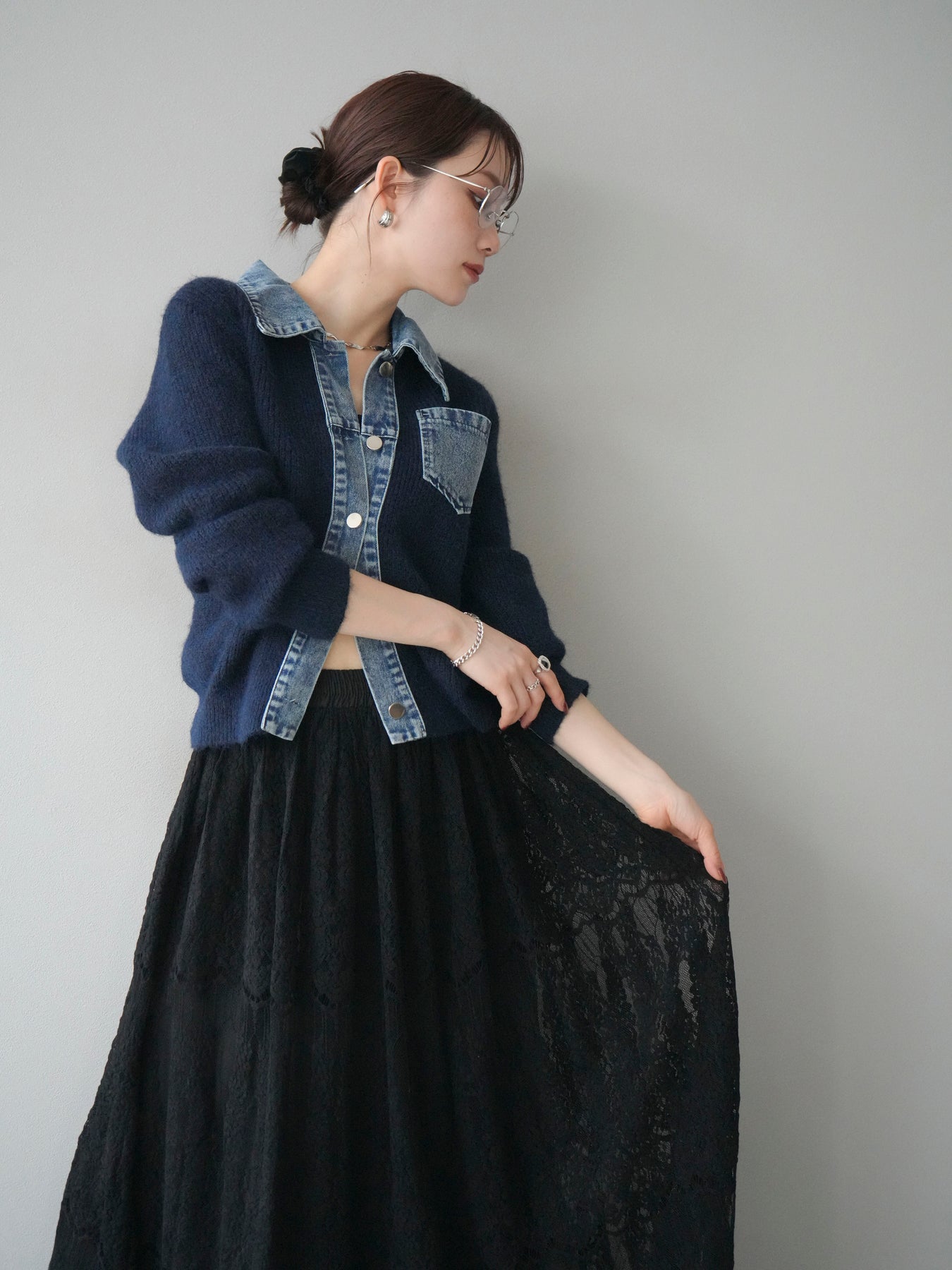 ふんわりとしたニットの優しい風合いに、デニム素材を組み合わせた異素材デザインカーディガン。 襟・前立て・ポケット部分に施されたデニムが、柔らかさの中に程よいカジュアルさをプラスします。 ゆとりのあるシルエットと長めの袖が抜け感を演出し、羽織るだけでスタイリングを今っぽく仕上げてくれる一枚。 シンプルなインナーやスカート・パンツなど、さまざまなボトムとも相性抜群で、デイリー使いにもおすすめです。 軽やかな着心地で、季節の変わり目にも活躍してくれる万能アイテムです。 ※ボトムス、キャミソール(インナー)以外の商品は一律でインナーは付属していません。