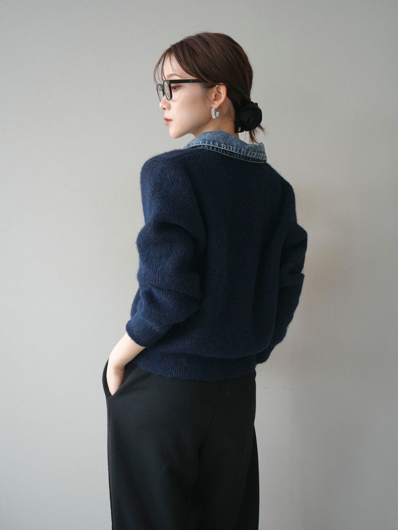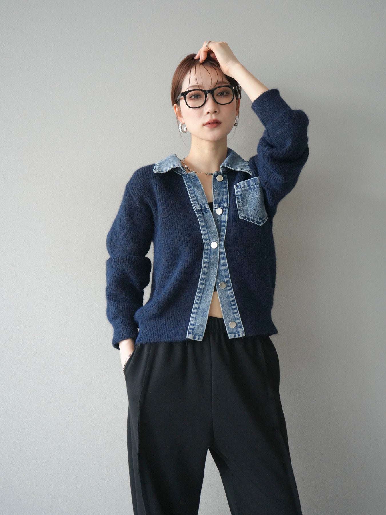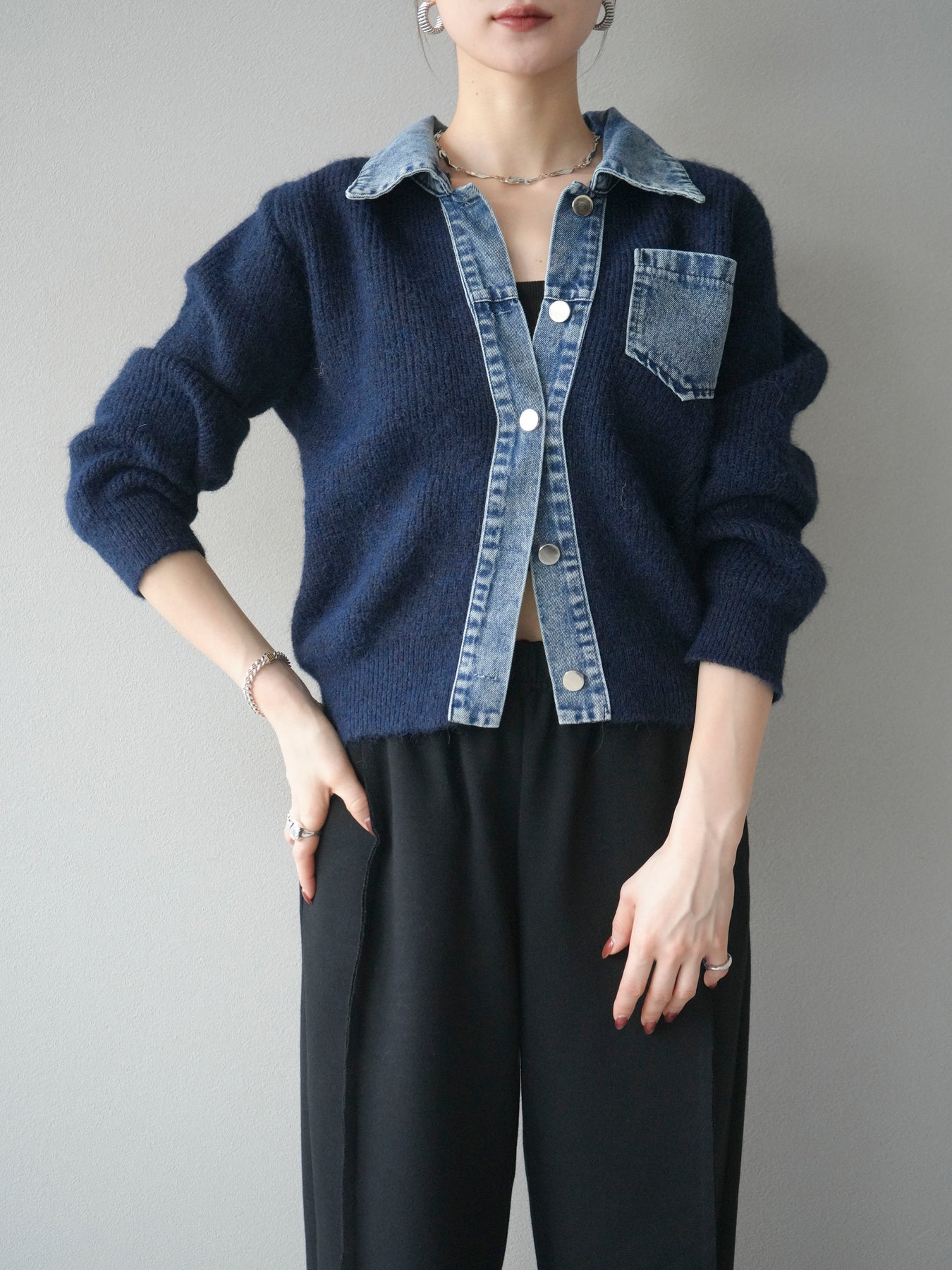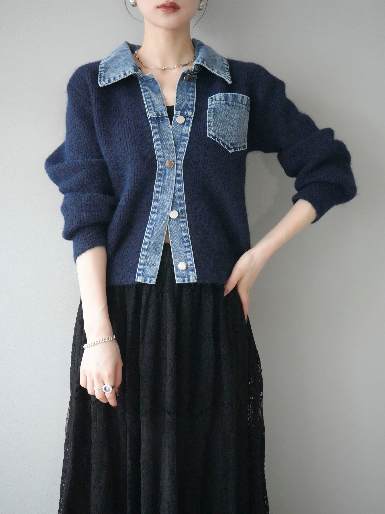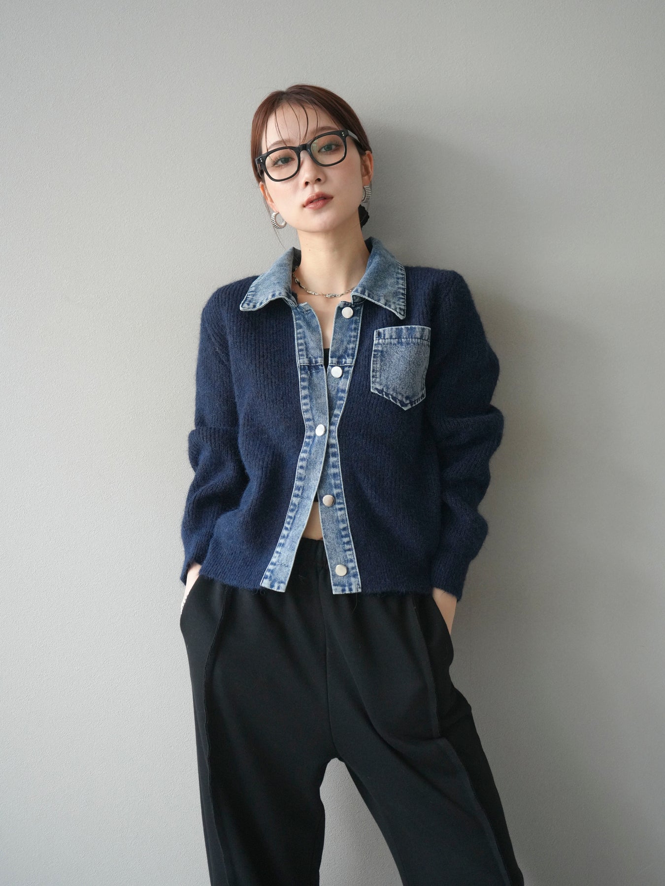 [予約]デニム襟ポケットニットカーディガン/navy