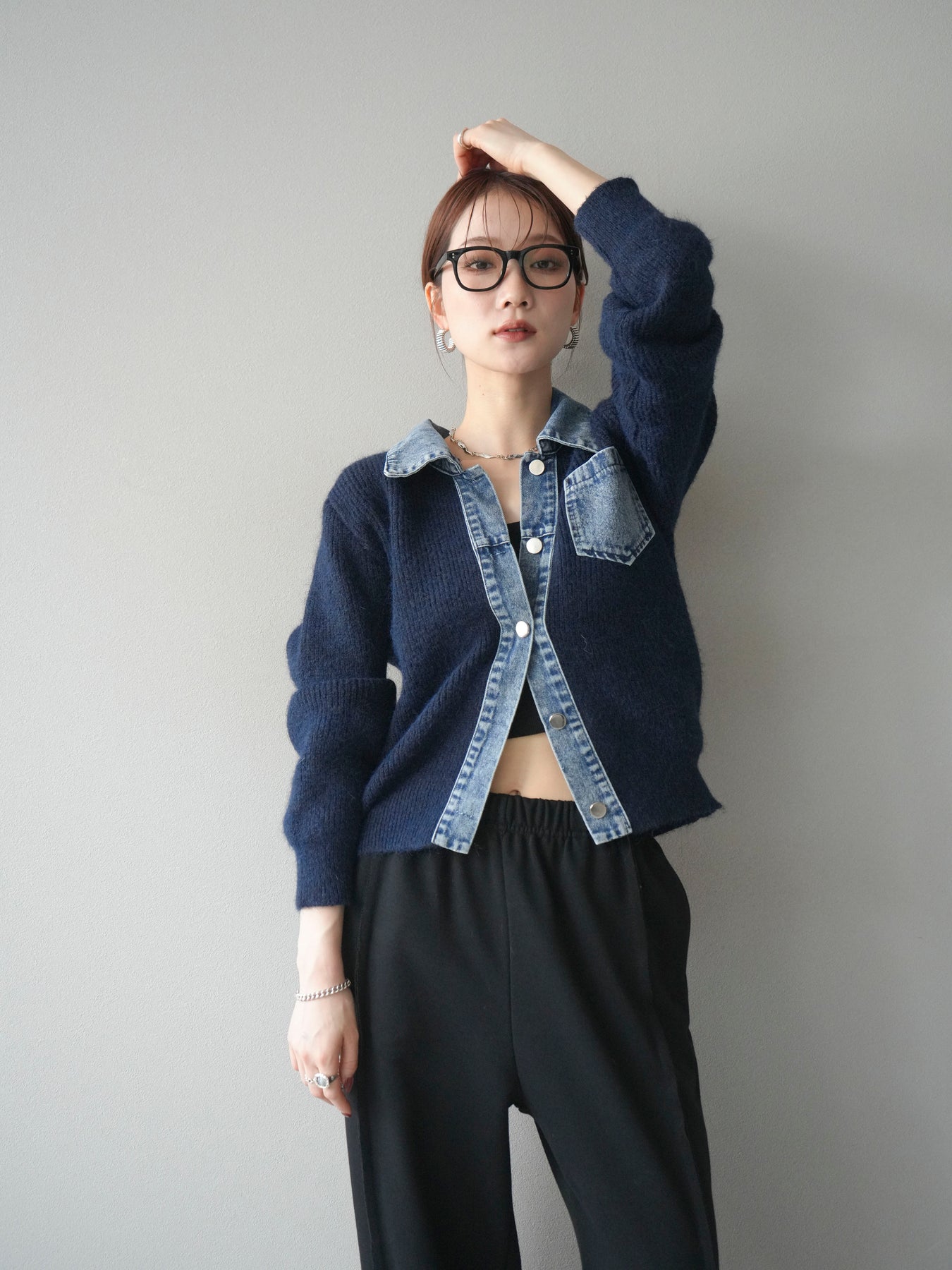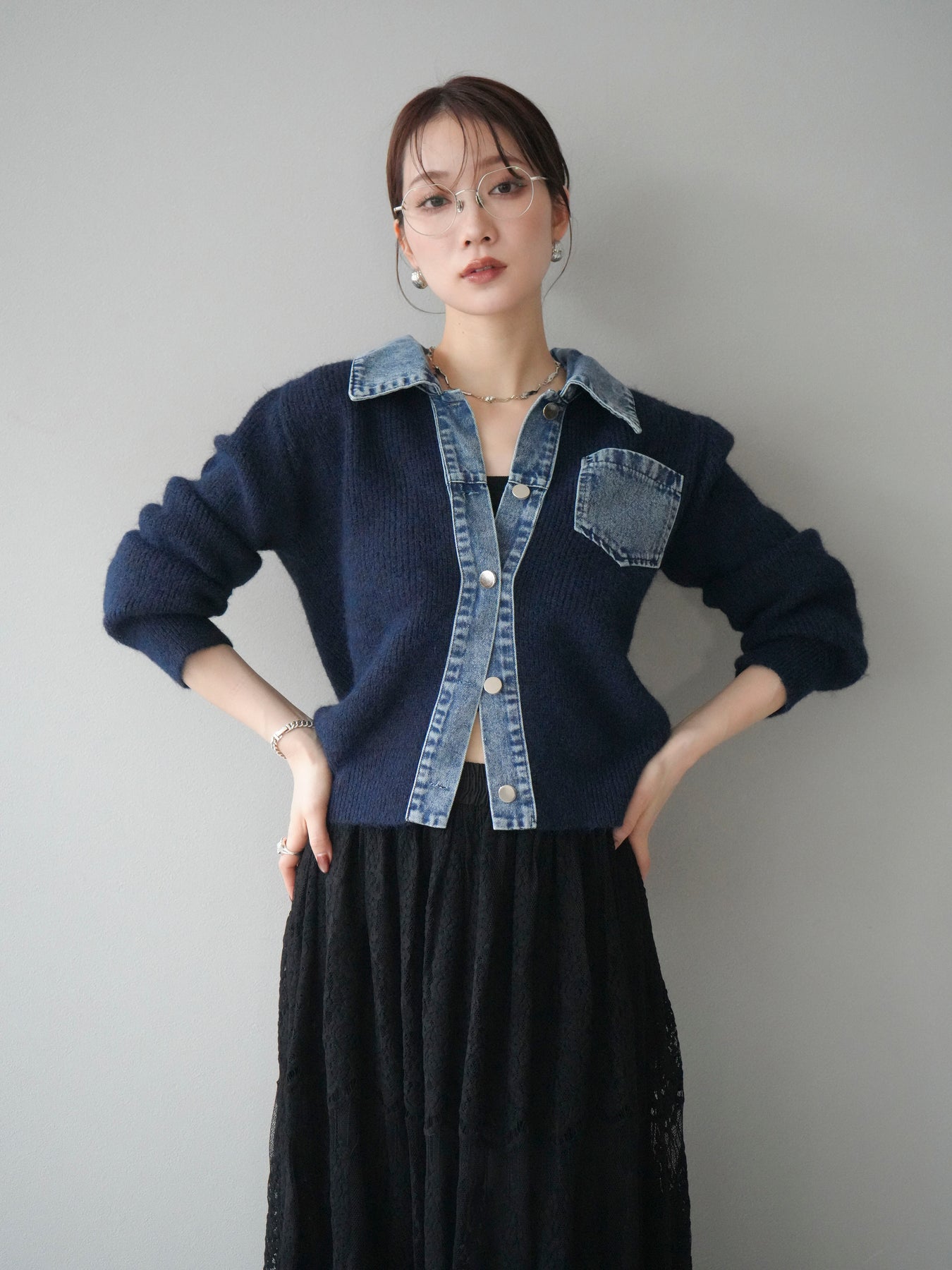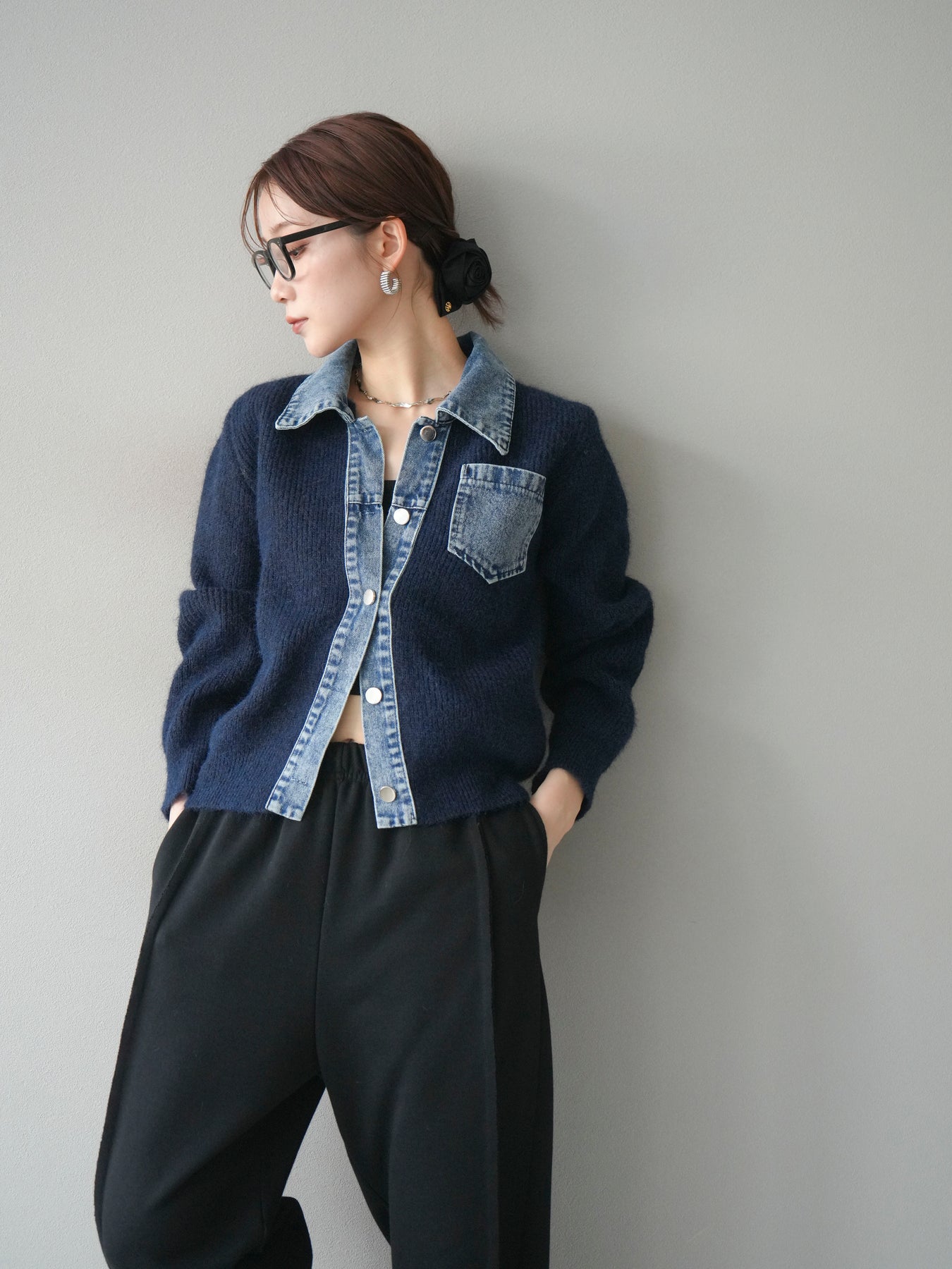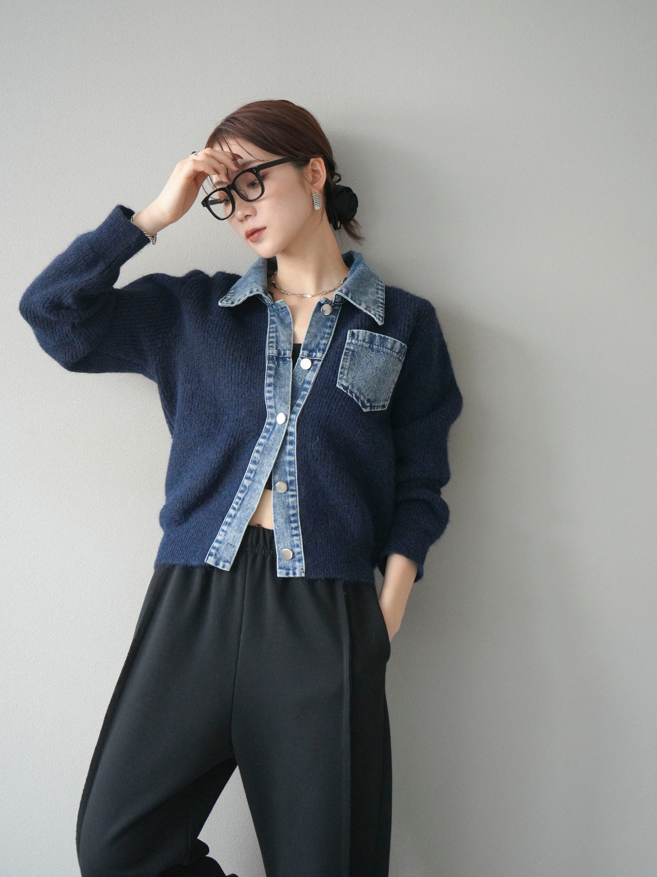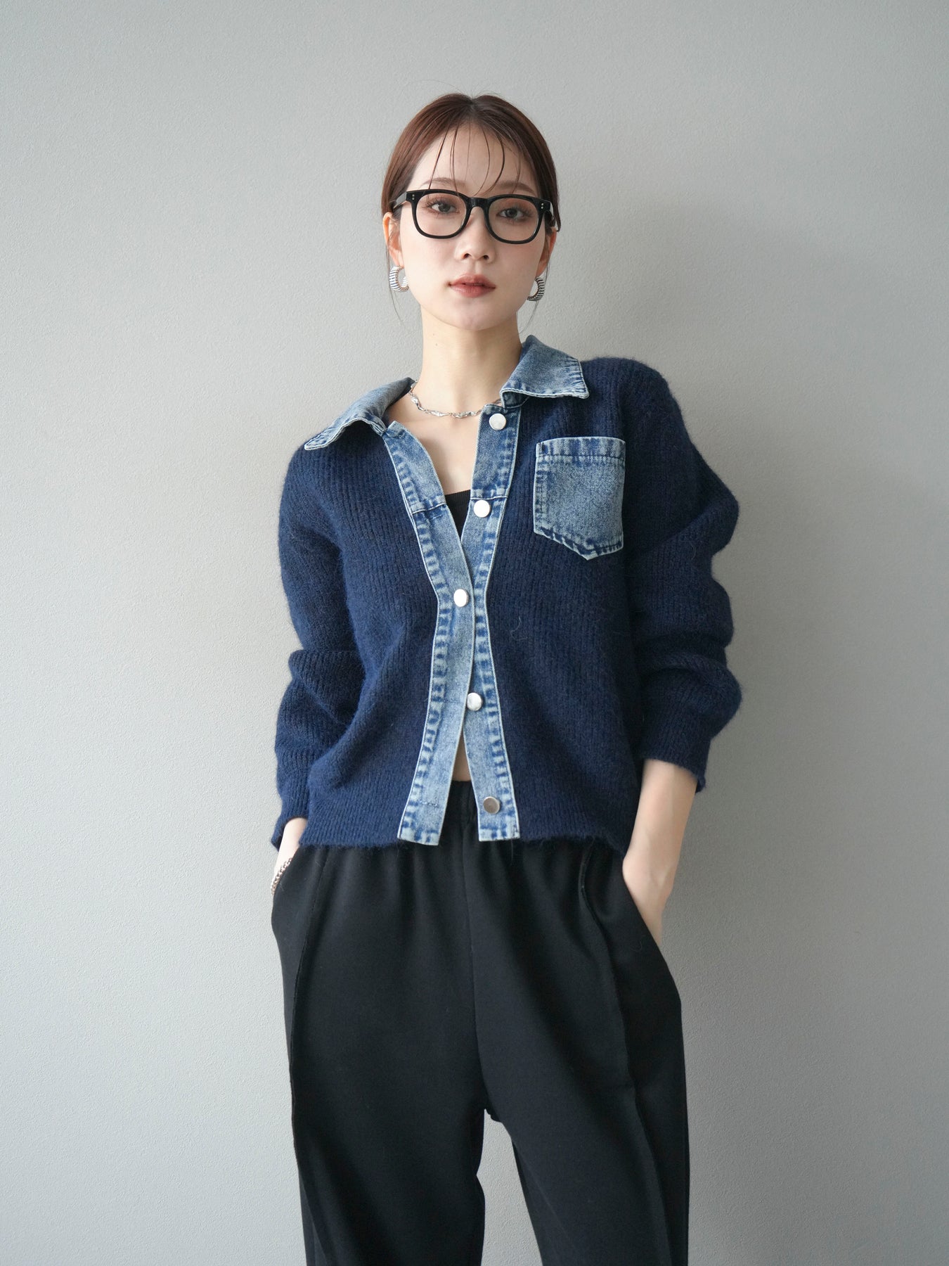 [予約]デニム襟ポケットニットカーディガン/navy