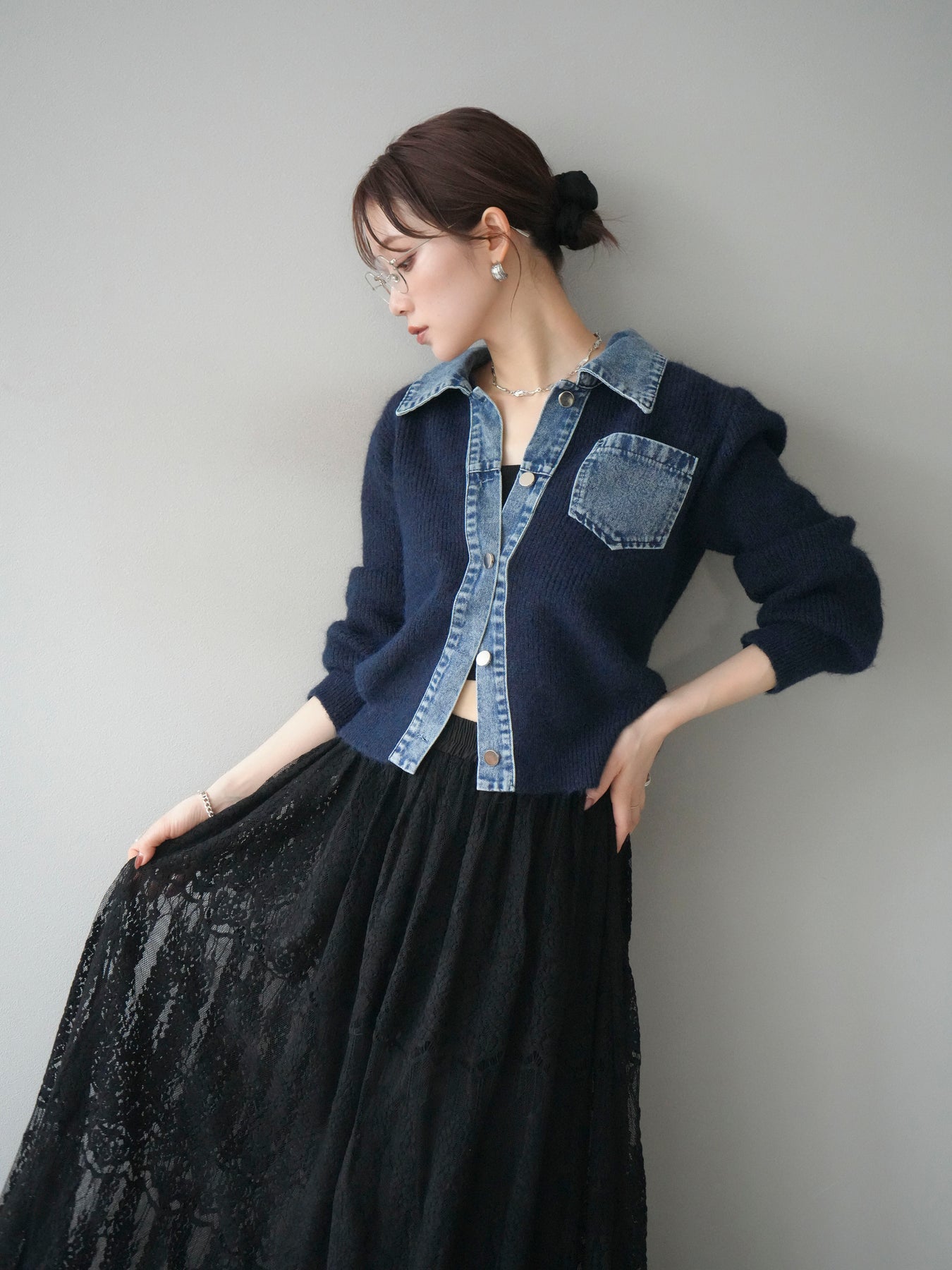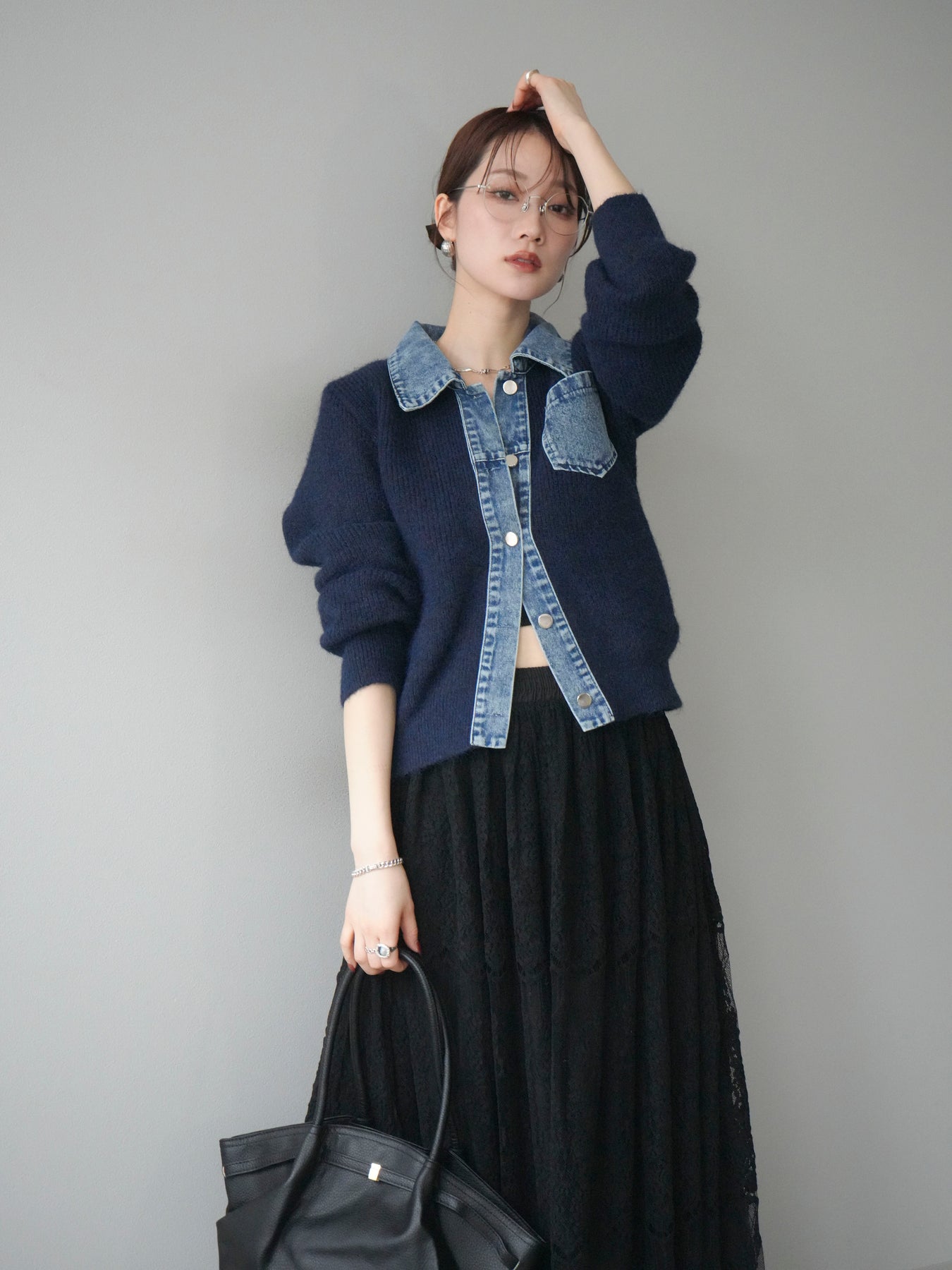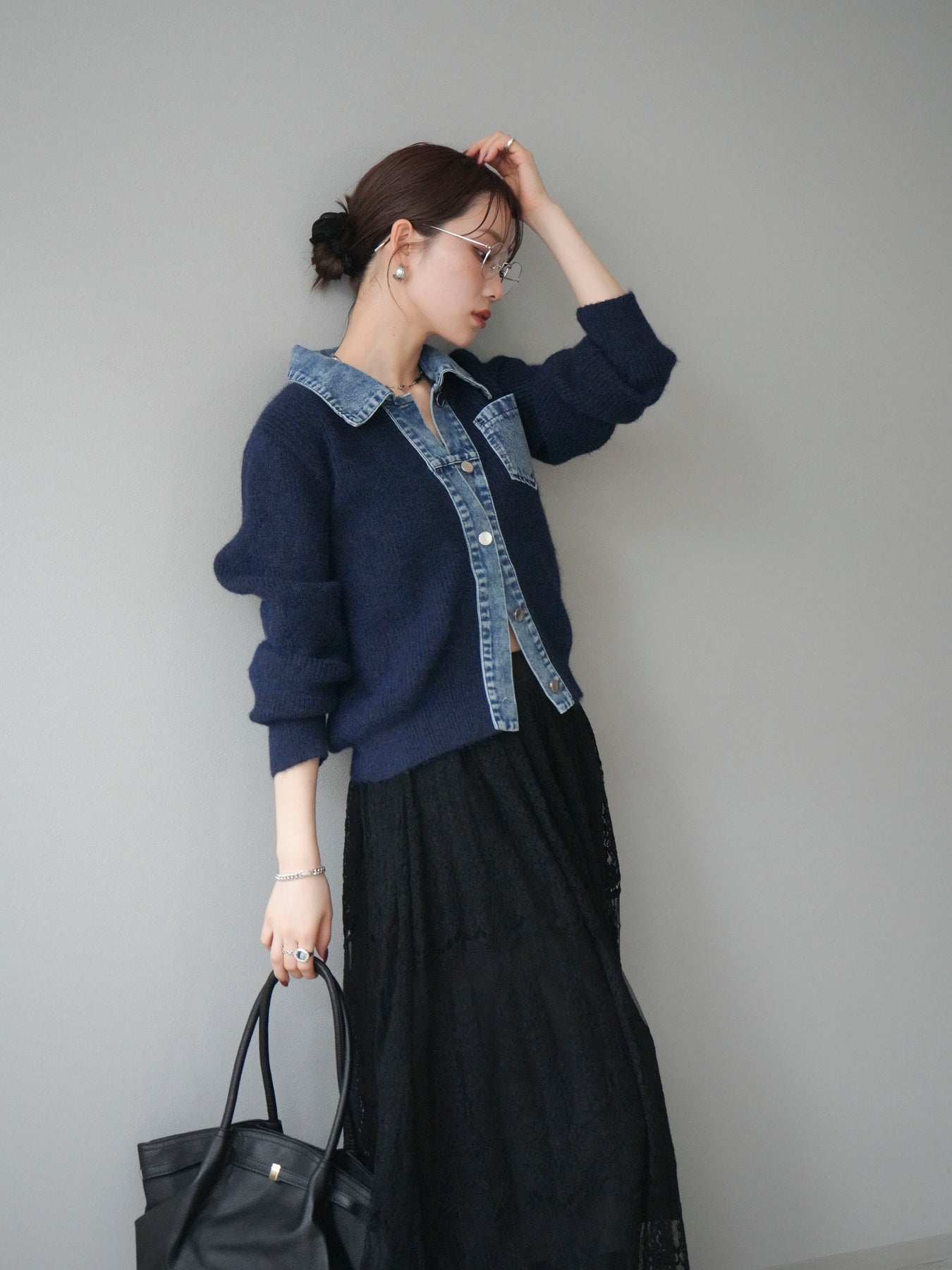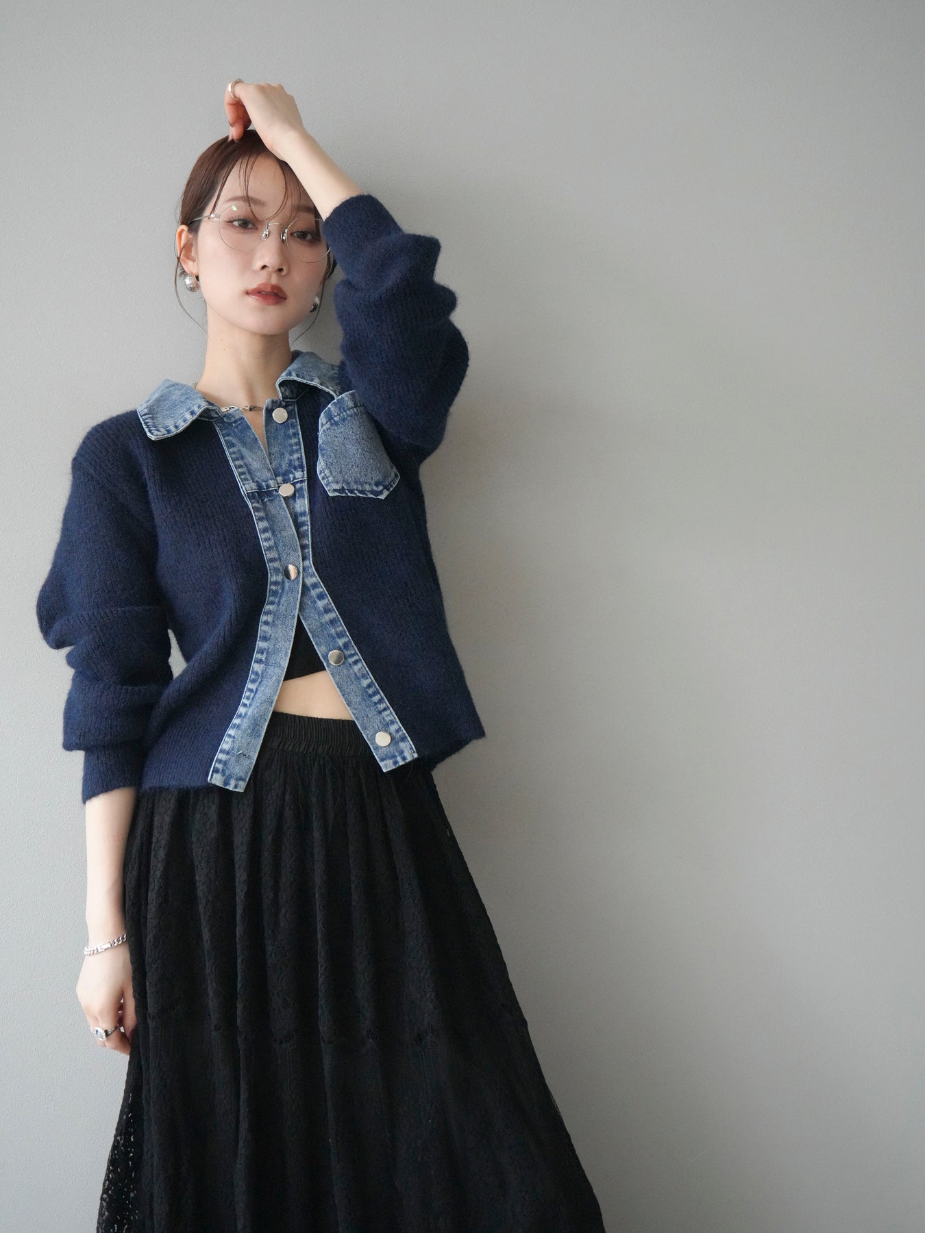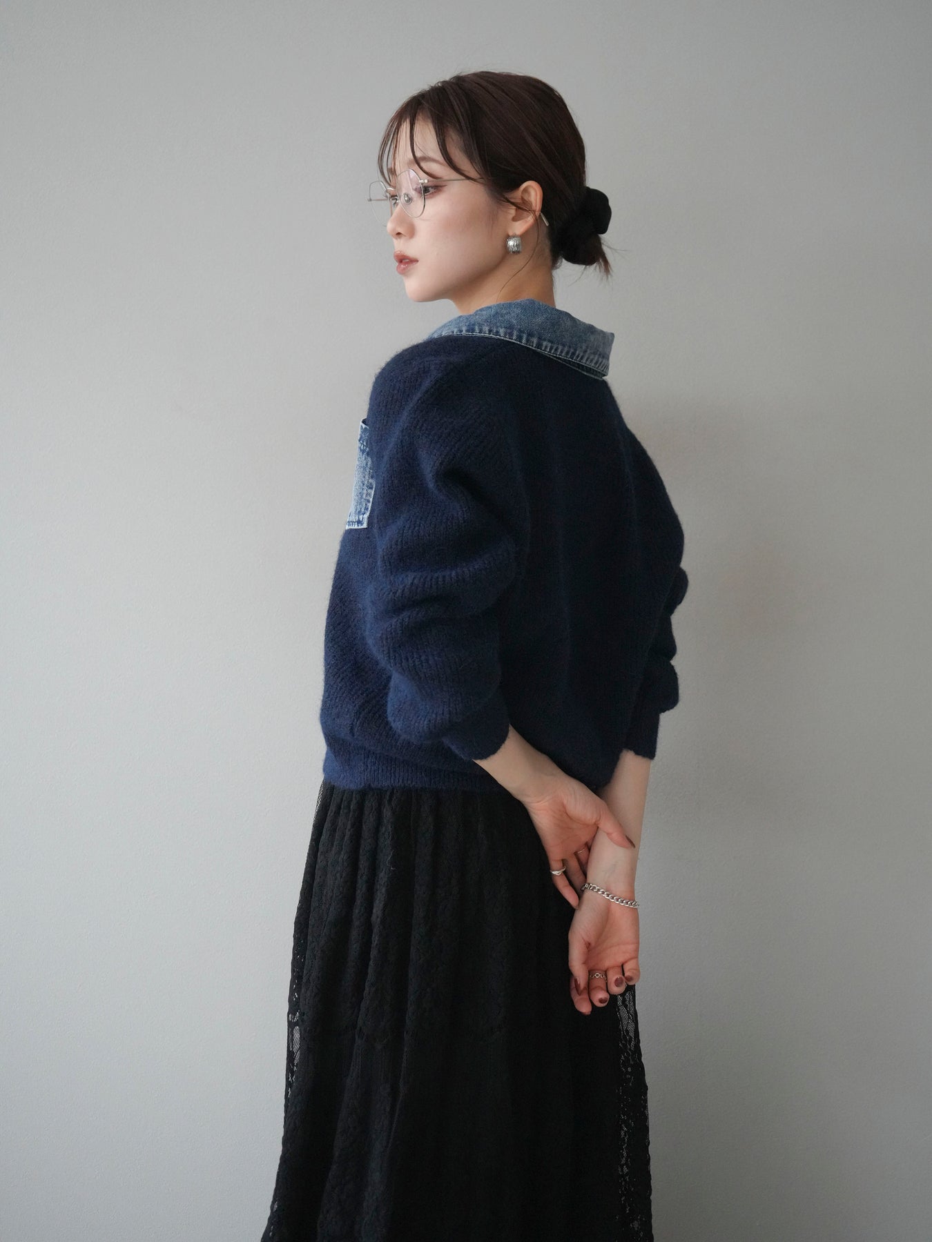 [予約]デニム襟ポケットニットカーディガン/navy