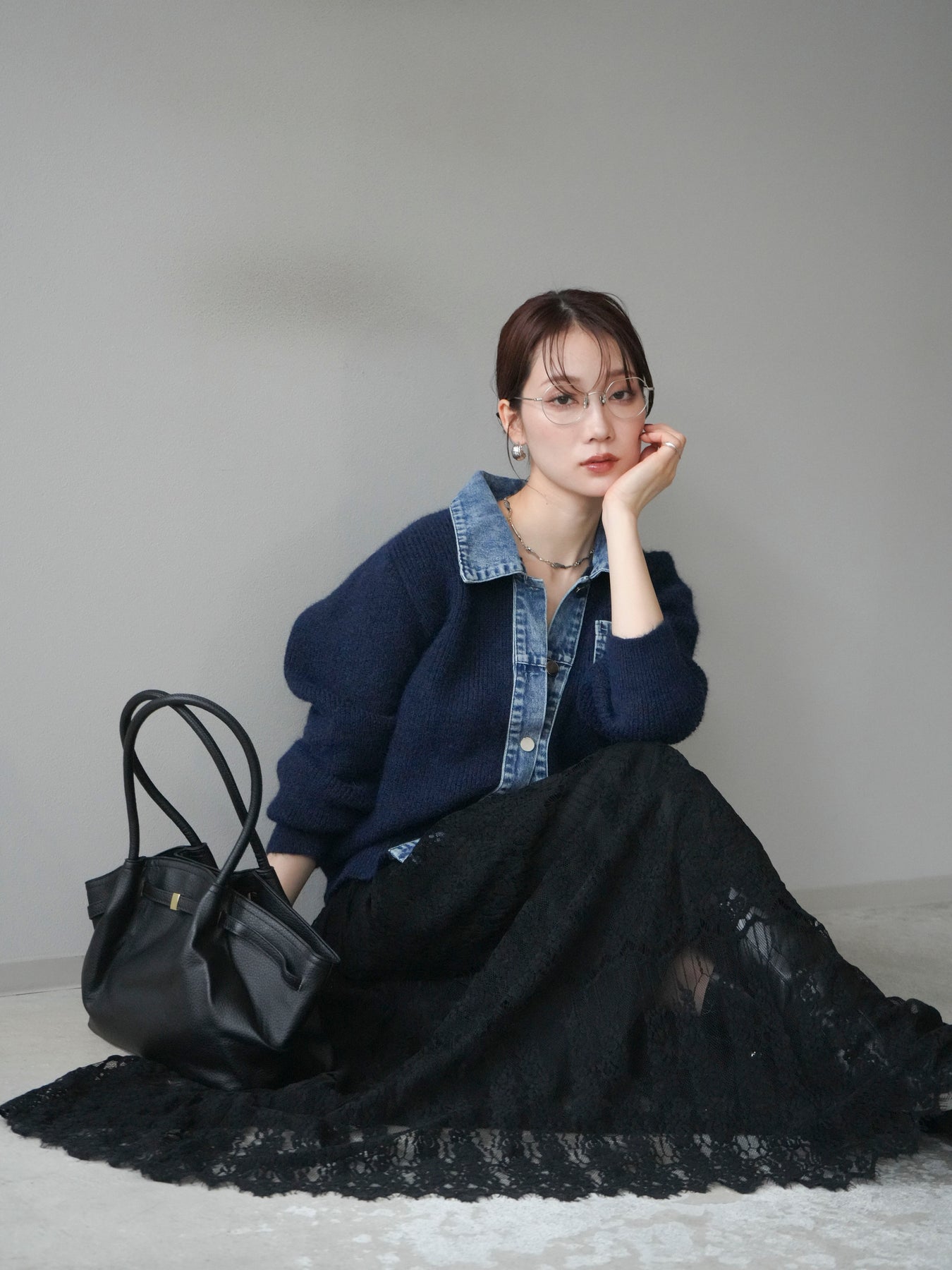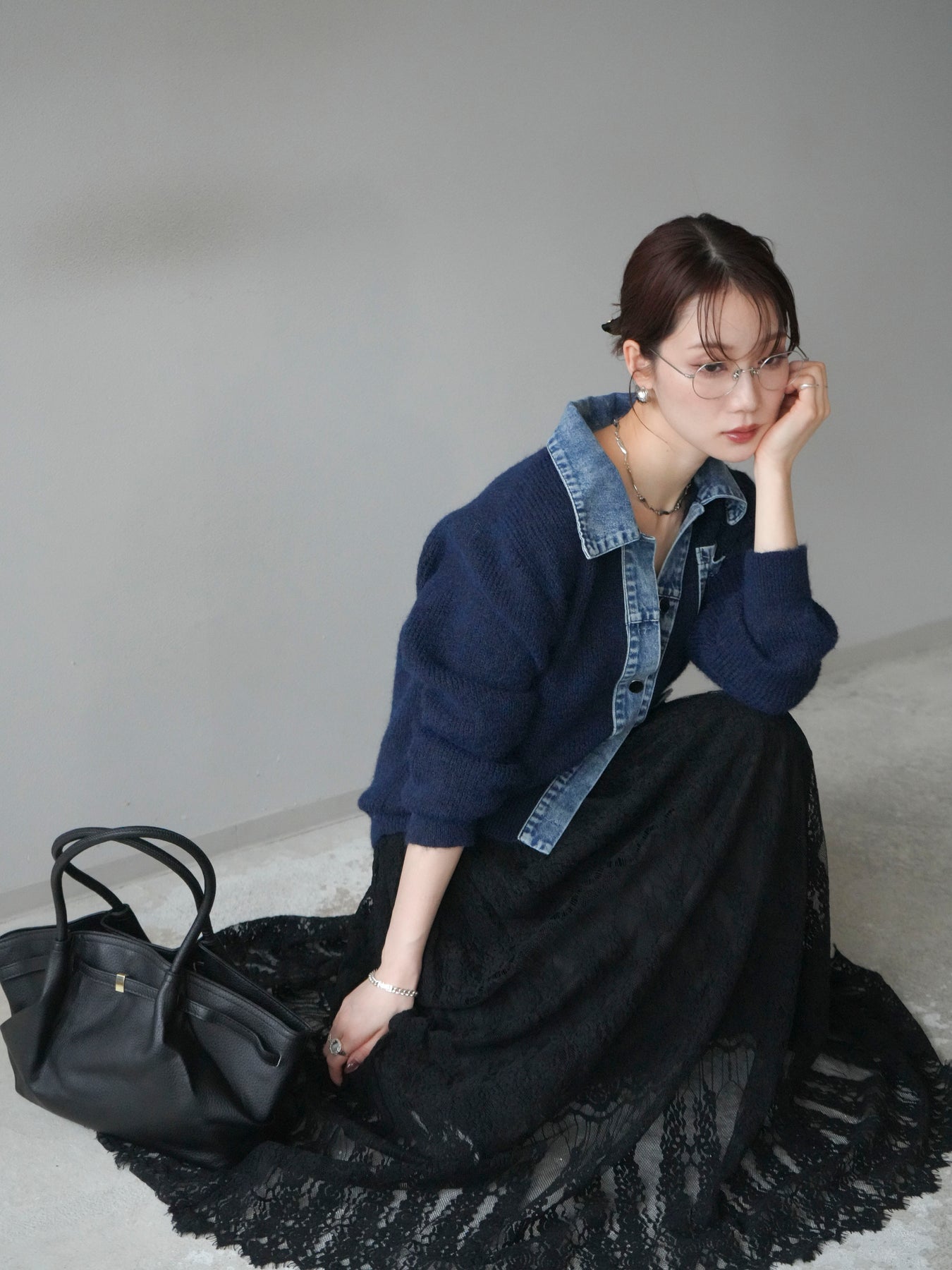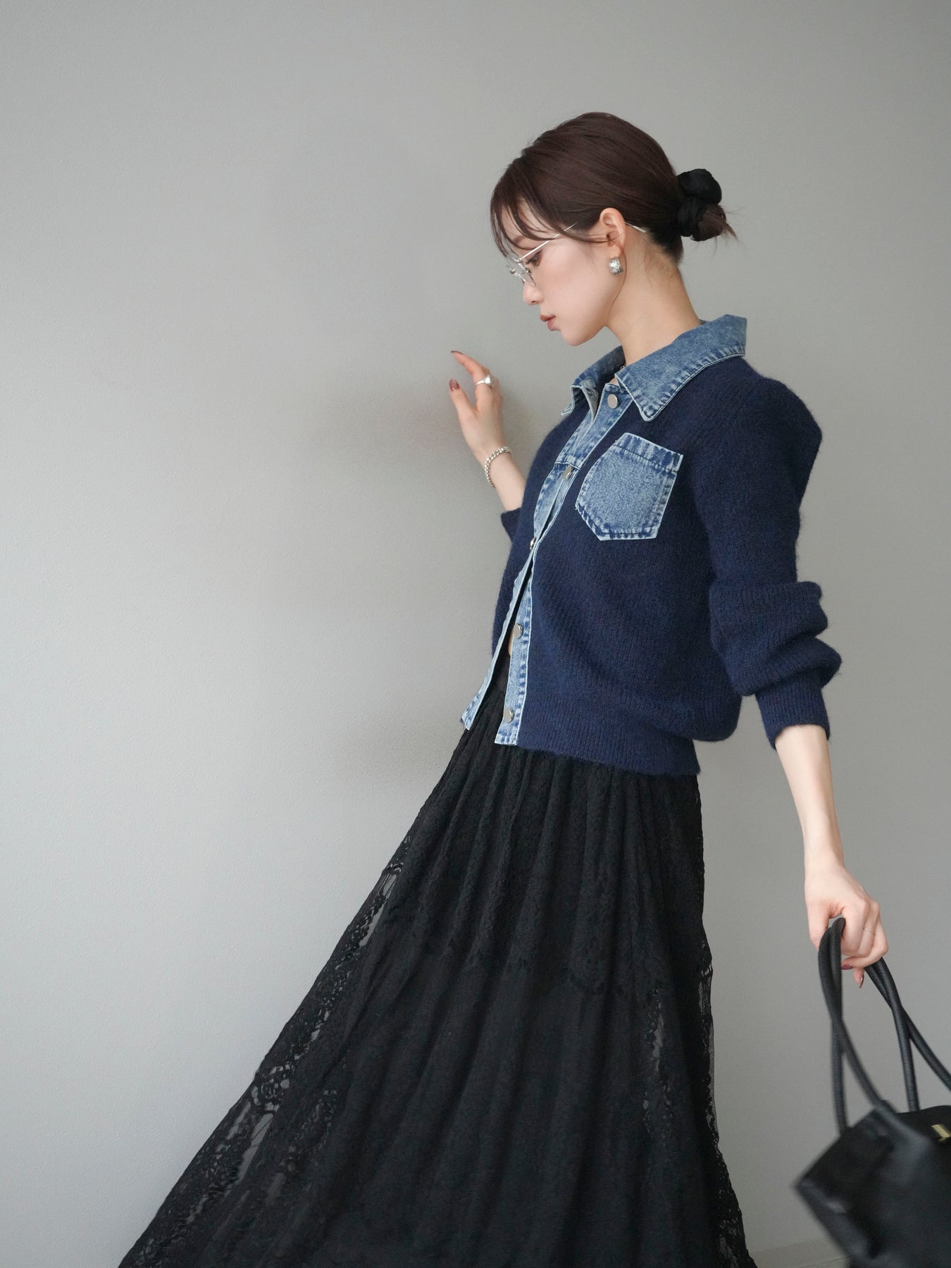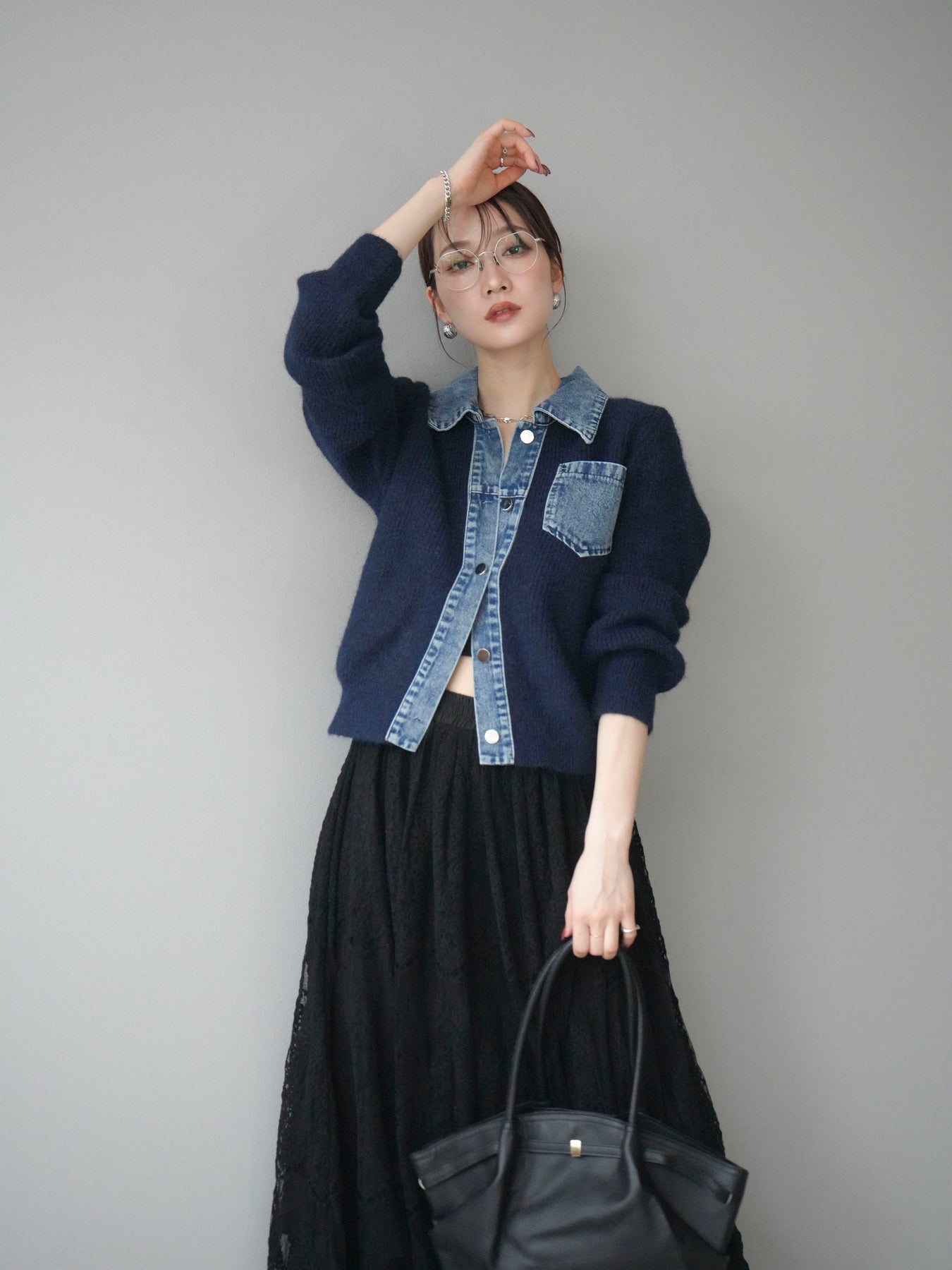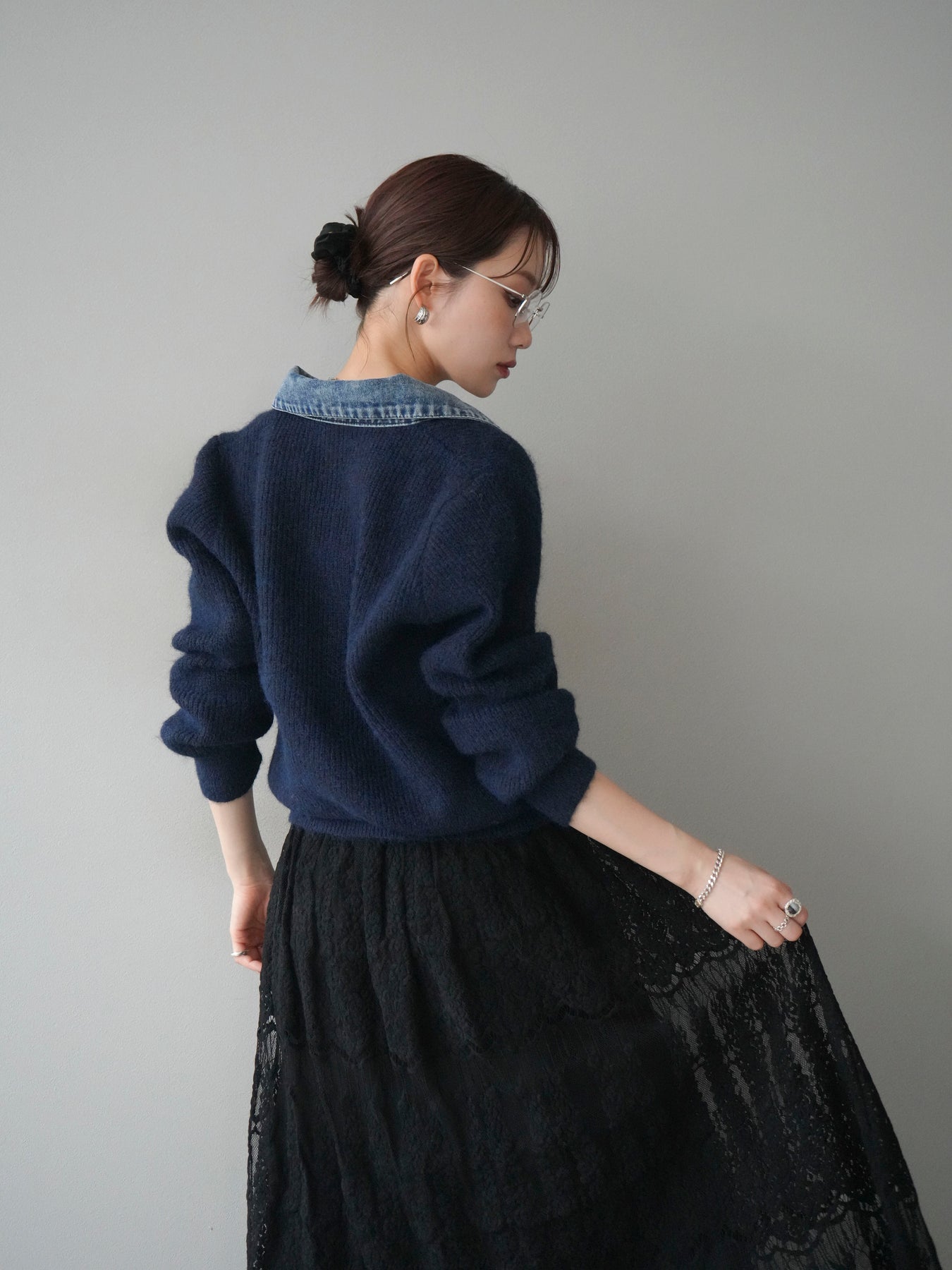 [予約]デニム襟ポケットニットカーディガン/navy