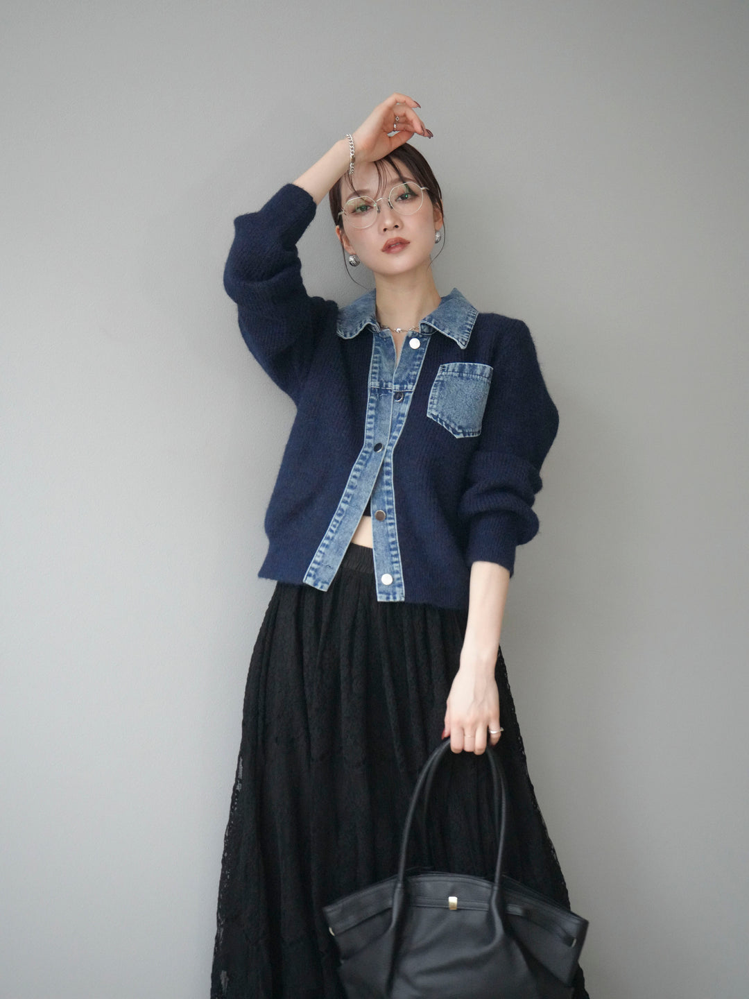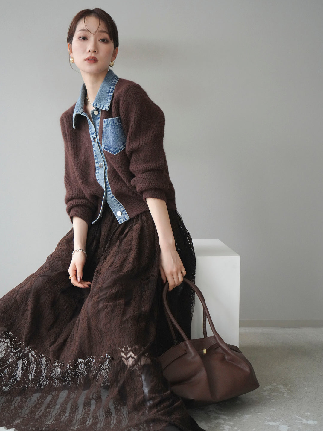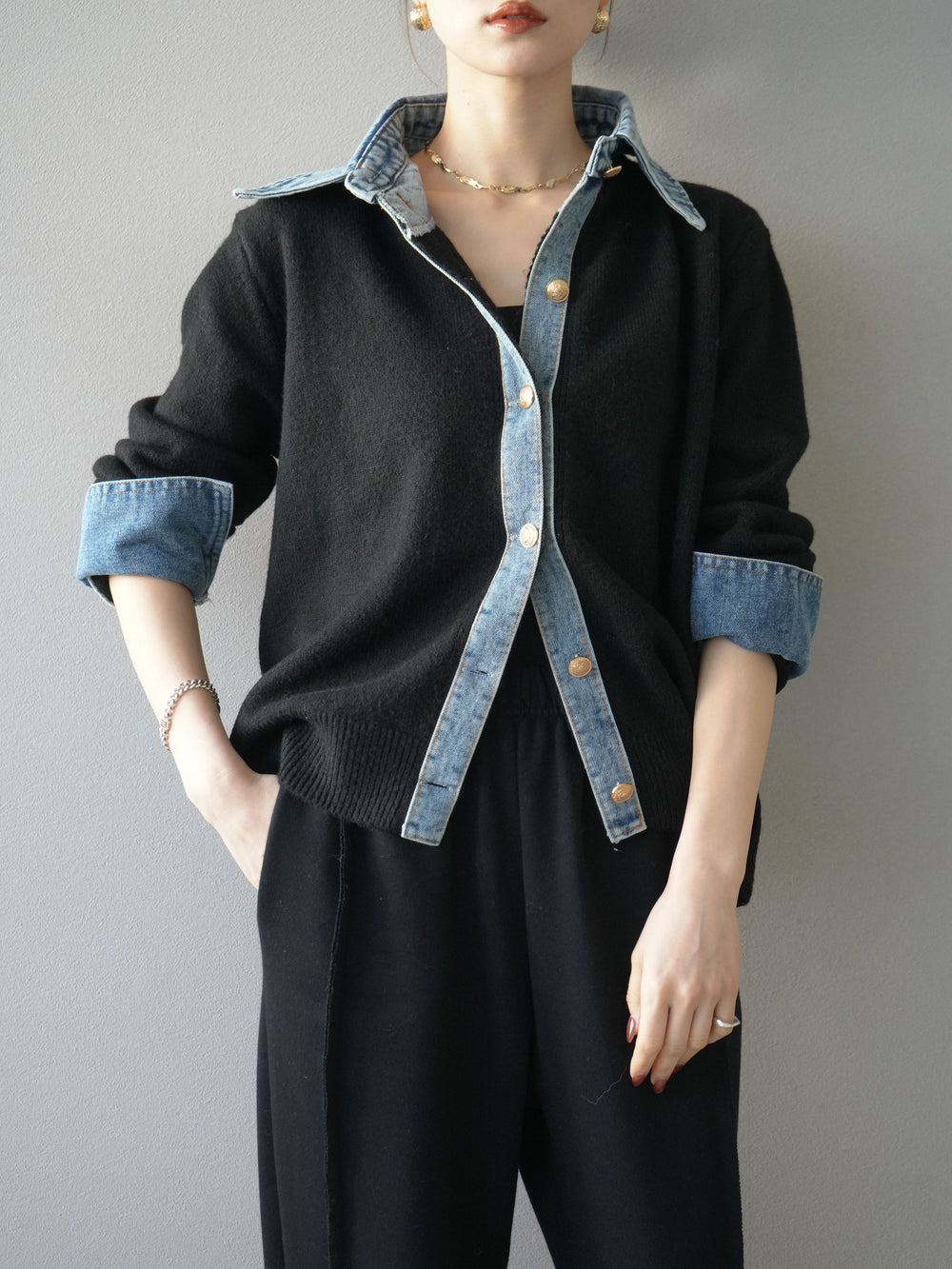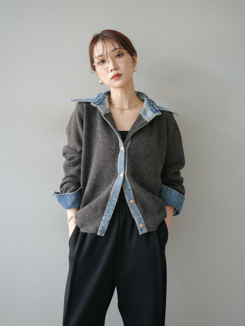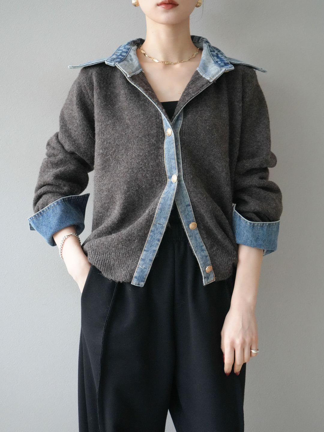 [予約]デニム襟ボタンニットカーディガン/darkbrown