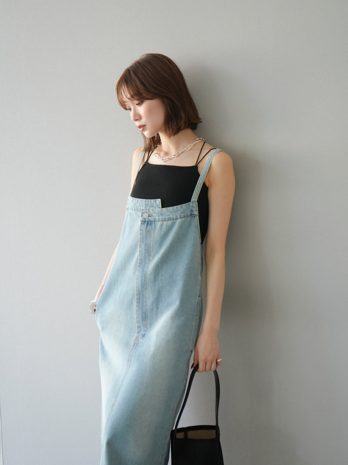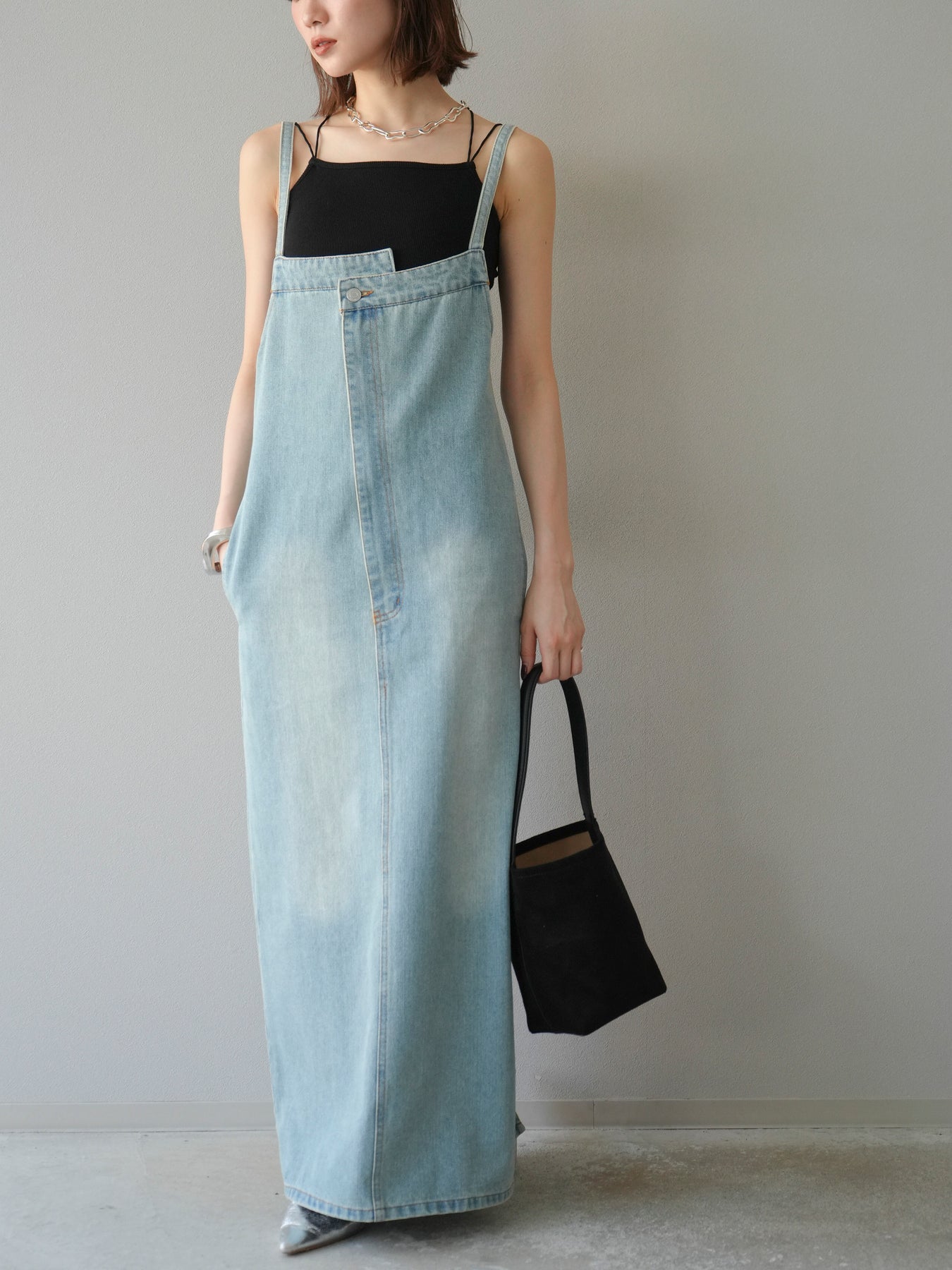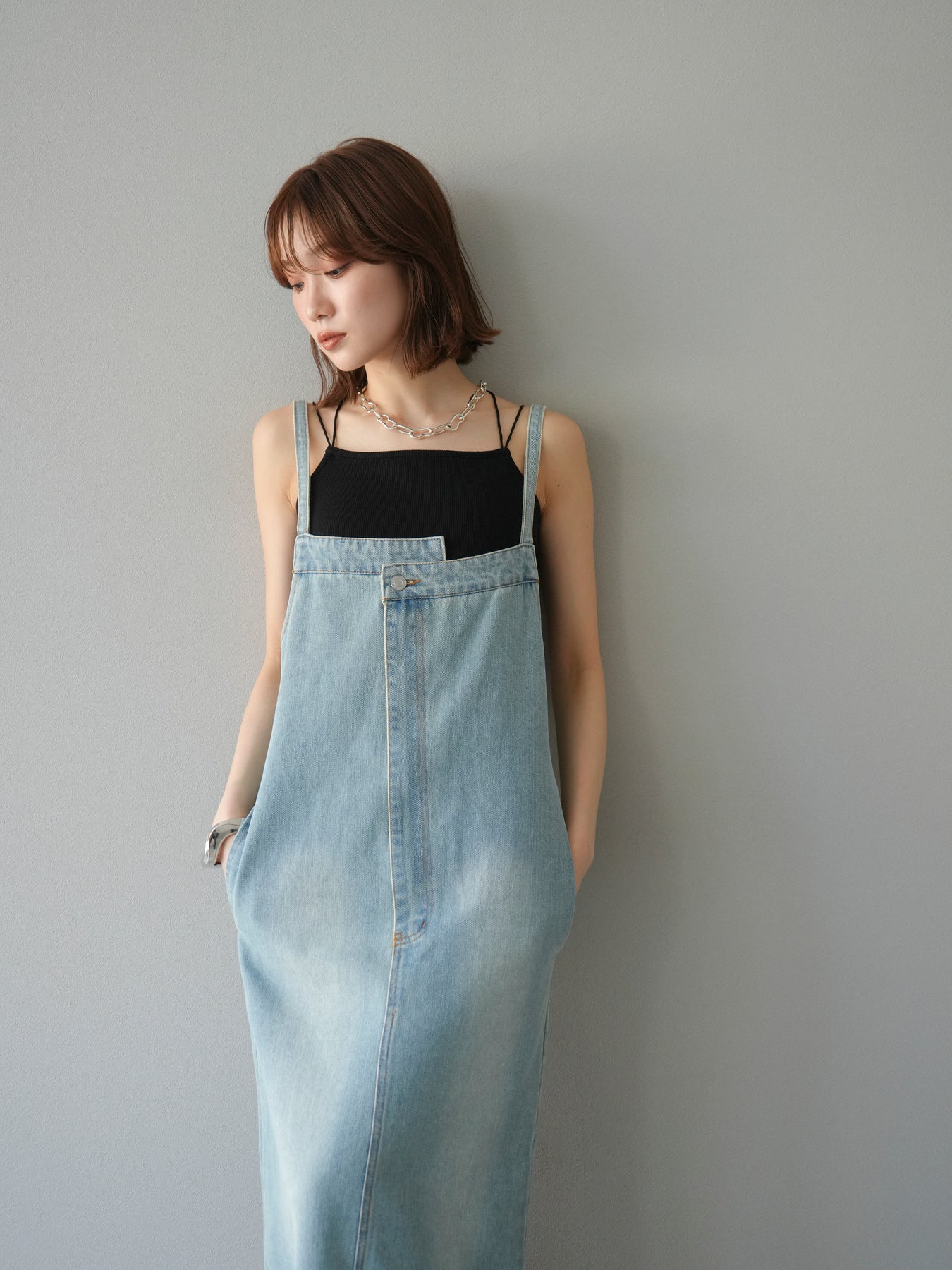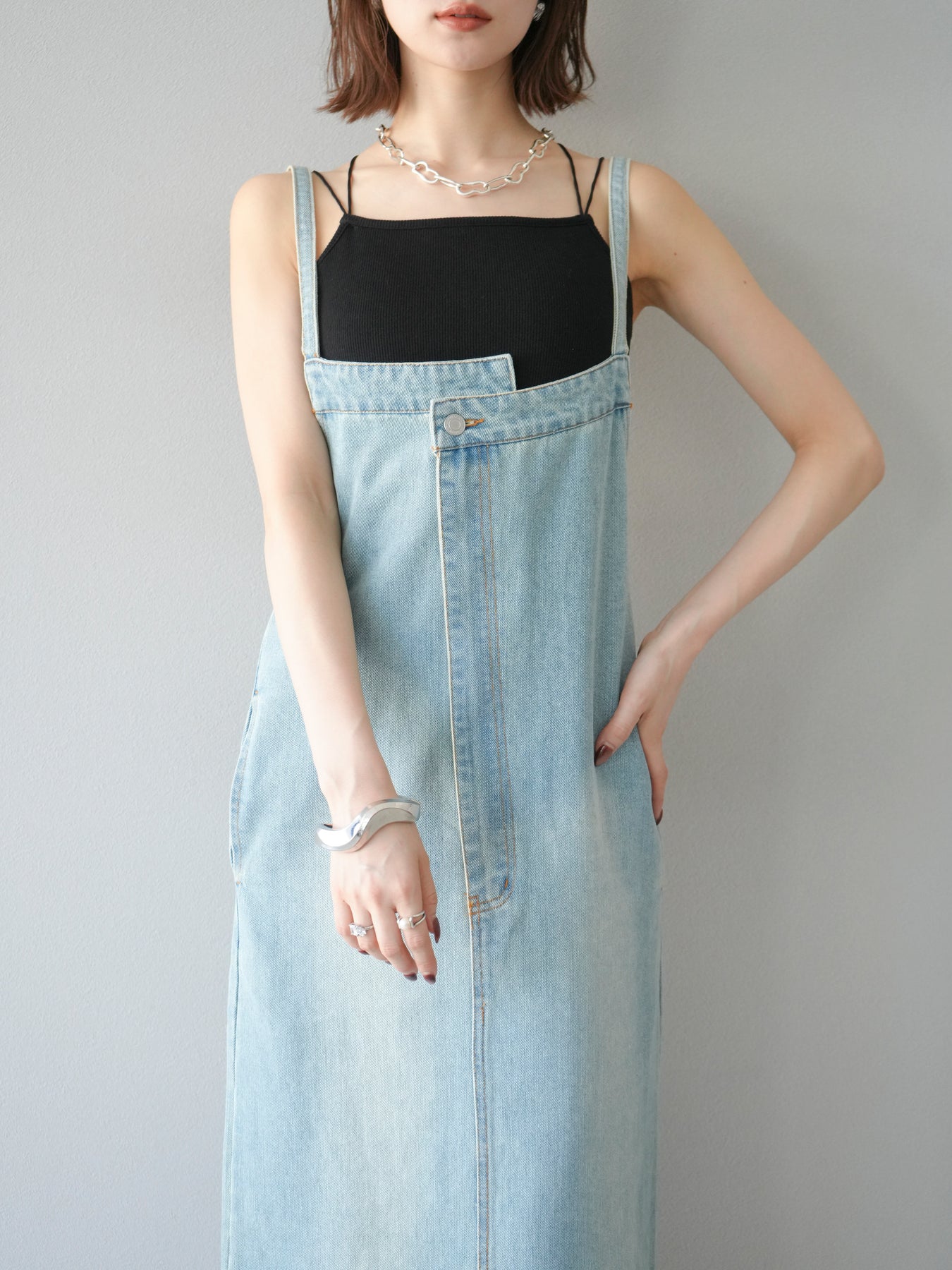 這款牛仔連身裙散發著精緻的氣息,肩帶和前襟處巧妙地融入了不對稱設計。直筒I字輪廓更顯修長。休閒的牛仔布料是其一大亮點,其設計營造出女性化、輕鬆隨興的造型。根據搭配的內搭,例如T卹、背心或透視上衣,它四季皆宜。它完美契合精緻休閒的造型,讓您一穿上便成為眾人矚目的焦點。 ※除下裝、吊帶背心(內衣)以外的商品均為標準品,不含內衣。