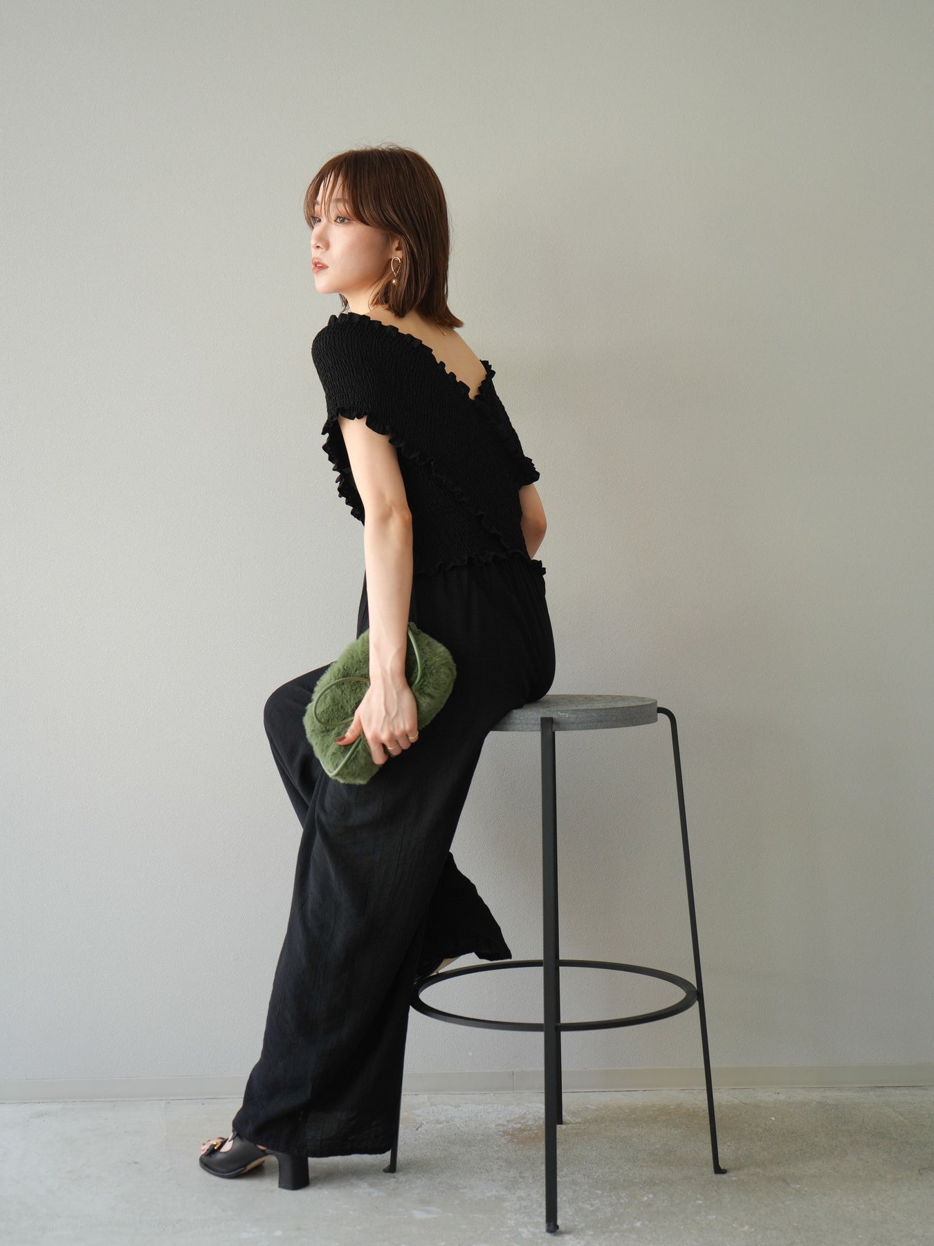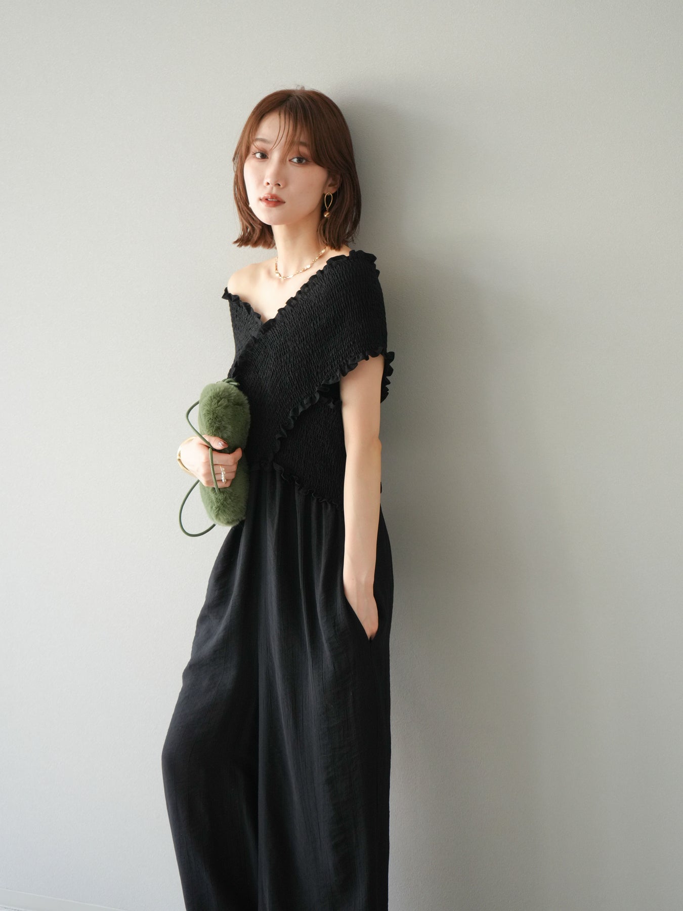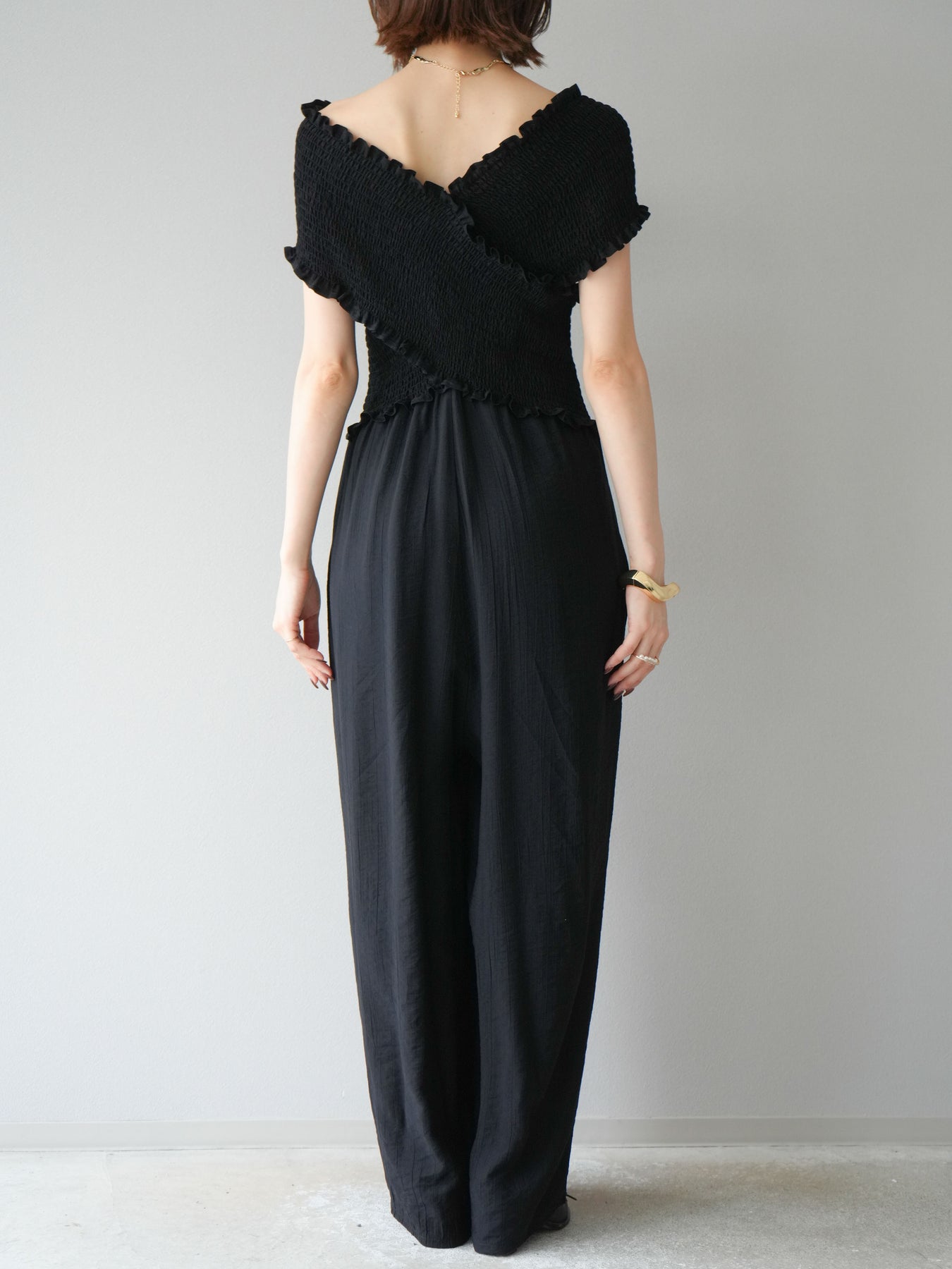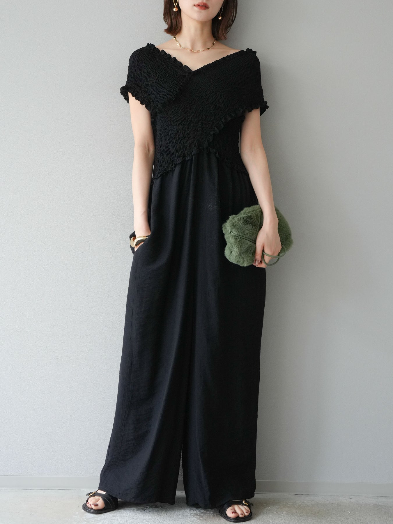 クロス状に切り替えたシャーリングデザインが目を惹くサロペット。 デコルテを美しく見せるオフショルダー風のネックラインが、女性らしさを引き立てます。 ボリューム感のあるパンツシルエットで、リラックス感と華やかさを両立。 一枚で着映えする存在感のあるデザインで、夏のお出かけシーンにもおすすめのアイテムです。