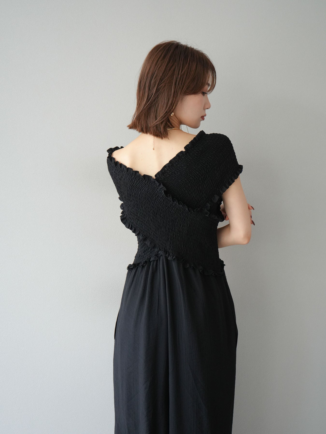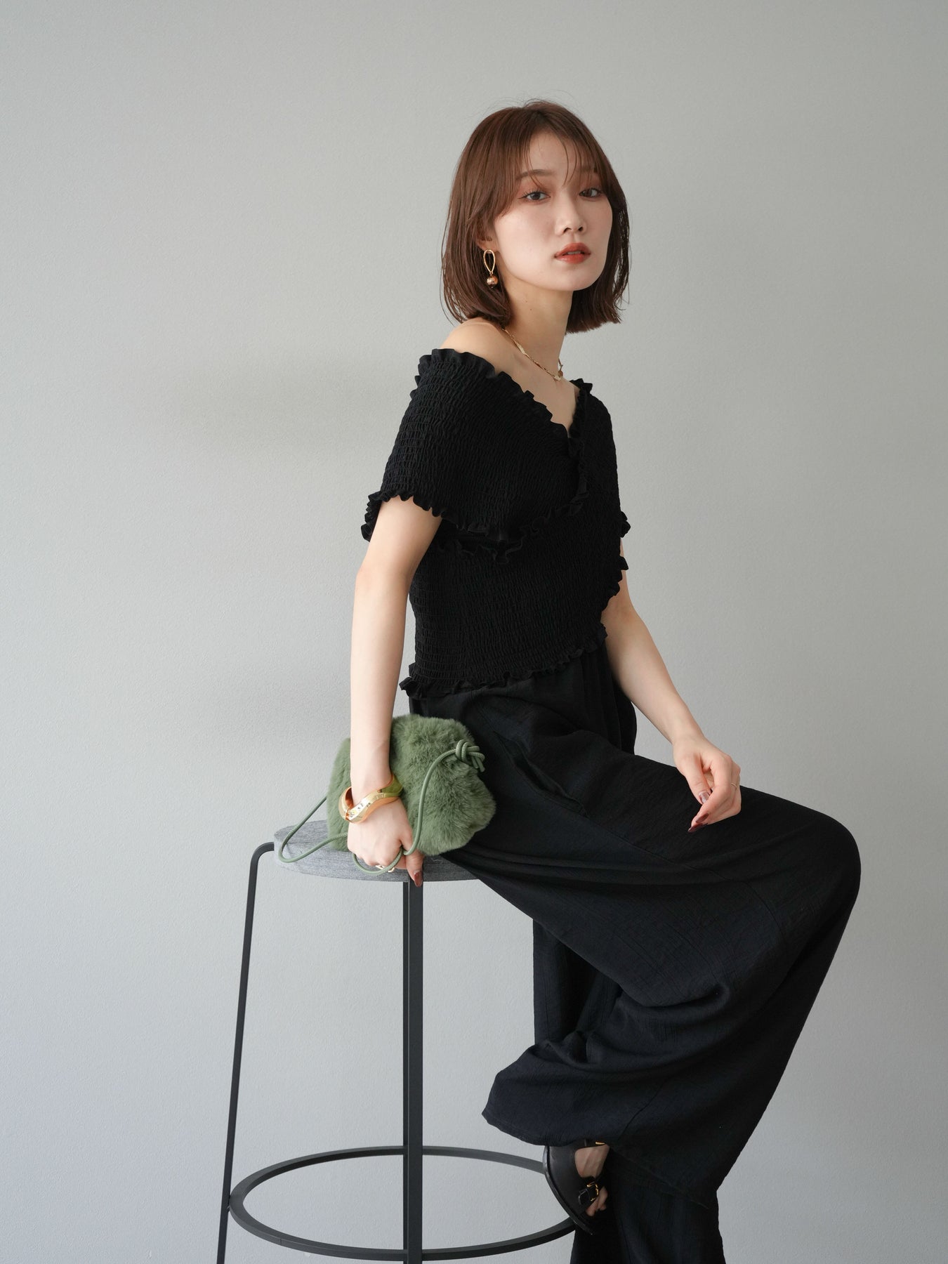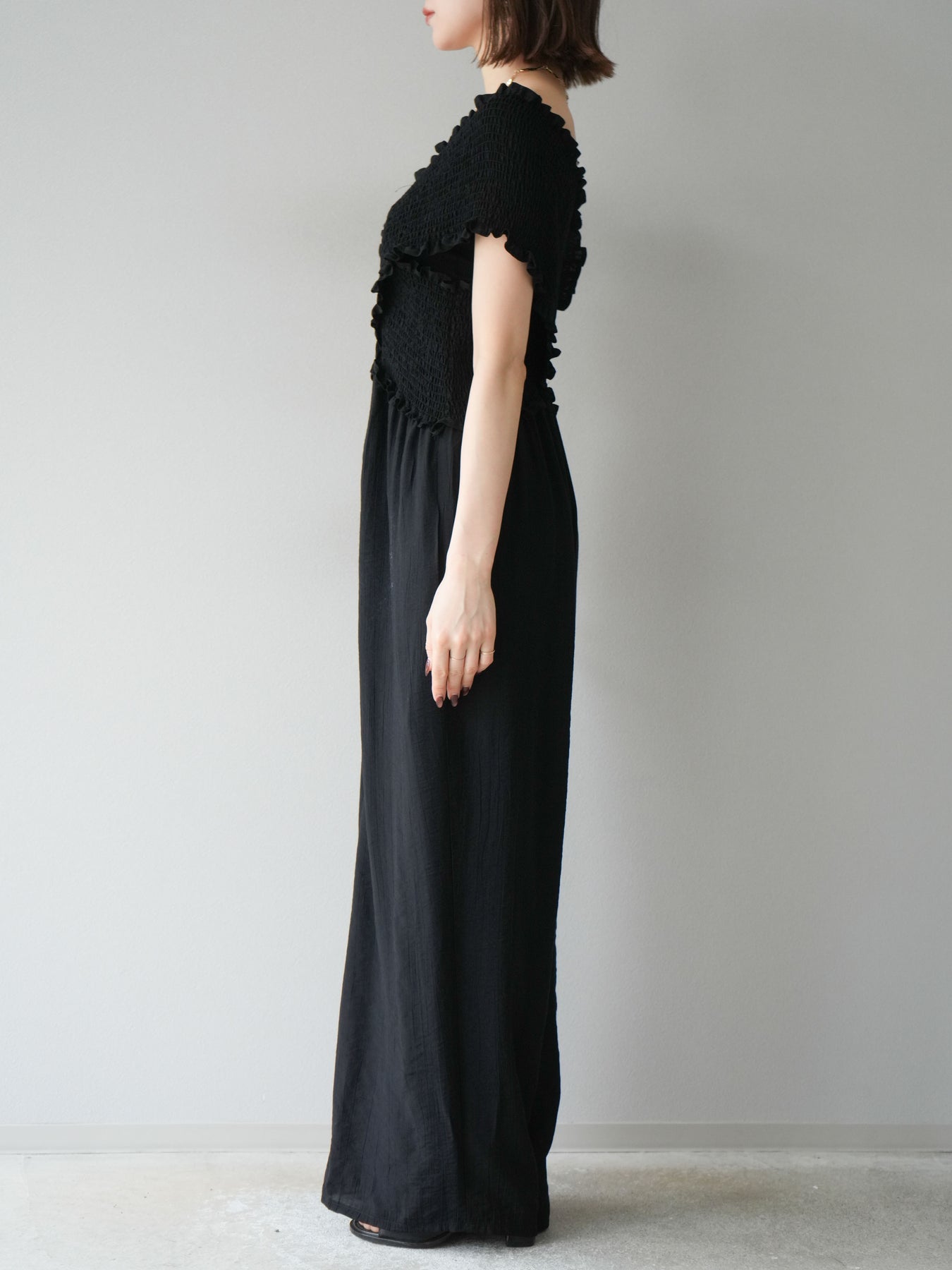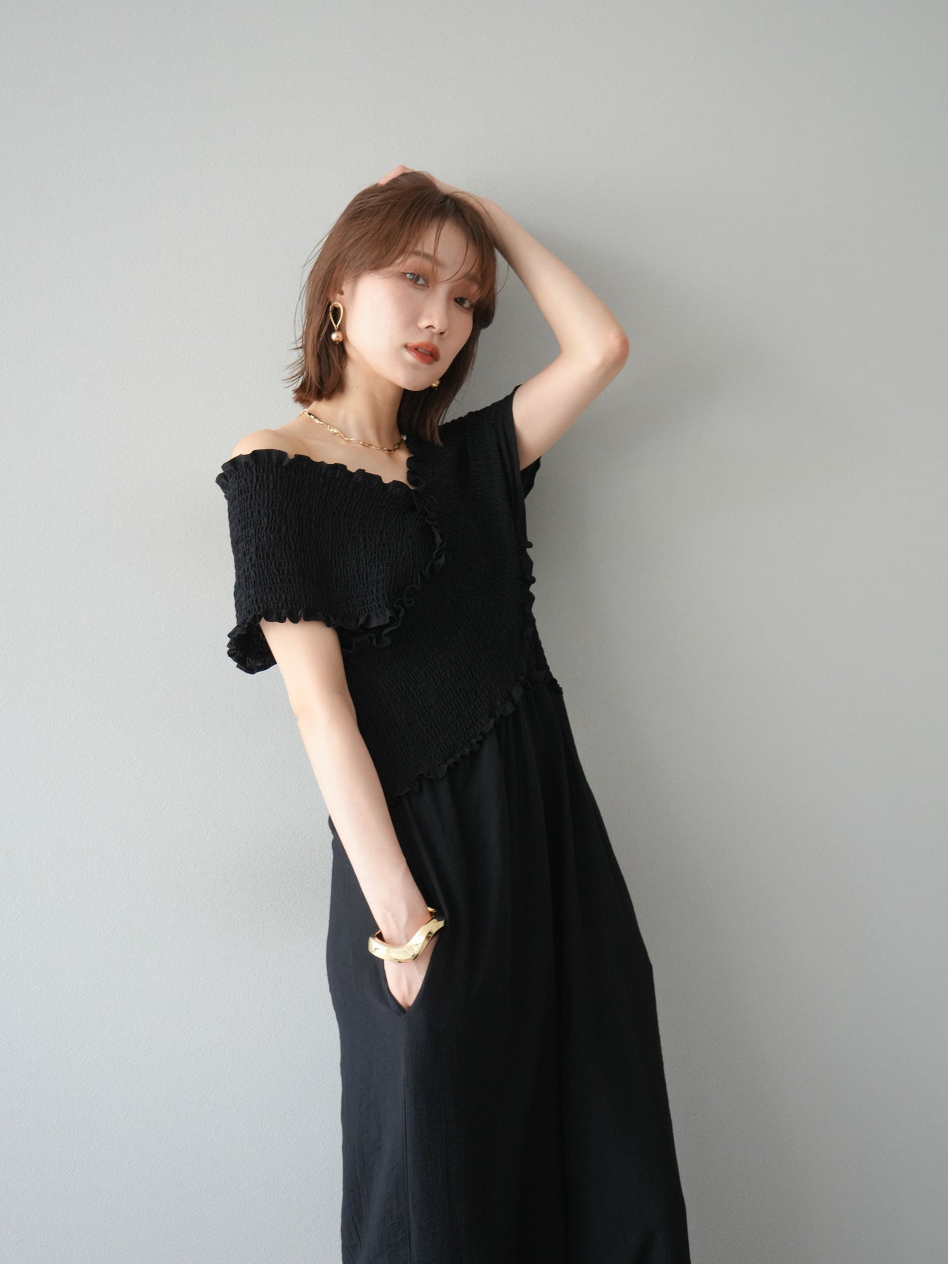 クロス状に切り替えたシャーリングデザインが目を惹くサロペット。 デコルテを美しく見せるオフショルダー風のネックラインが、女性らしさを引き立てます。 ボリューム感のあるパンツシルエットで、リラックス感と華やかさを両立。 一枚で着映えする存在感のあるデザインで、夏のお出かけシーンにもおすすめのアイテムです。