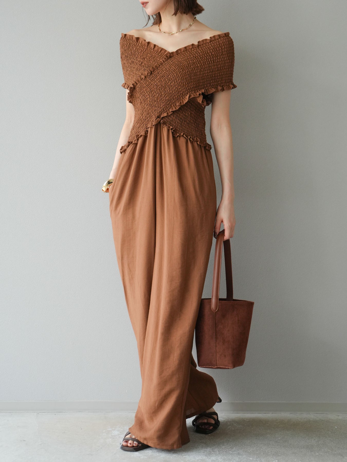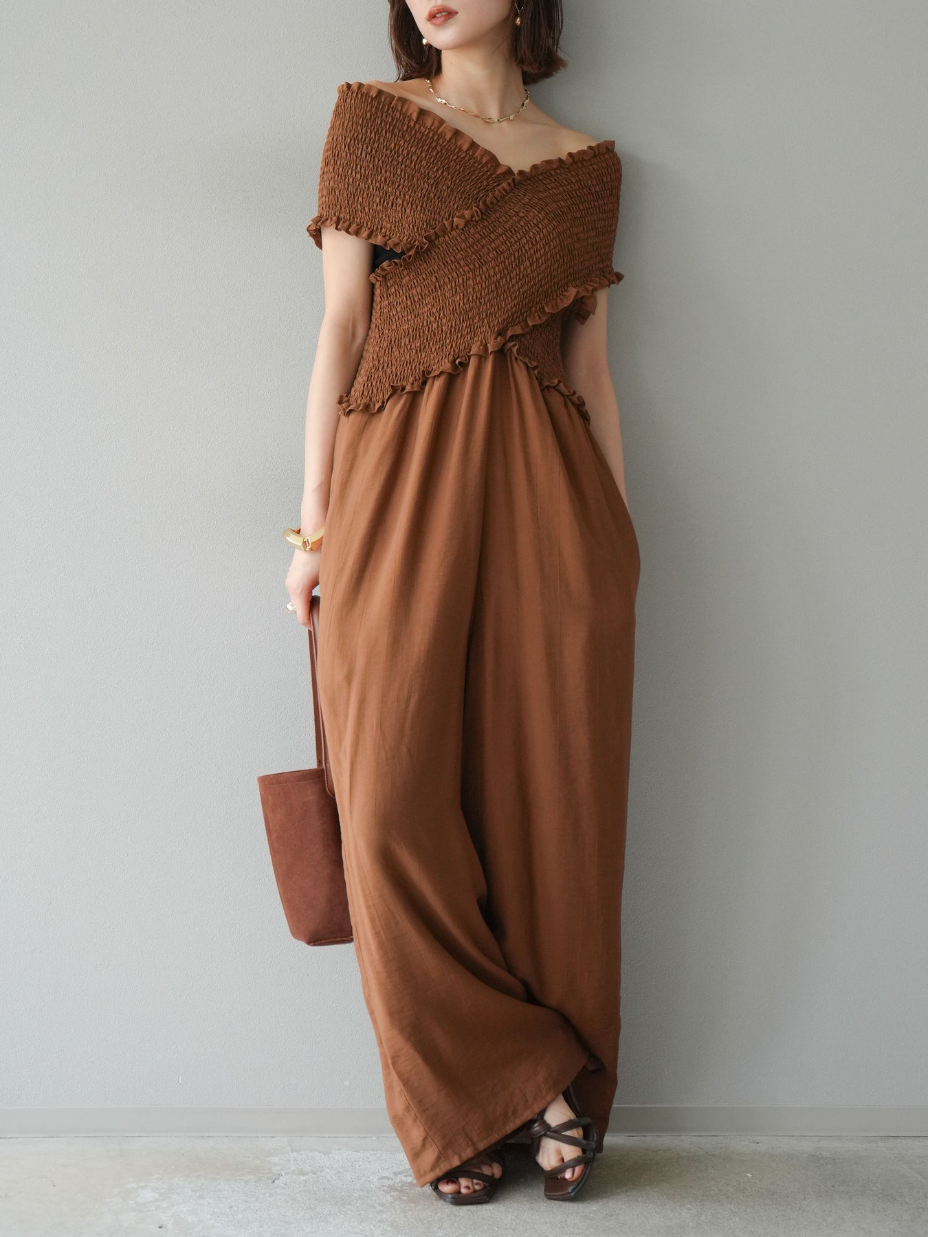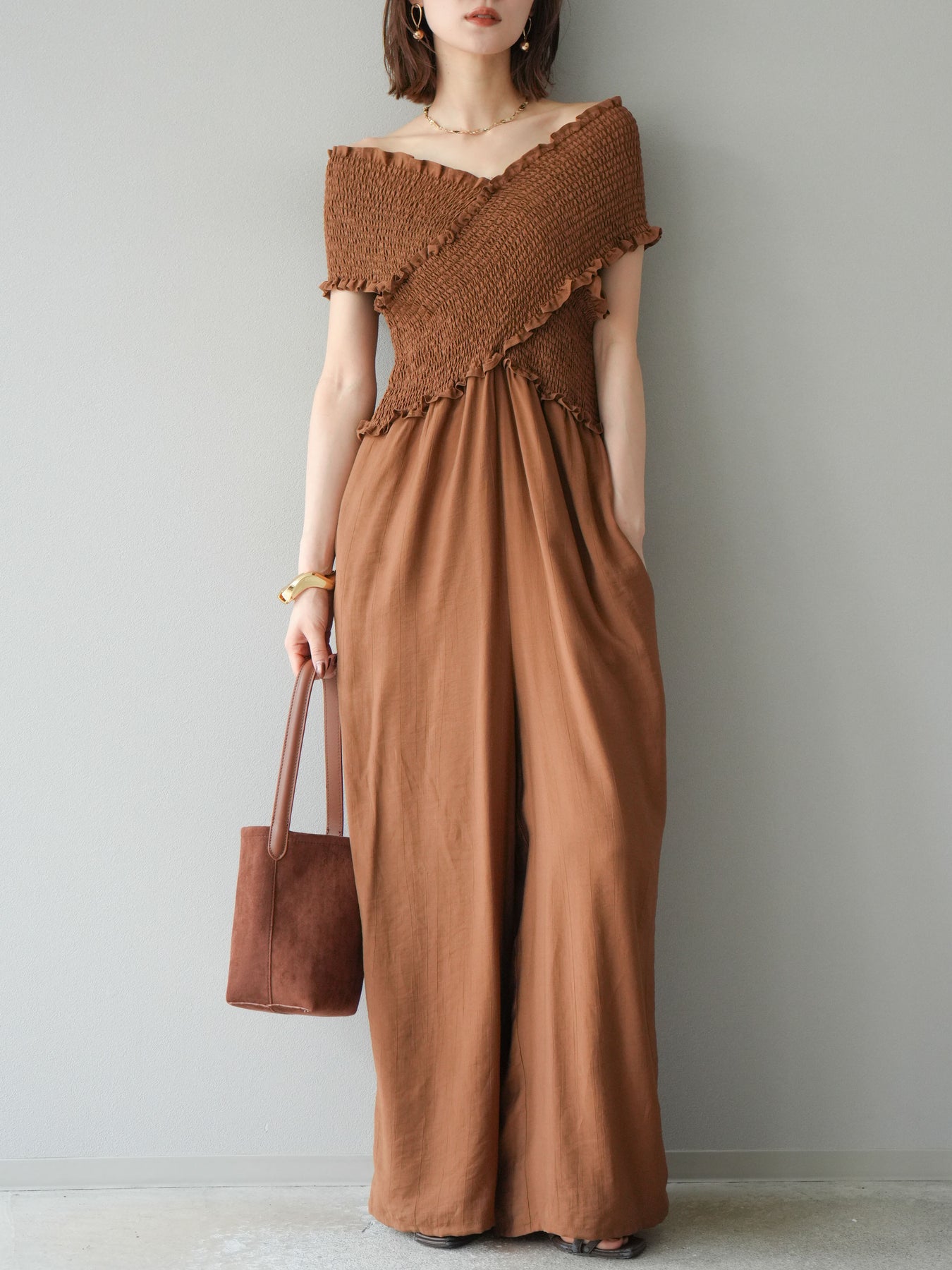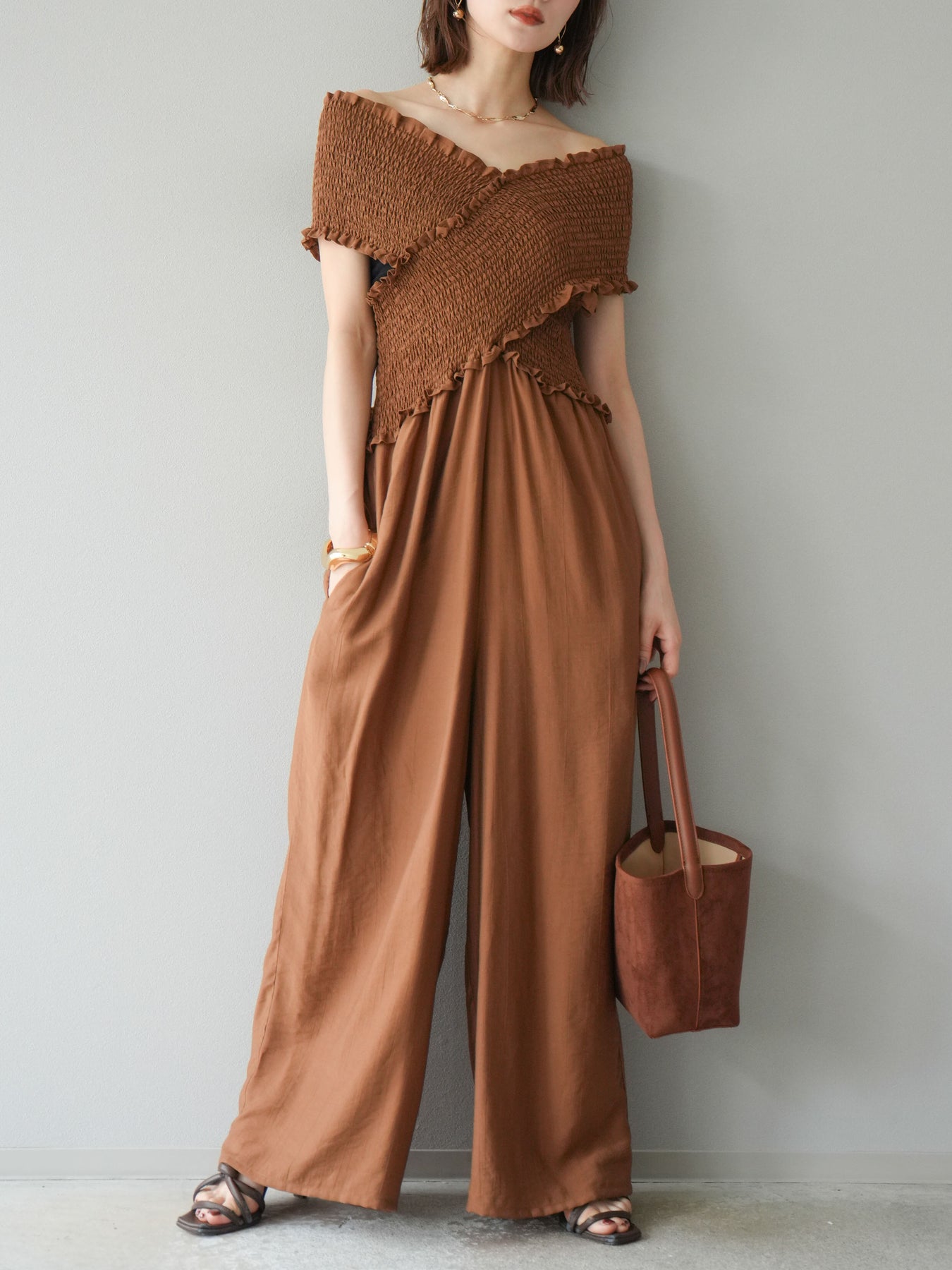 クロス状に切り替えたシャーリングデザインが目を惹くサロペット。 デコルテを美しく見せるオフショルダー風のネックラインが、女性らしさを引き立てます。 ボリューム感のあるパンツシルエットで、リラックス感と華やかさを両立。 一枚で着映えする存在感のあるデザインで、夏のお出かけシーンにもおすすめのアイテムです。