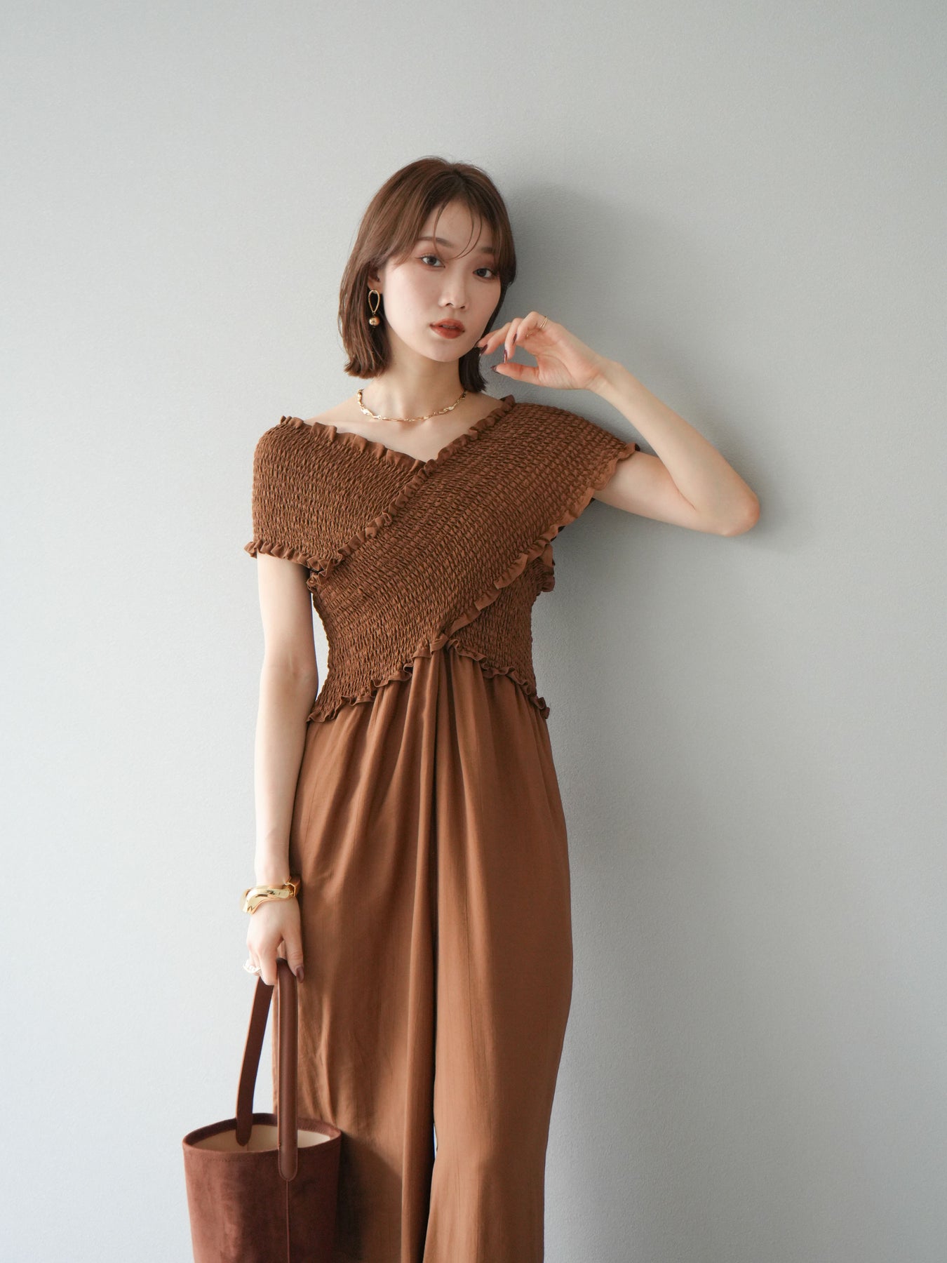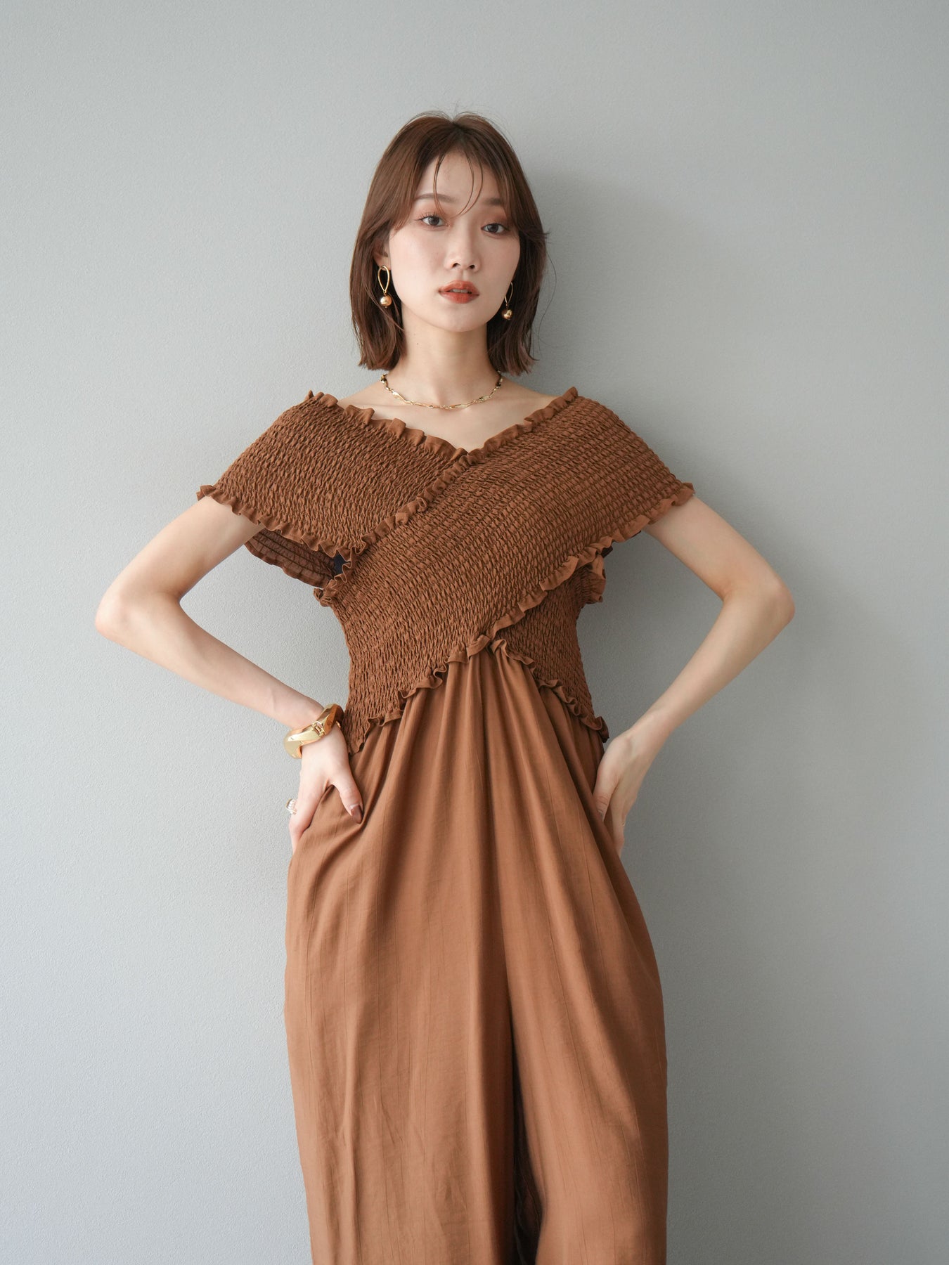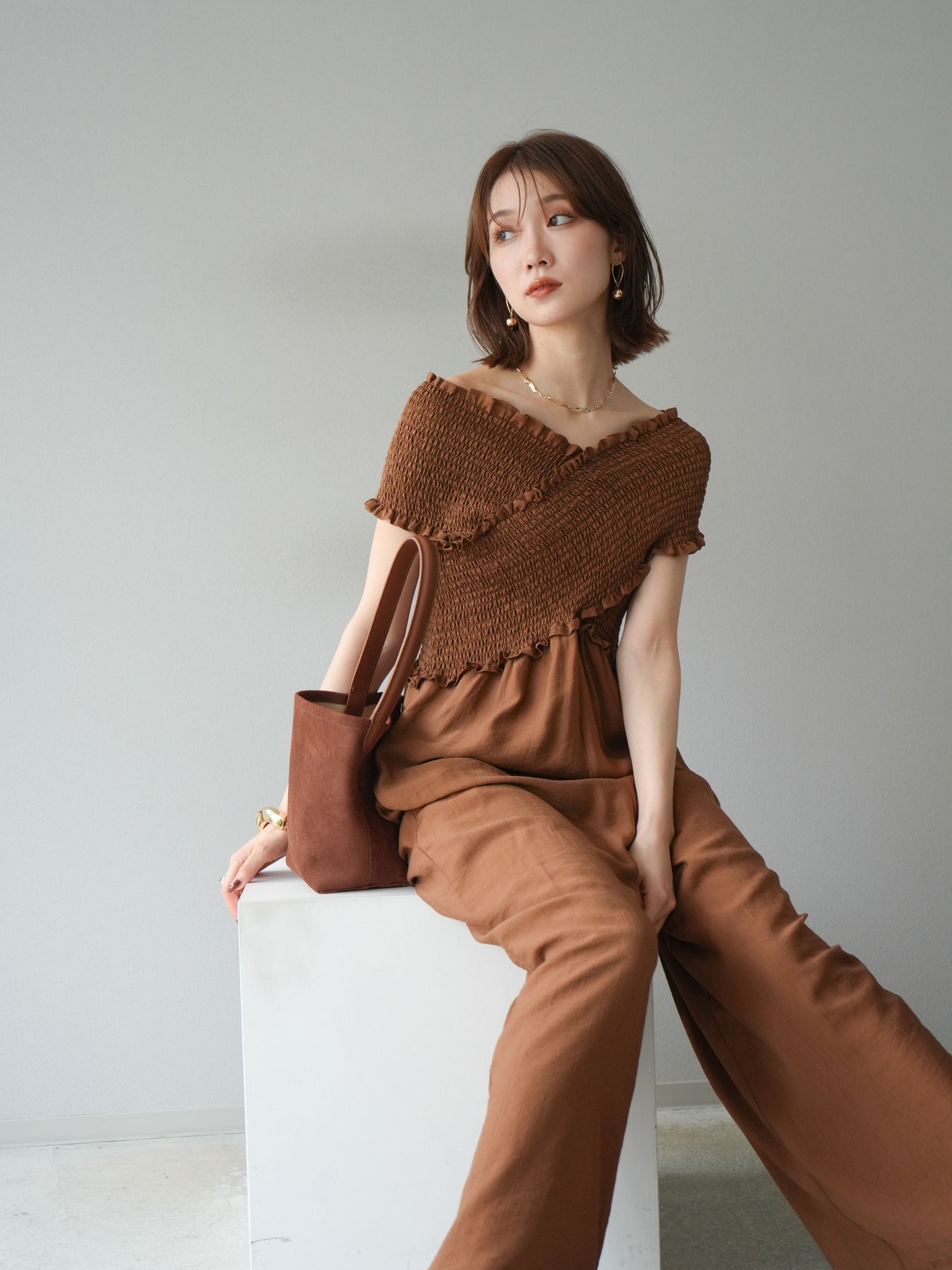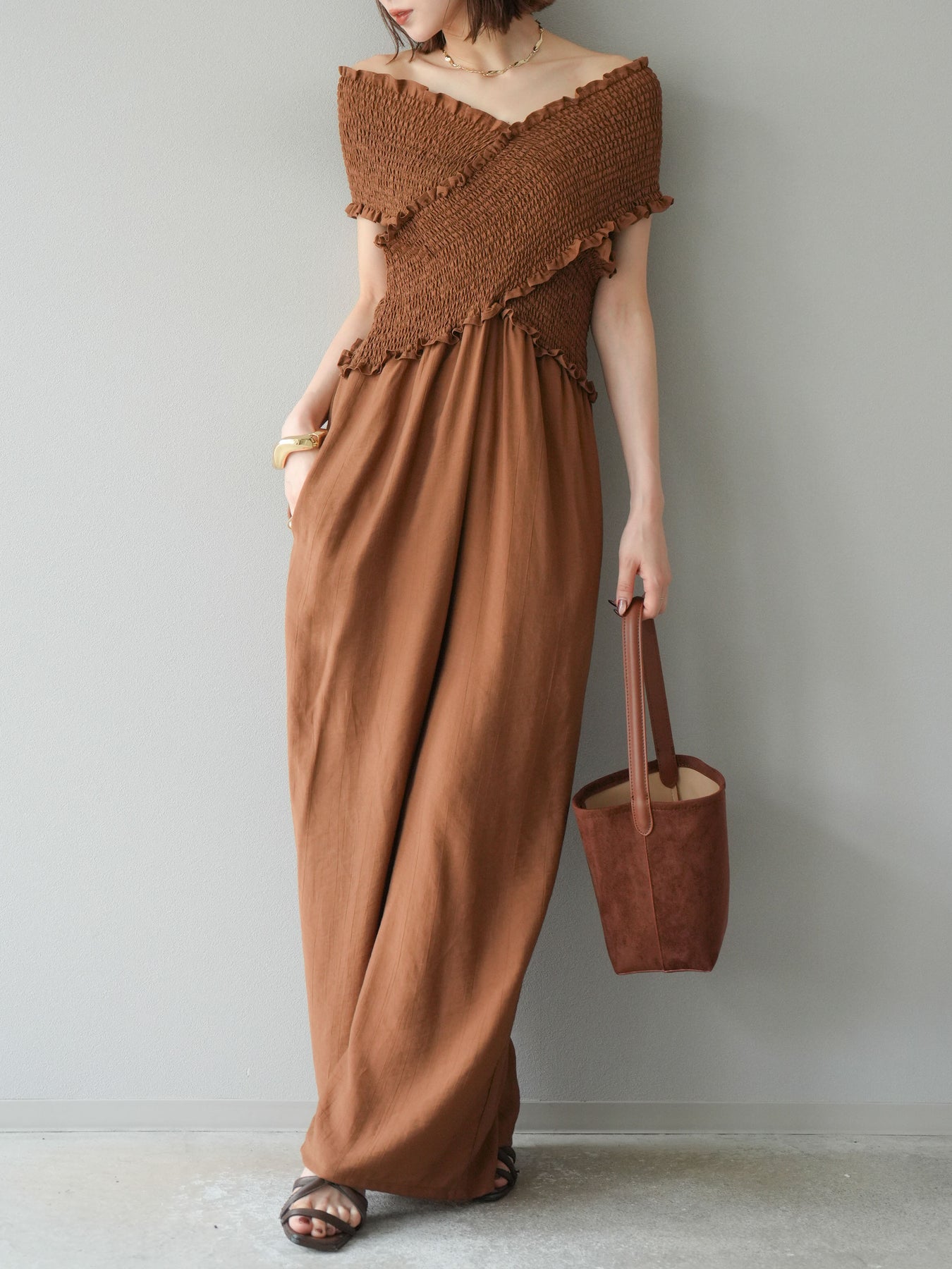 クロス状に切り替えたシャーリングデザインが目を惹くサロペット。 デコルテを美しく見せるオフショルダー風のネックラインが、女性らしさを引き立てます。 ボリューム感のあるパンツシルエットで、リラックス感と華やかさを両立。 一枚で着映えする存在感のあるデザインで、夏のお出かけシーンにもおすすめのアイテムです。