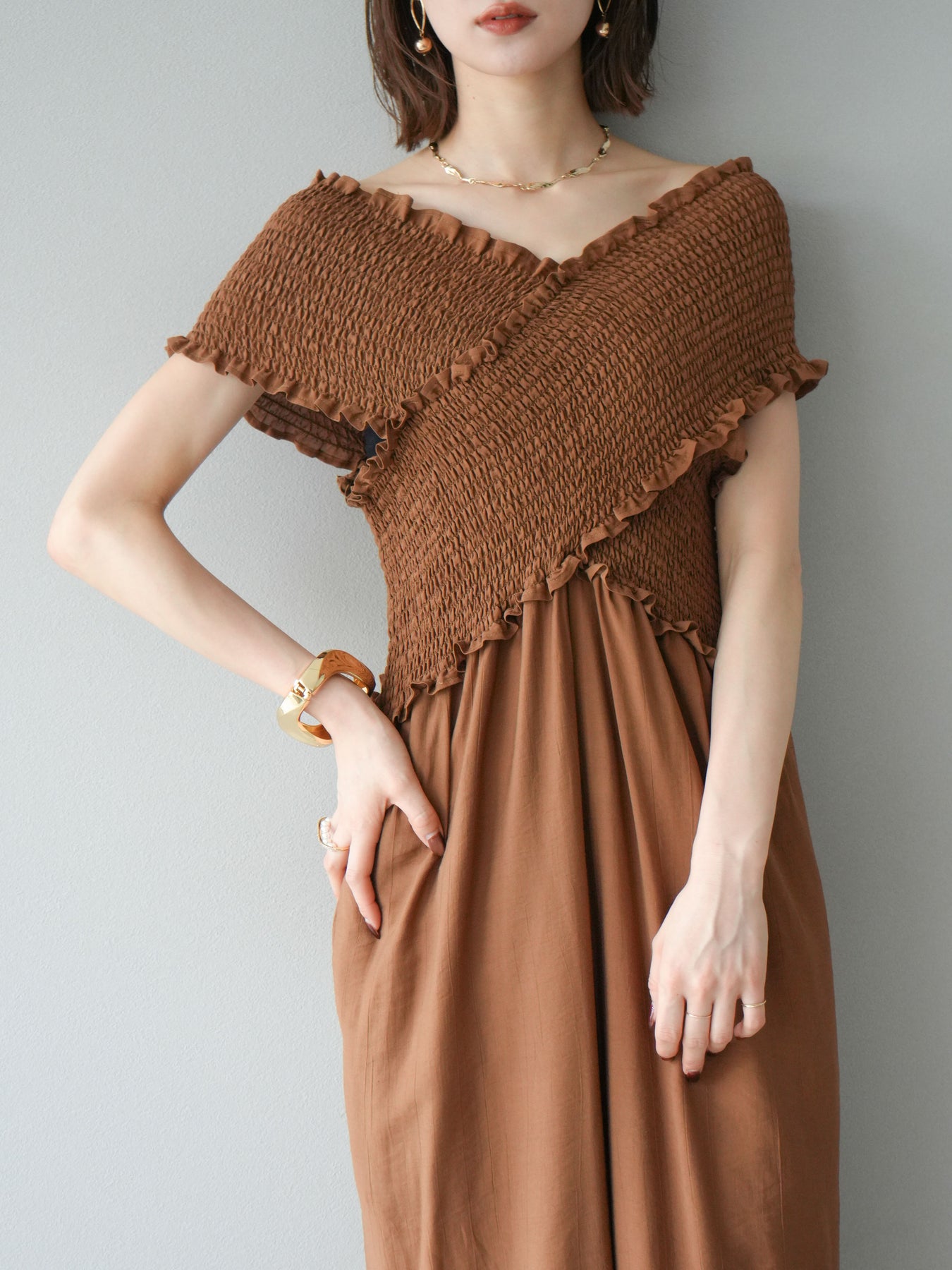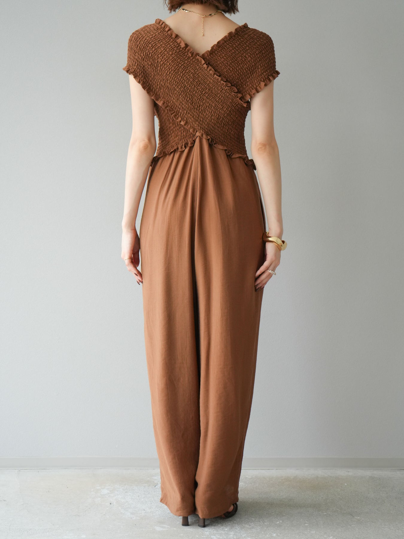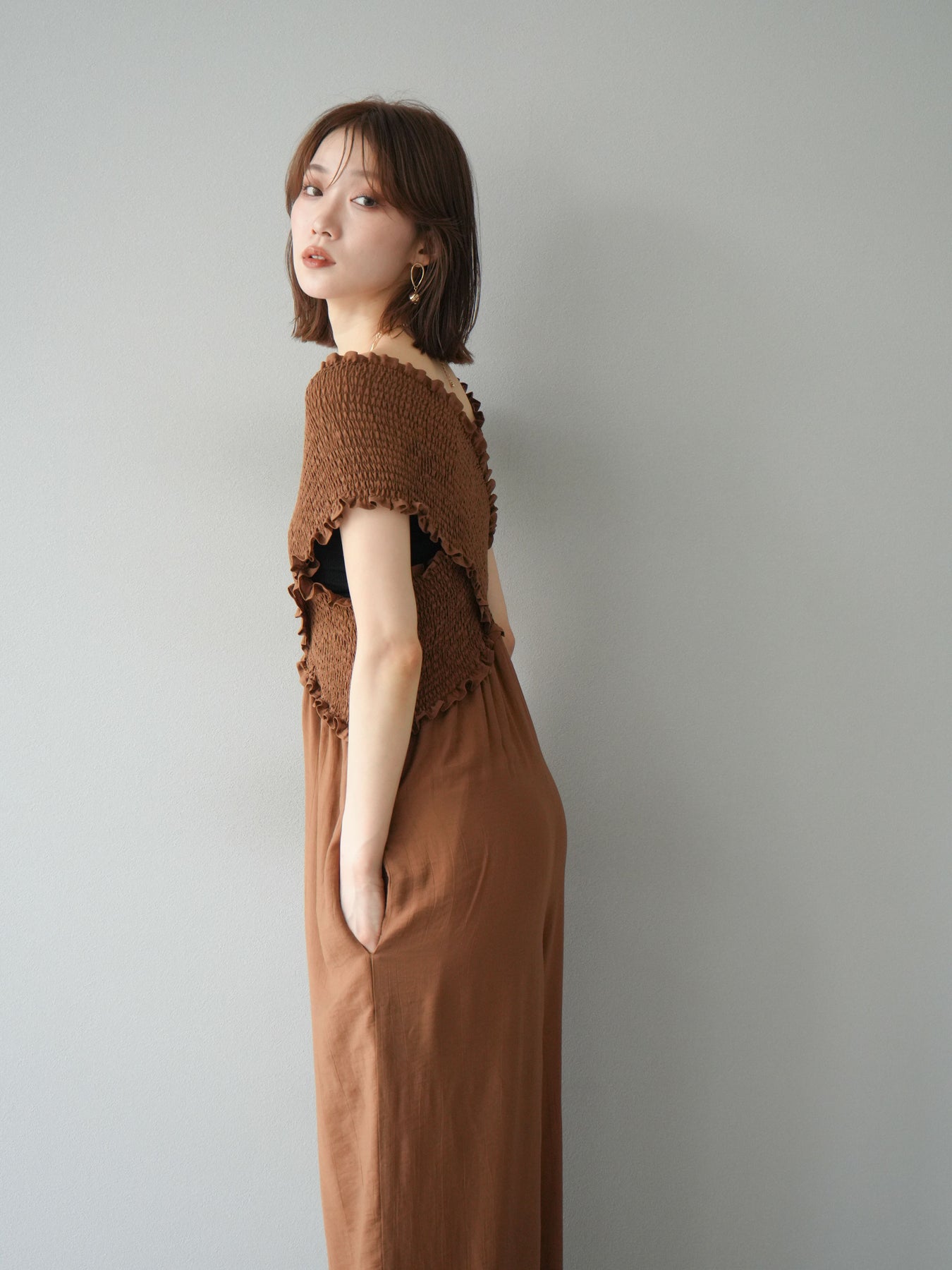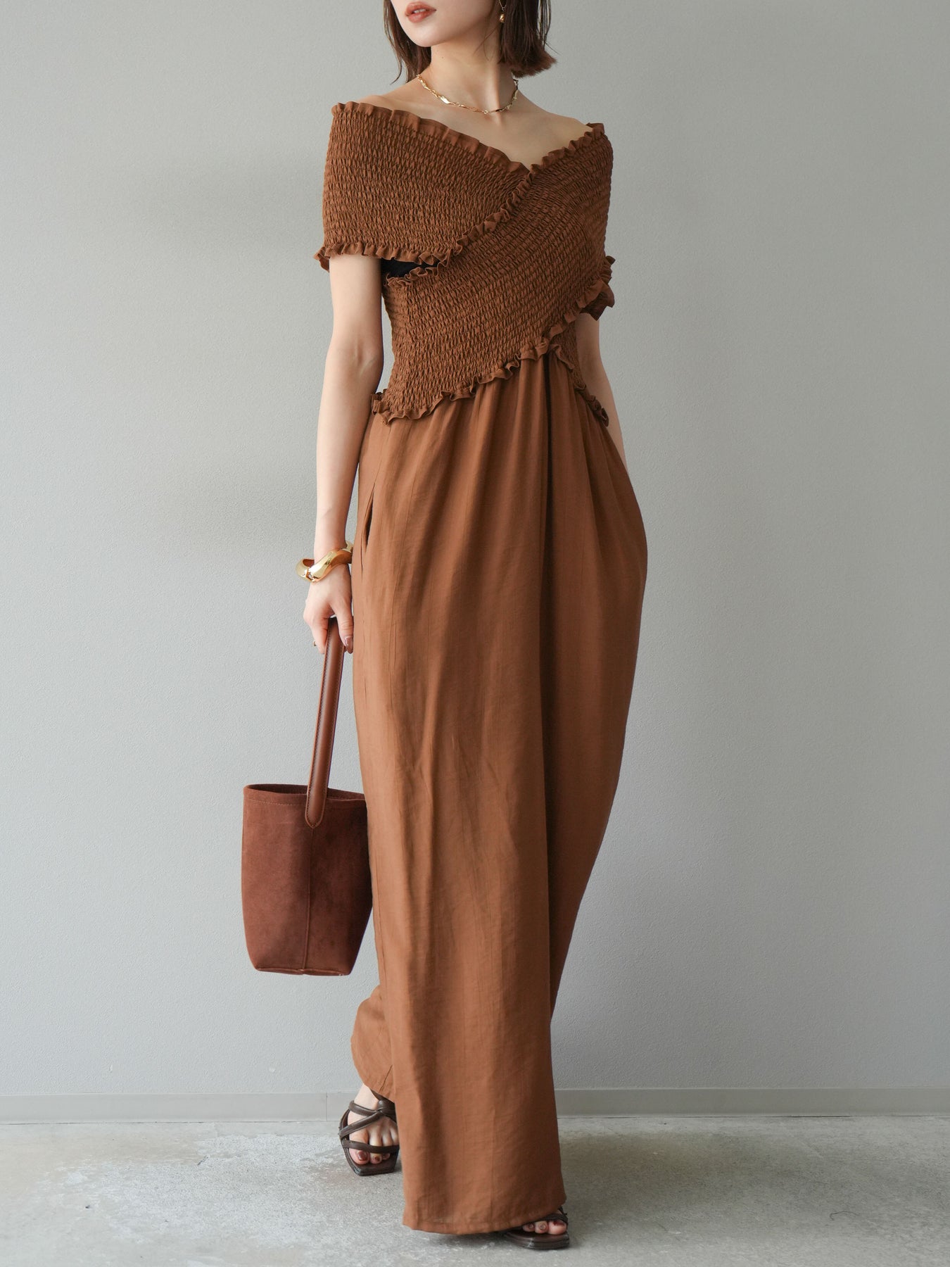 クロス状に切り替えたシャーリングデザインが目を惹くサロペット。 デコルテを美しく見せるオフショルダー風のネックラインが、女性らしさを引き立てます。 ボリューム感のあるパンツシルエットで、リラックス感と華やかさを両立。 一枚で着映えする存在感のあるデザインで、夏のお出かけシーンにもおすすめのアイテムです。