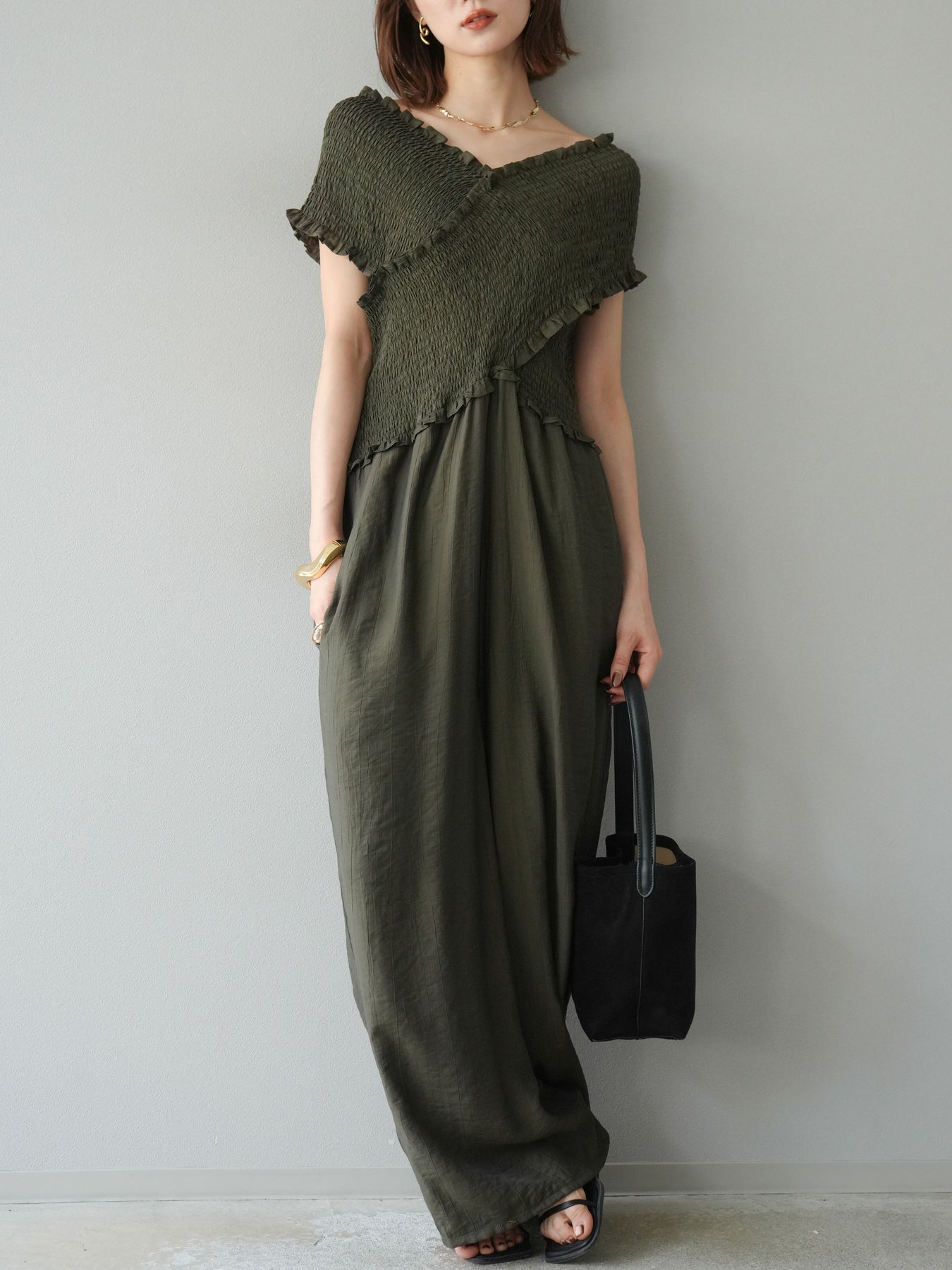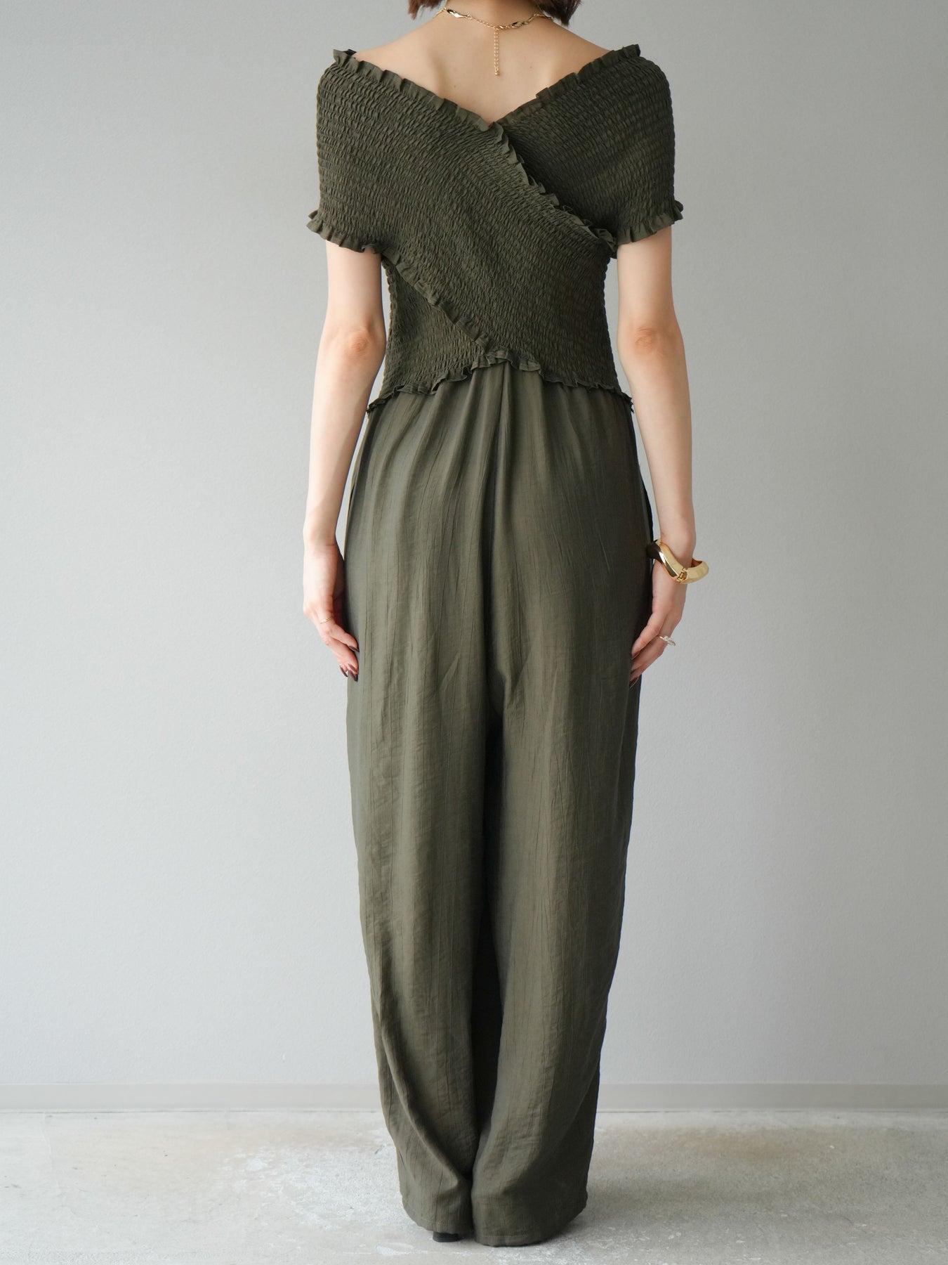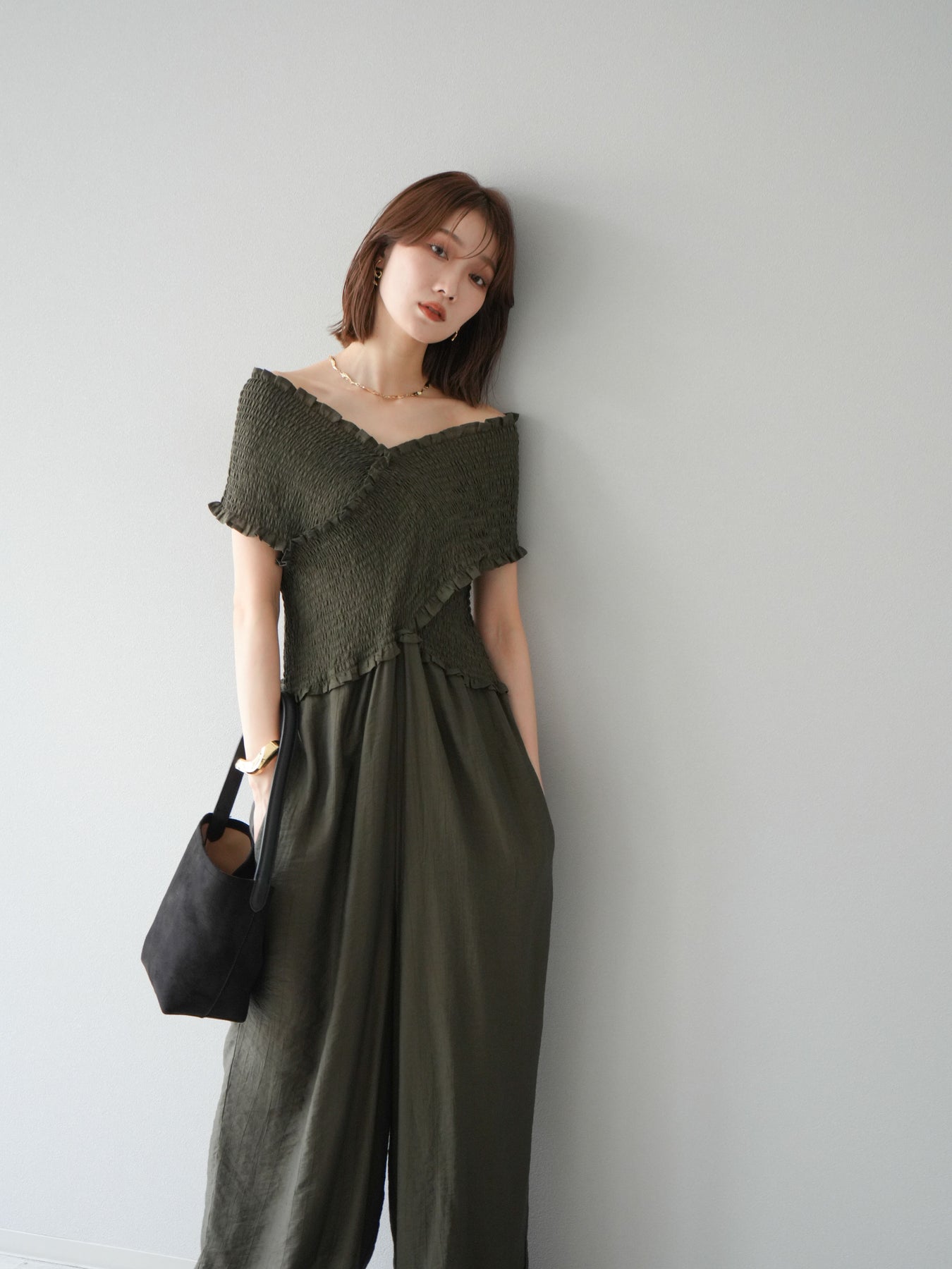 クロス状に切り替えたシャーリングデザインが目を惹くサロペット。 デコルテを美しく見せるオフショルダー風のネックラインが、女性らしさを引き立てます。 ボリューム感のあるパンツシルエットで、リラックス感と華やかさを両立。 一枚で着映えする存在感のあるデザインで、夏のお出かけシーンにもおすすめのアイテムです。