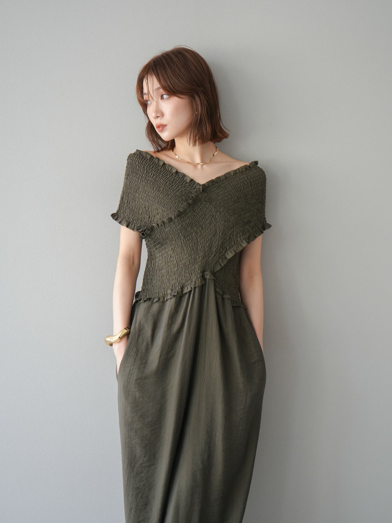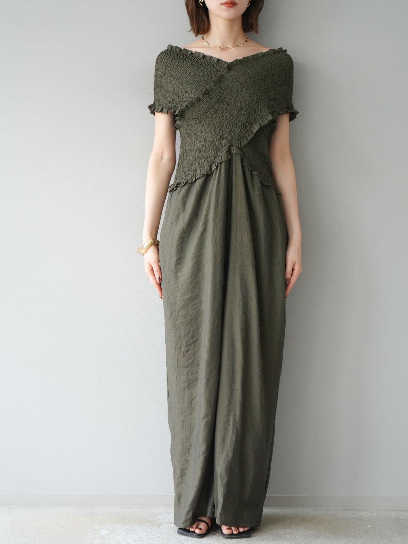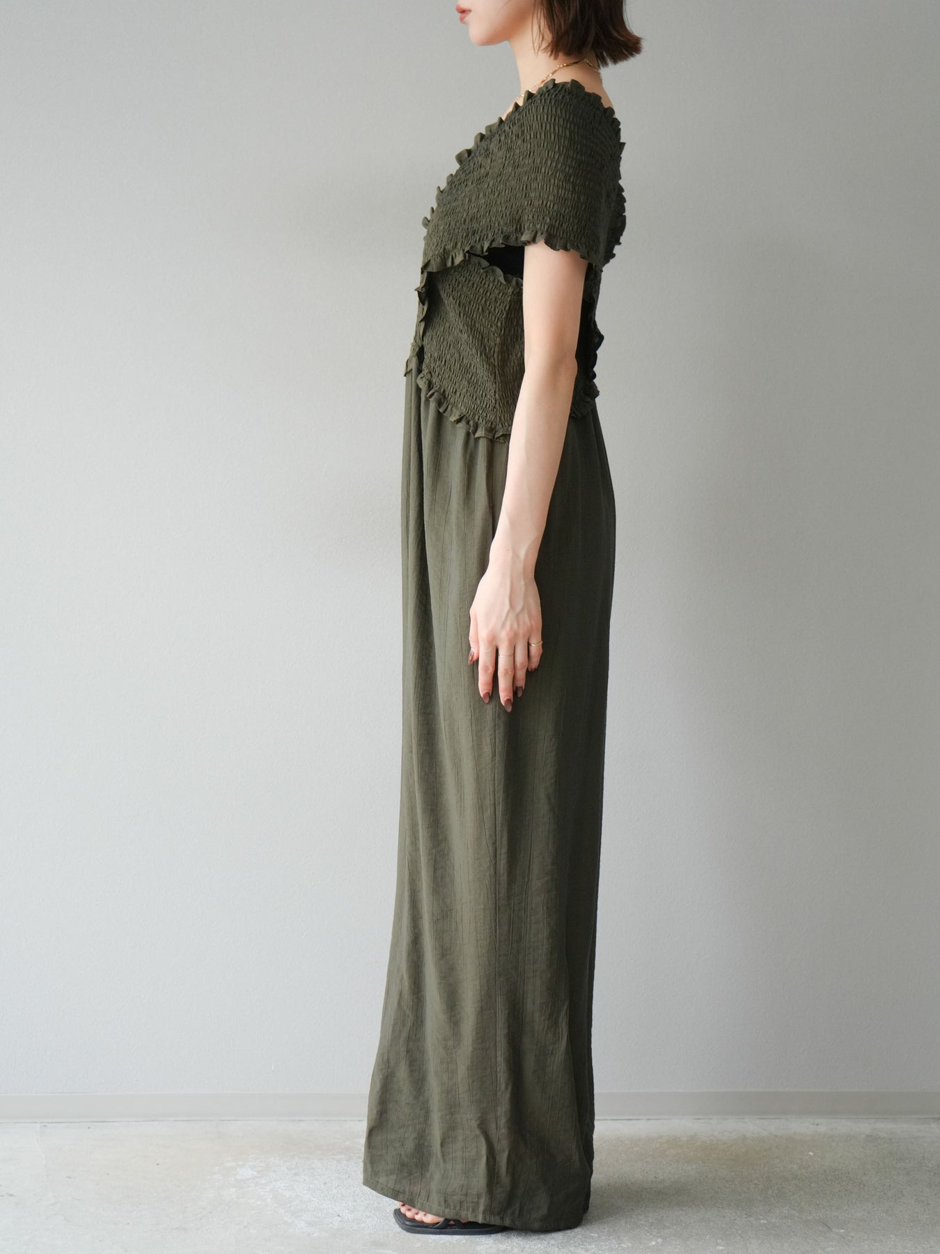 クロス状に切り替えたシャーリングデザインが目を惹くサロペット。 デコルテを美しく見せるオフショルダー風のネックラインが、女性らしさを引き立てます。 ボリューム感のあるパンツシルエットで、リラックス感と華やかさを両立。 一枚で着映えする存在感のあるデザインで、夏のお出かけシーンにもおすすめのアイテムです。