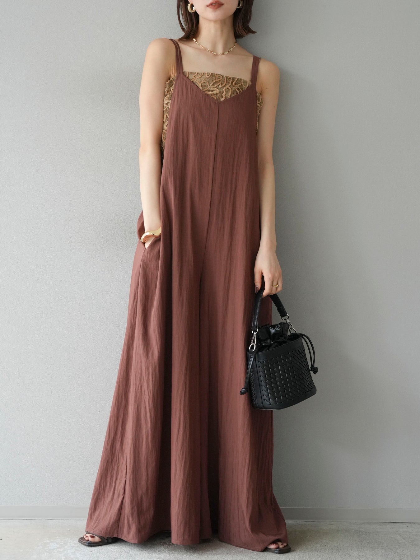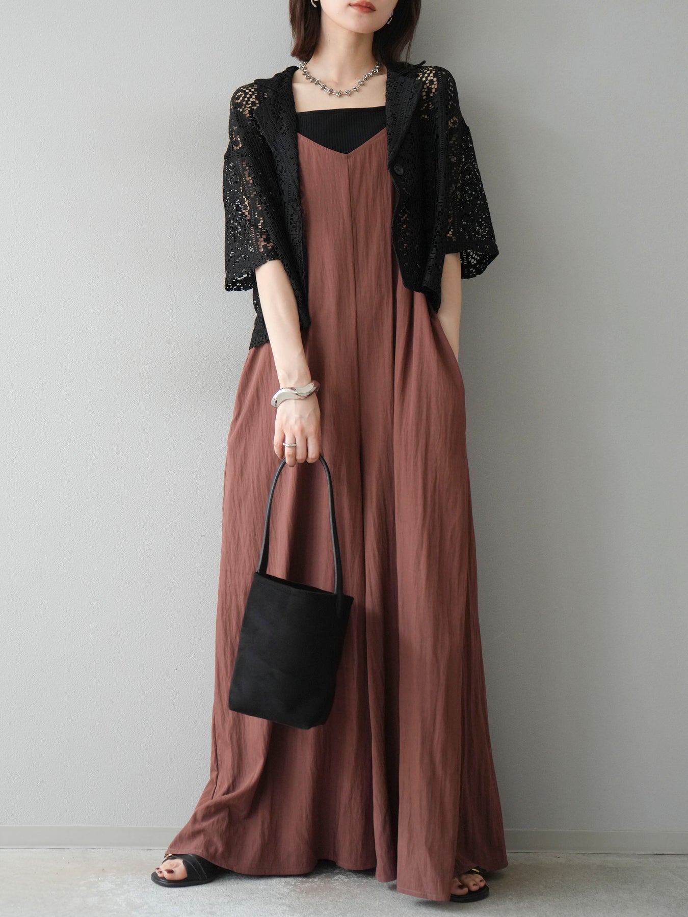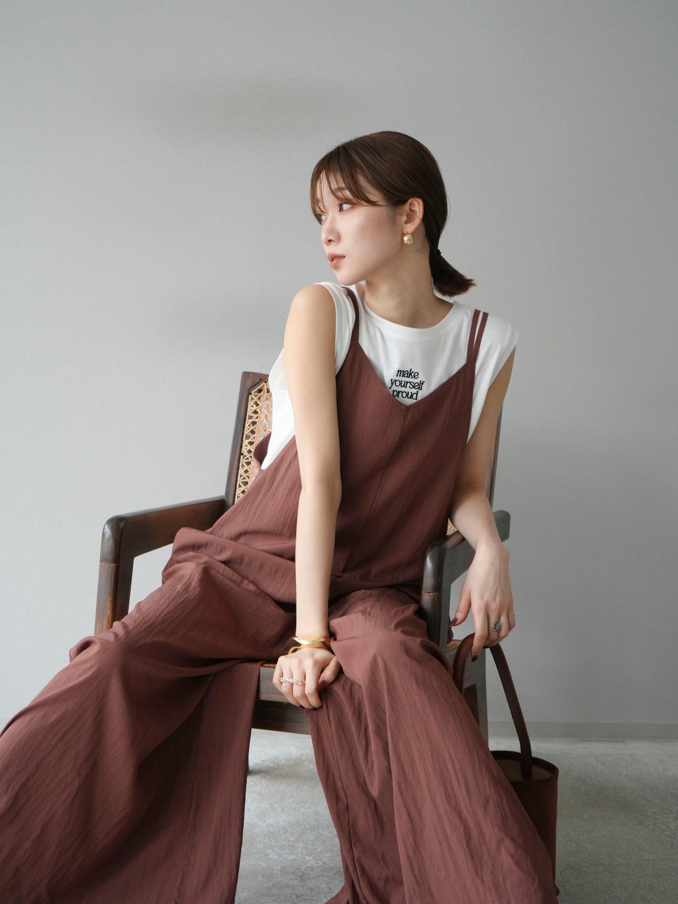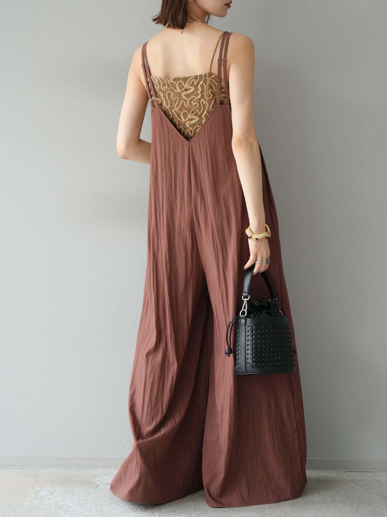 落ち感のあるレーヨン混素材が、リラクシーかつ上品な印象を与えるVネックサロペット。 深めのVネックと肩紐デザインが顔まわりをすっきり見せ、レイヤードスタイルにもぴったり。ゆとりあるワイドシルエットが体型を自然にカバーしつつ、こなれ感を演出してくれます。 柔らかな素材で肌あたりも優しく、長時間の着用でも快適。インナー次第でカジュアルからキレイめまで幅広く活躍する、着回し力の高い1着です。 ポケット付きで実用性も◎。シーズンレスに楽しめる、大人のデイリーサロペットです。